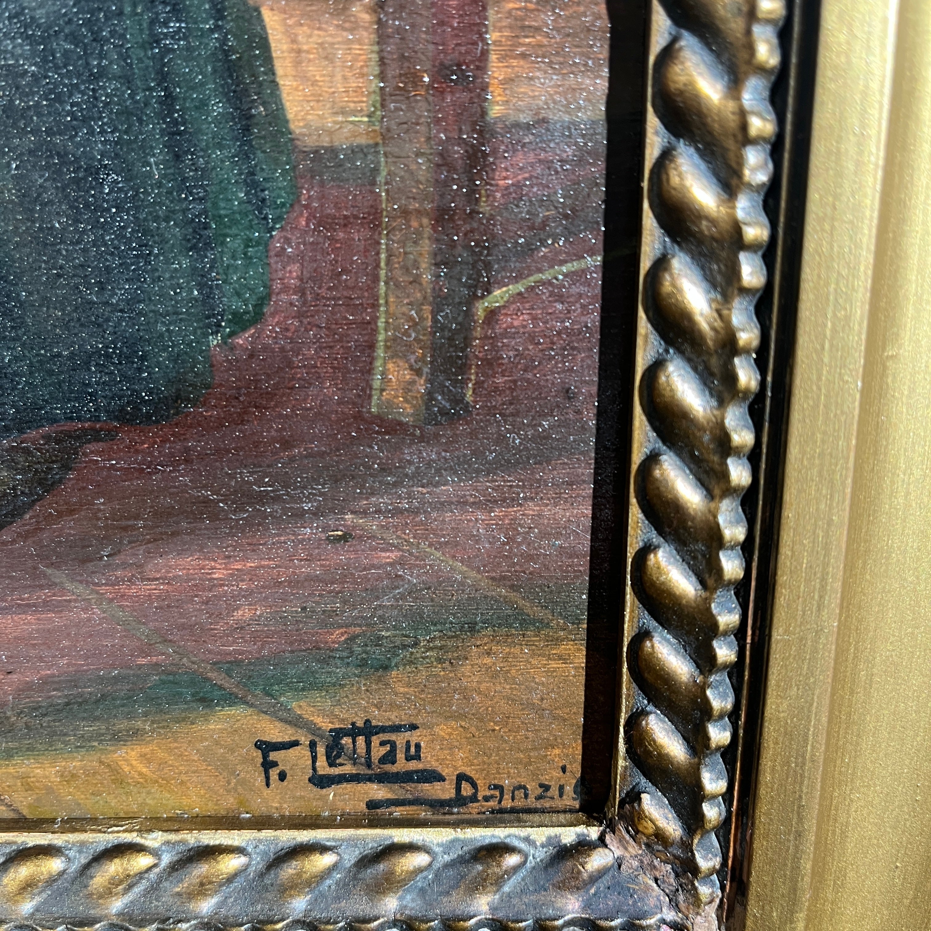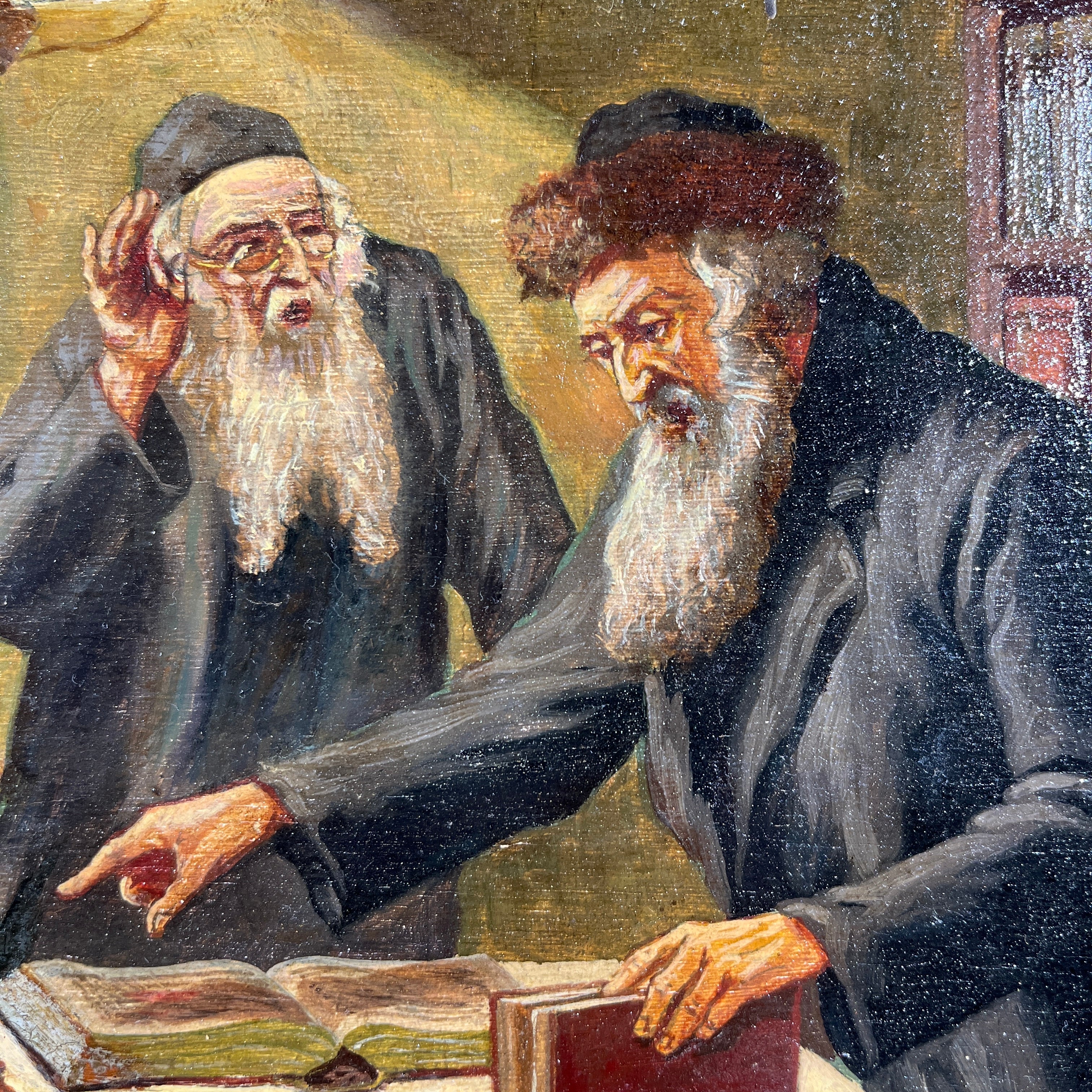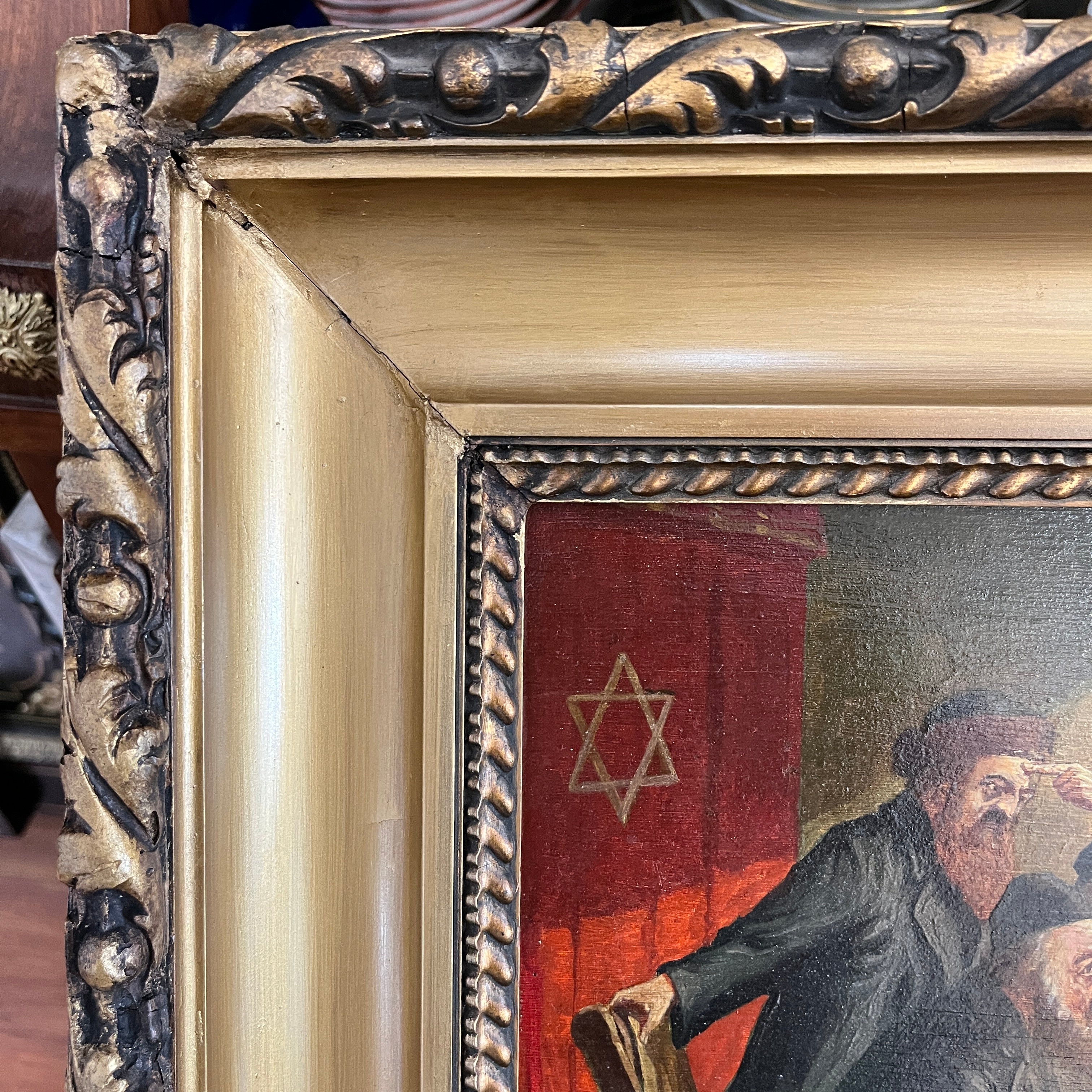 Óleo del artista judeo-alemán Friedrich Lettau (fines siglo XIX mediados siglo XX) que nos muestra una reunión entre rabinos ortodoxos reflexionando sobre lo que podría ser el Talmud. En la imagen vemos un foco iluminando la particular escena y se pueden apreciar los diferentes rasgos en los rostros de sus personajes. La pintura viene acompañada de un marco dorado y negro, con una corona central en los mismos tonos, que le entrega un realce especial a la escena. El artista se caracterizaba por realizar escenas de rabinos en distintas acciones.