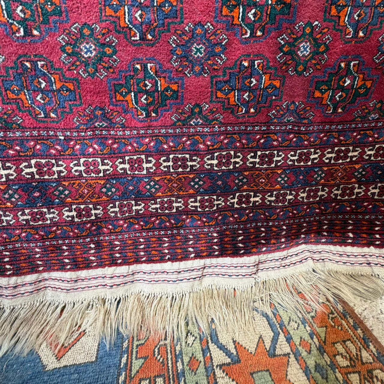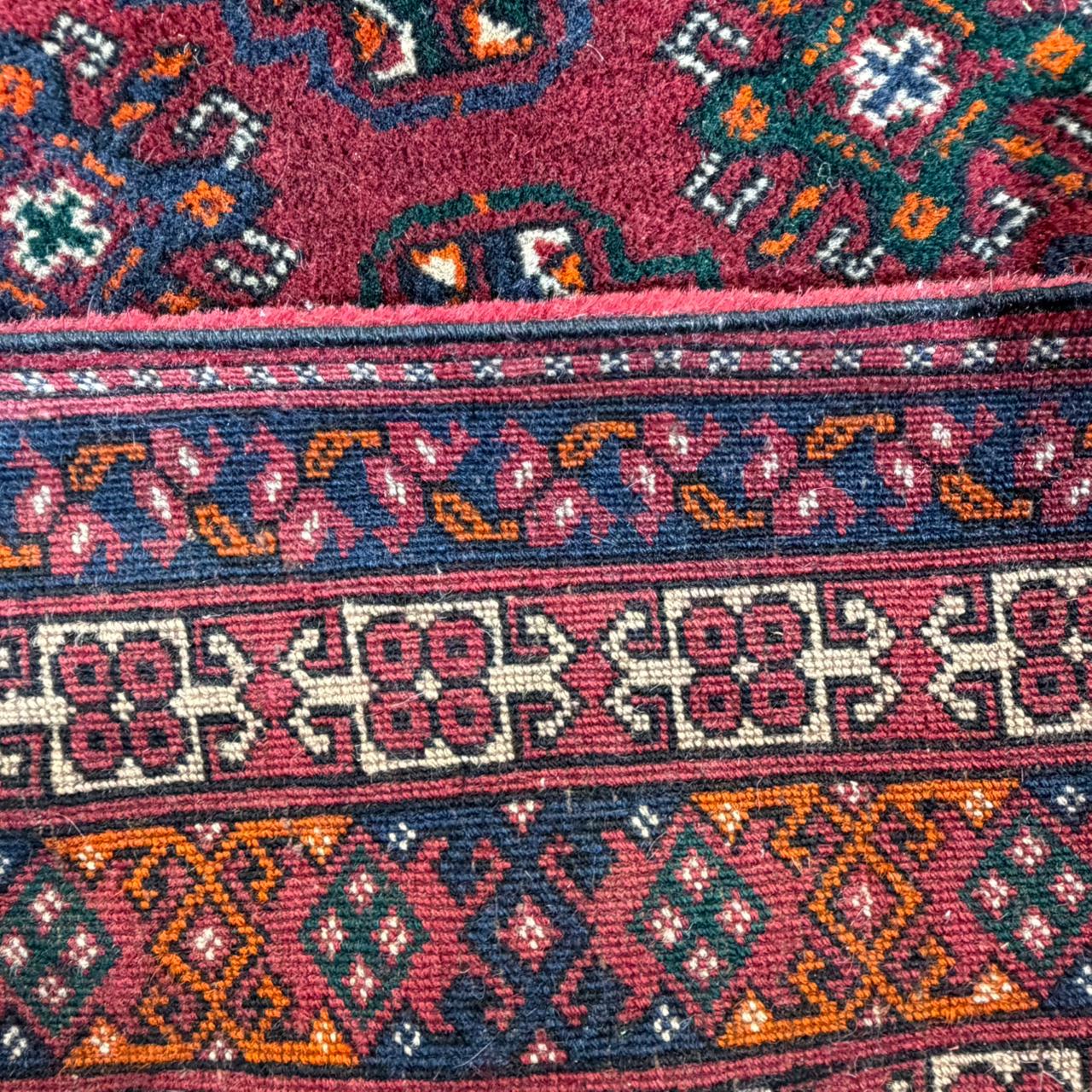 Hermosa alfombra de la tribu nómada Baluch (también se puede escribir Beluch, Balochi o Belochi) del noreste de Irán bordeando la frontera con Afganistán. Es una alfombra que se caracteriza por su especial suavidad debido a la técnica de nudaje particularmente compacto, lo que la vuelve más liviana y flexible. Se calcula que debe tener más de cuarenta años, sin embargo su excelente estado permite que pueda seguir utilizándose en salones y espacios amplios en general, donde se pueda apreciar su magnificencia. Es una reliquia manufacturada, que destaca por el uso de pigmentos naturales, predominando el rojo y con pequeñas geometrías que acompañan todo el paño. La guarda juega con tonos azul cobalto y otros terrosos.