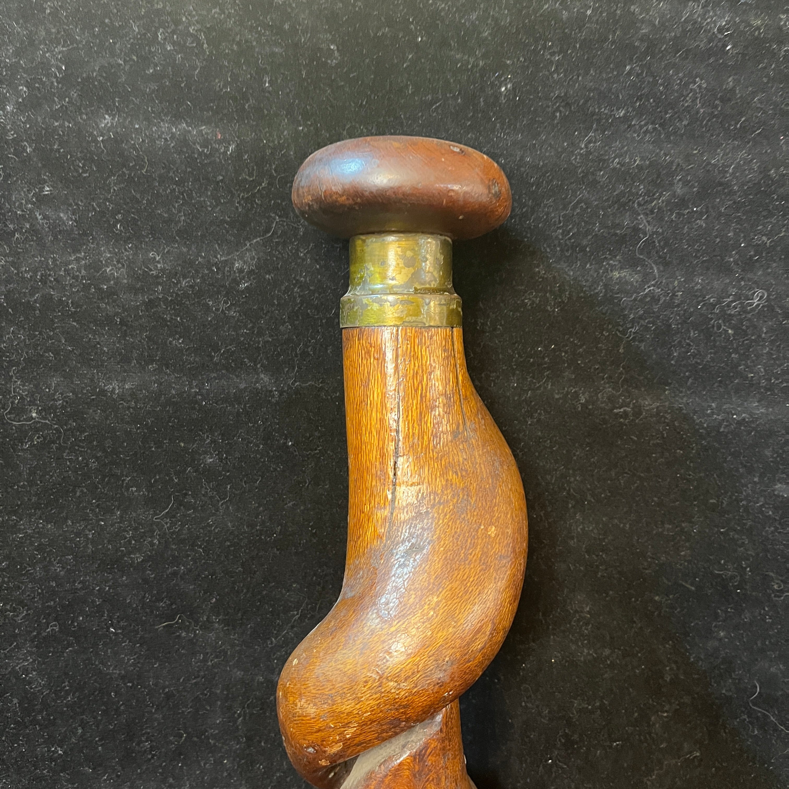 Llamativo bastón de madera tallada en una sola pieza, con diseño curvo y grueso, con vetas notorias, dándole un acabado rústico. El mango redondo tiene una pieza de bronce que lo separa del resto del bastón. Se trata de una pieza que mezcla lo funcional y lo escultórico. Su taco es de plomo.