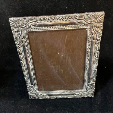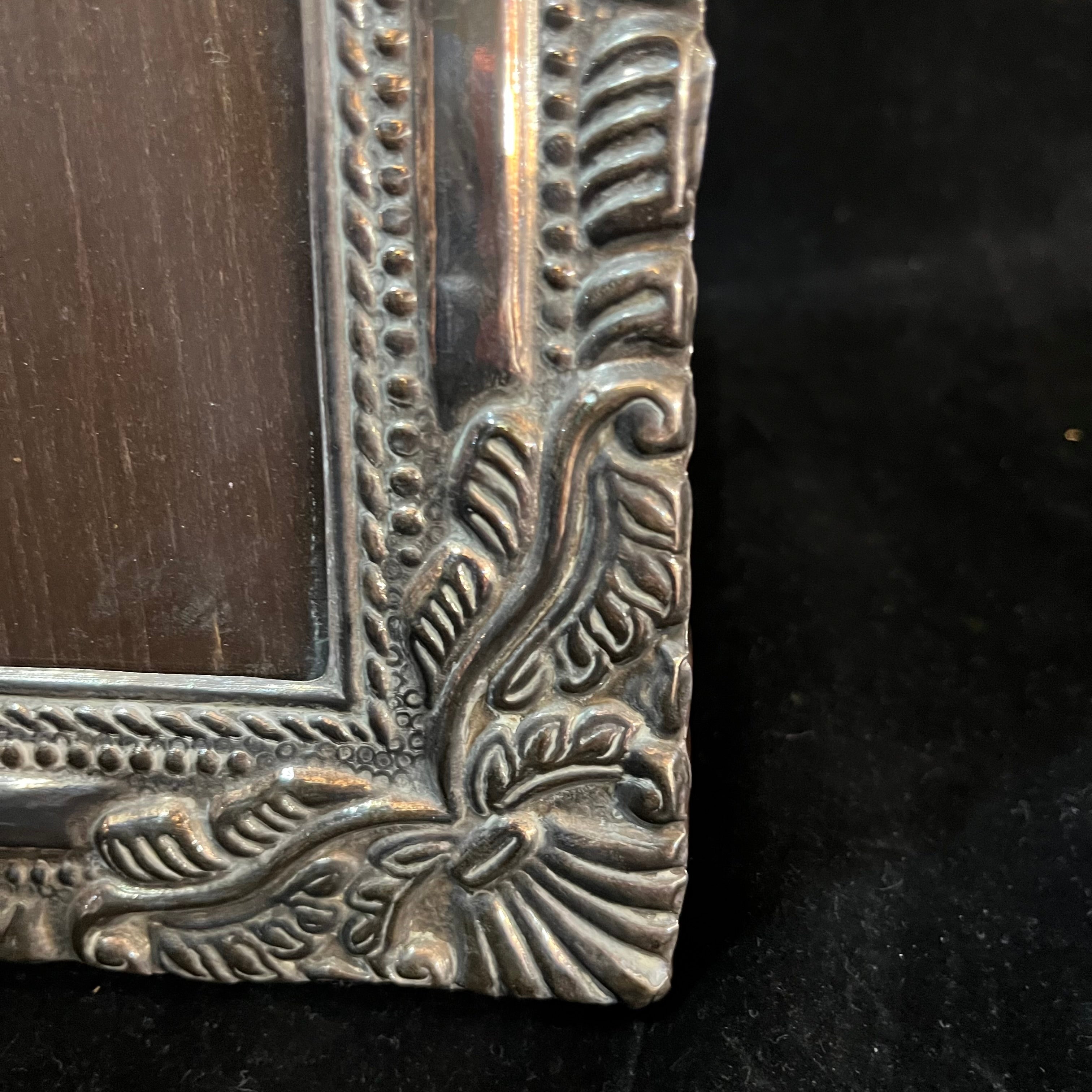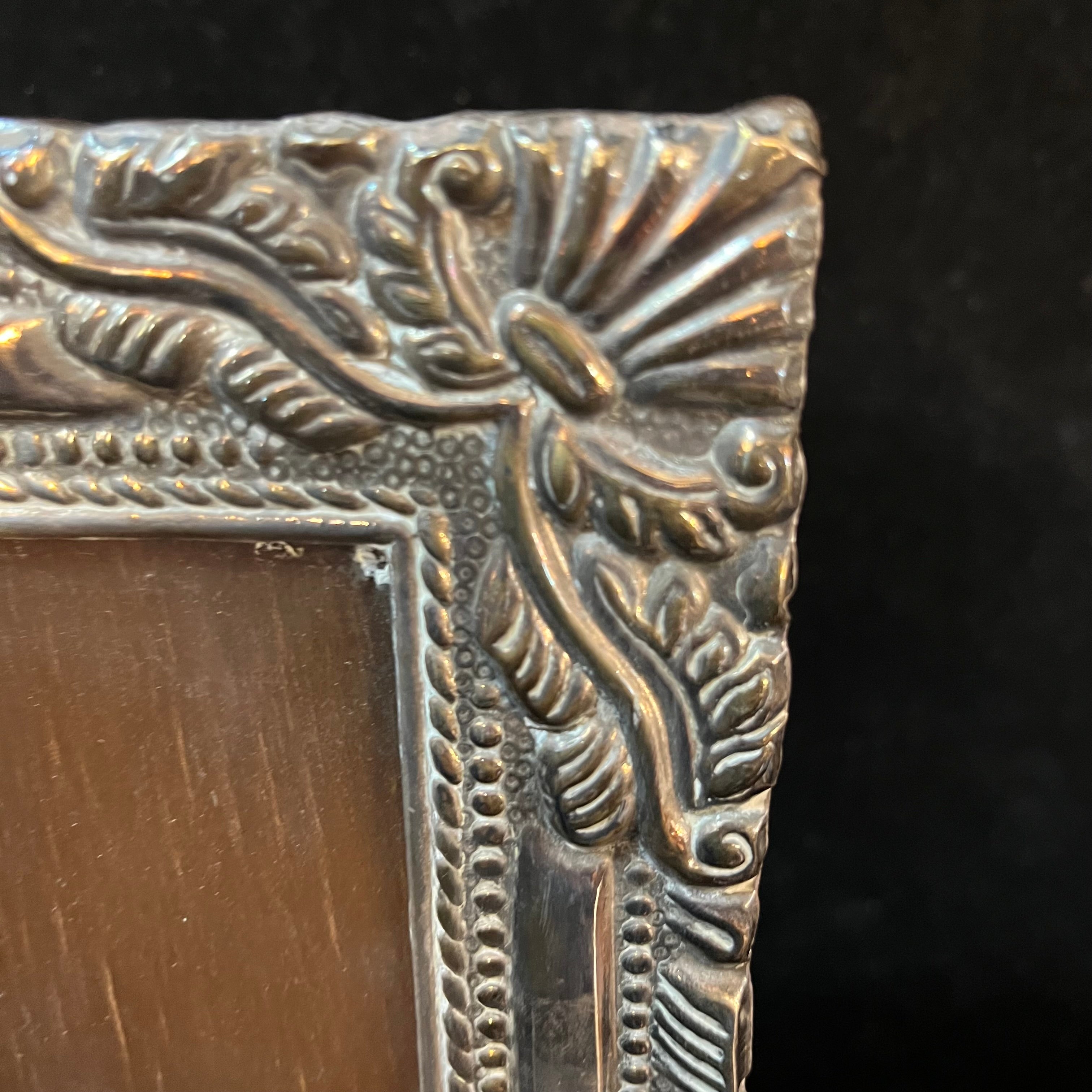 Portarretrato de madera recubierto en plata estilo colonial repujado, con detalles de de hojas en los bordes.