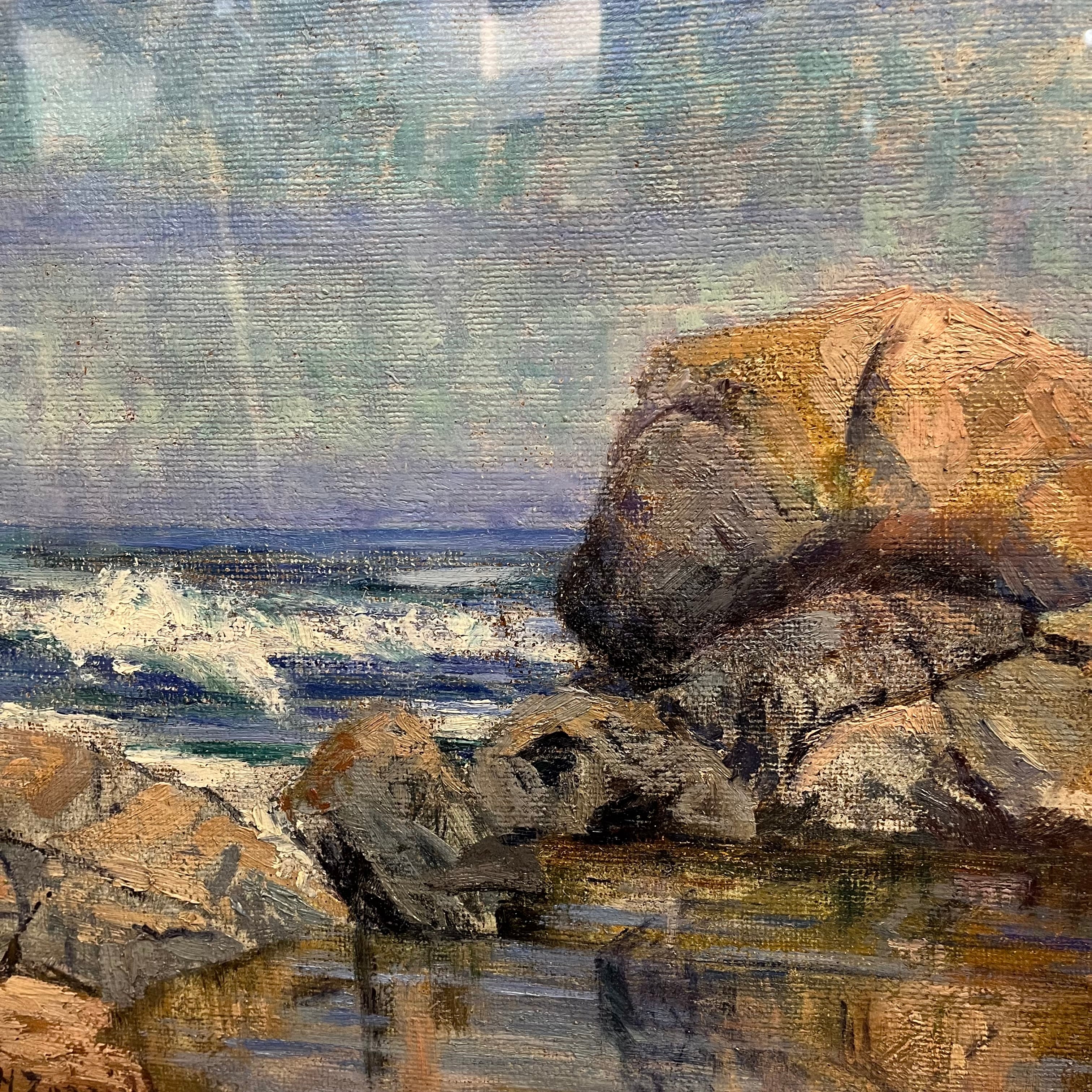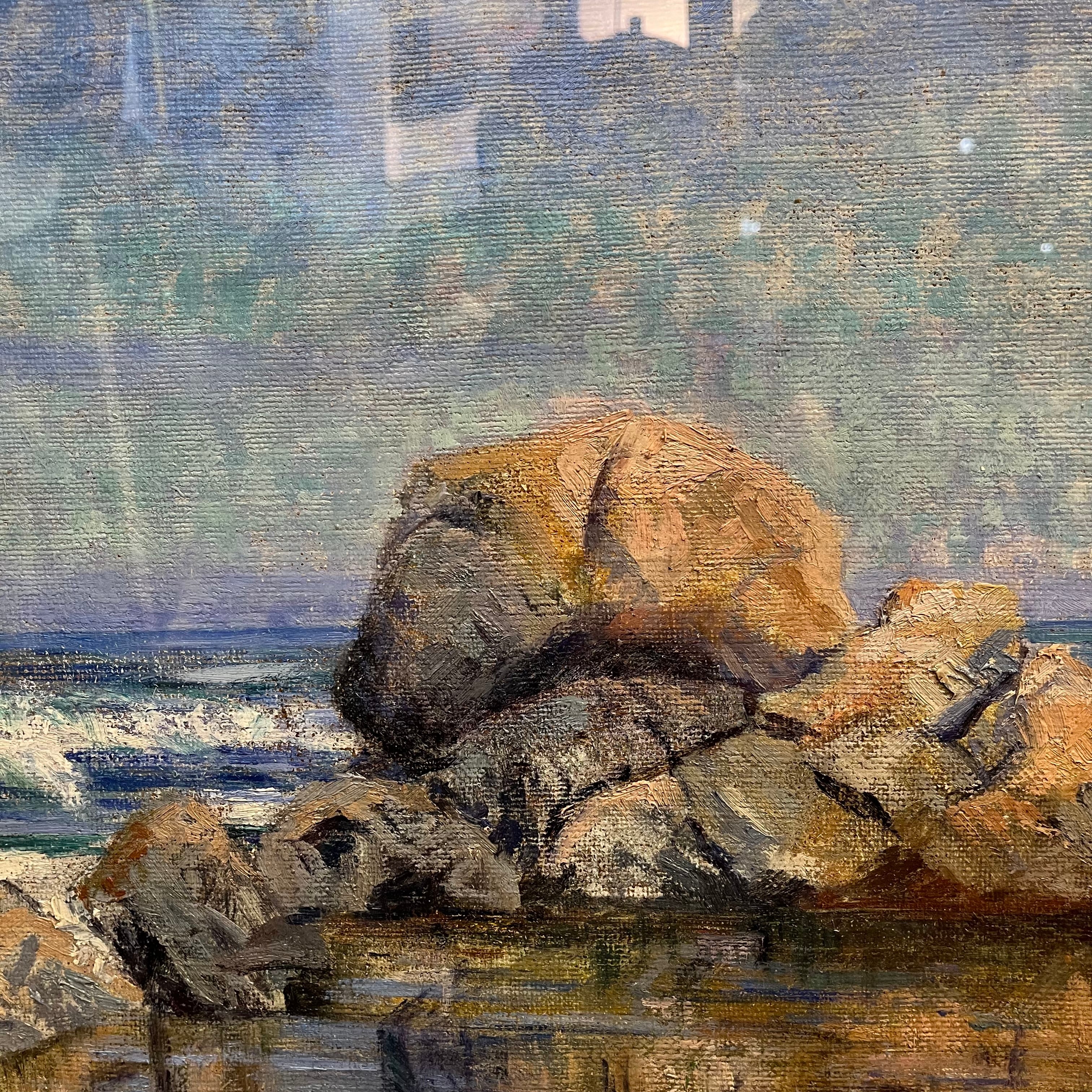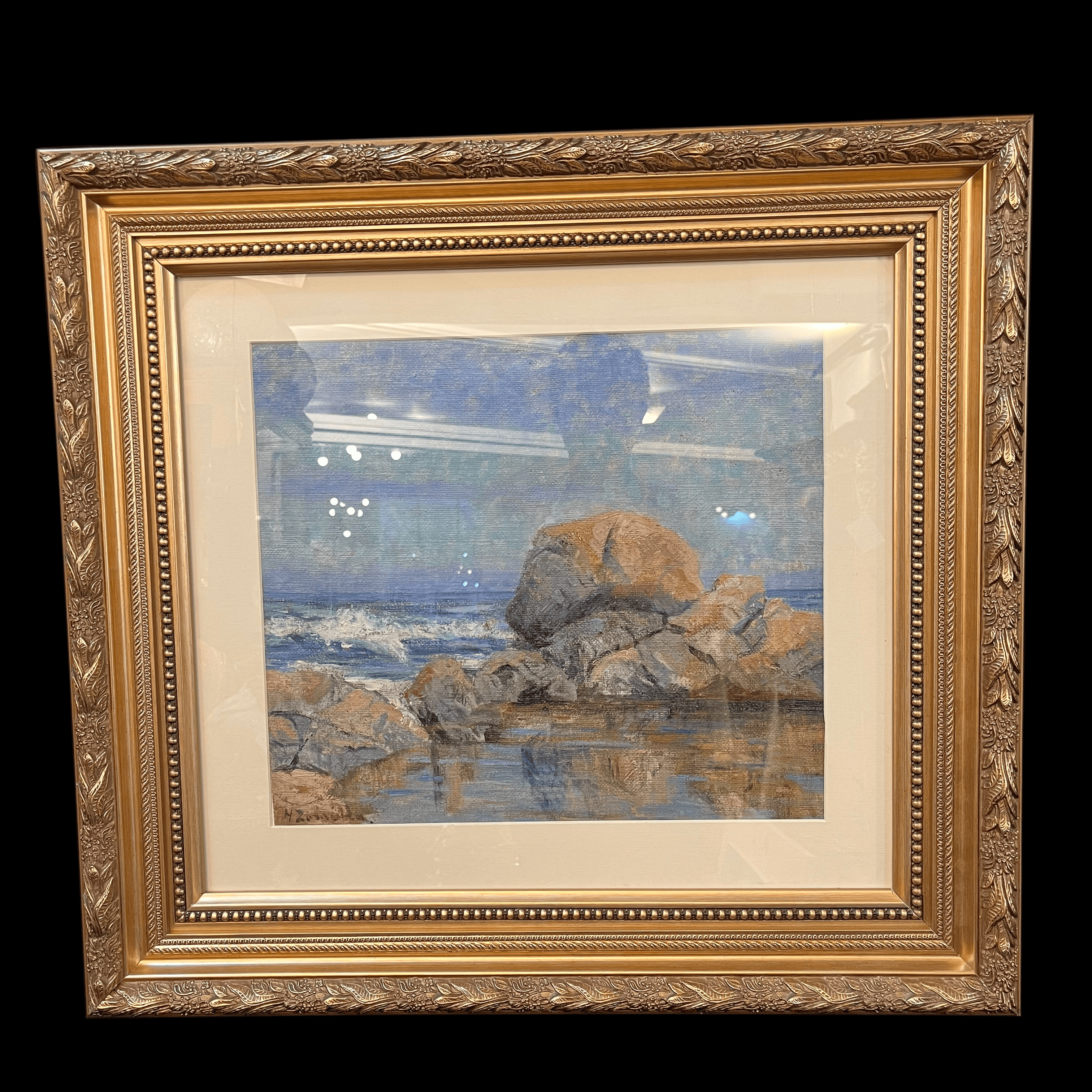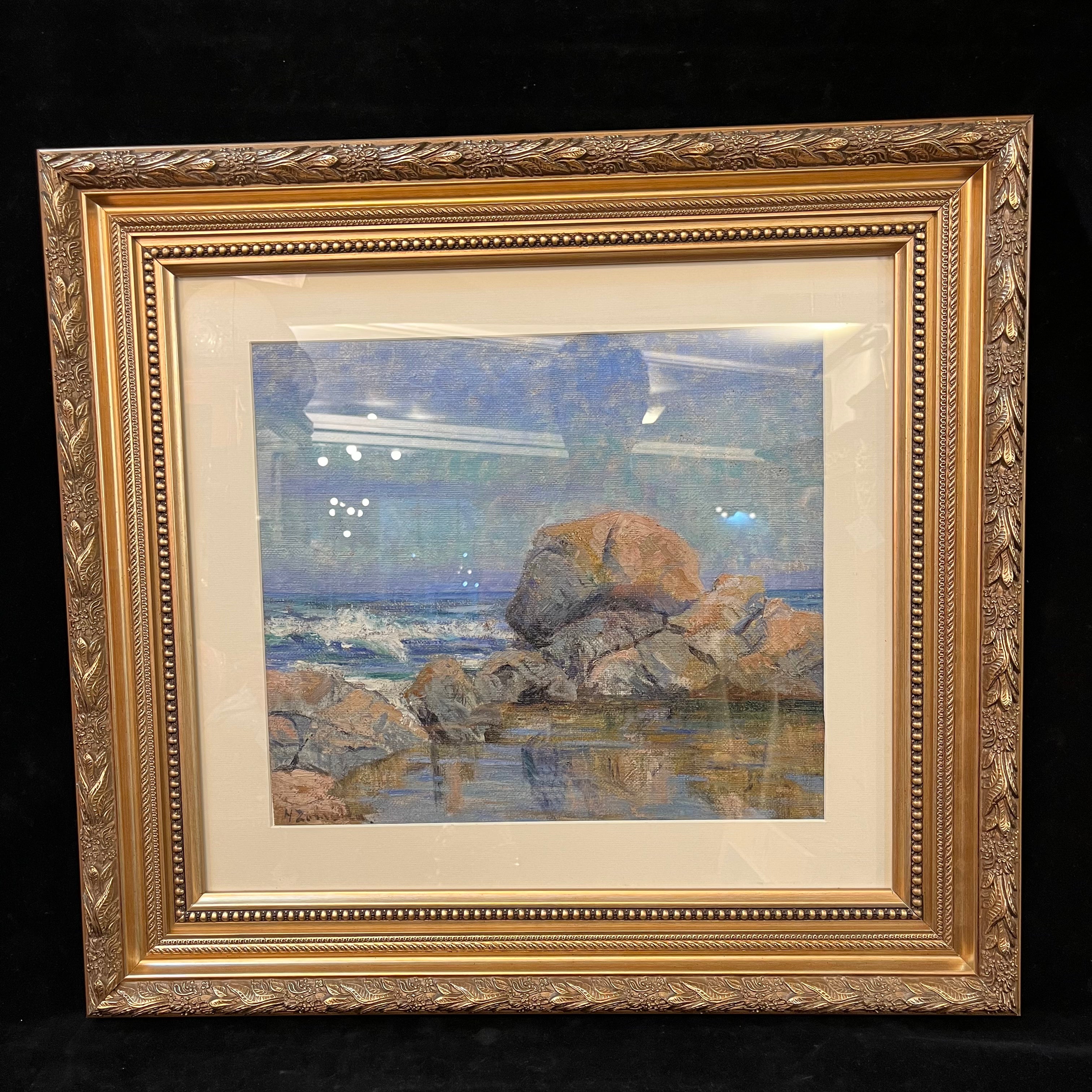 Conmovedora pintura de la artista chilena Humberta Zorrilla (1880-1954) de una costa rocosa. En su pintura podemos destacar la pincelada gruesa característica y empaste. Una gran variedad de tonos azules, propios de la fusión natural del cielo y el mar, acompañado de roqueríos clásicos del territorio nacional. La pintura entrega una textura especial al ser realizada sobre arpillera la que añade más belleza a la escena. La pintora no dejó nada de lado preocupándose incluso del reflejo de las rocas en el agua que tienen frente a ella. El cuadro viene en un precioso marco de madera dorado con tallado de hojas y flores.
