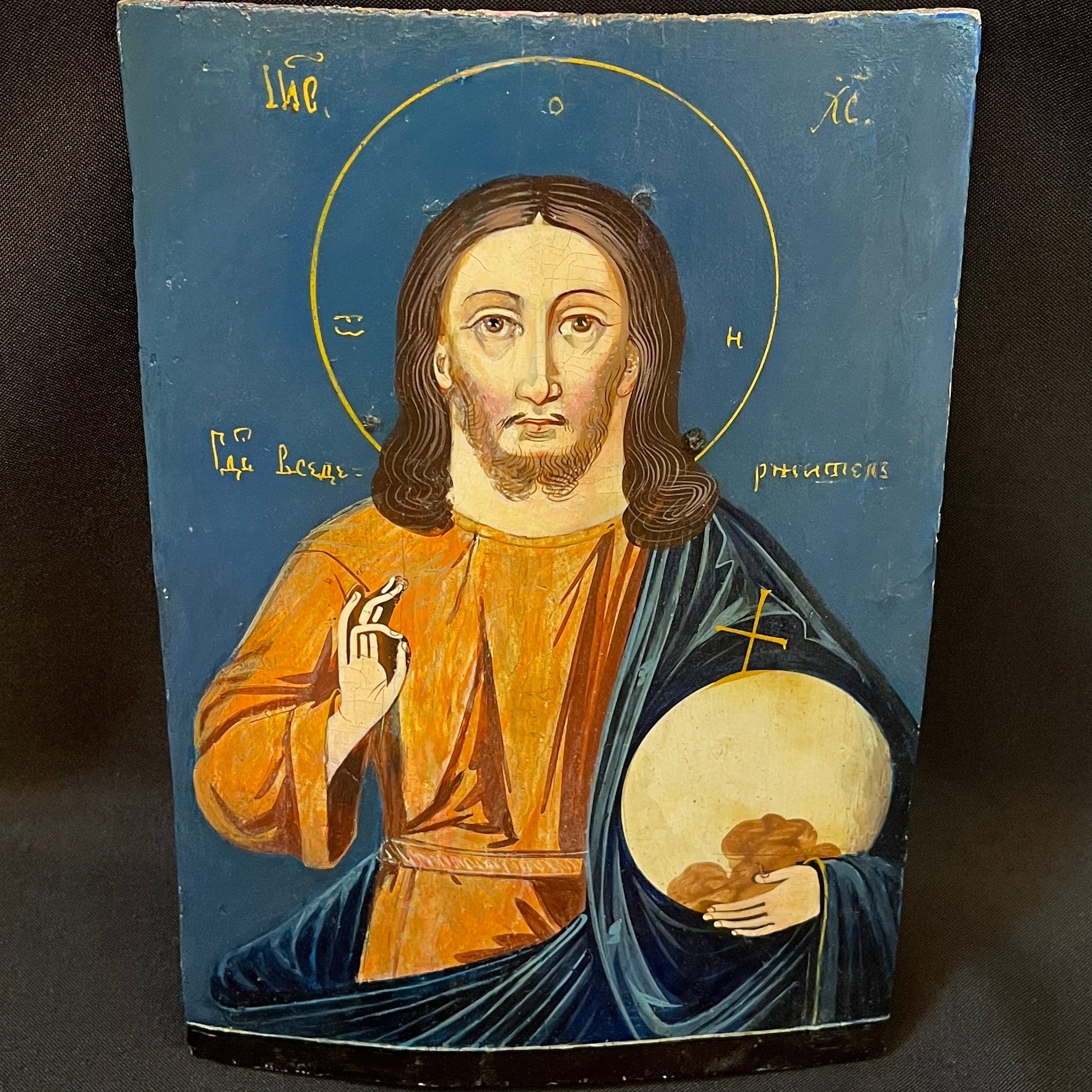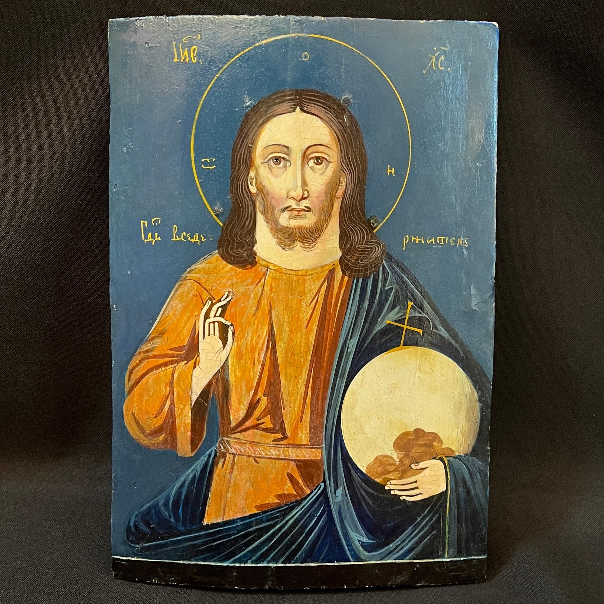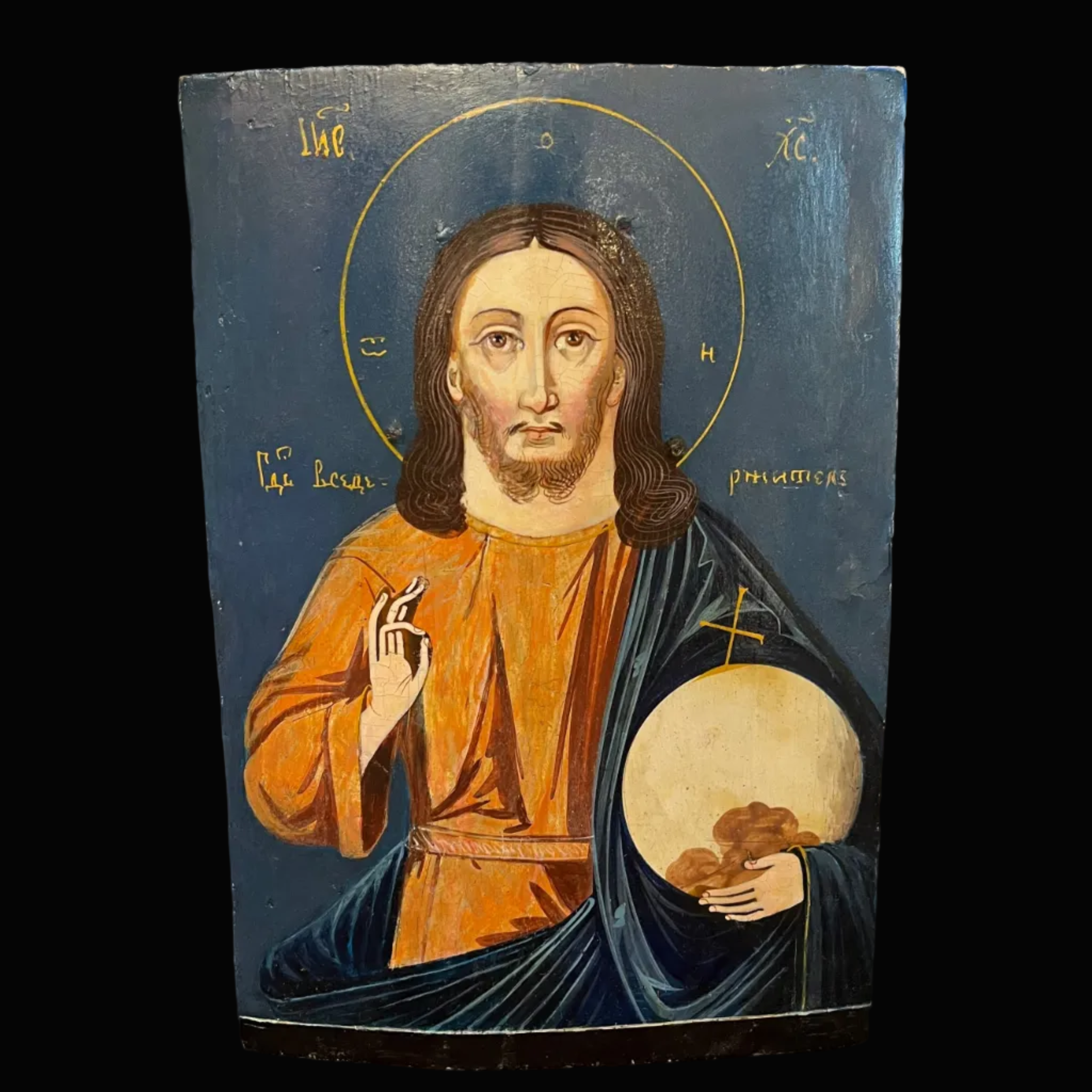 Hermoso ícono ruso pintado sobre madera que representa a Cristo Pantócrator, una de las figuras más emblemáticas del arte bizantino y de la tradición ortodoxa. La imagen, de mirada frontal y profunda intensidad espiritual, se enmarca en un fondo de azul profundo, delicadamente ornamentado con inscripciones en amarillo que realzan su carácter sagrado.
