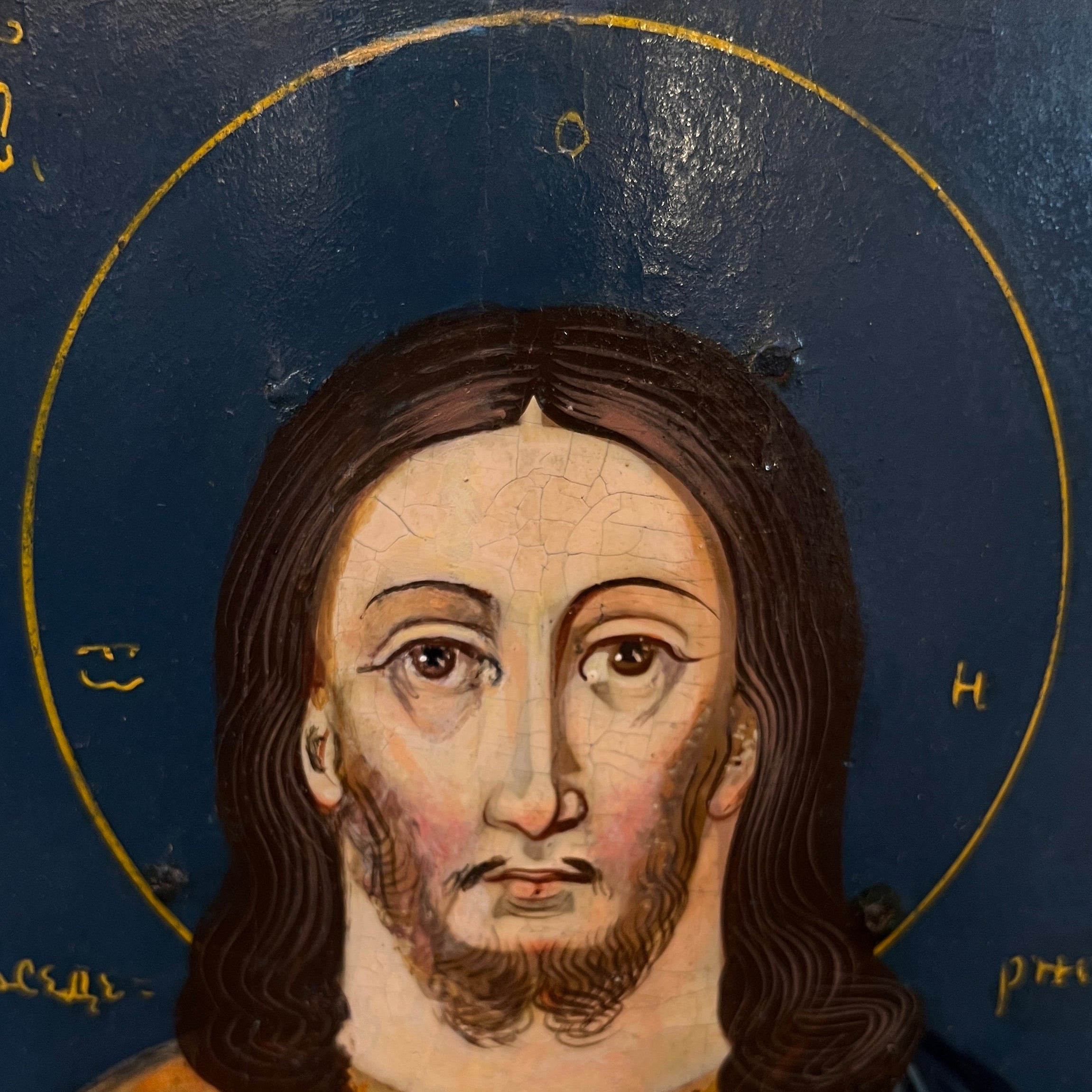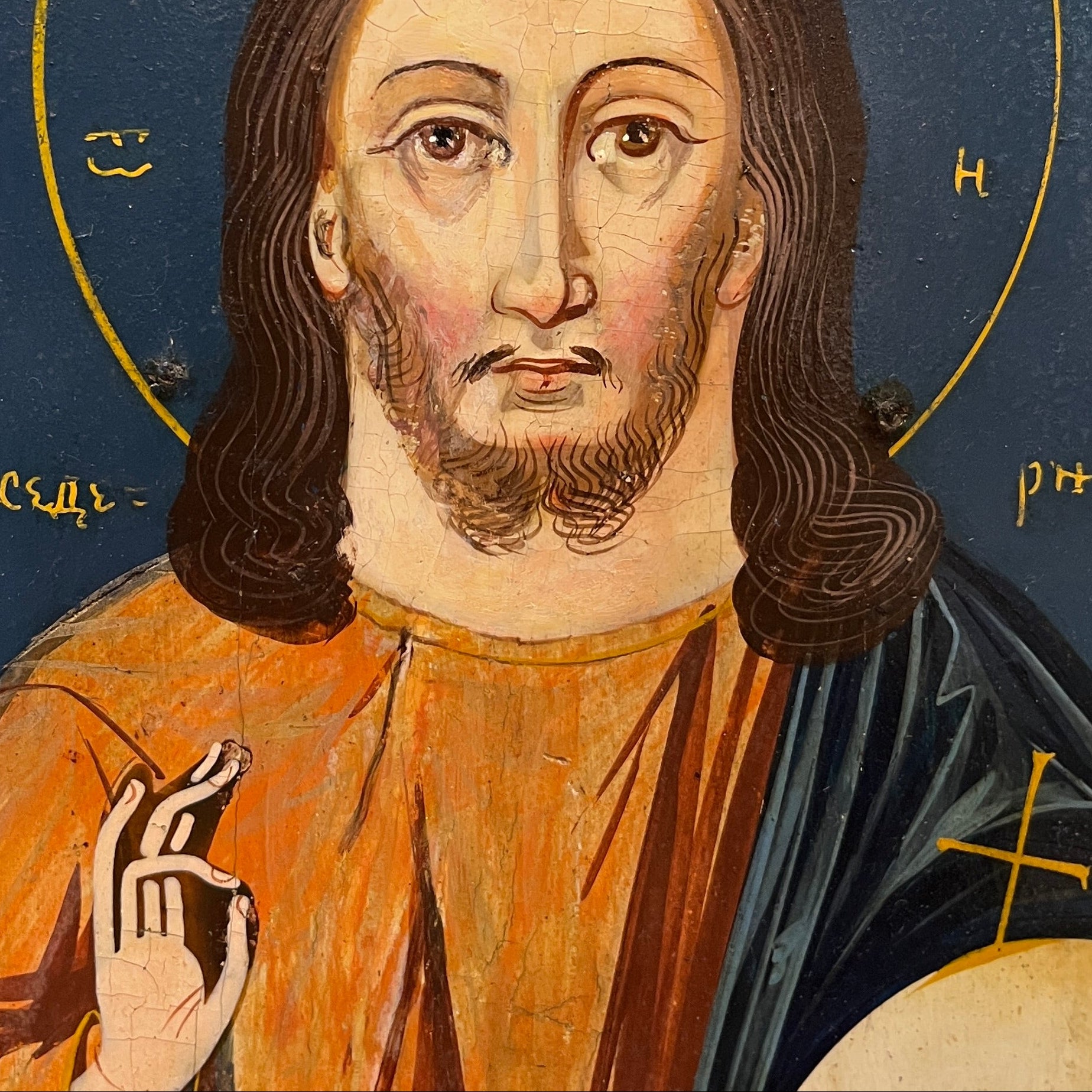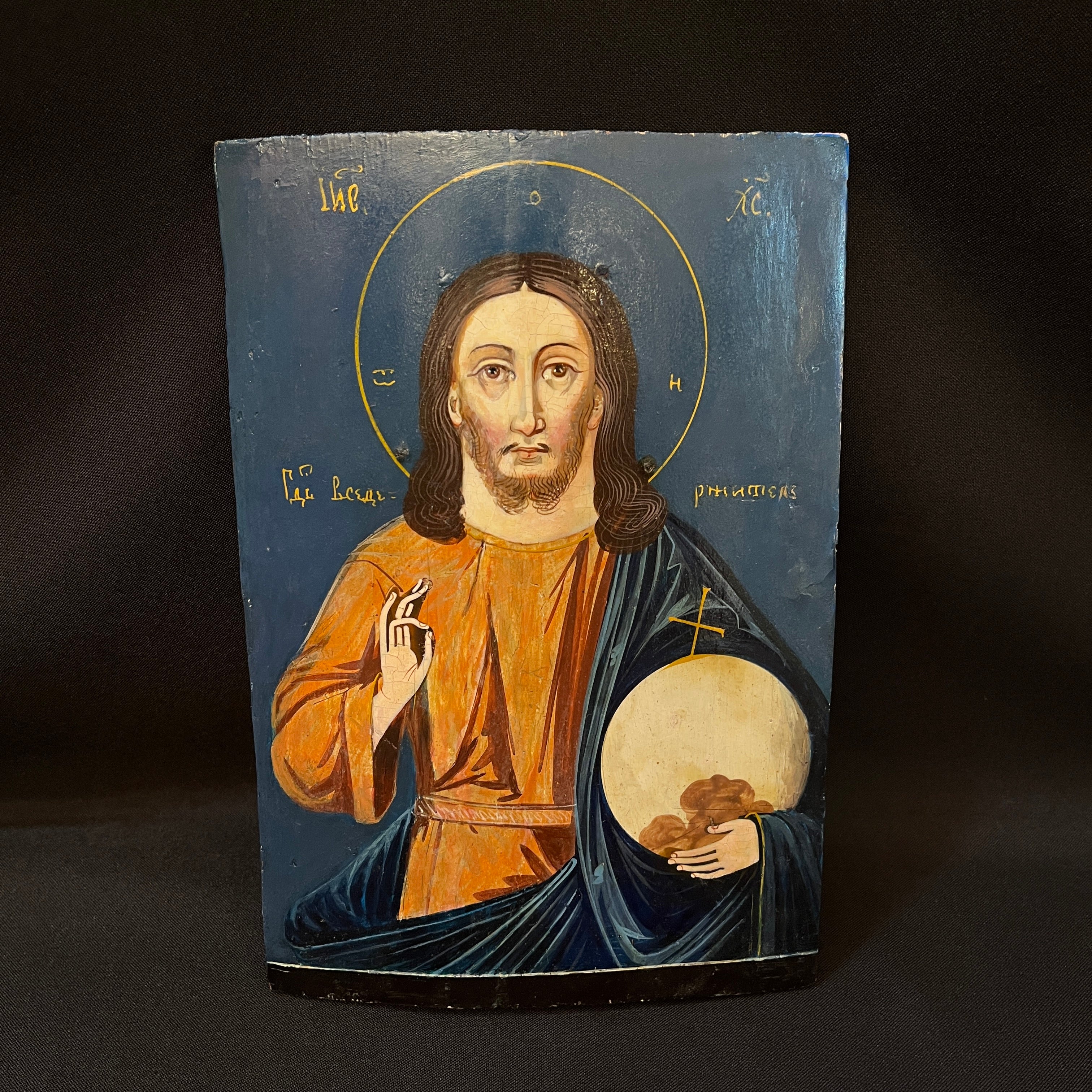 Hermoso ícono ruso pintado sobre madera que representa a Cristo Pantócrator, una de las figuras más emblemáticas del arte bizantino y de la tradición ortodoxa. La imagen, de mirada frontal y profunda intensidad espiritual, se enmarca en un fondo de azul profundo, delicadamente ornamentado con inscripciones en amarillo que realzan su carácter sagrado.