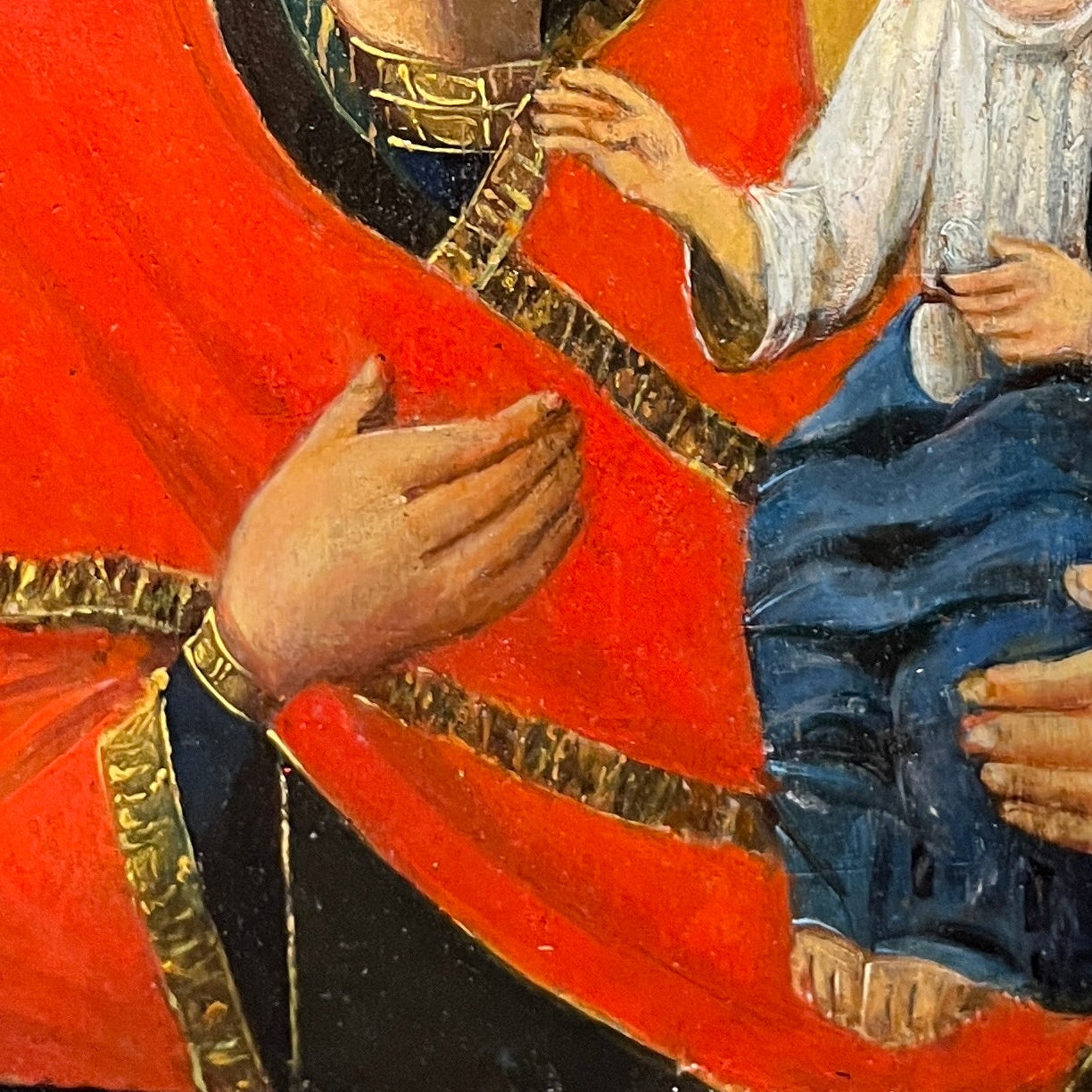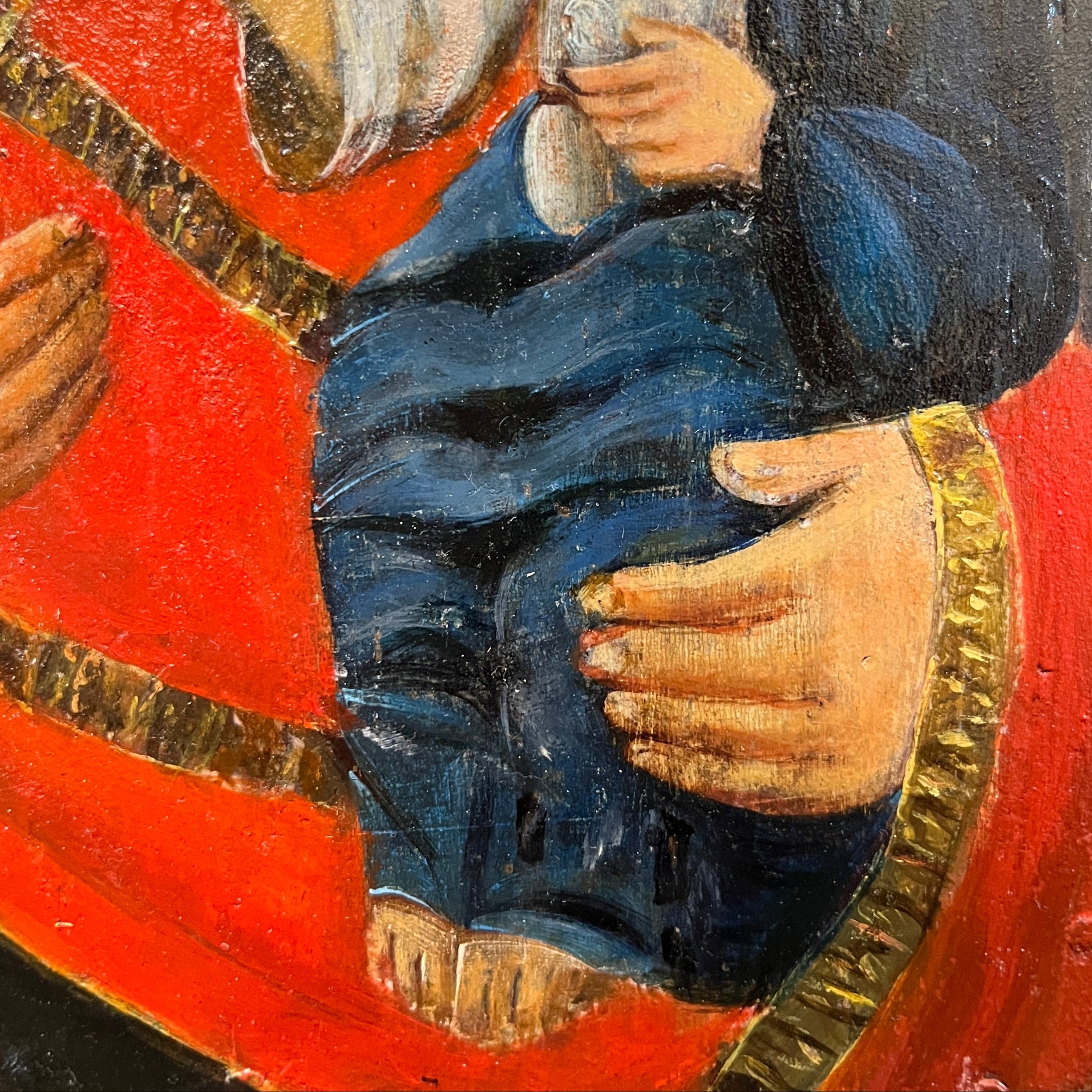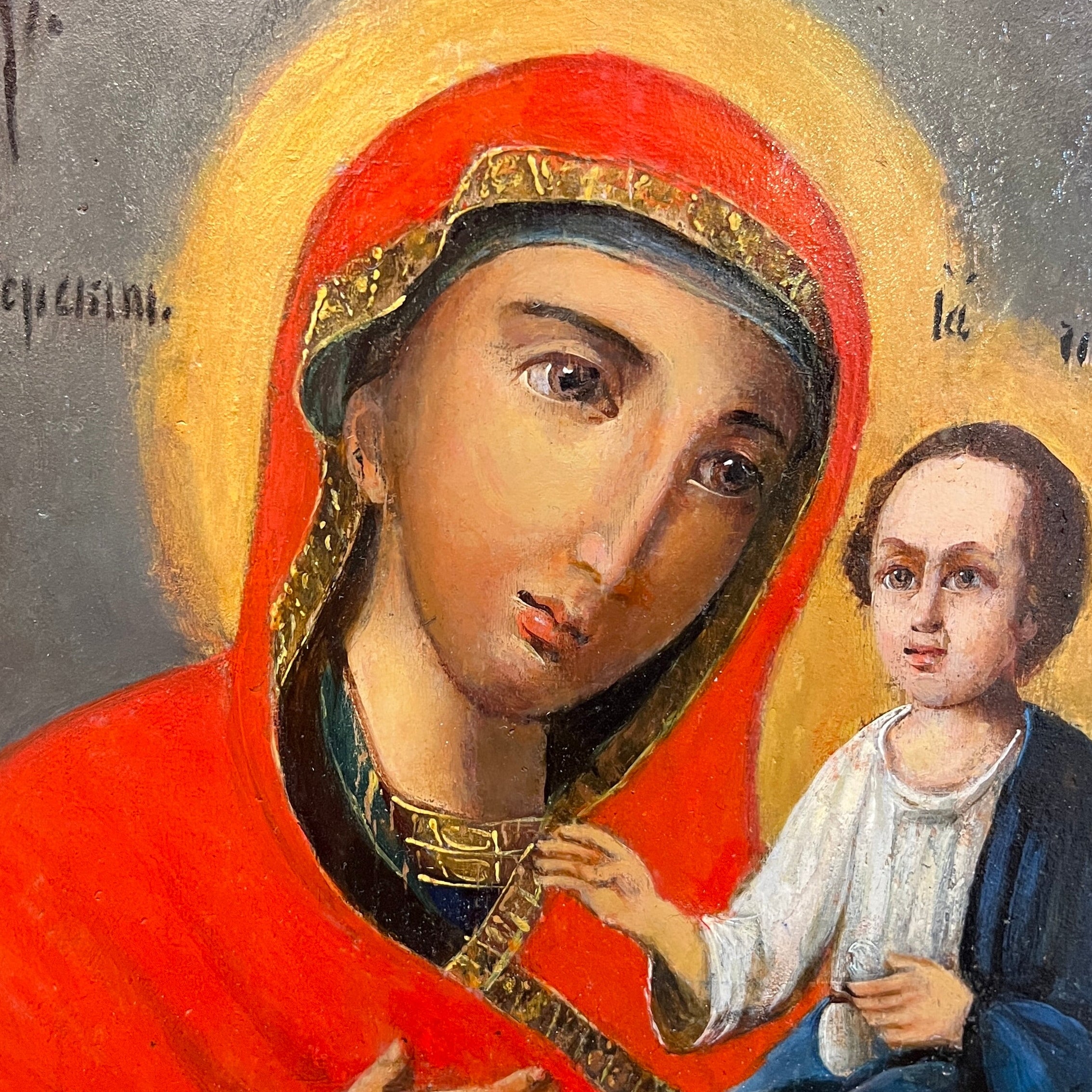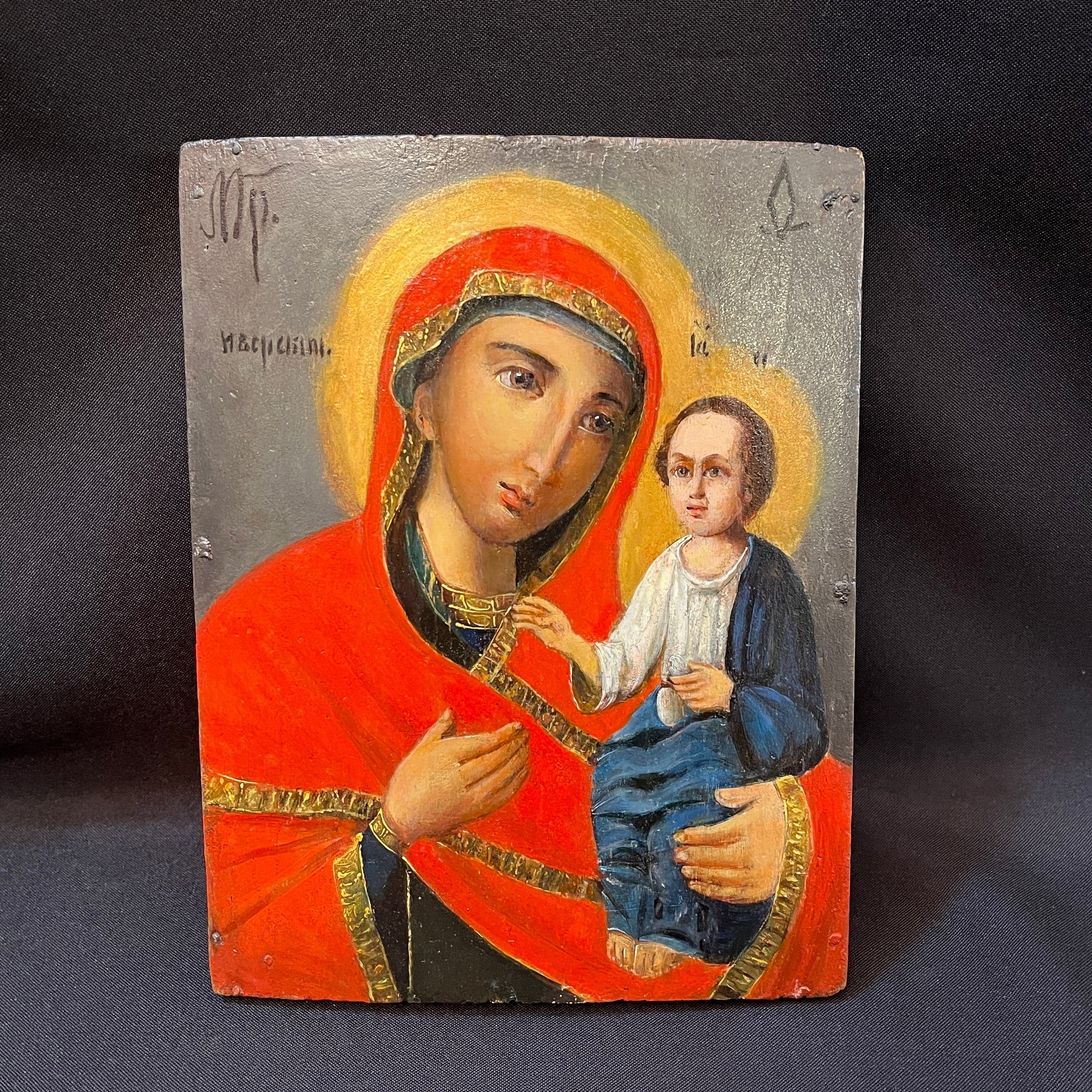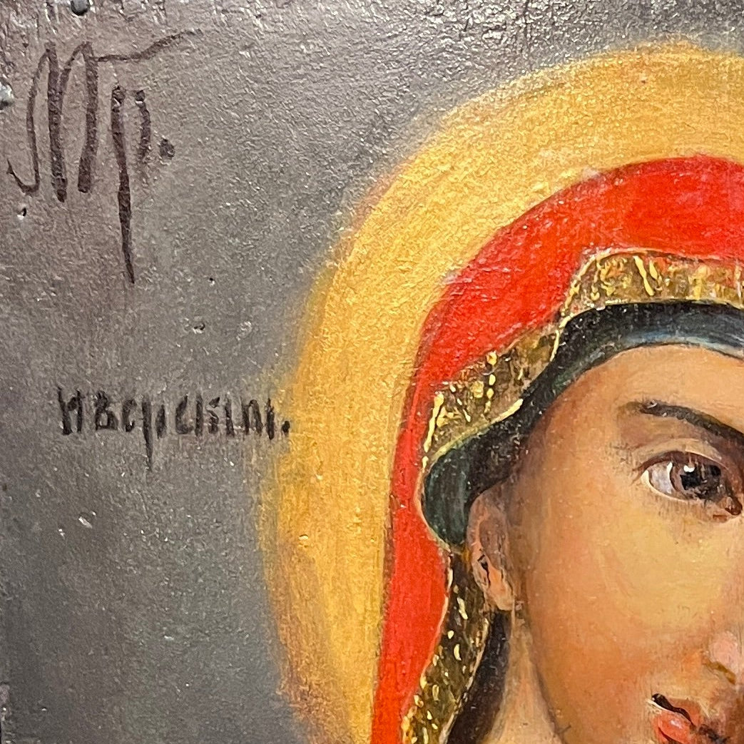Ícono ortodoxo pintado sobre madera que representa a la Virgen con el Niño, identificado como la Theotokos de Tikhvin, una de las imágenes marianas más célebres en la tradición ortodoxa. La composición destaca por la inclinación afectuosa del rostro de la Madre hacia el Niño, reforzando su carácter protector. Destaca el manto rojo intenso en contraste con el fondo y los halos luminosos que simbolizan santidad.
