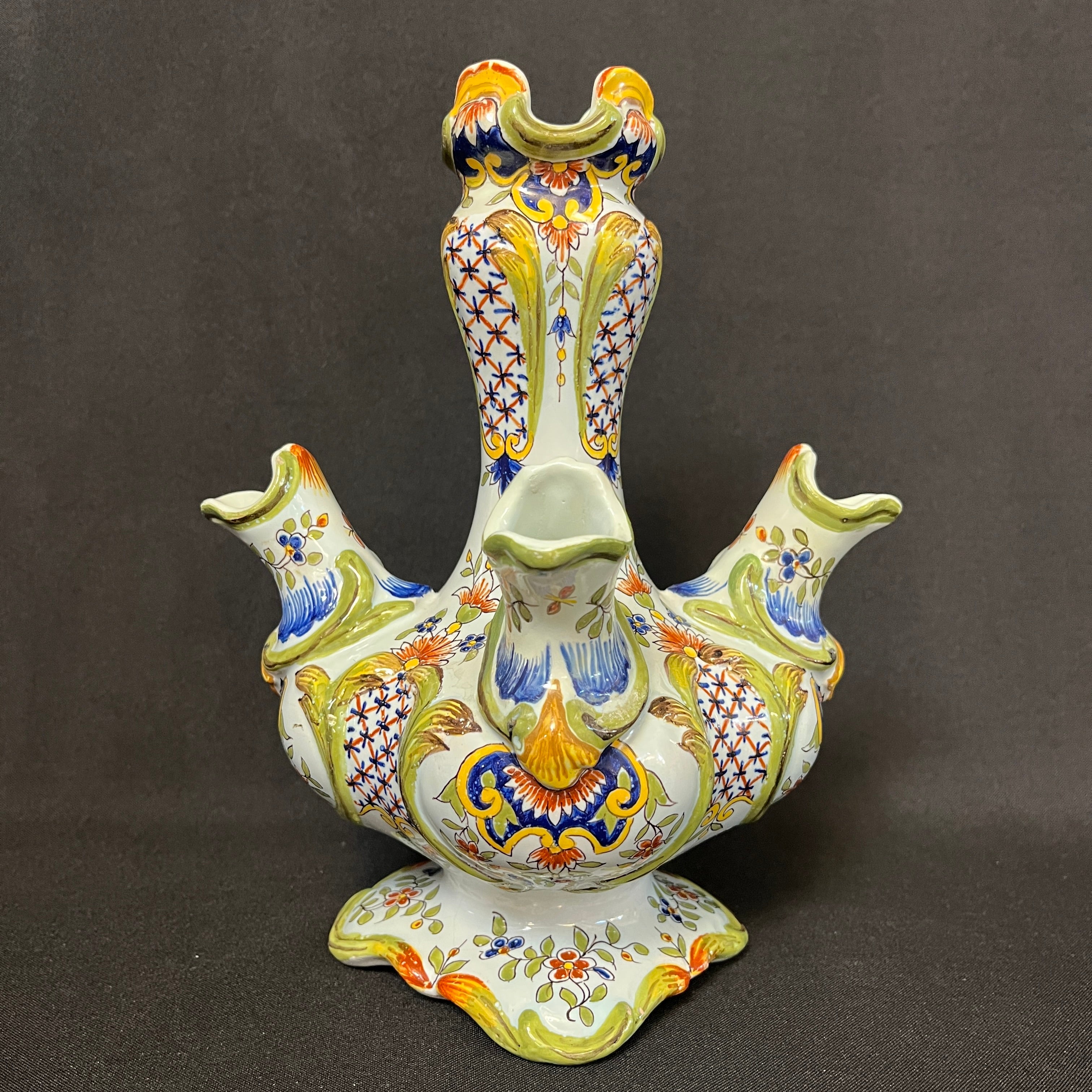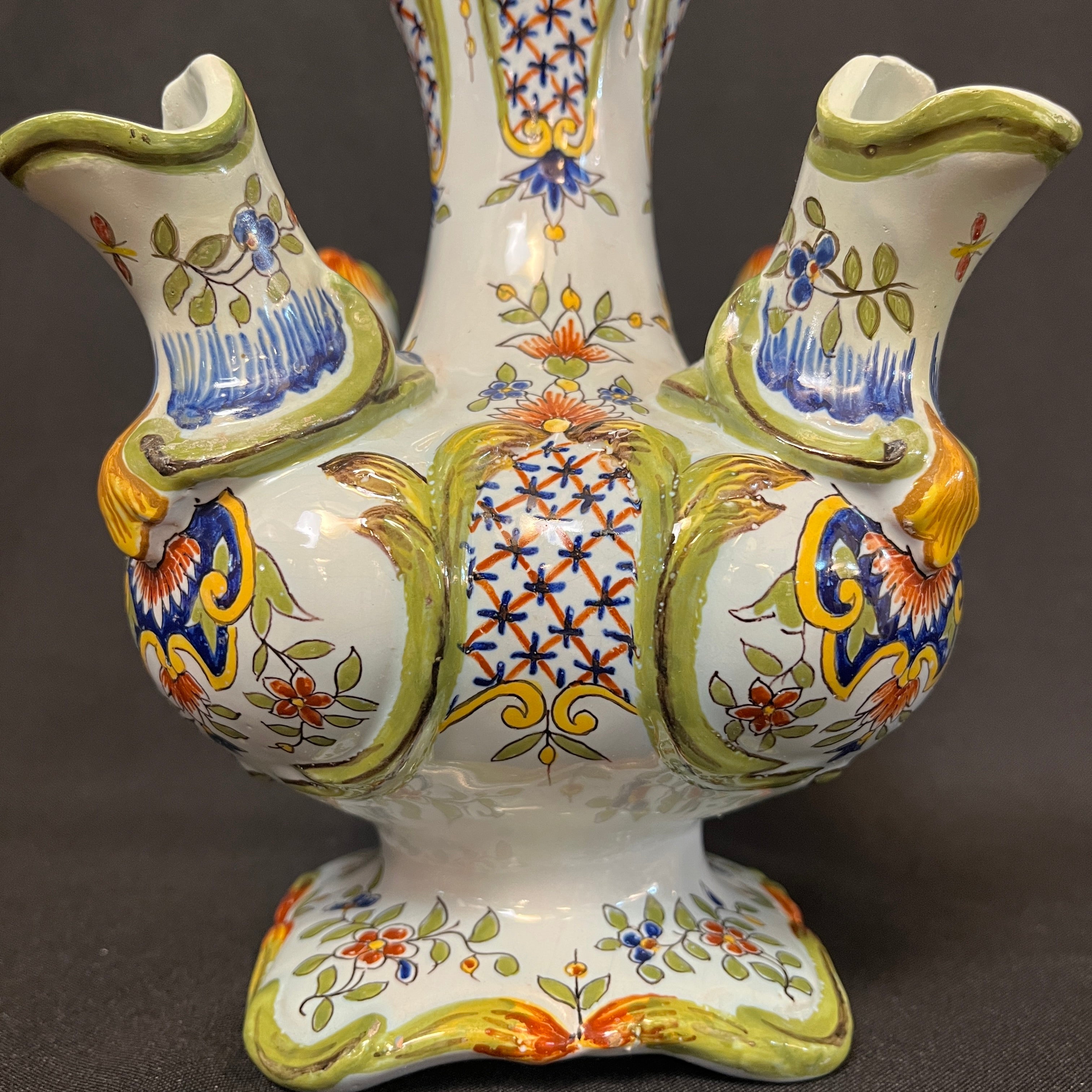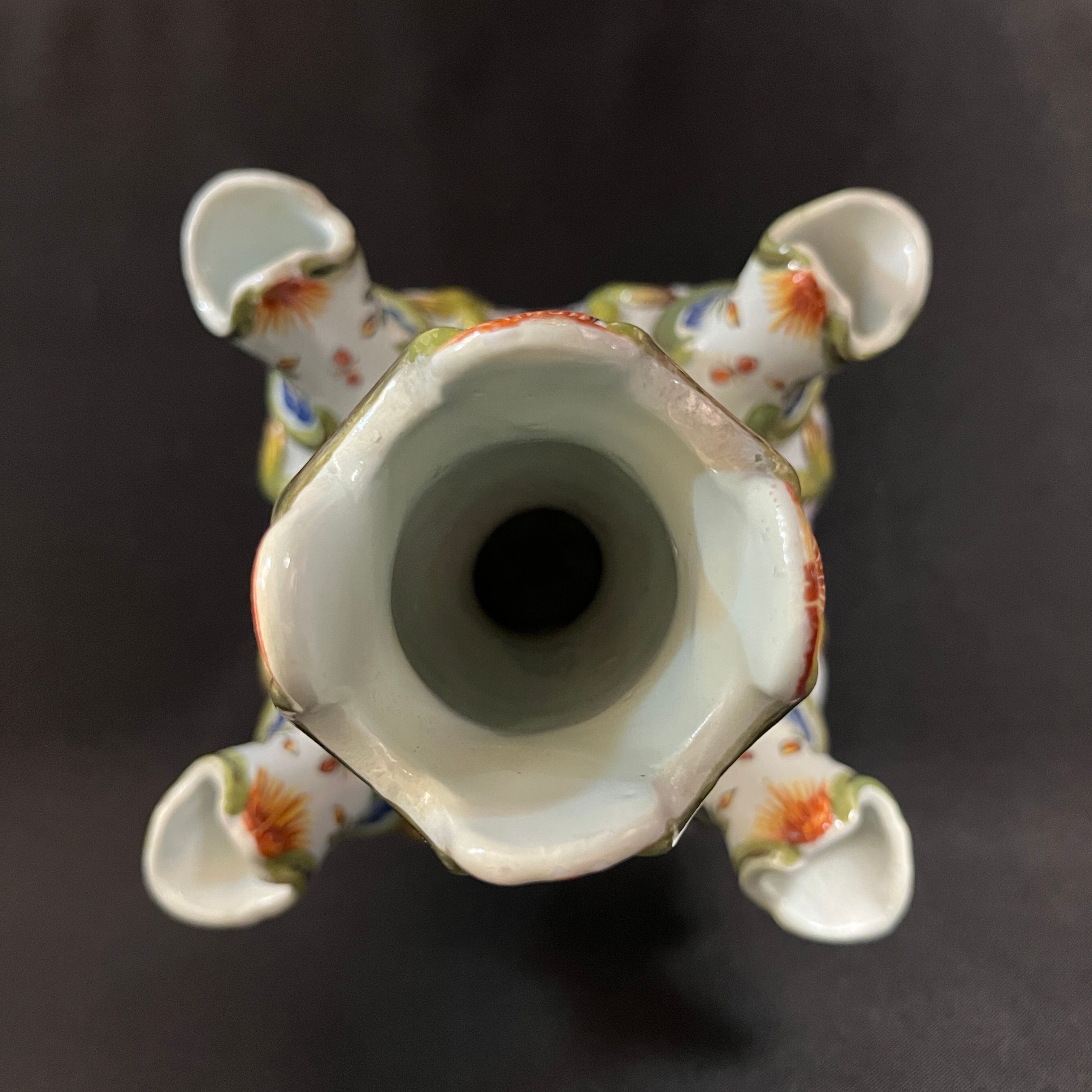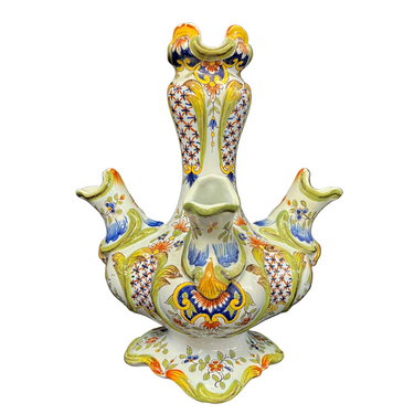 Esta fascinante pieza es un florero de porcelana o tulipero de boquillas múltiples, pensada originalmente para poner tulipanes de manera individual, convirtiéndose en un elemento muy popular en el siglo XVII en Francia.