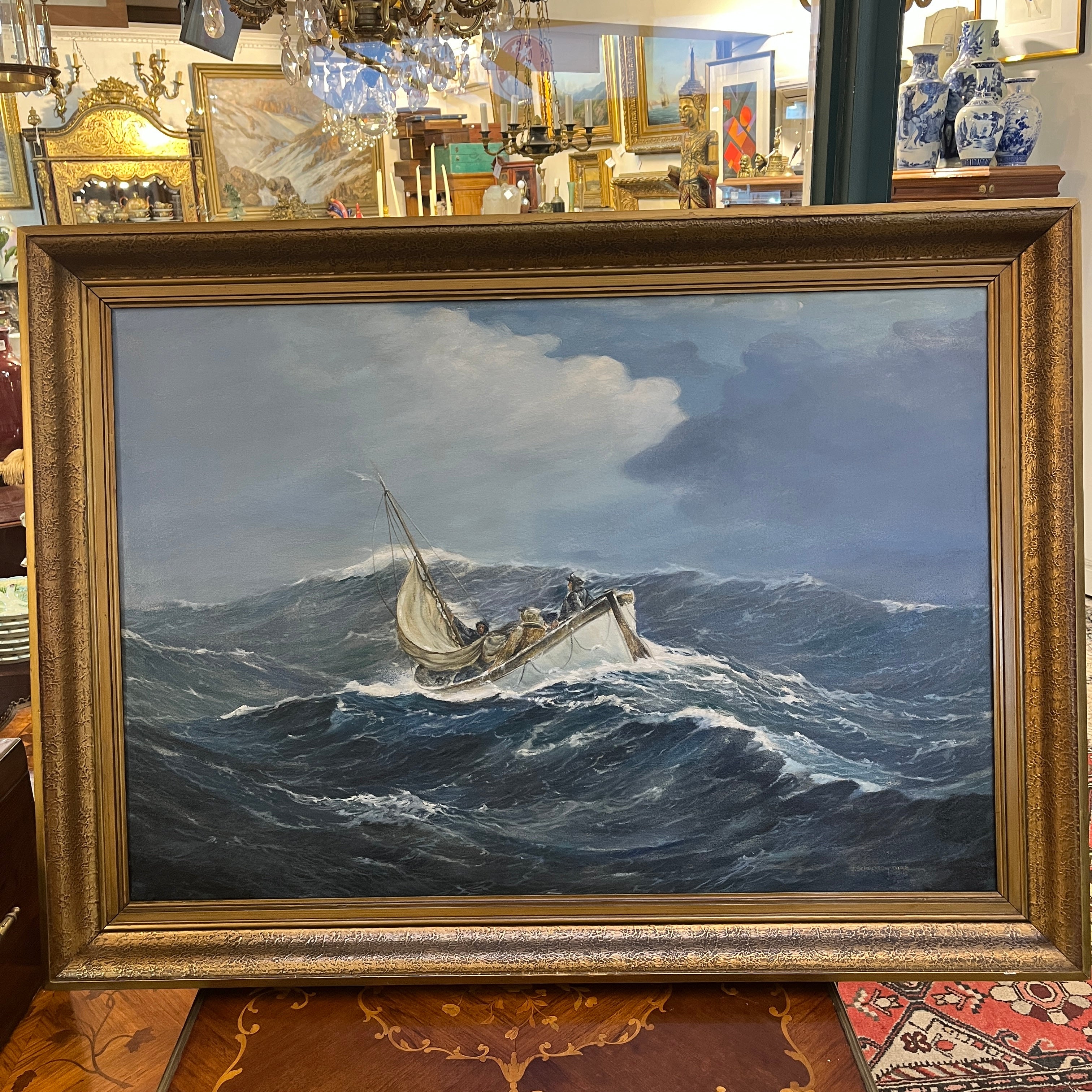 Óleo sobre tela del artista chileno Jorge Sepúlveda Díaz, representando una escena marina, en la que un pequeño velero y sus tripulantes navegan, combatiendo una tormenta. La obra tiene un marco de madera tallada en relieves y terminada en dorado.