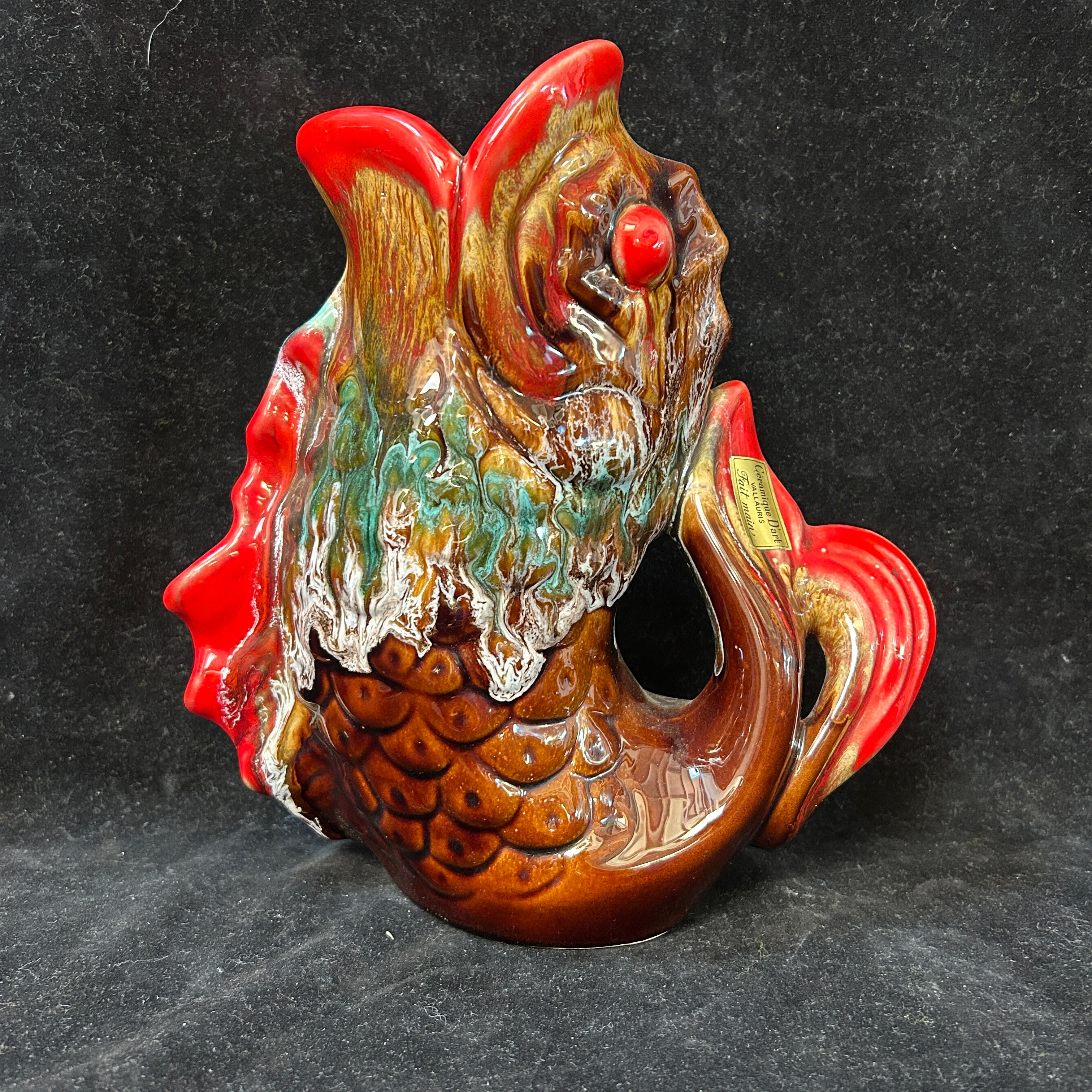 Llamativa jarra de porcelana mayólica francesa de Vallauris con forma de pez. Destacan en ella los tonos rojos y la imponente forma de un pez con su boca abierta.