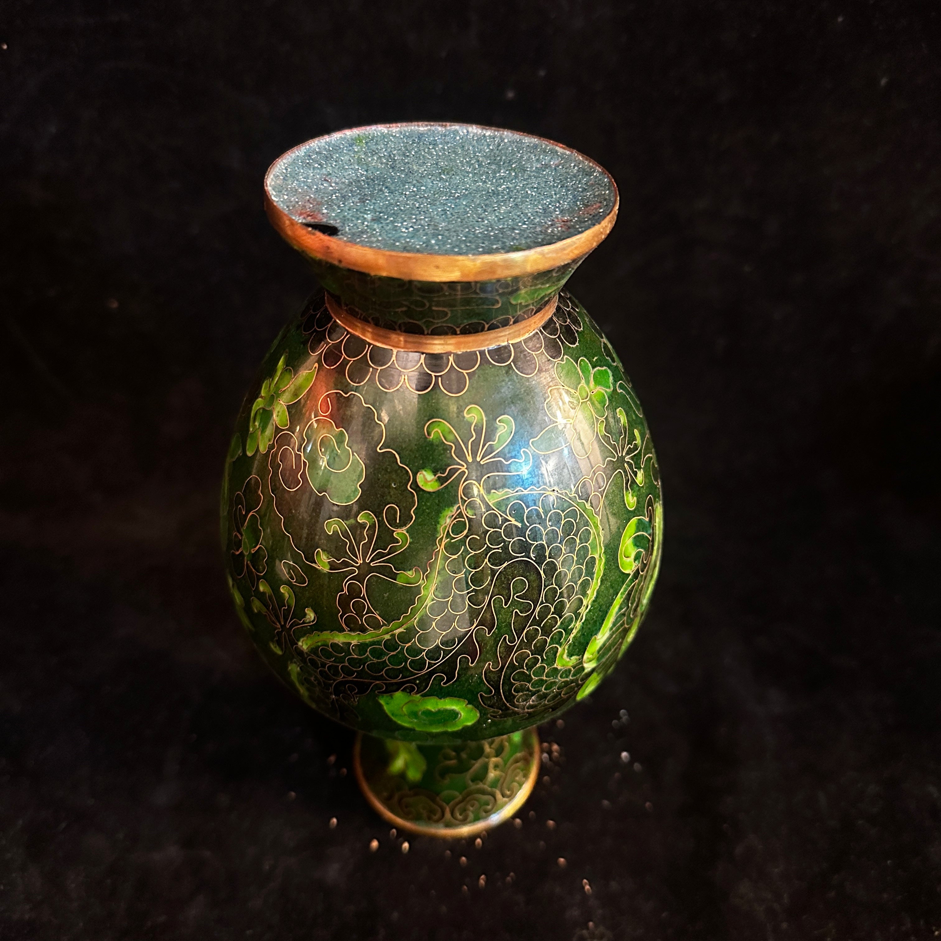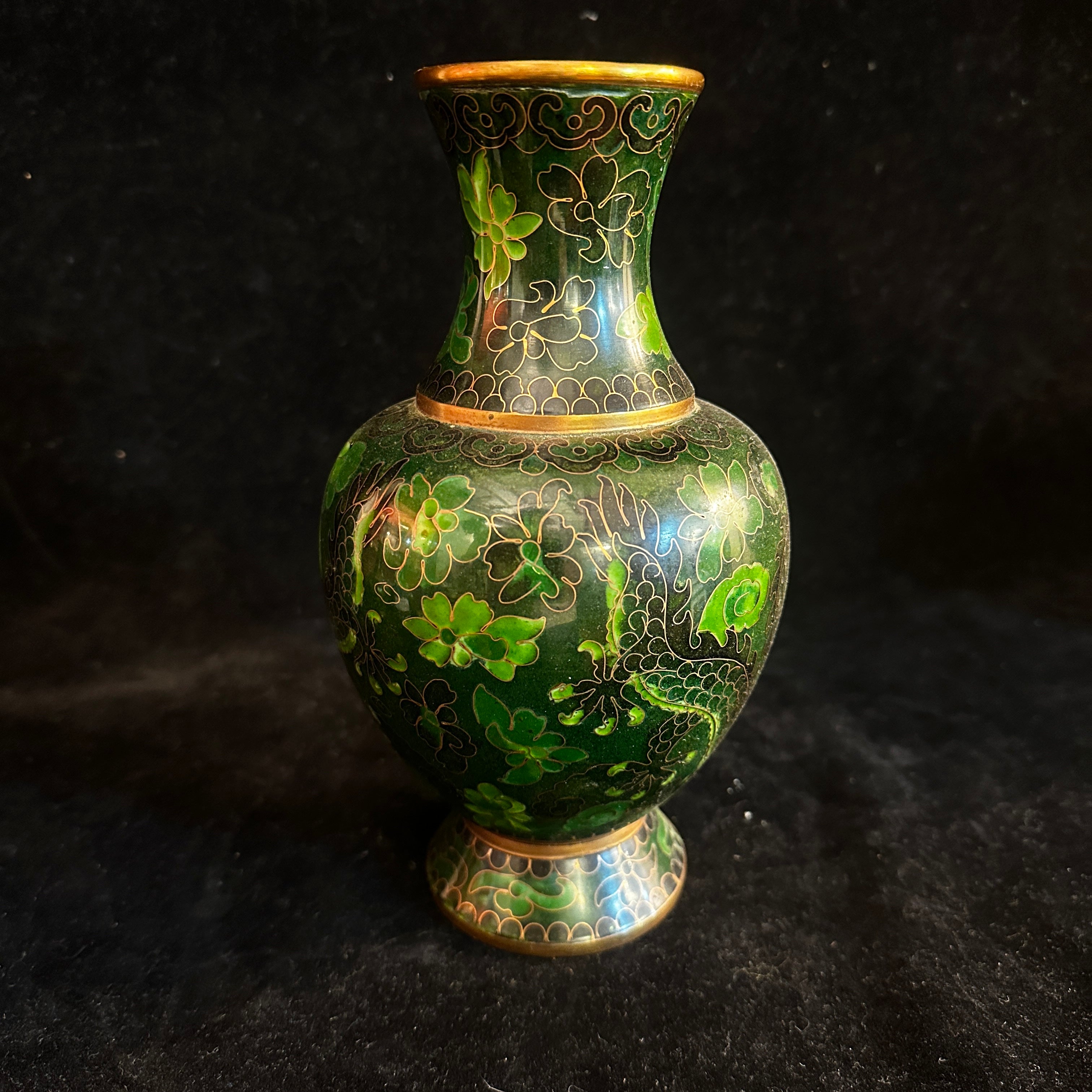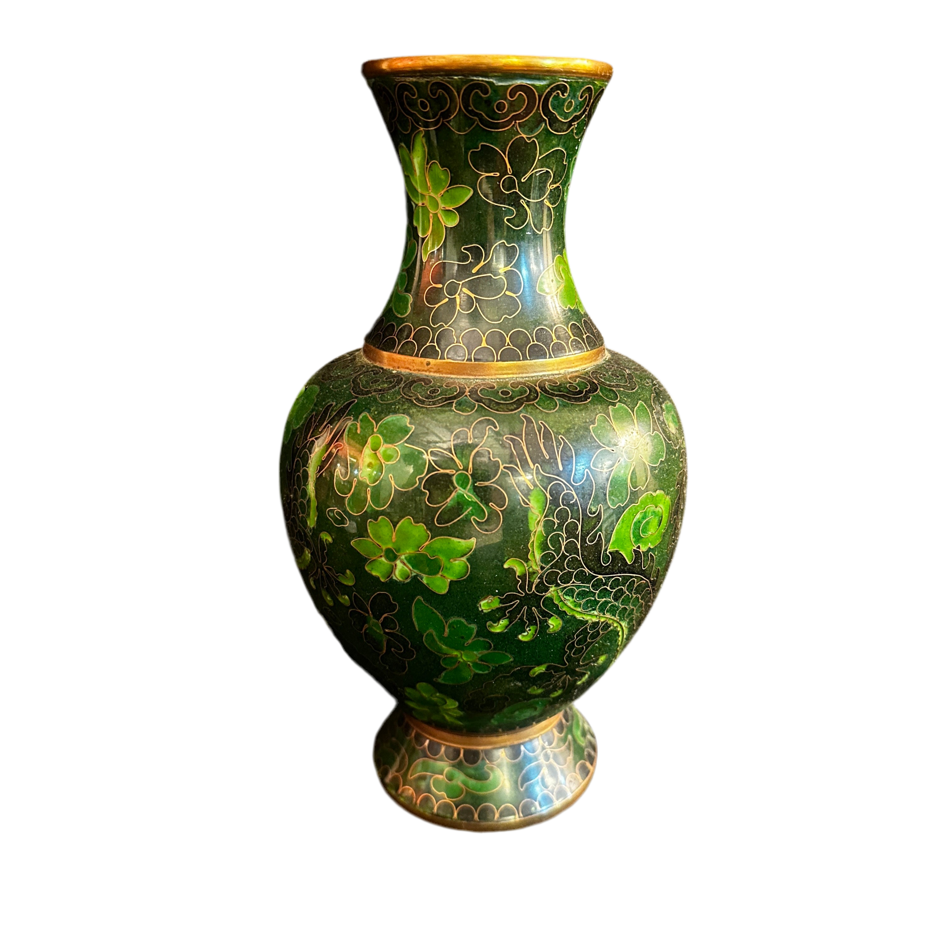 Bello jarrón de bronce cloissoné, de origen chino, con un precioso esmaltado de color verde oscuro, con decorados en dorado en motivos vegetales y dos dragones como figuras centrales, que recorren toda la superficie. Su base está terminada con un esmalte celeste.