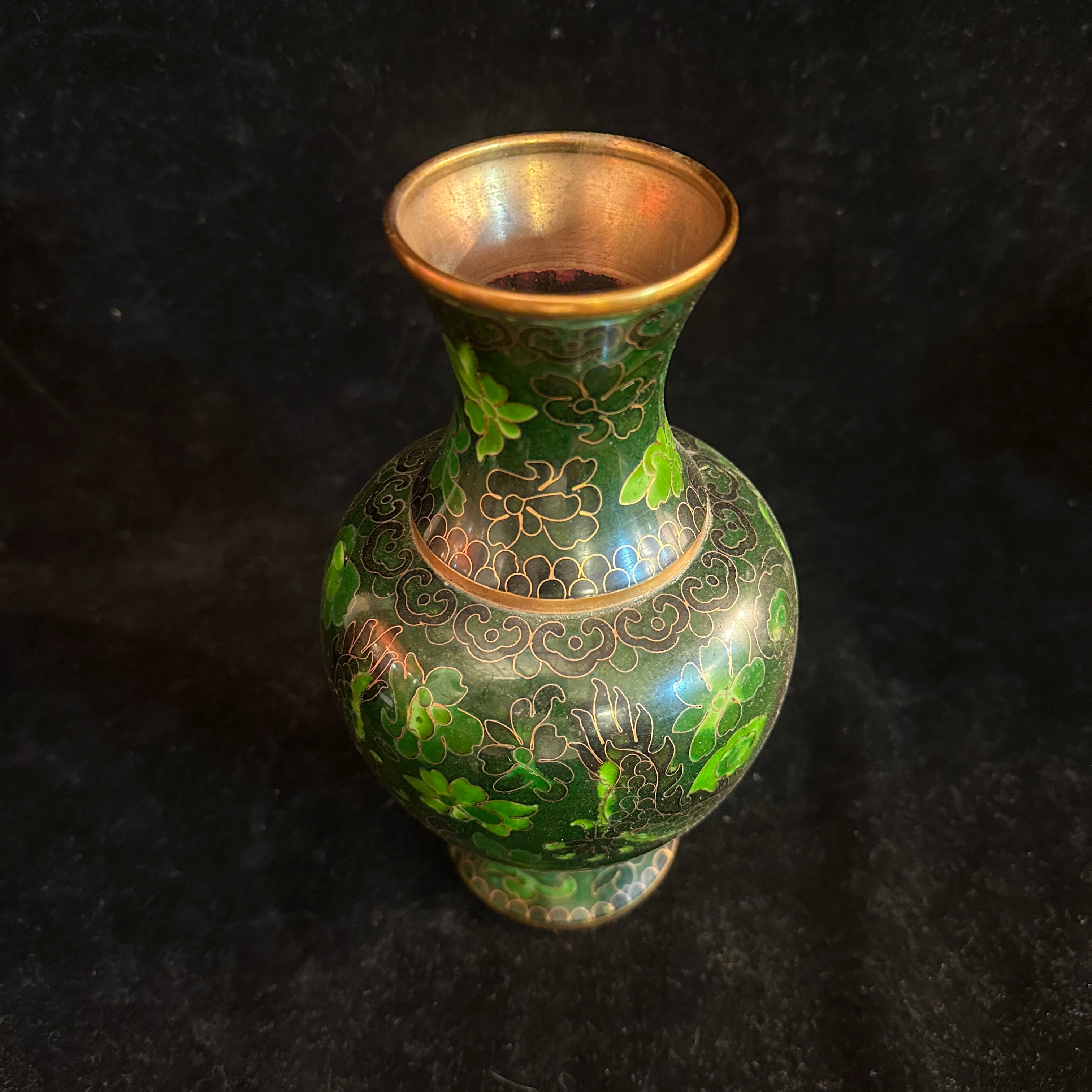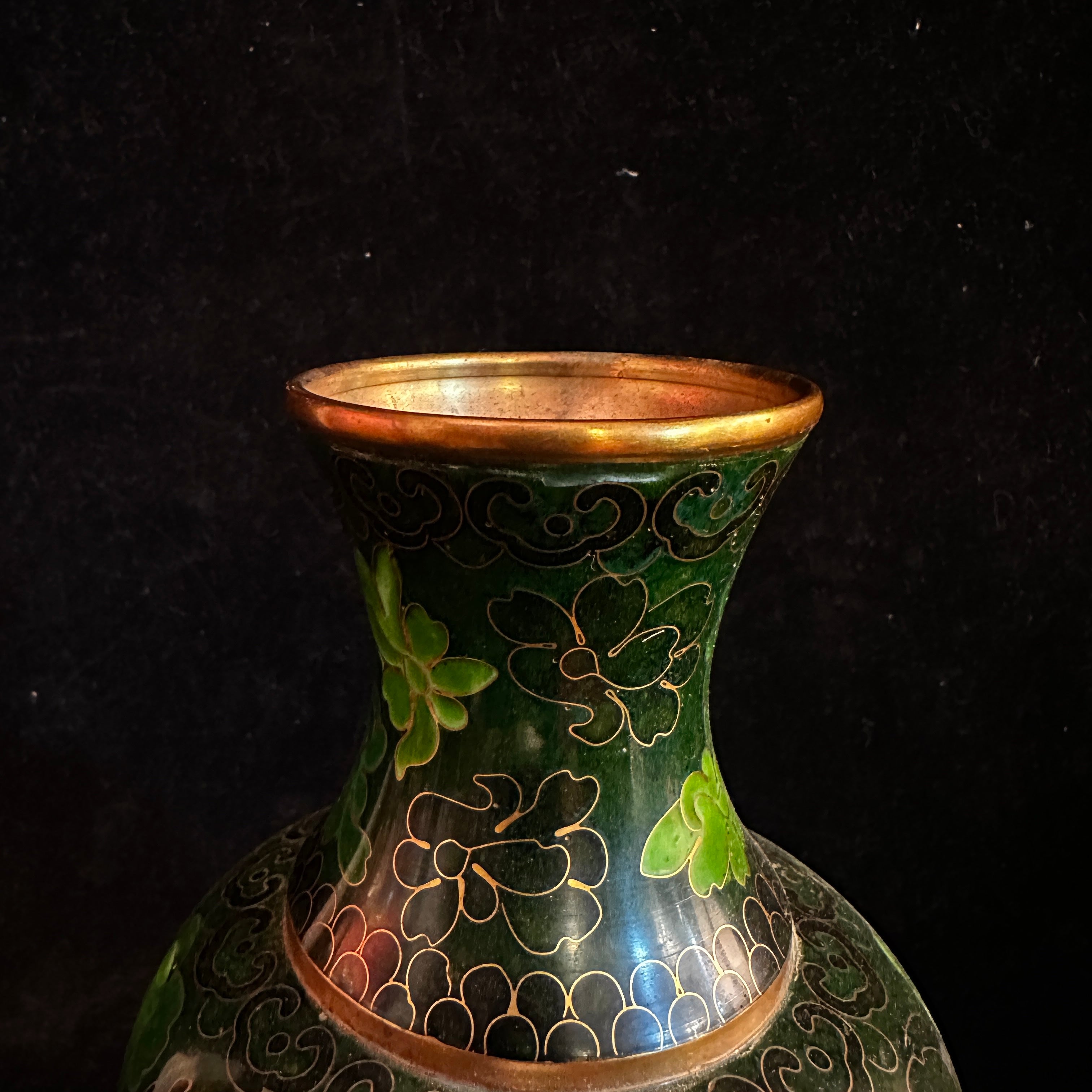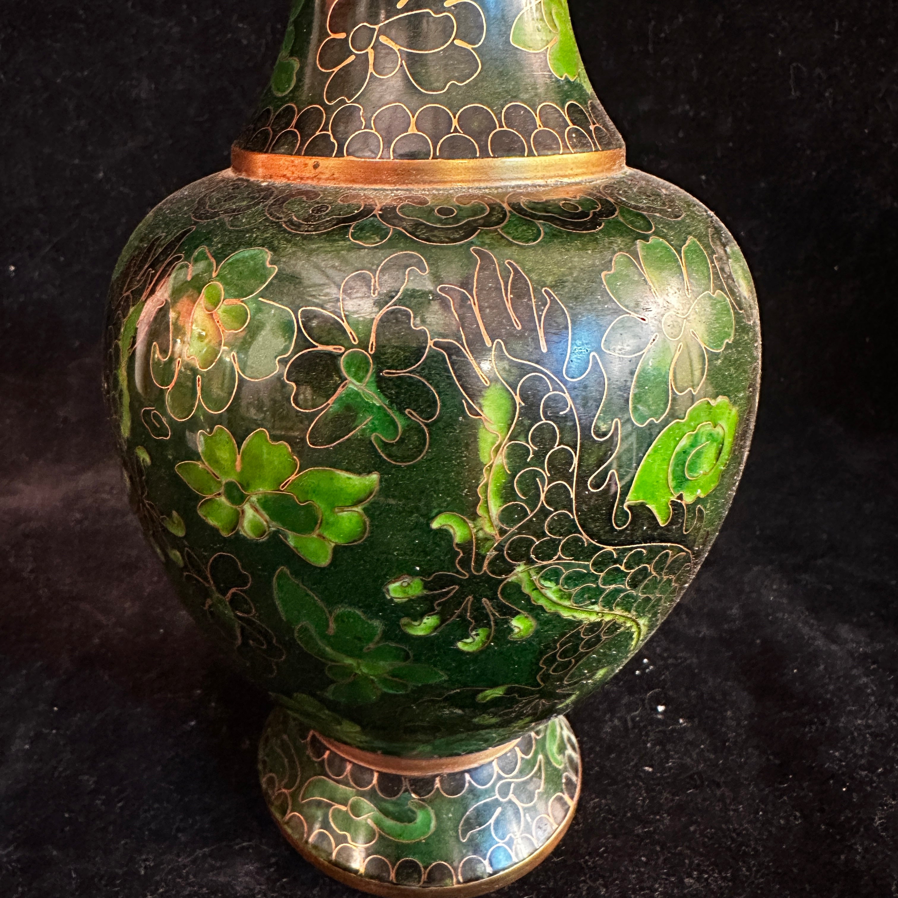 Bello jarrón de bronce cloissoné, de origen chino, con un precioso esmaltado de color verde oscuro, con decorados en dorado en motivos vegetales y dos dragones como figuras centrales, que recorren toda la superficie. Su base está terminada con un esmalte celeste.