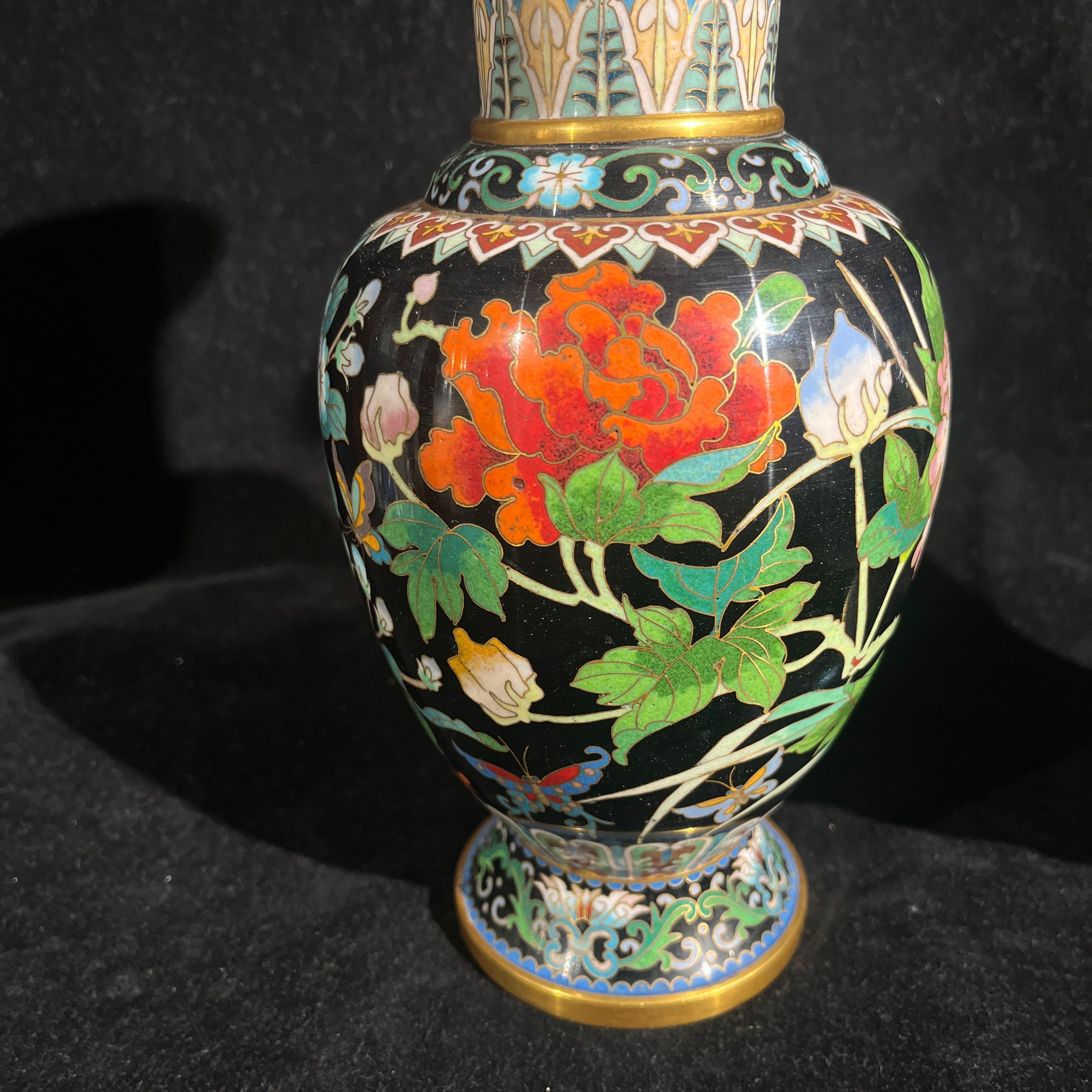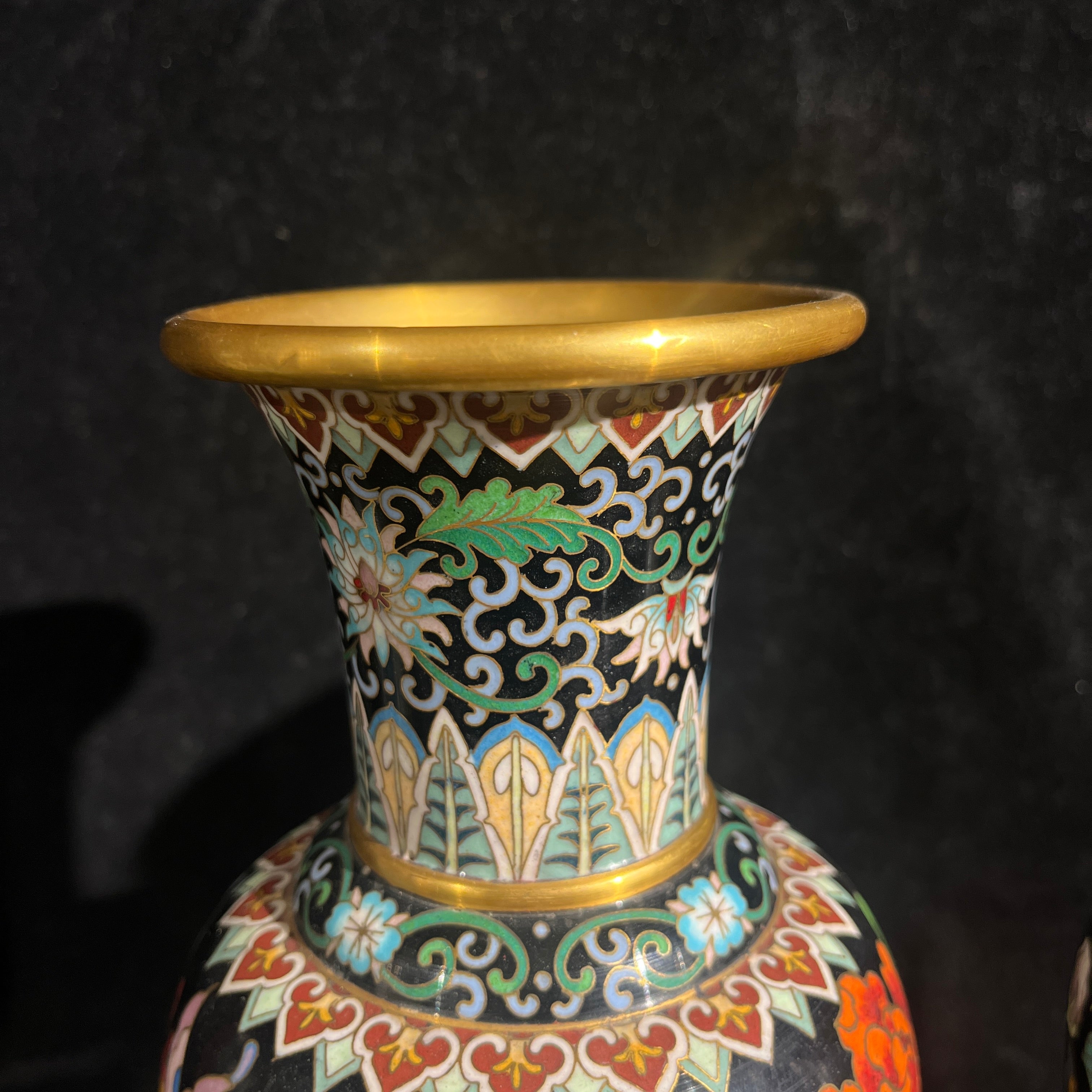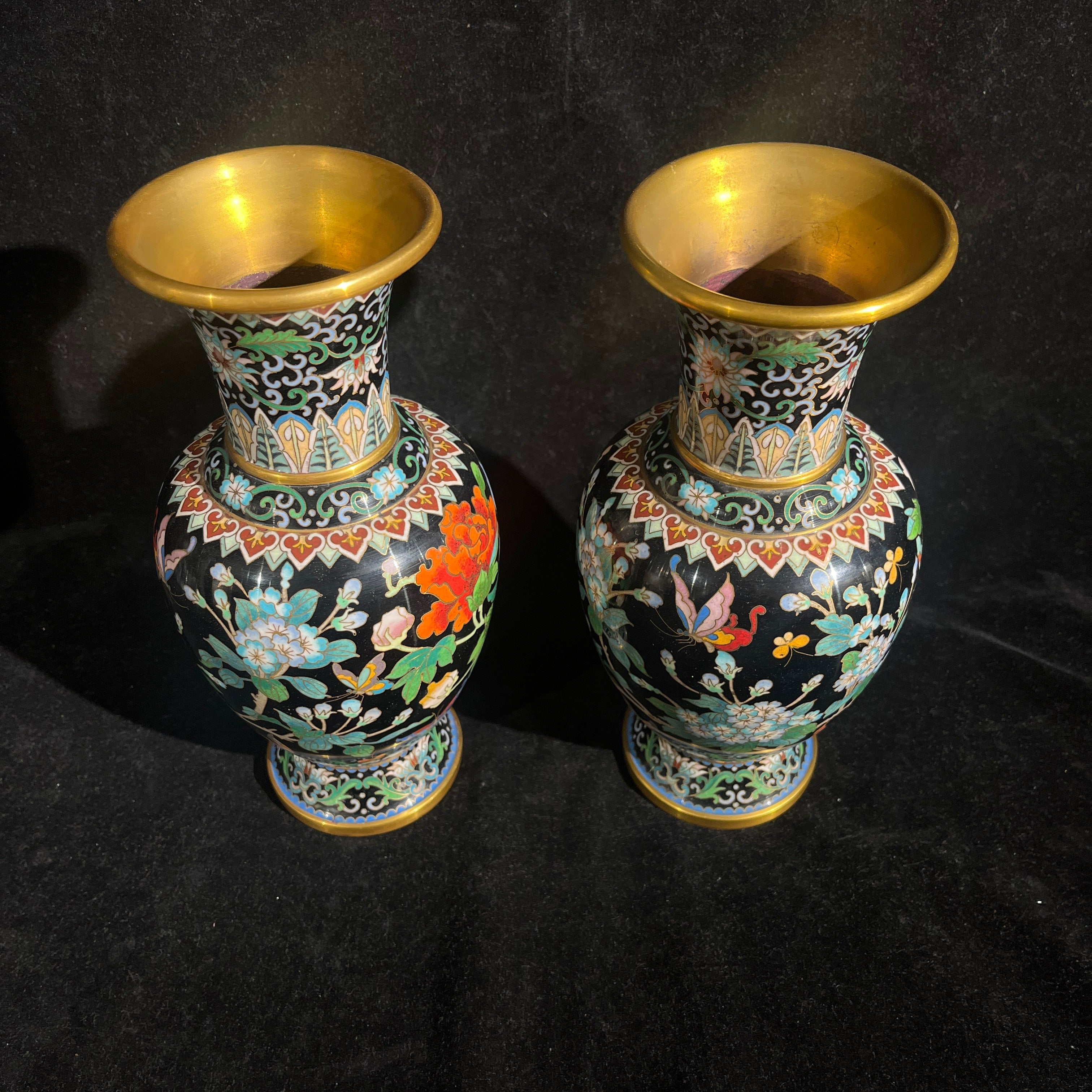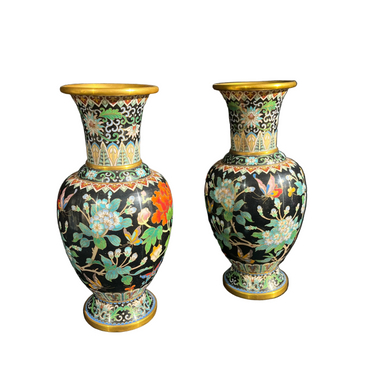 Bellísima pareja de jarrones cloissoné de origen chino contemporáneo s.XX, hechos en bronce con la tradicional técnica en filetes de bronce y esmaltes de colores, sobre un fondo negro, que hace resaltar aún más sus diseños florales y de mariposas. Las piezas tienen bordes dorados en su cuello y base.