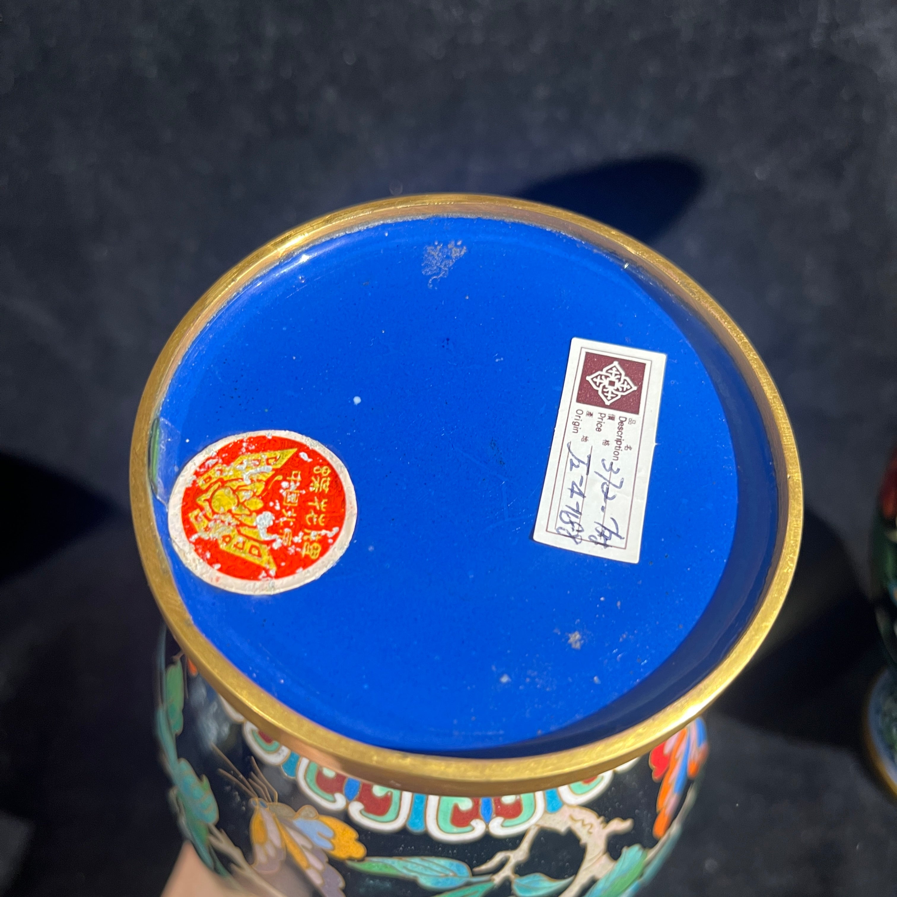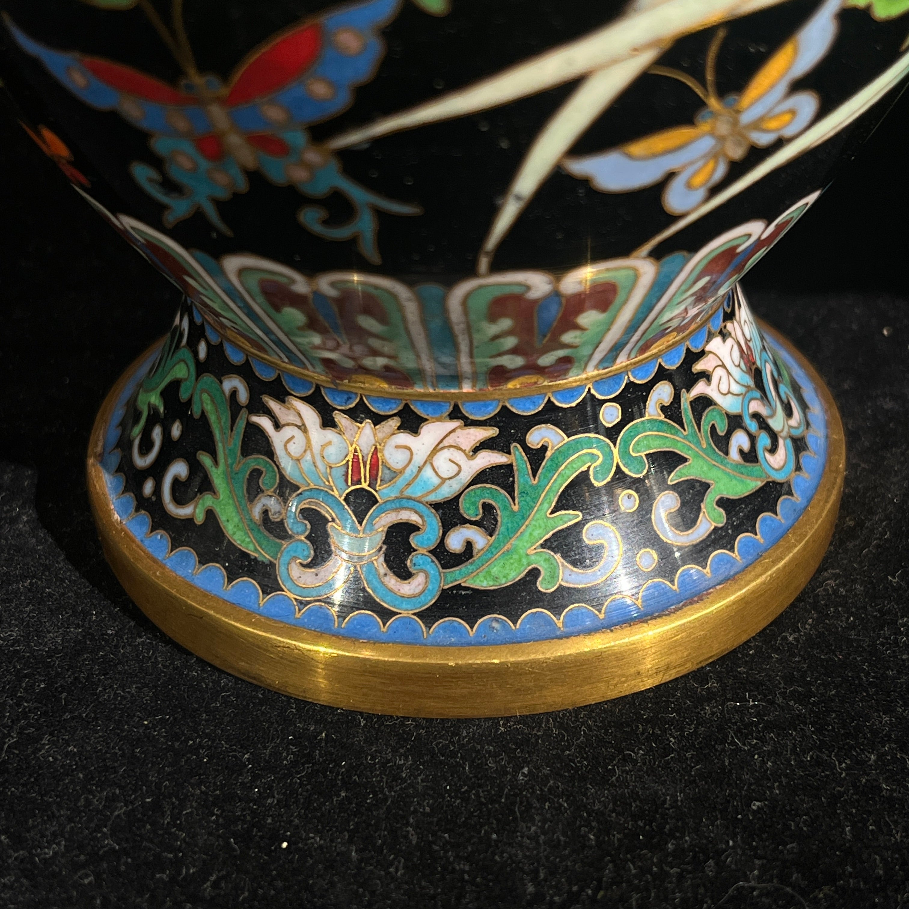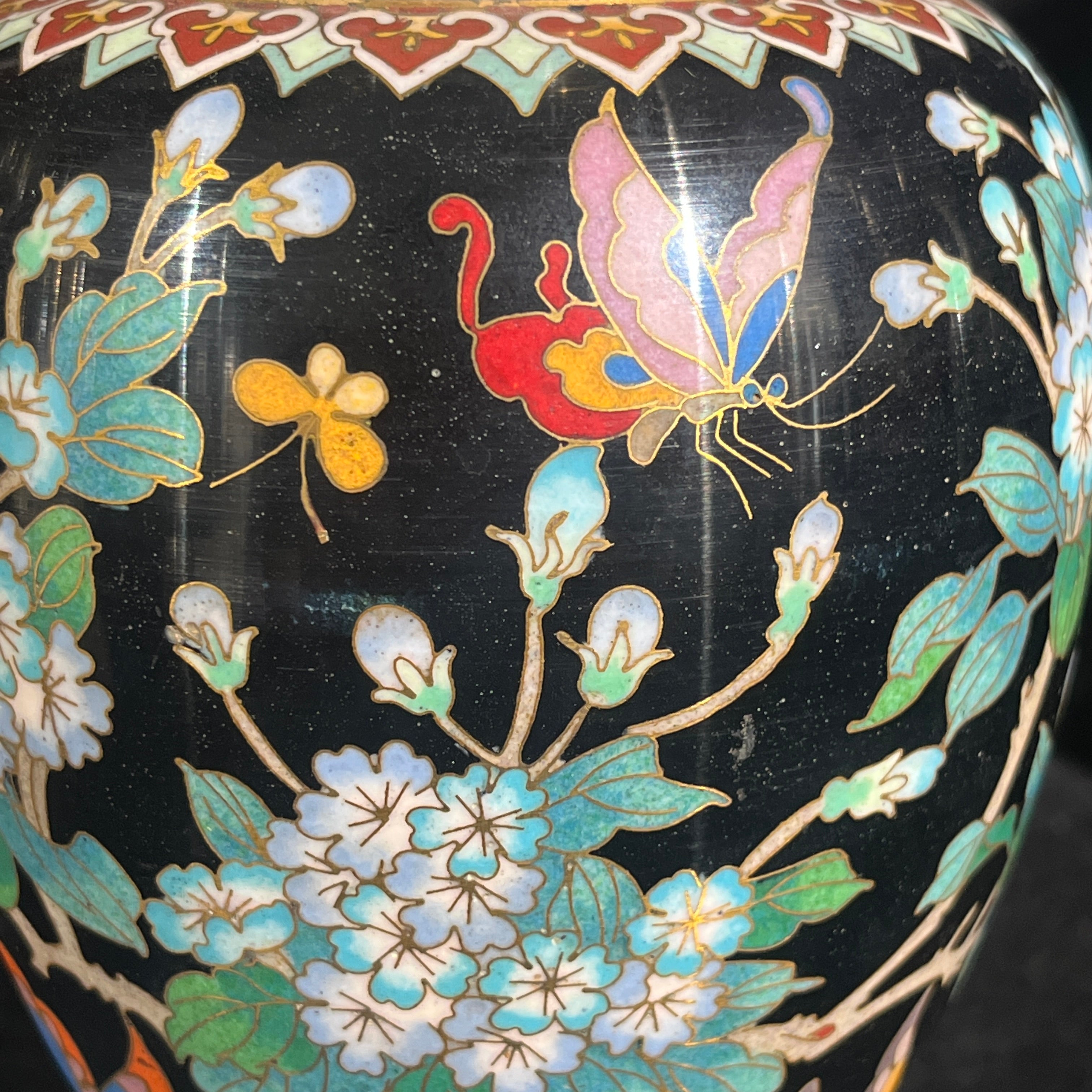 Bellísima pareja de jarrones cloissoné de origen chino contemporáneo s.XX, hechos en bronce con la tradicional técnica en filetes de bronce y esmaltes de colores, sobre un fondo negro, que hace resaltar aún más sus diseños florales y de mariposas. Las piezas tienen bordes dorados en su cuello y base.