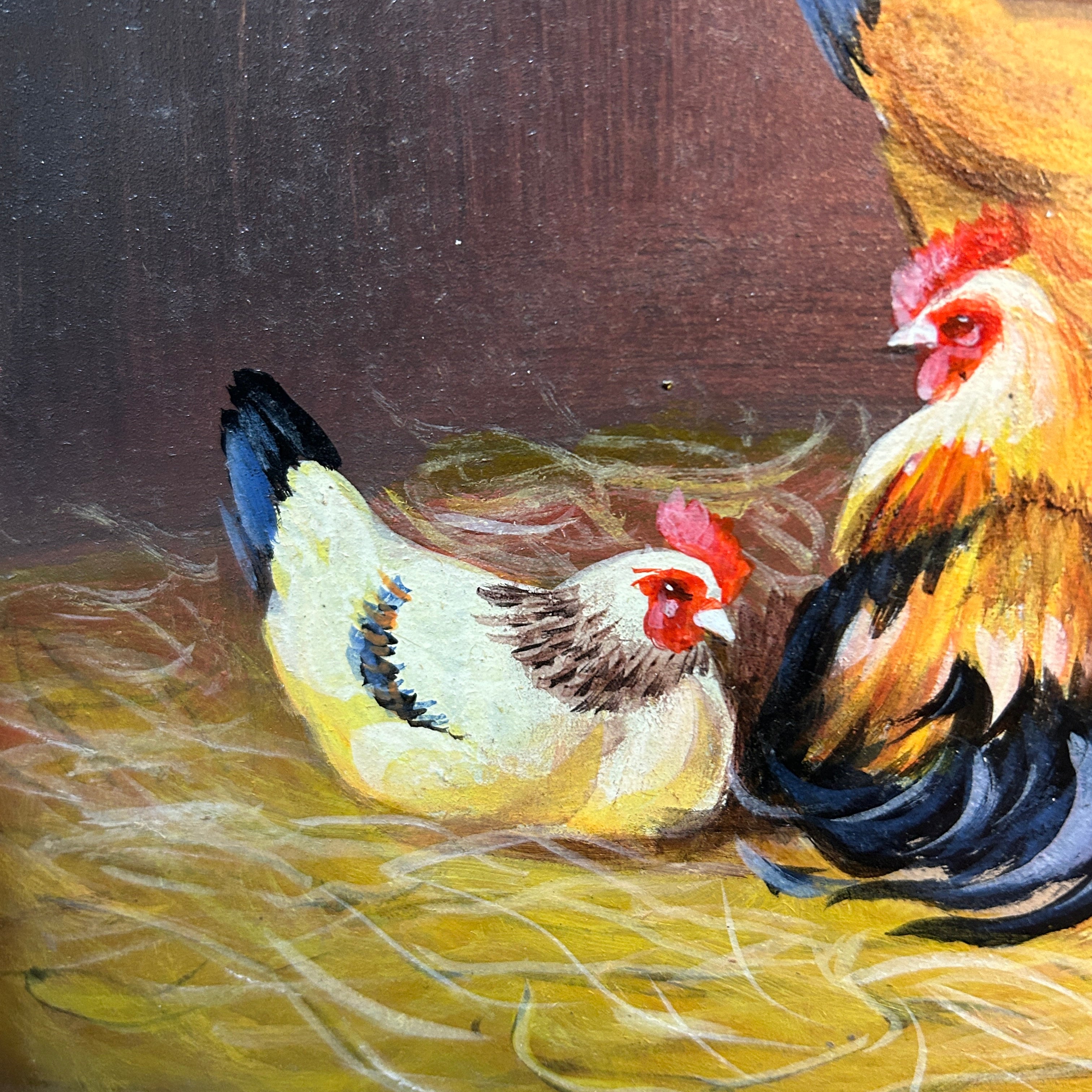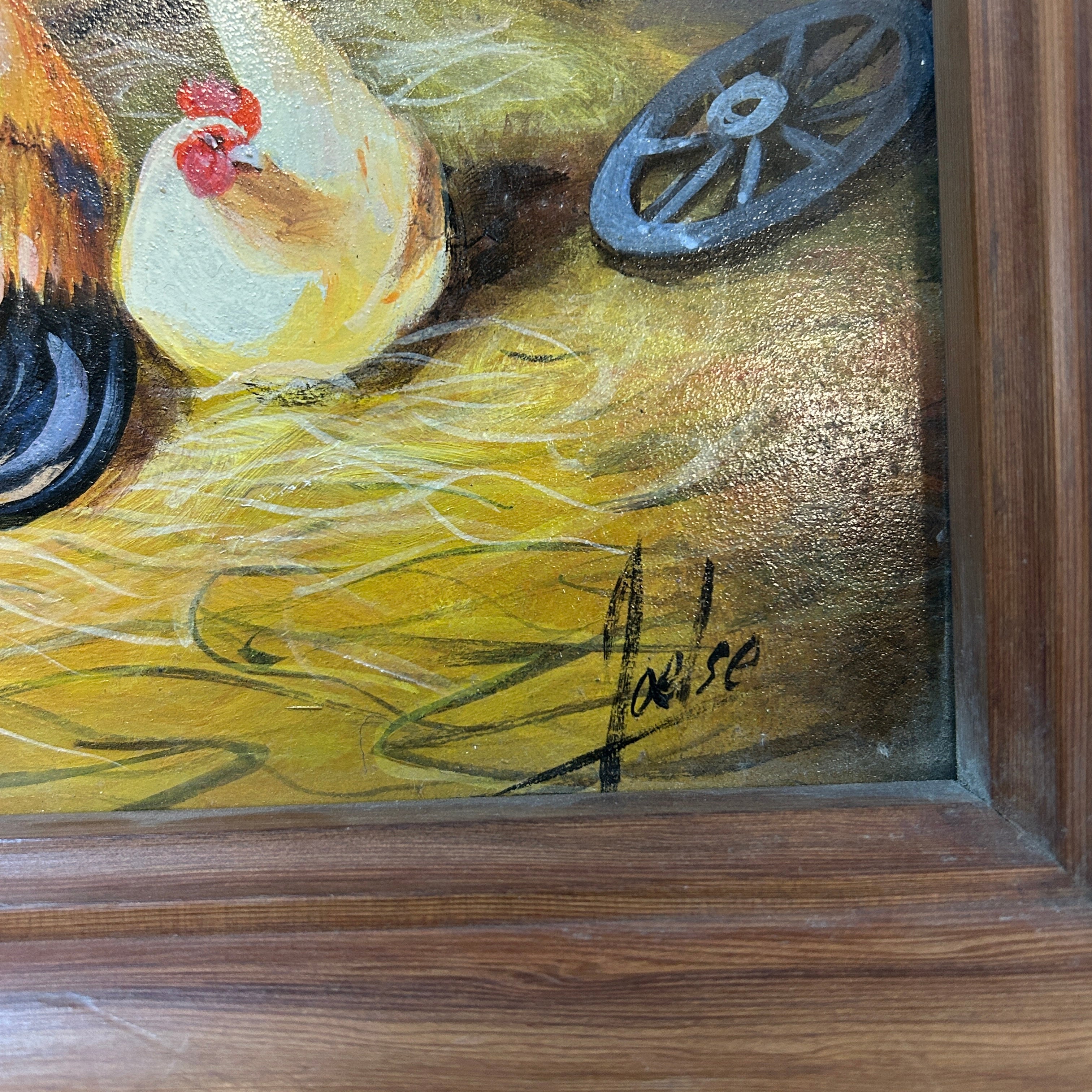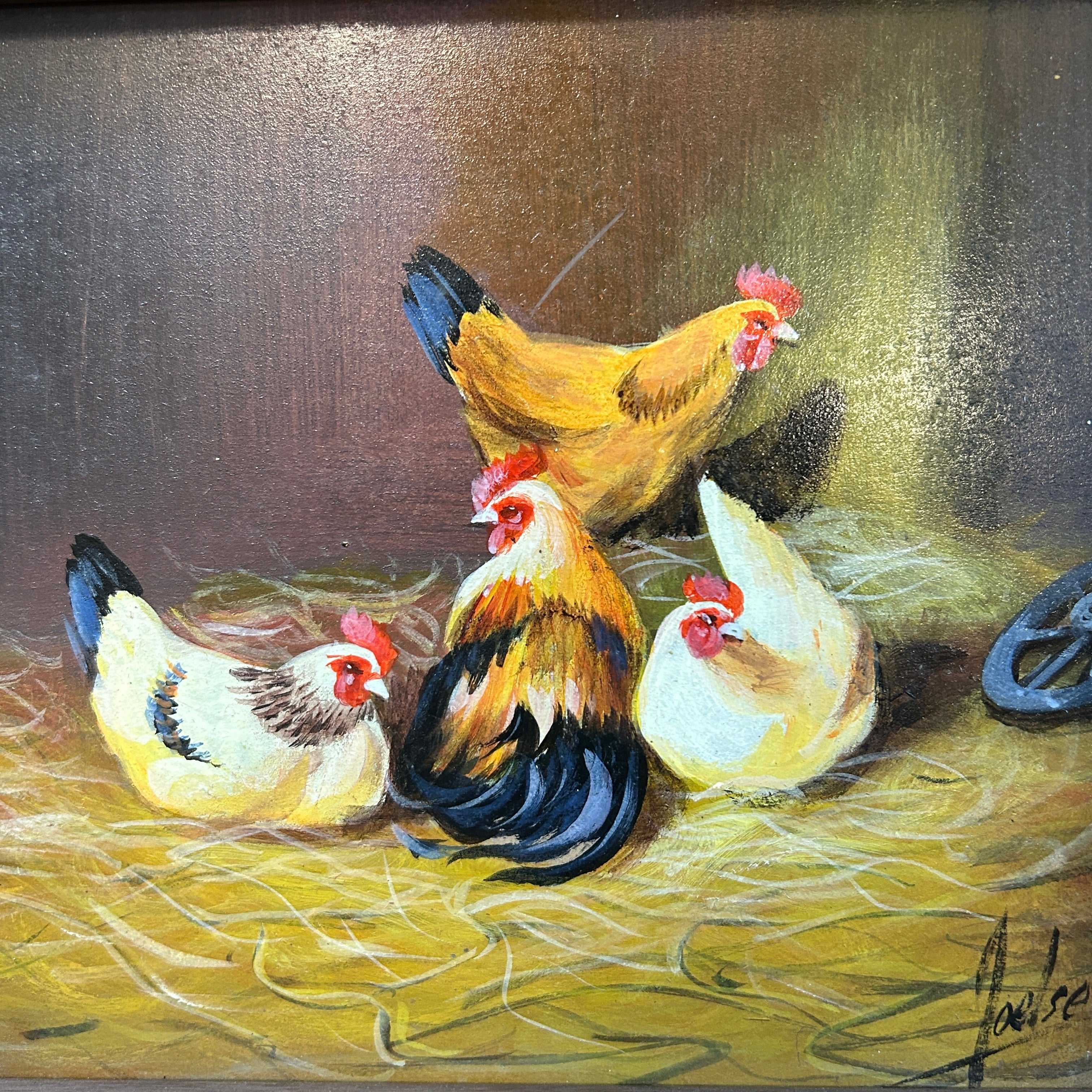 Luminosa pintura del talentoso pintor chileno Joelse que retrata 4 gallinas en lo que puede ser un gallinero. Es un cuadro donde se pueden apreciar los detalles realistas de cada gallina, sus plumas, rostros y movimiento, entregando la sensación de estar presente en una escena viva.