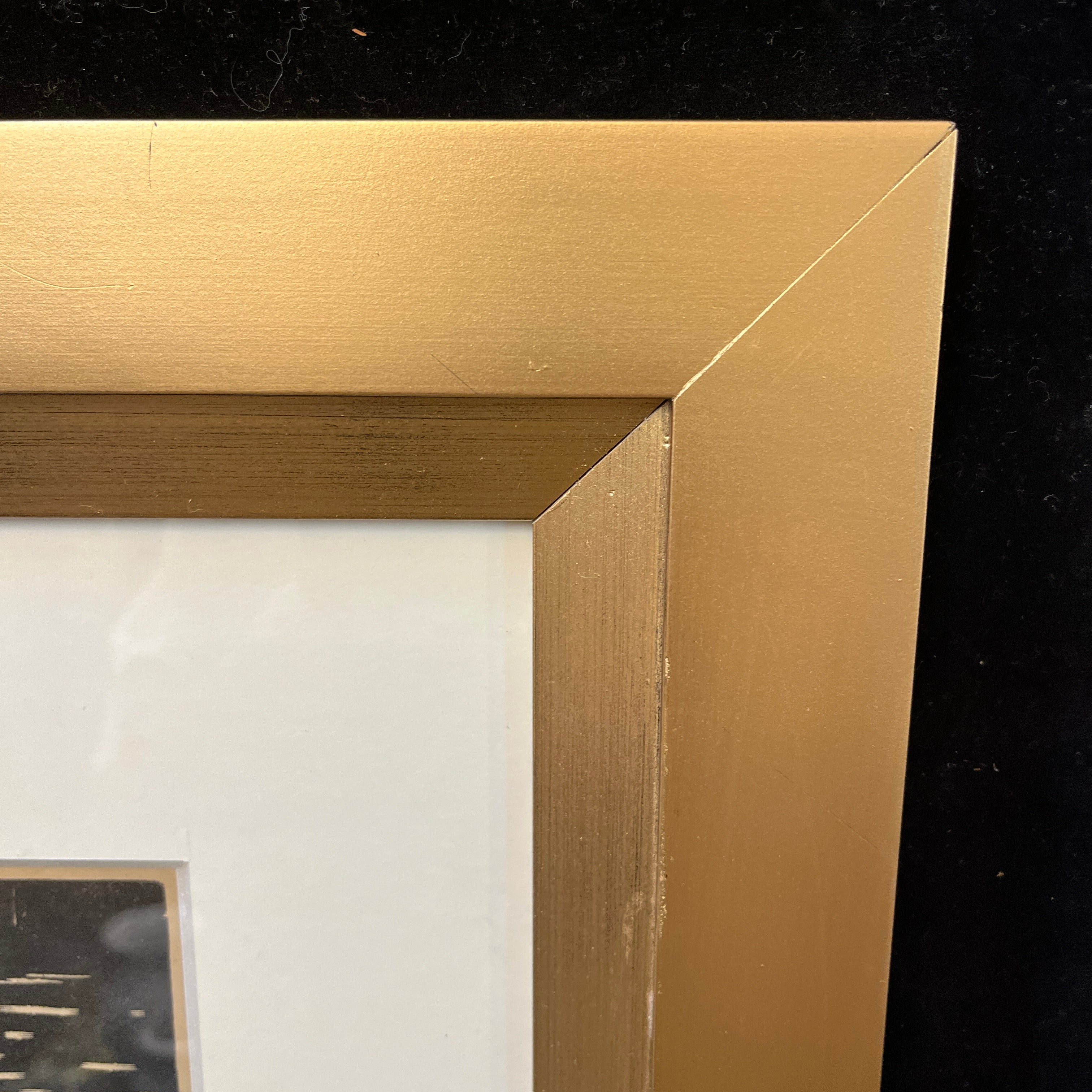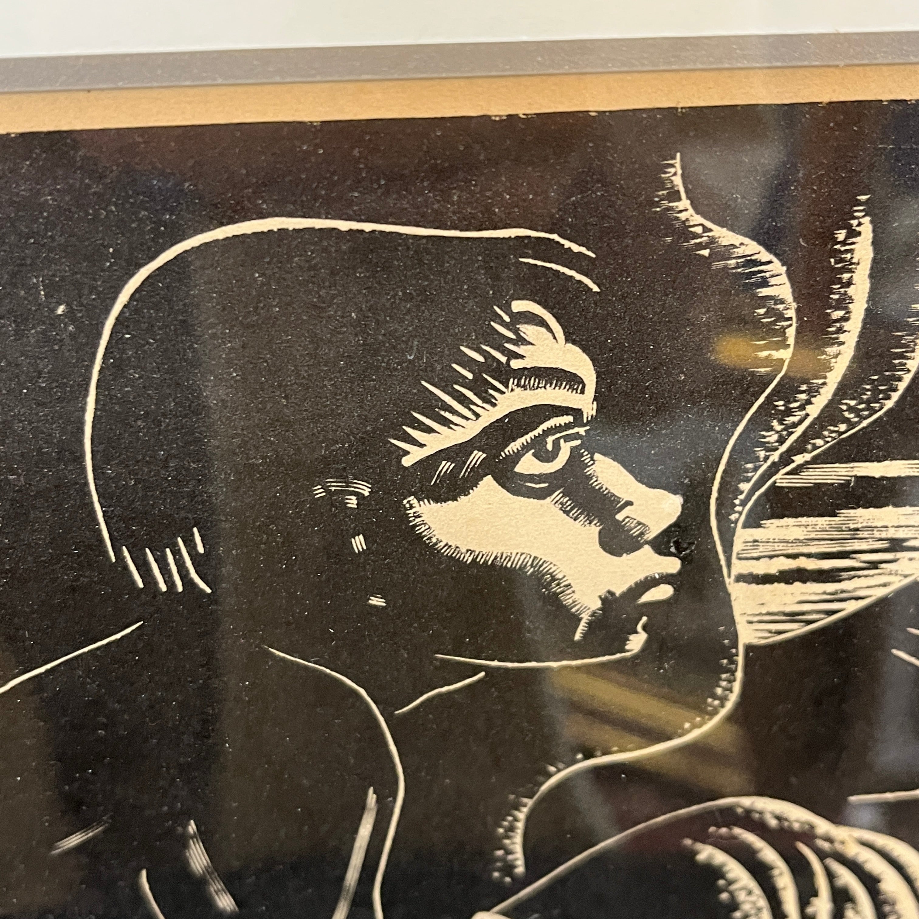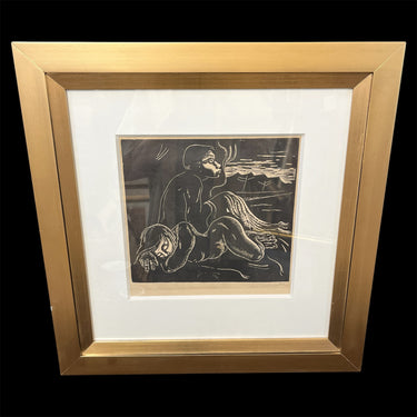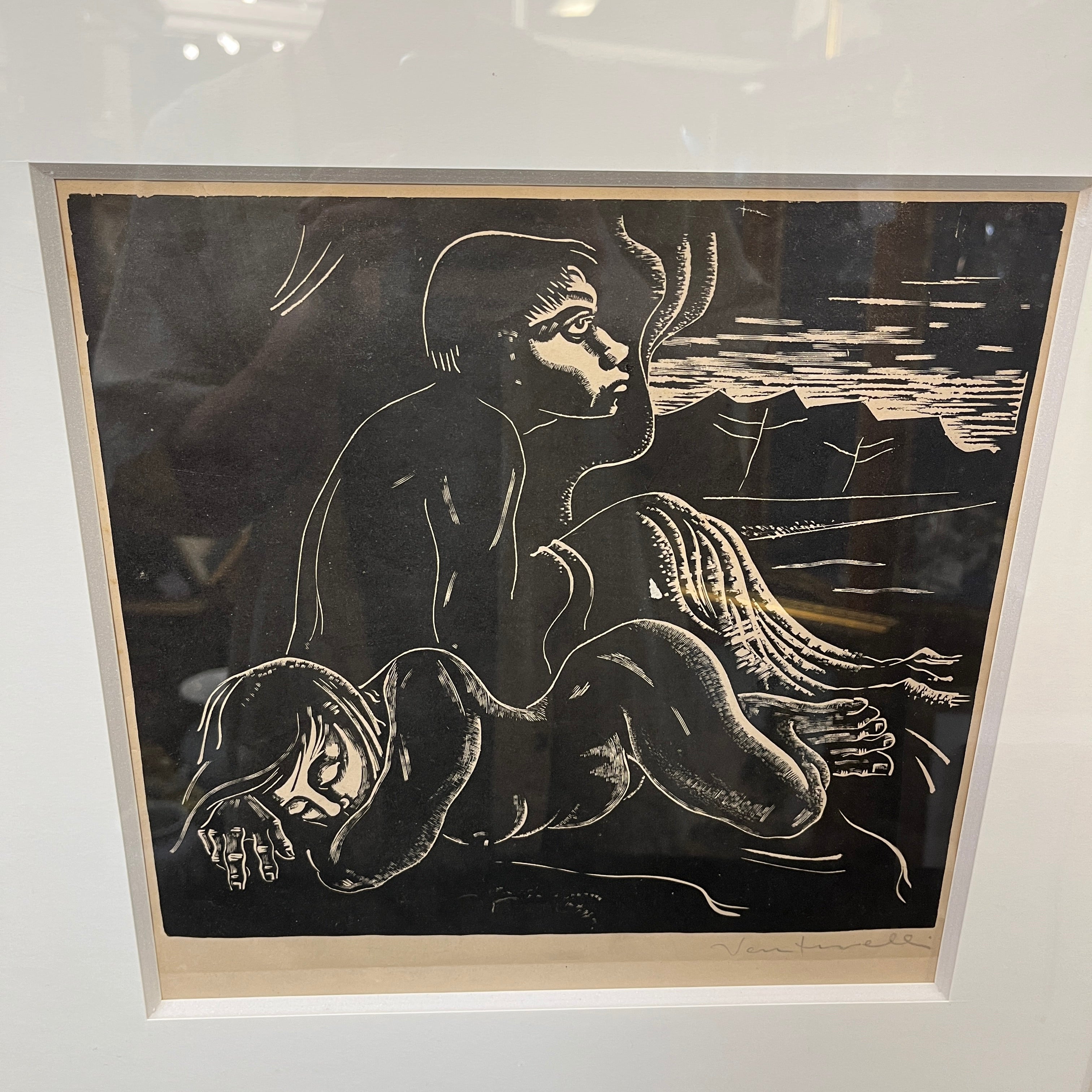 Grabado del artista chileno José Venturelli, representando a dos jóvenes recostados. La mujer se encuentra dormida, mientras el hombre contempla el horizonte. La escena sugiere un erotismo, remarcado por las formas de los cuerpos, mezclado con la nostalgia del gesto perdido en la mirada del joven, utilizando a su favor la técnica que le da la cualidad bitonal, de luz y sombra, dándole capas de lectura y misterio a la obra. La obra tiene un marco de madera contemporánea sobria terminada en dorado.