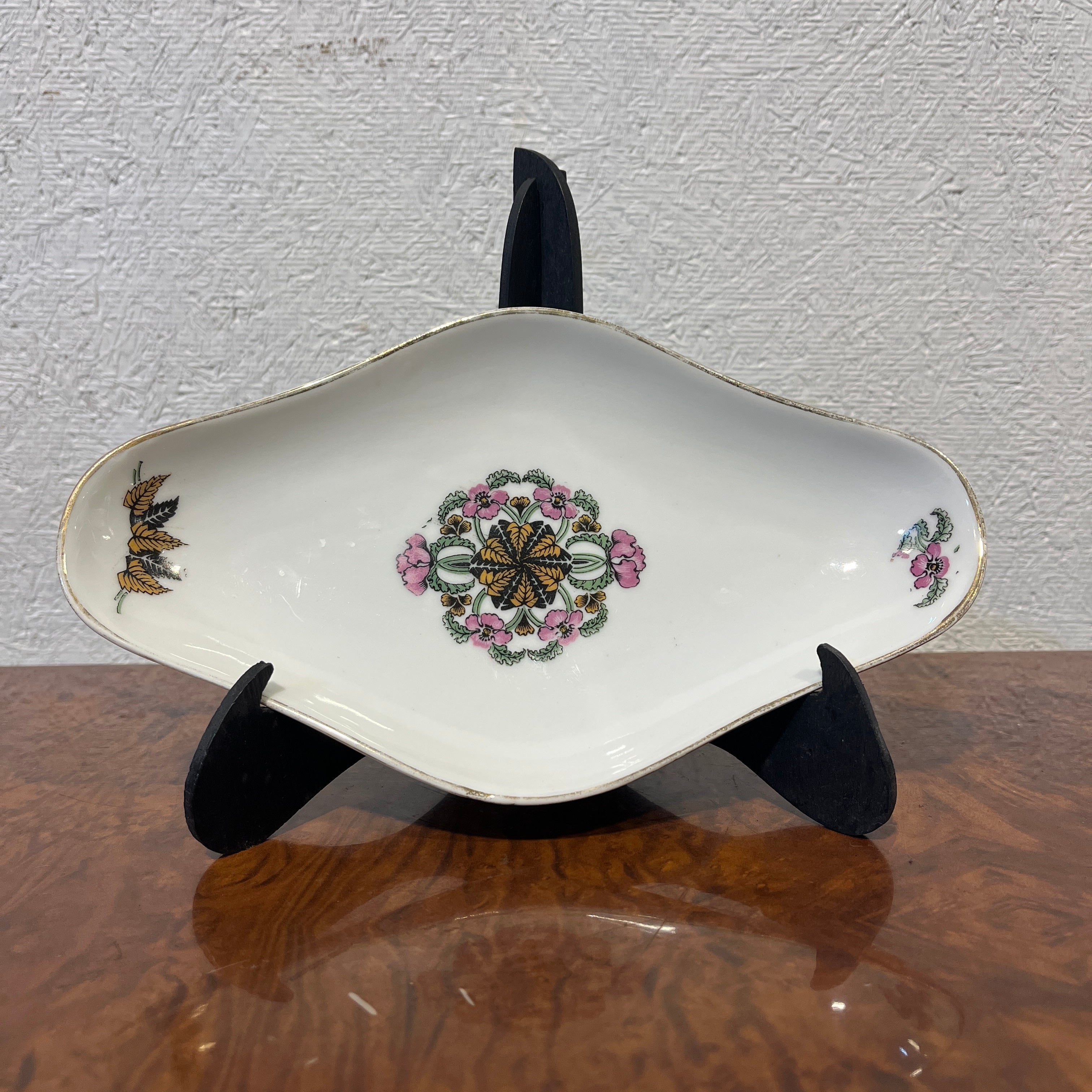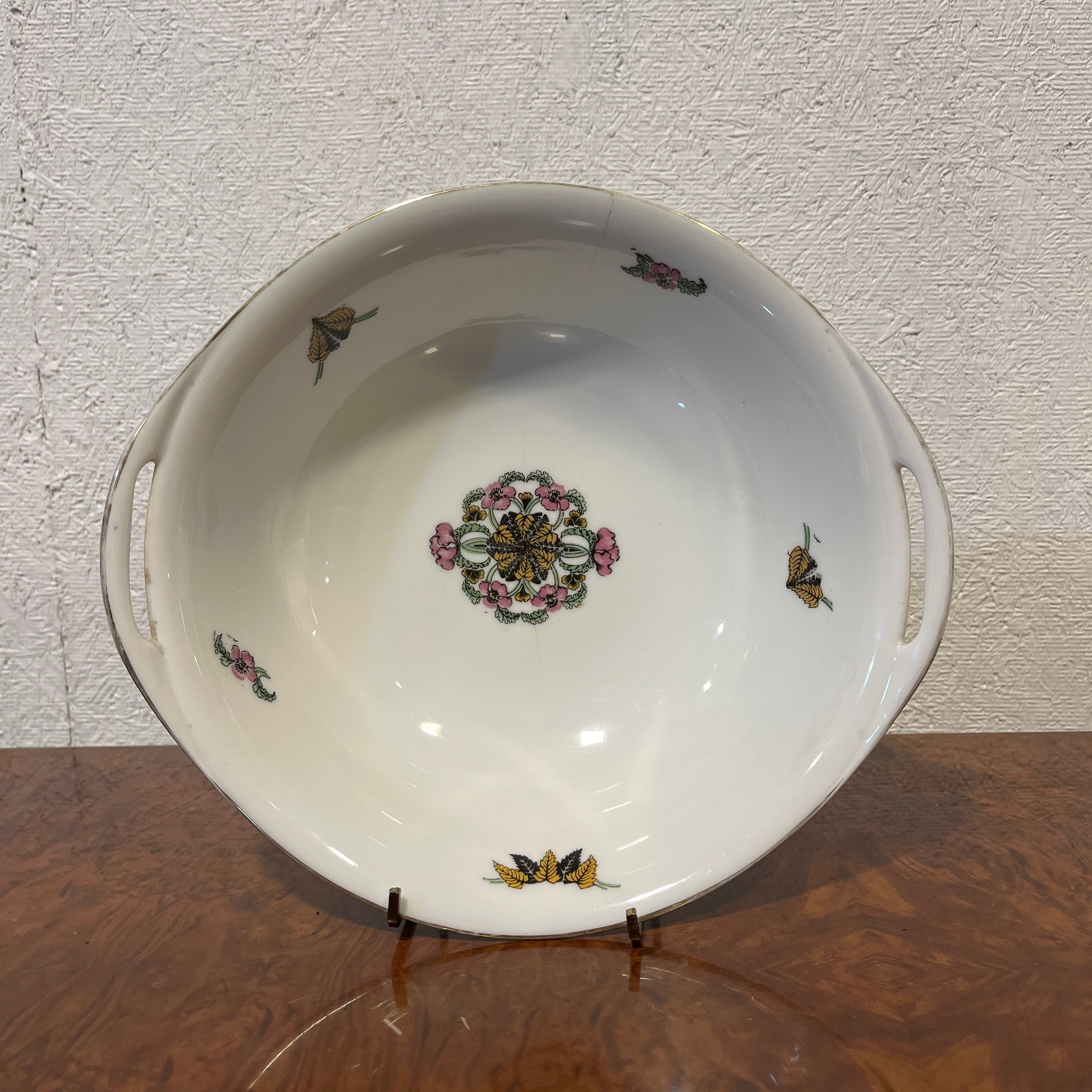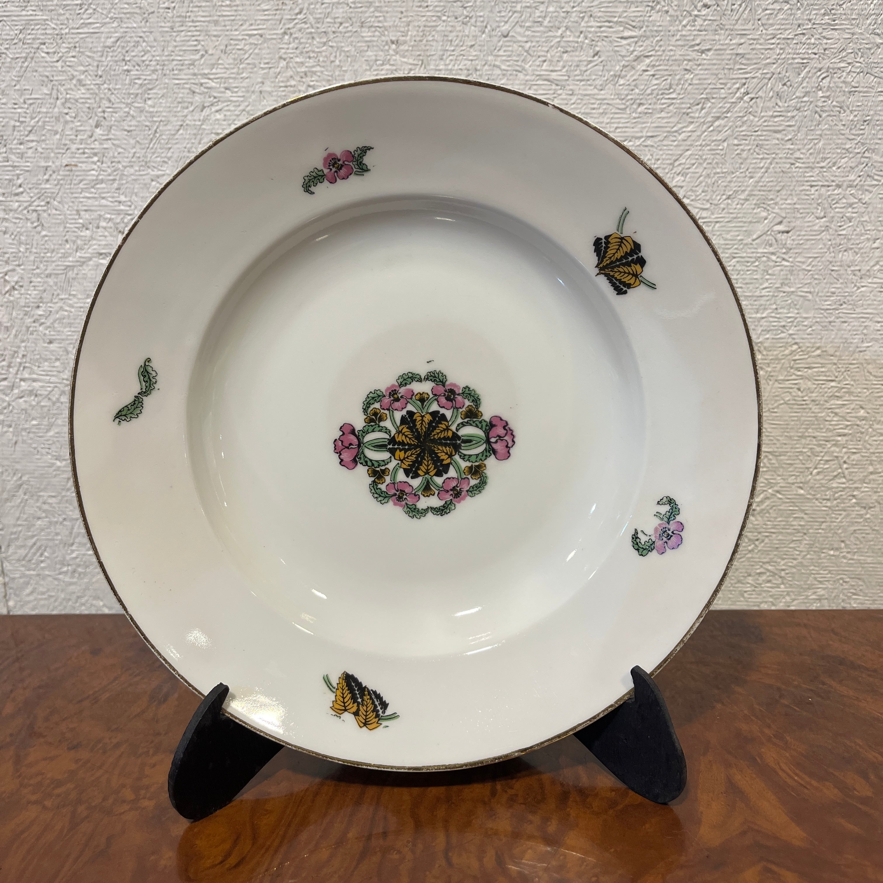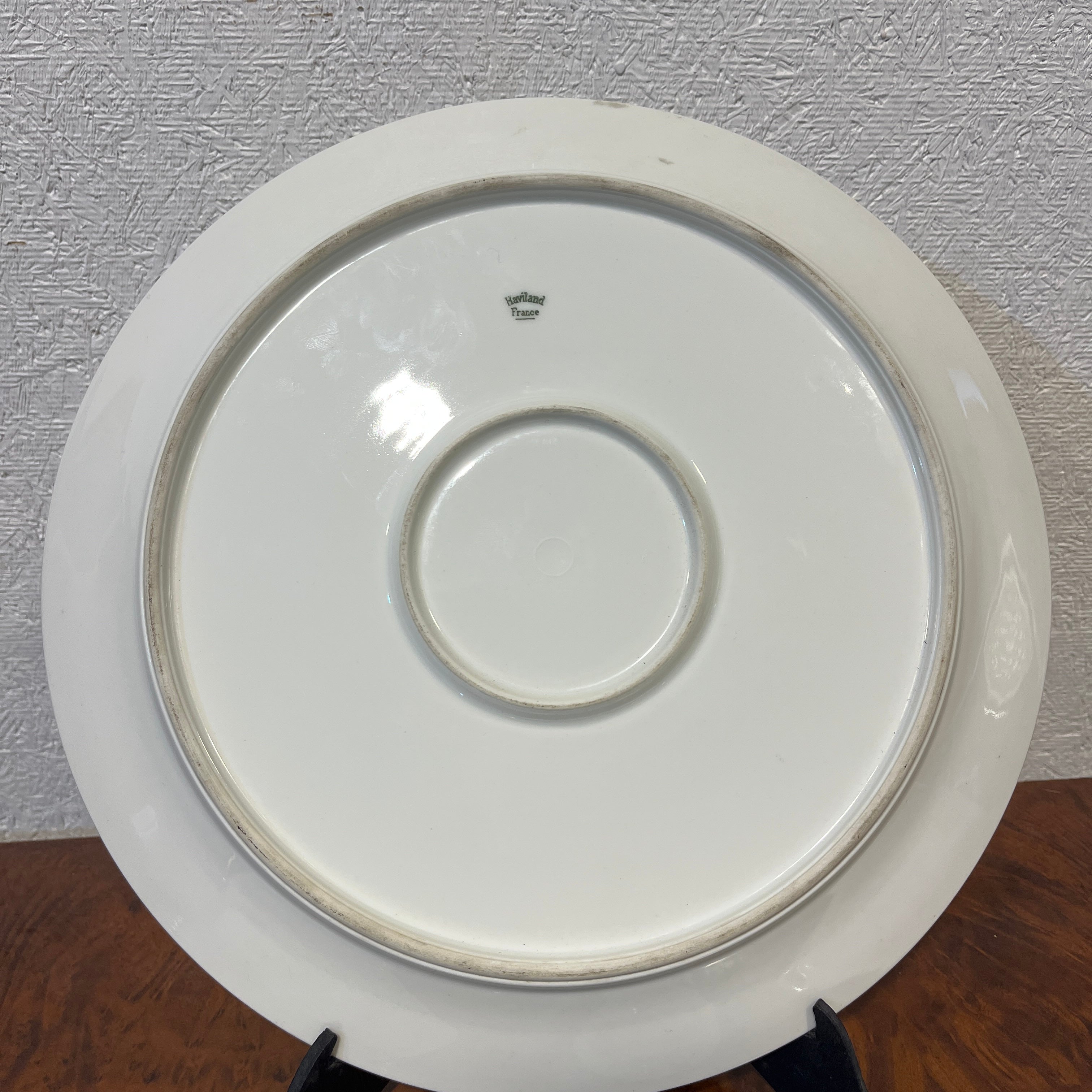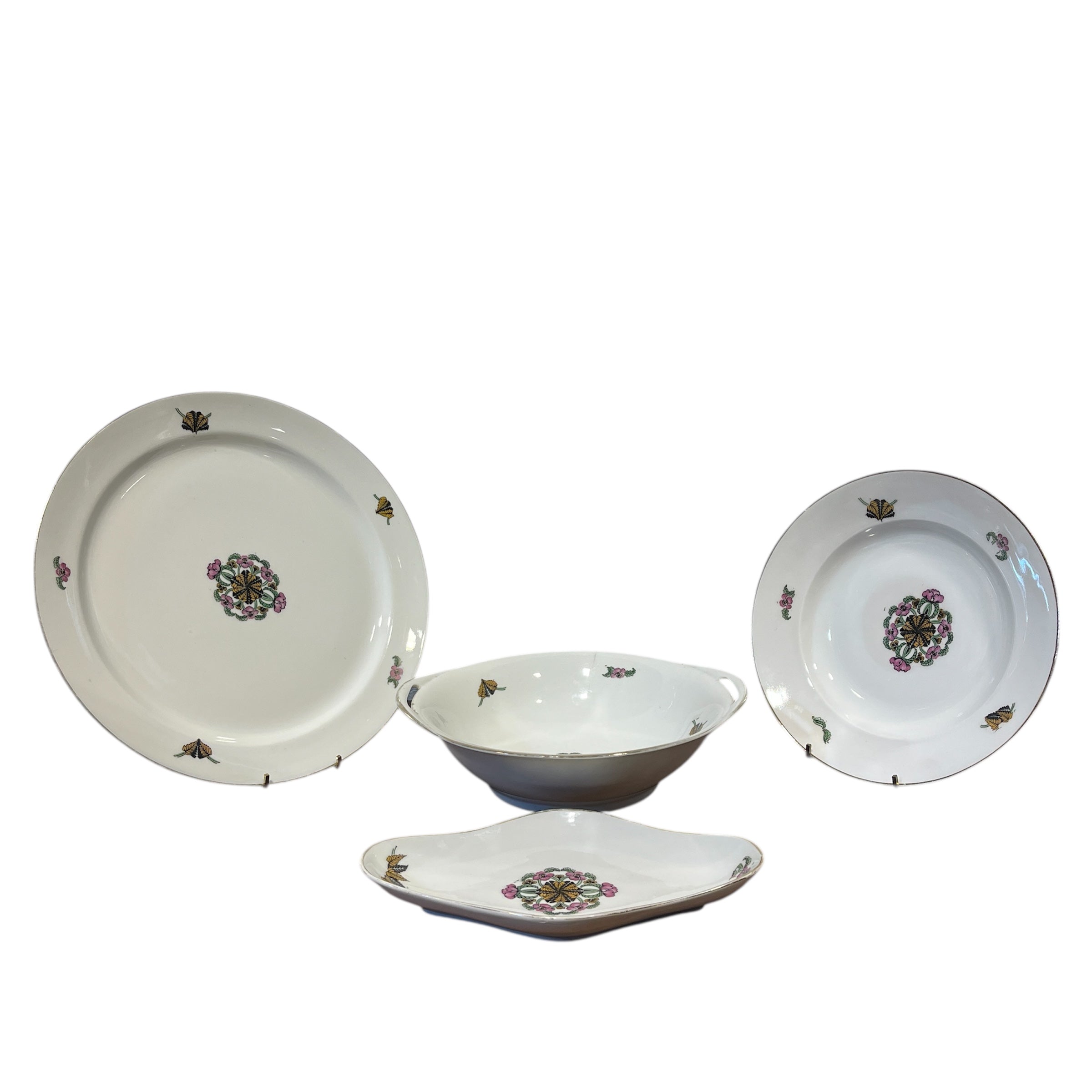 Hermoso juego de 10 platos hondos de porcelana francesa Limoges con delicada decoración floral y vegetal además un maravilloso borde en oro, acompañado de 4 piezas para servir de porcelana francesa Haviland. En total son 13 piezas en excelentes condiciones.