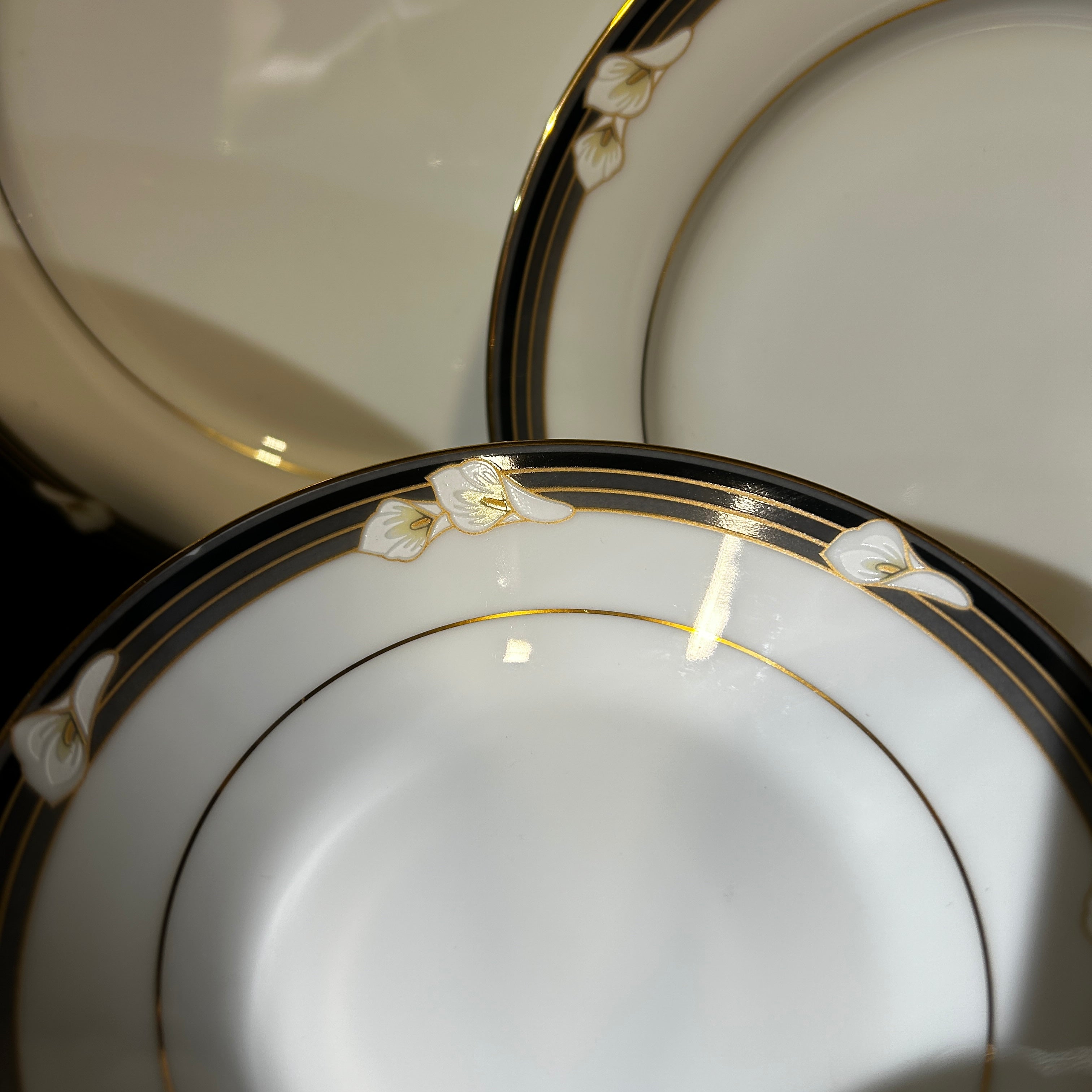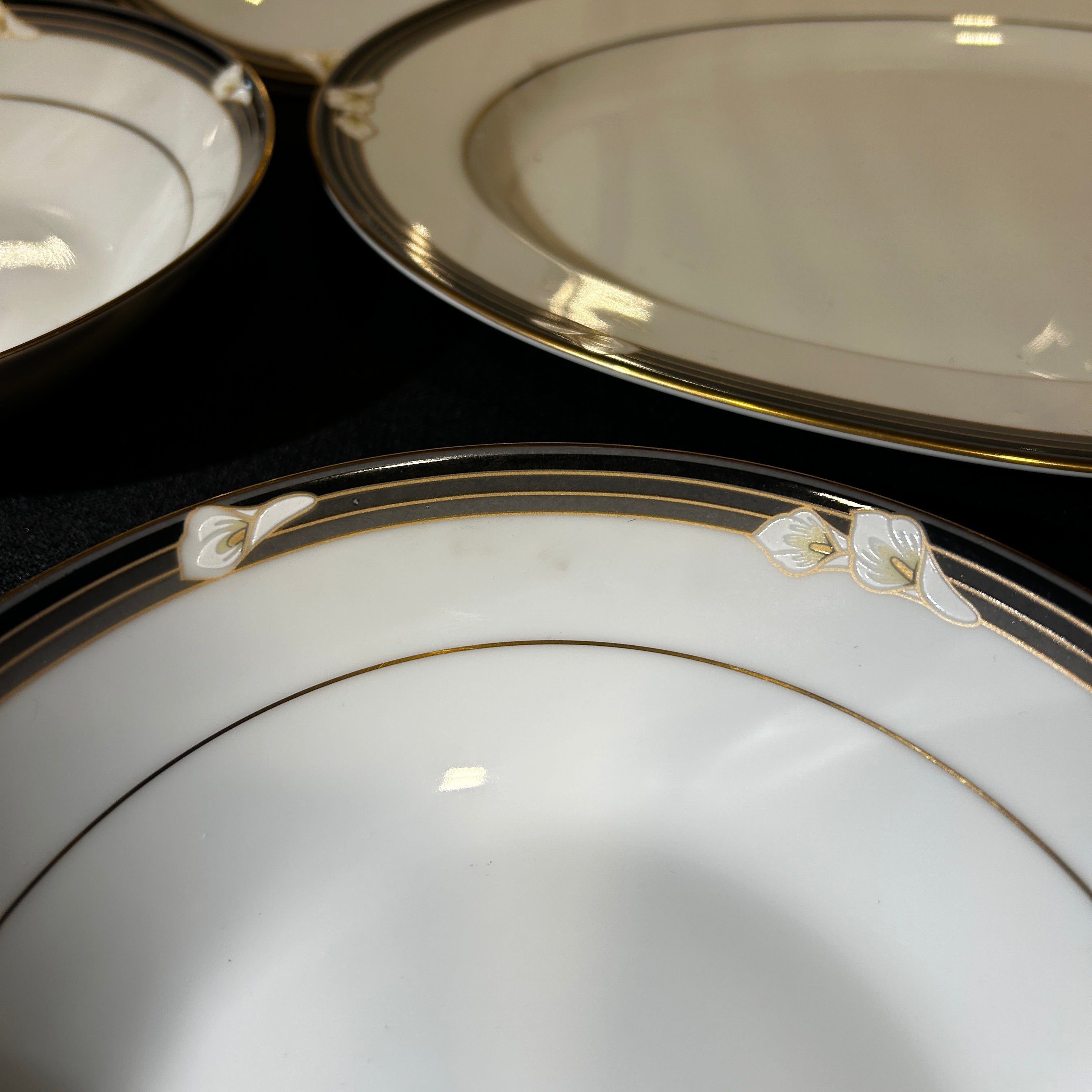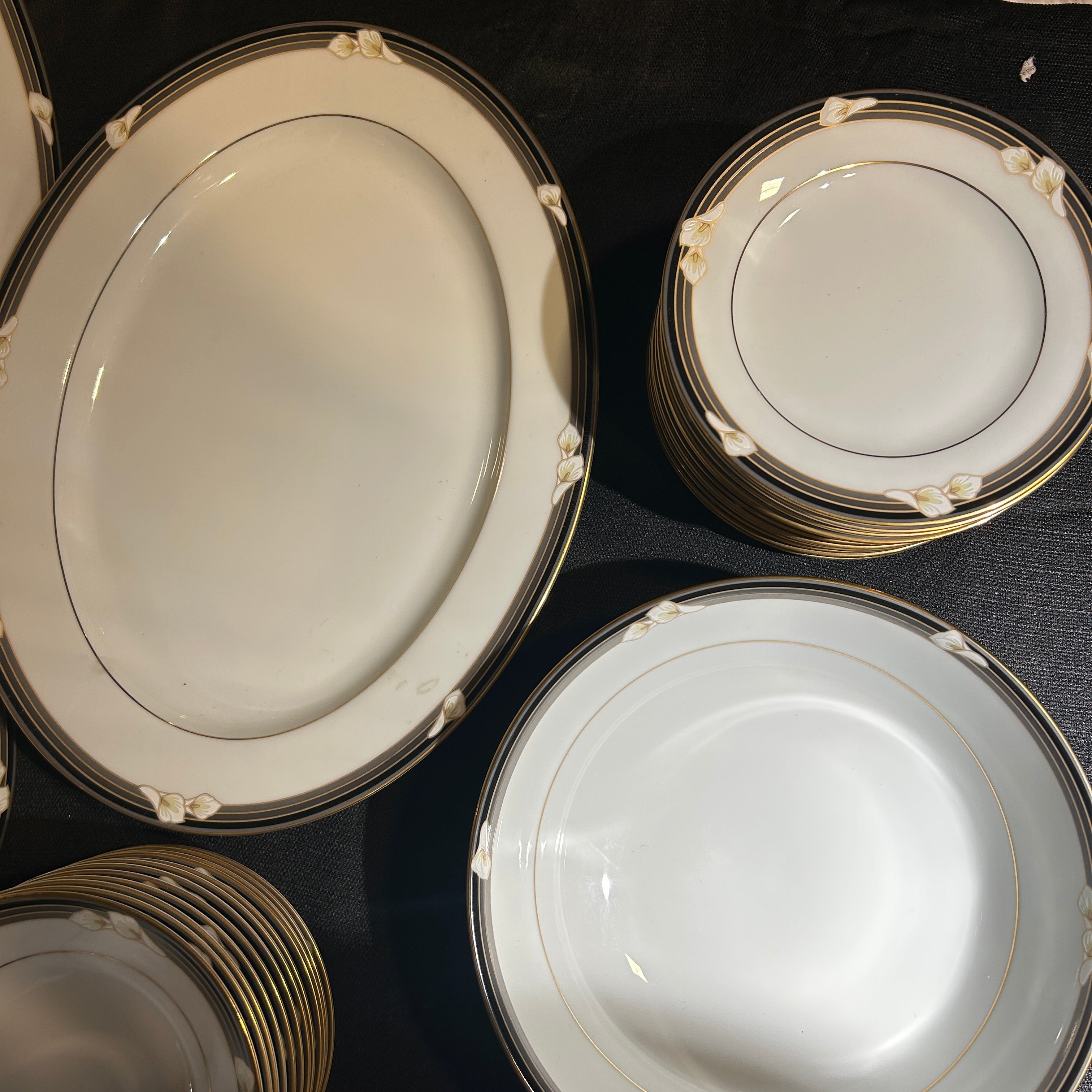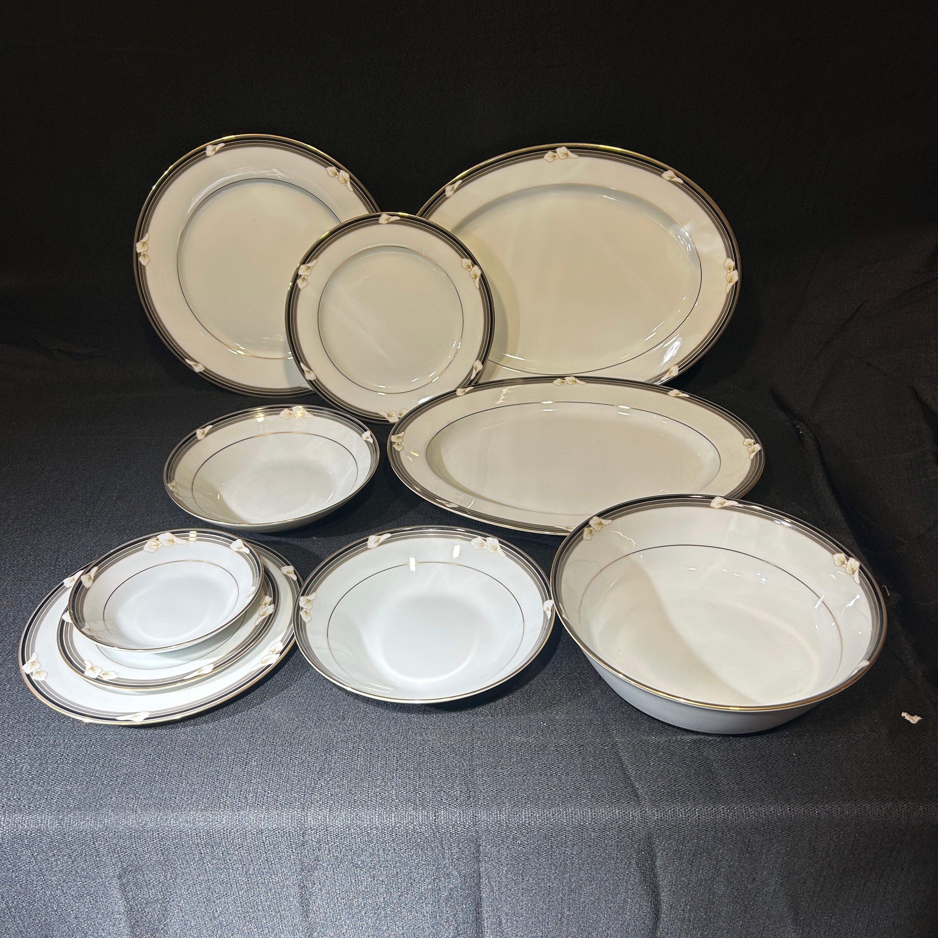 Maravilloso juego de loza de porcelana fina Noritake Legendary Ellington 3691, hecho en Filipinas. Tiene un hermoso acabado blanco brillante con flores de calas blancas en bandas negras y grises con detalles dorados.