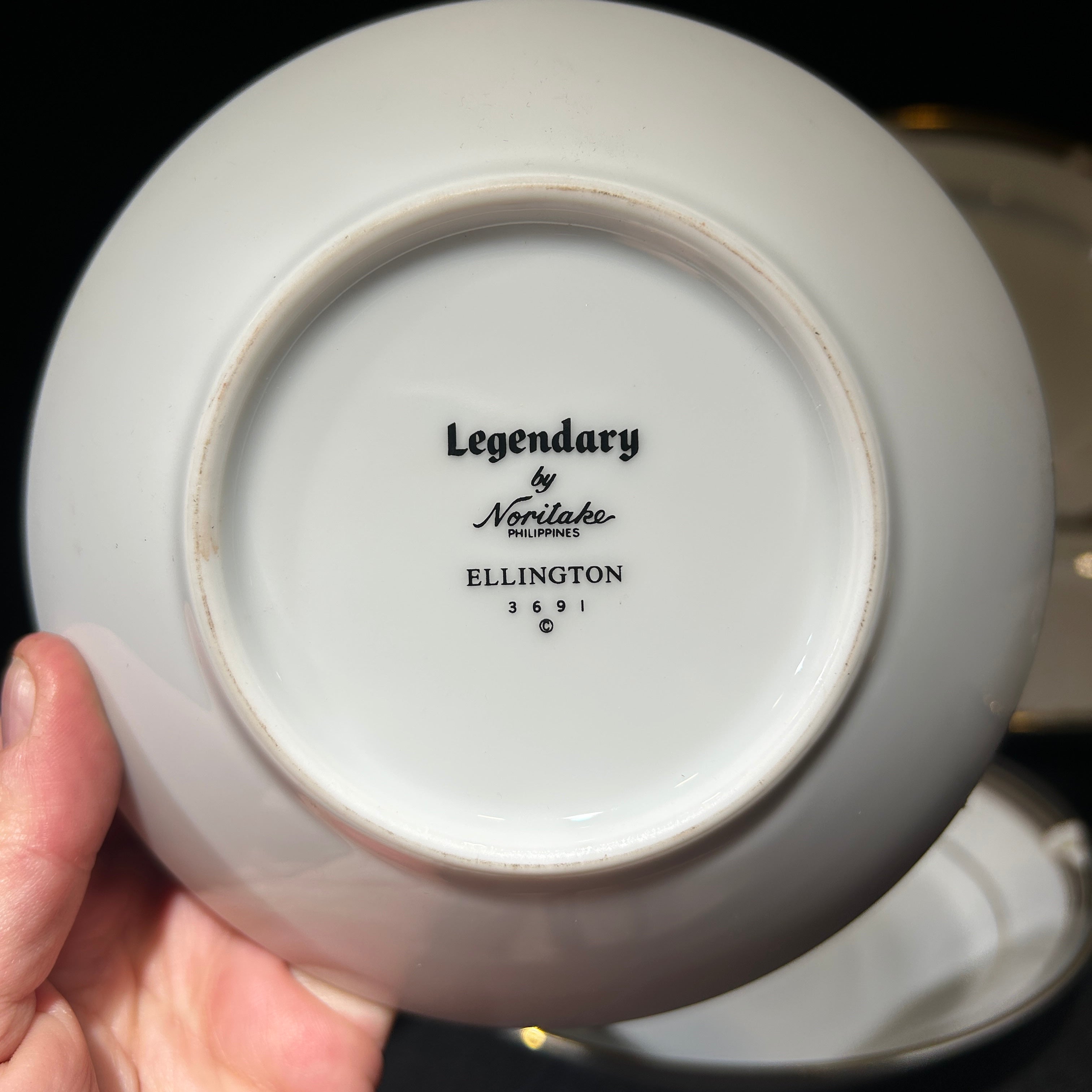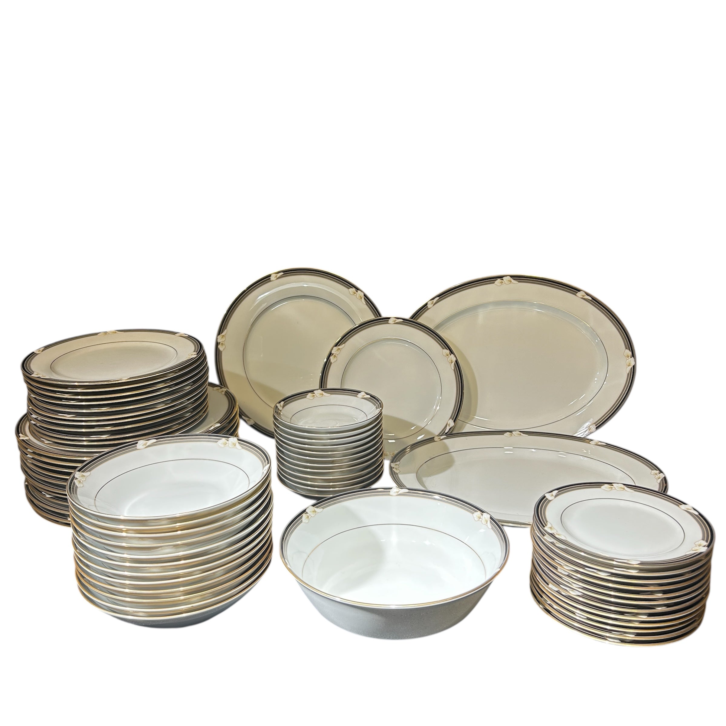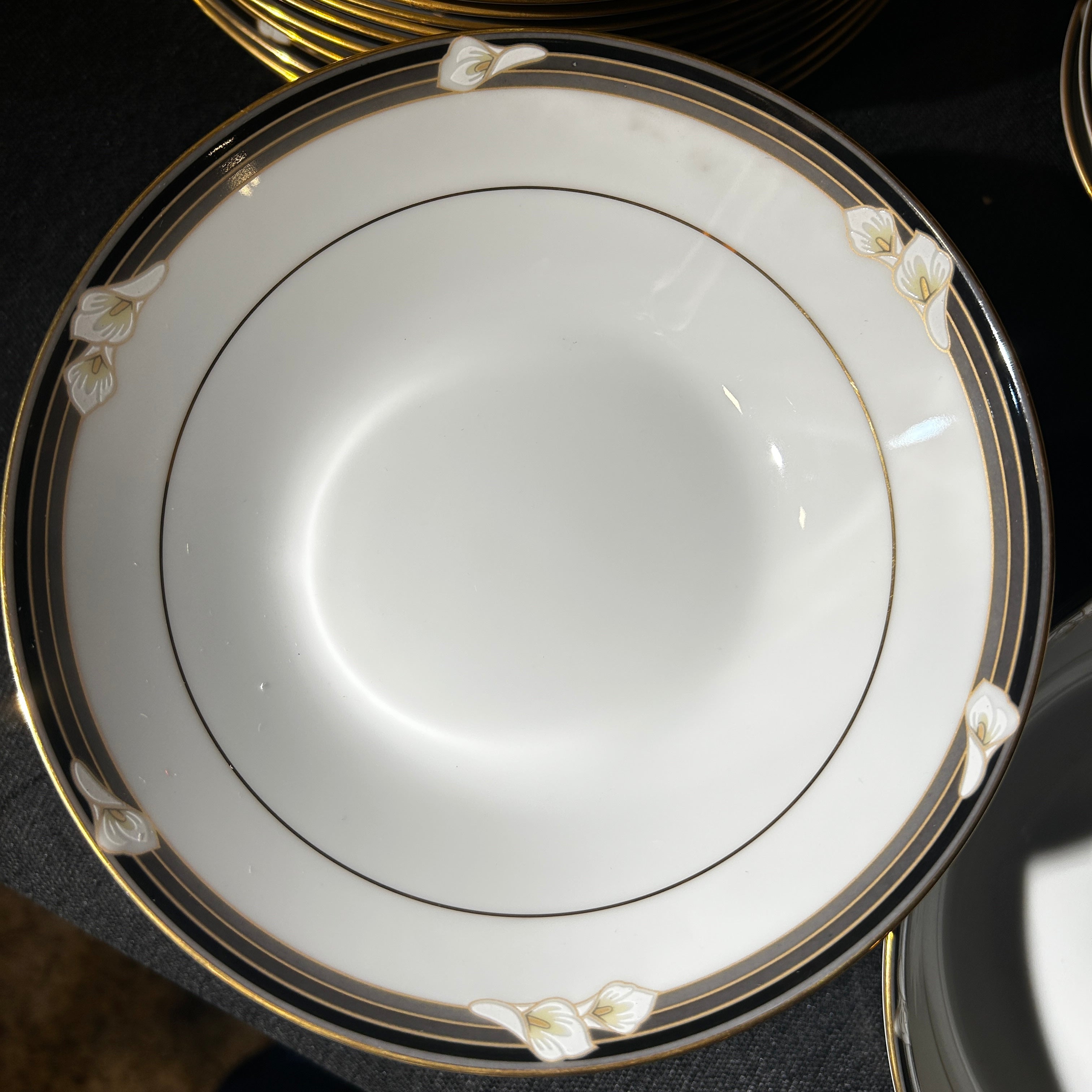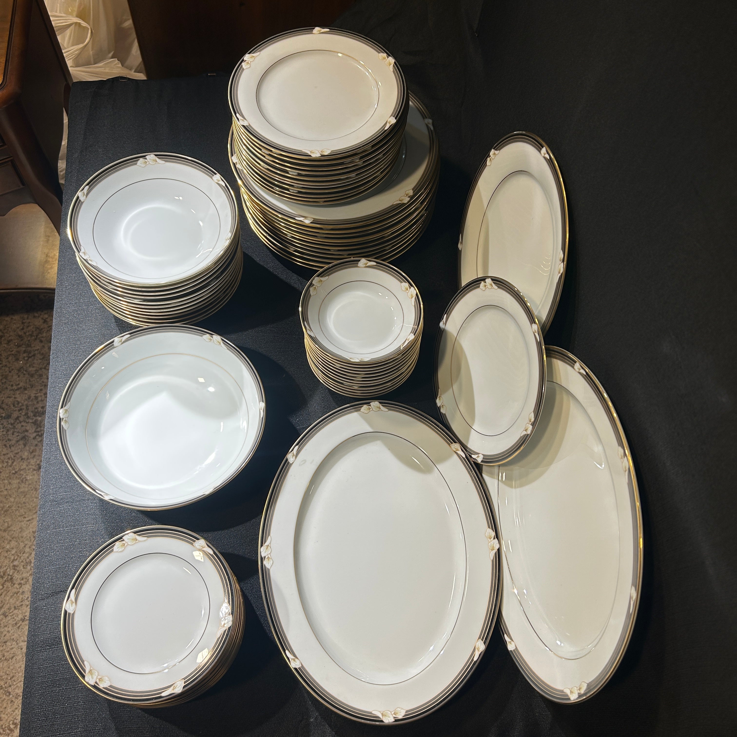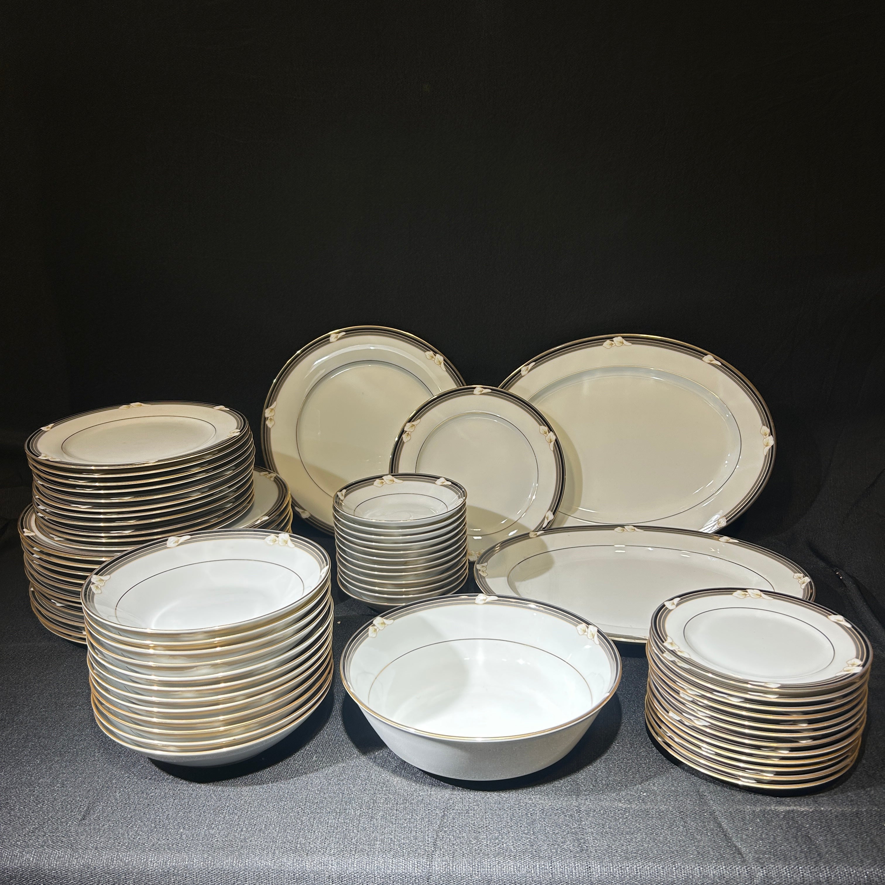 Maravilloso juego de loza de porcelana fina Noritake Legendary Ellington 3691, hecho en Filipinas. Tiene un hermoso acabado blanco brillante con flores de calas blancas en bandas negras y grises con detalles dorados.