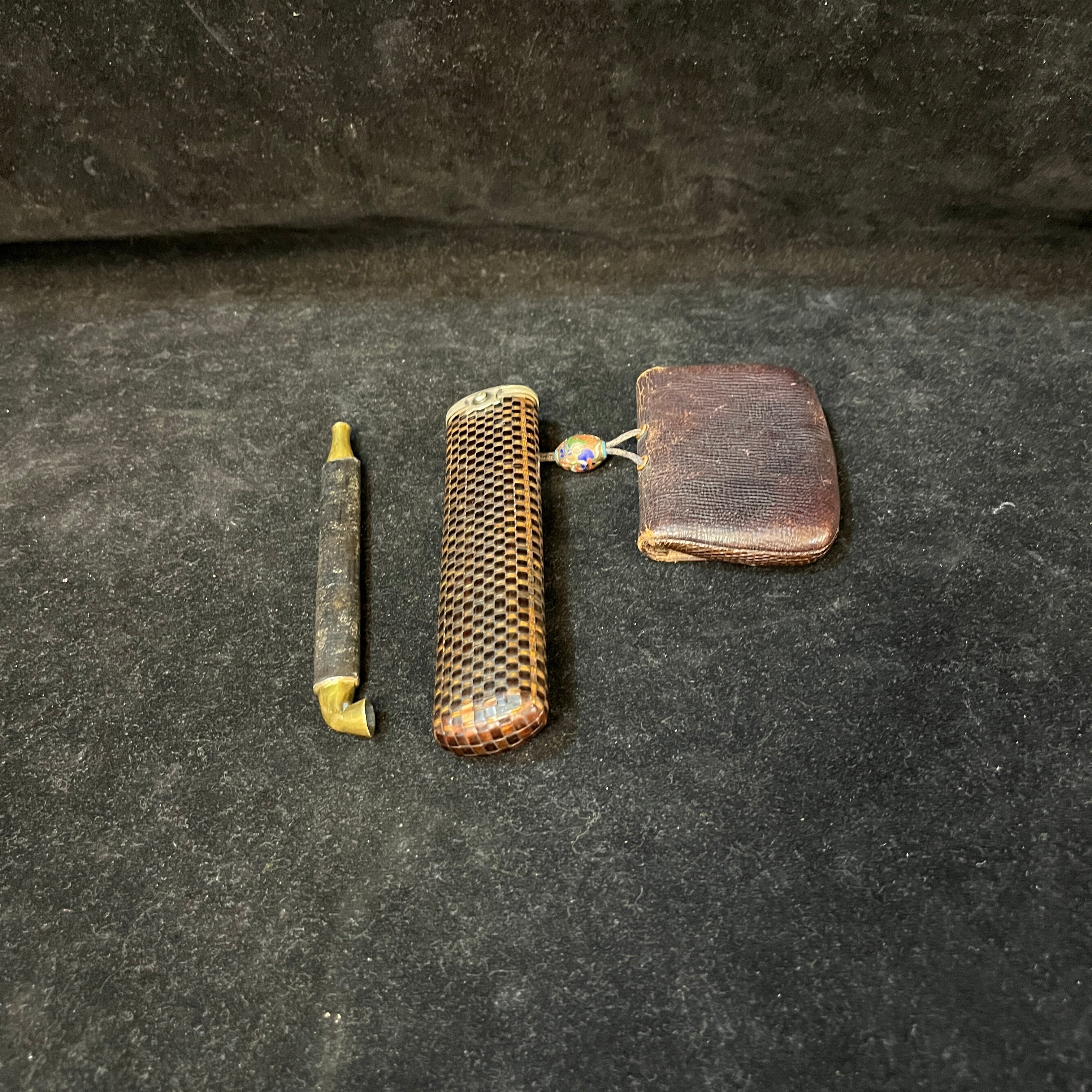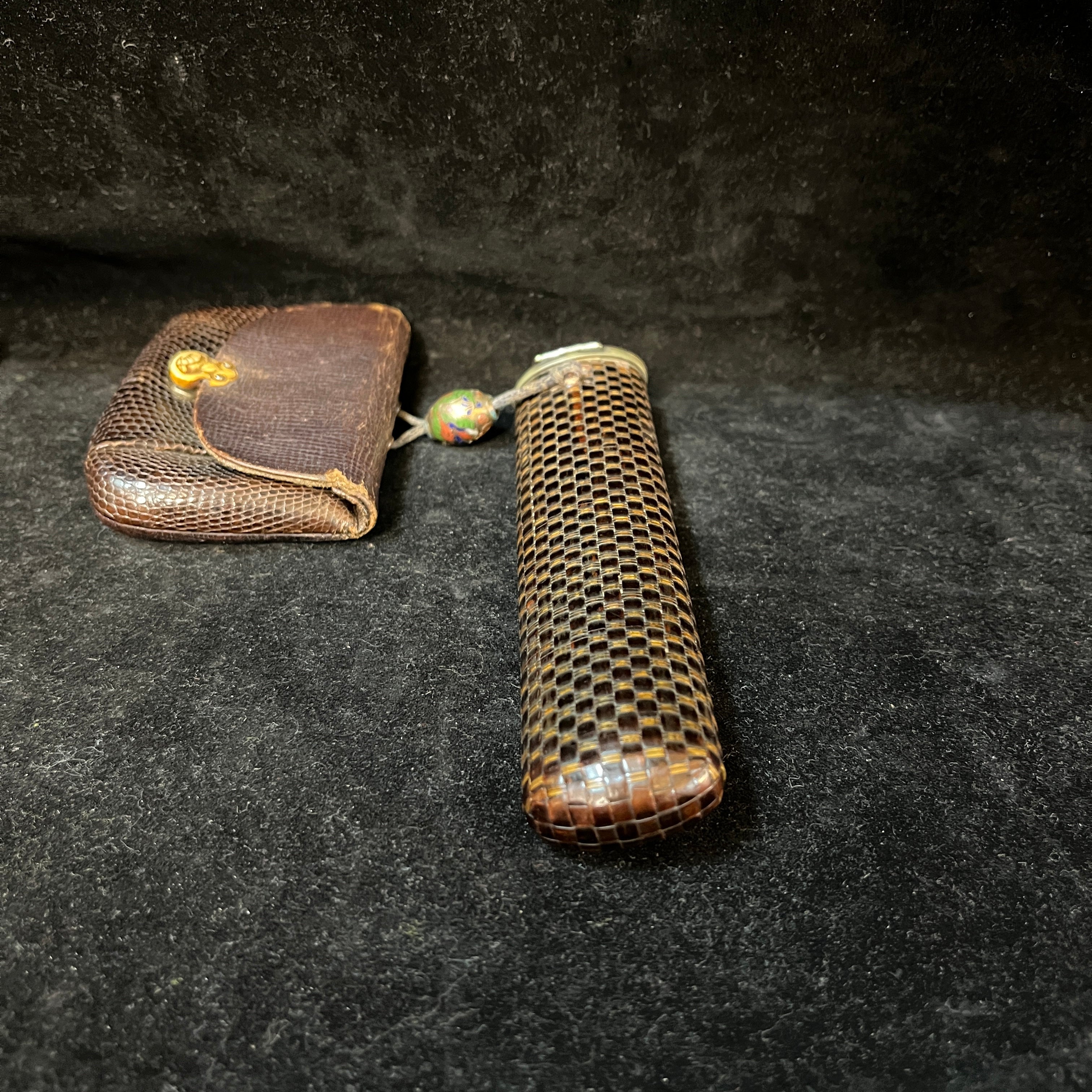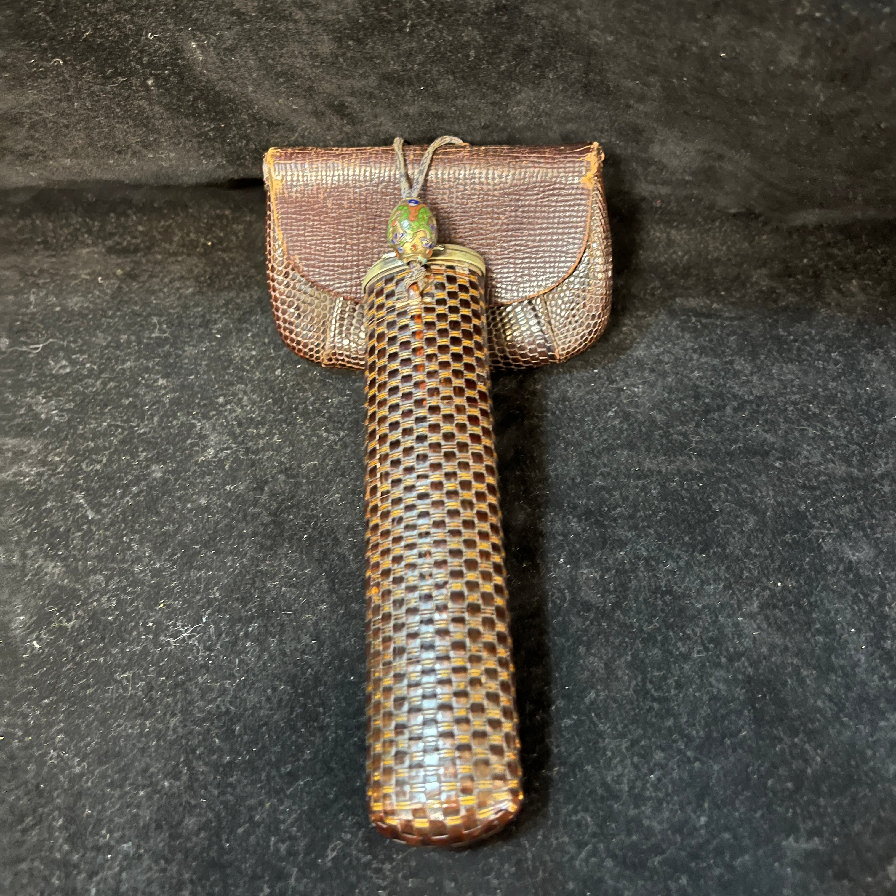 Objeto tradicional japonés utilizado principalmente para fumar opio entre los siglos XVIII y principios del XX. Este conjunto está compuesto por una cartera de piel de reptil, con broche de marfil, acompañada de una esfera de cloissoné. El porta pipa confeccionado en canje y alpaca. Por último la pipa fue elaborada en bronce.