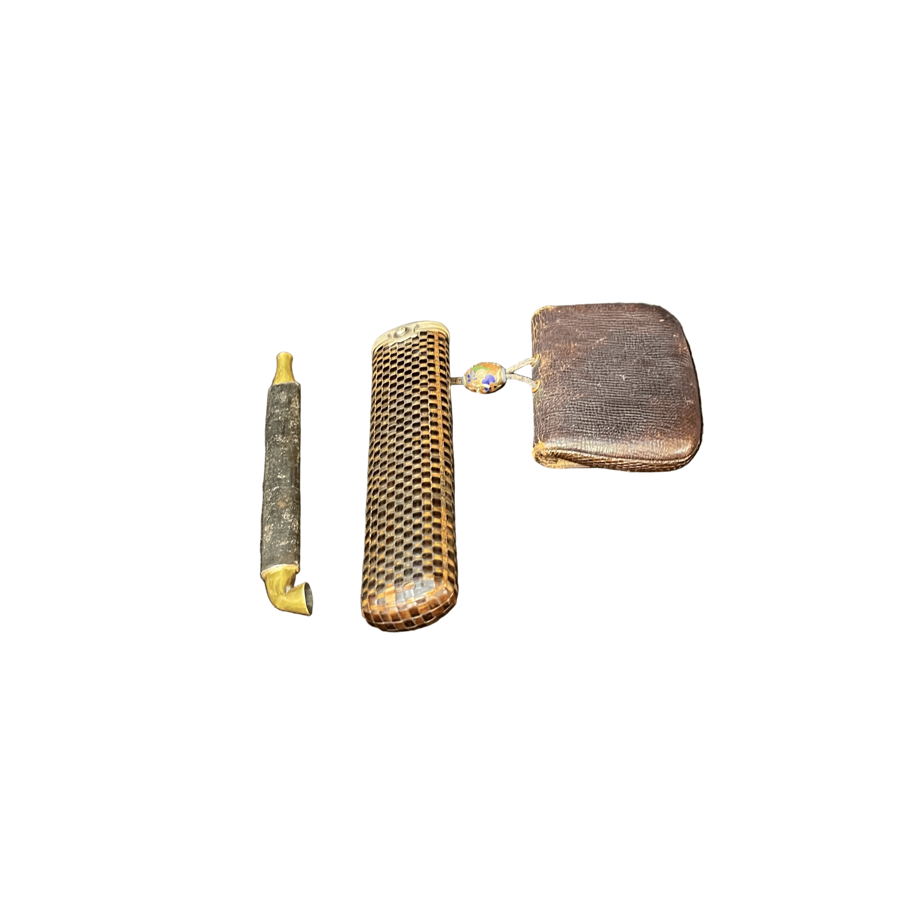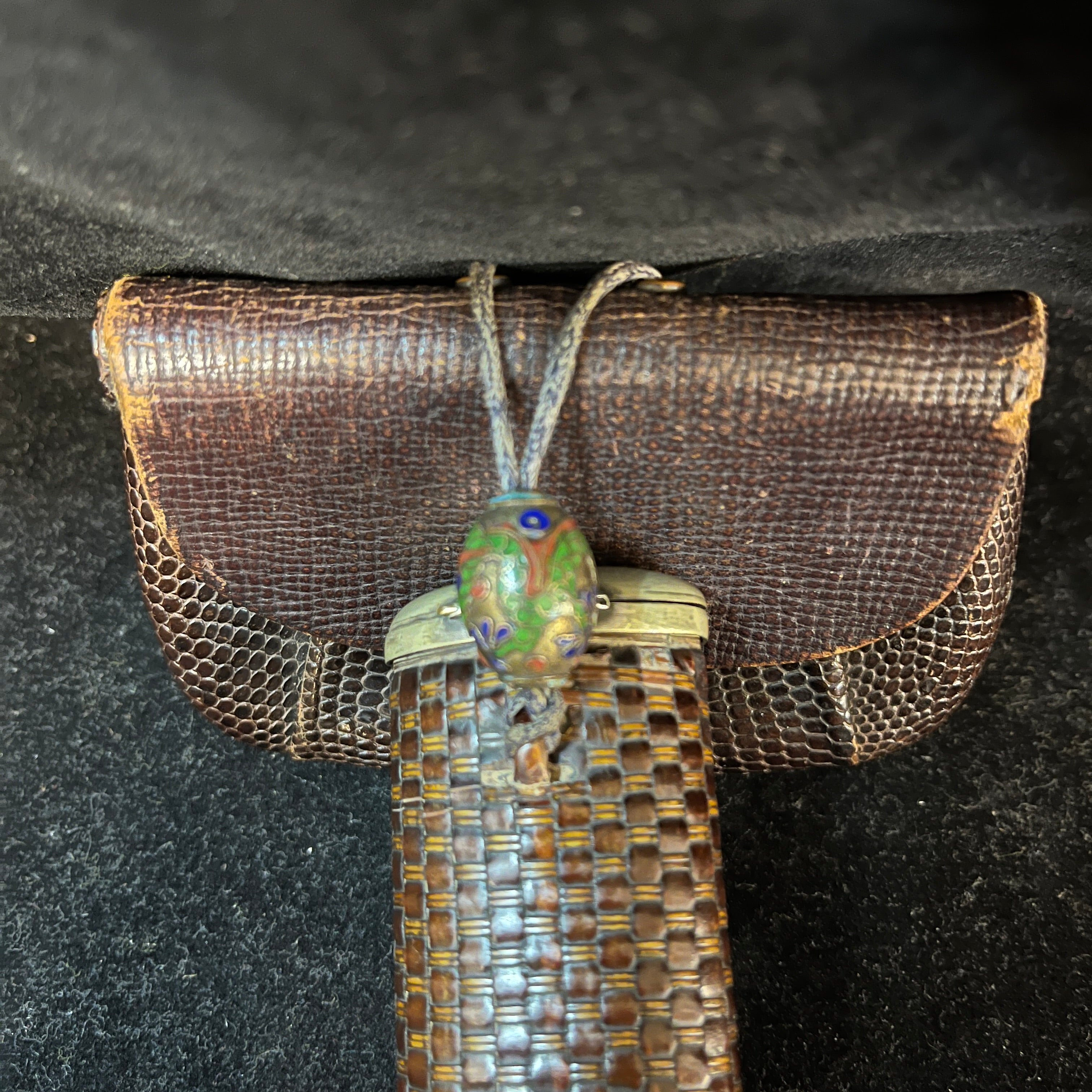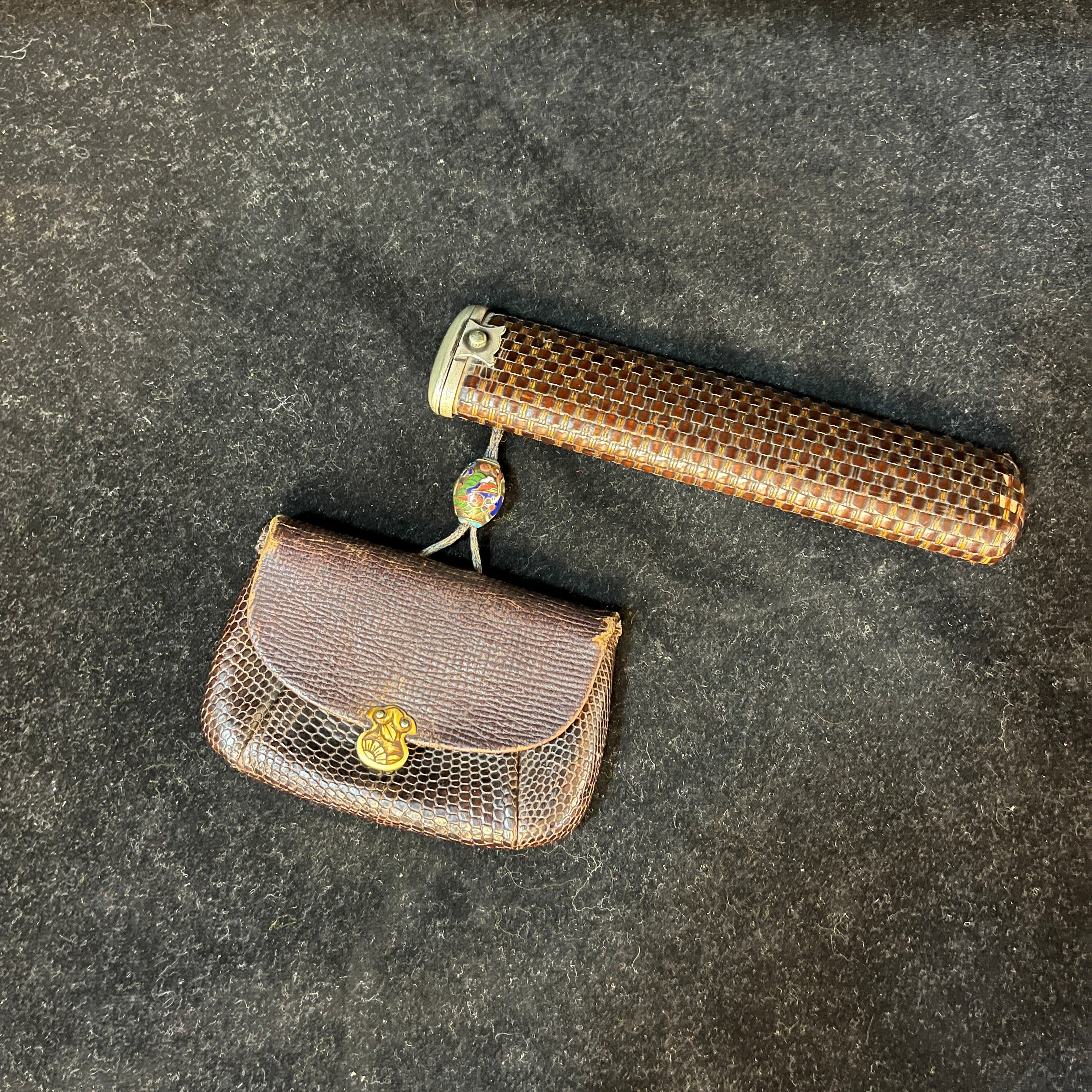 Objeto tradicional japonés utilizado principalmente para fumar opio entre los siglos XVIII y principios del XX. Este conjunto está compuesto por una cartera de piel de reptil, con broche de marfil, acompañada de una esfera de cloissoné. El porta pipa confeccionado en canje y alpaca. Por último la pipa fue elaborada en bronce.
