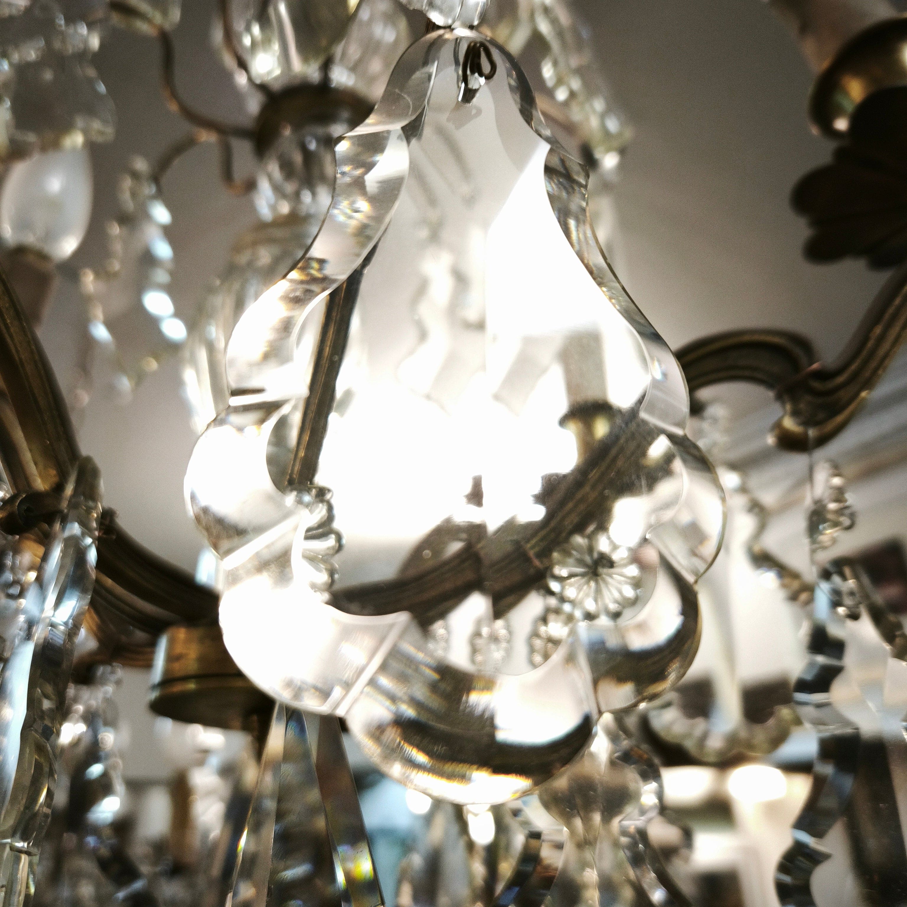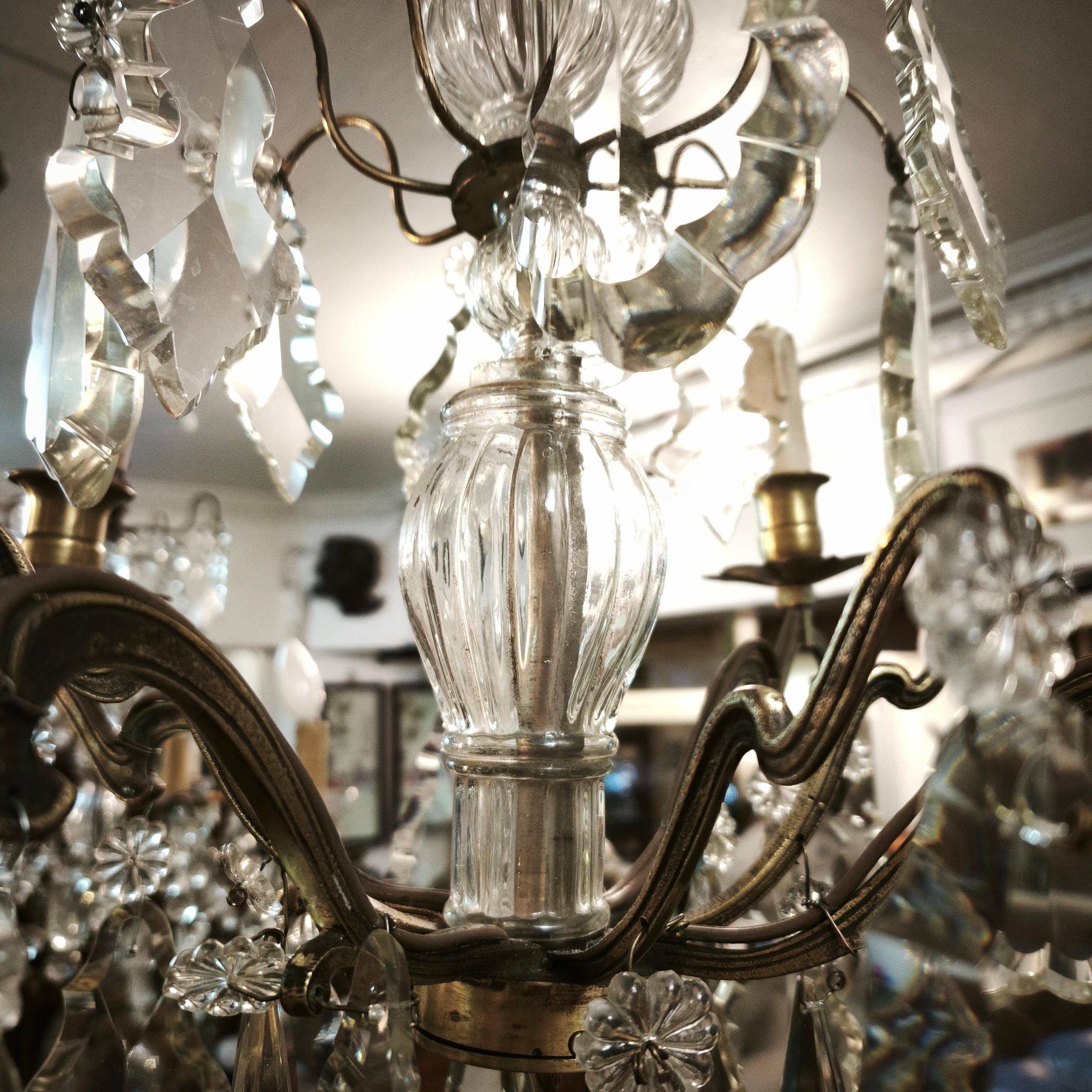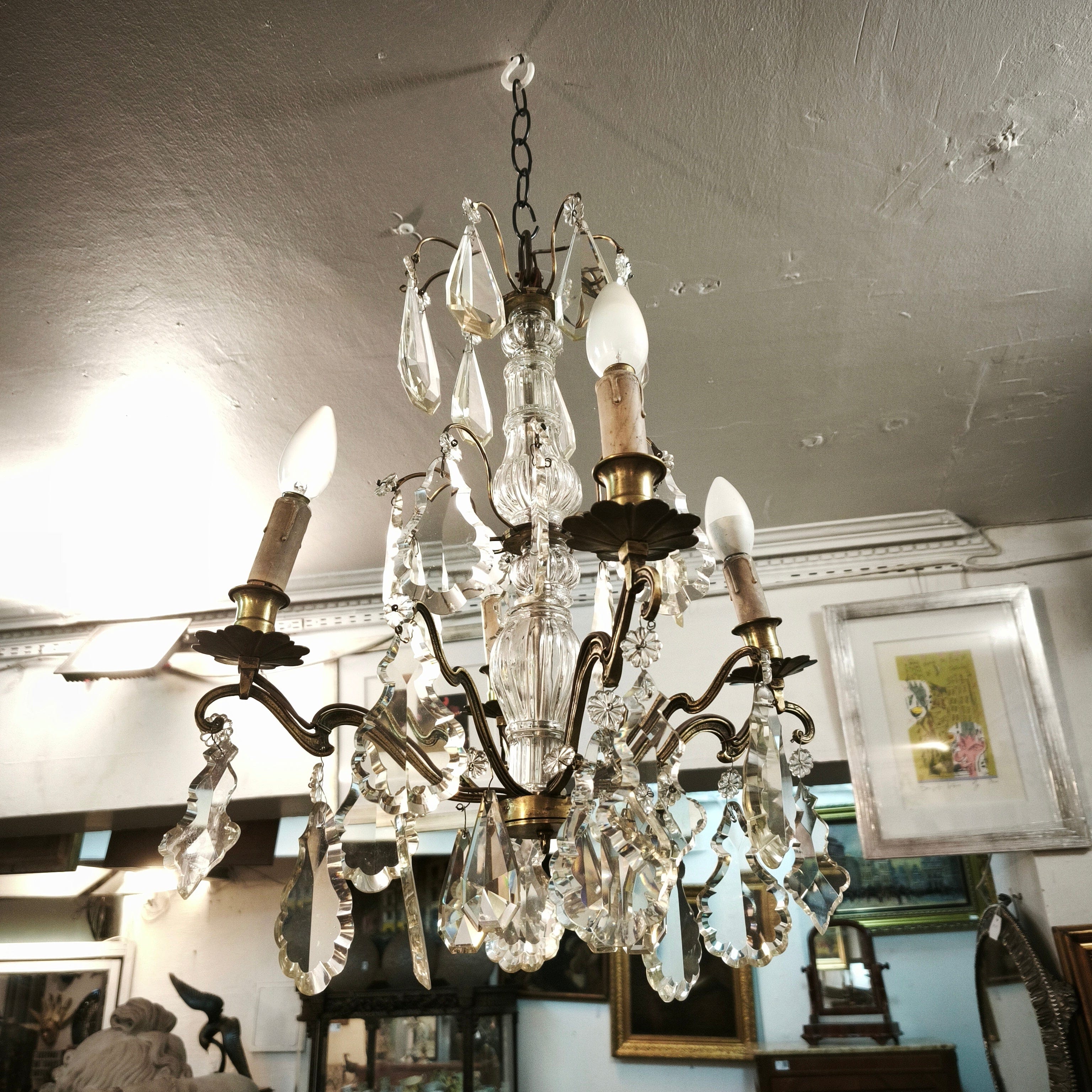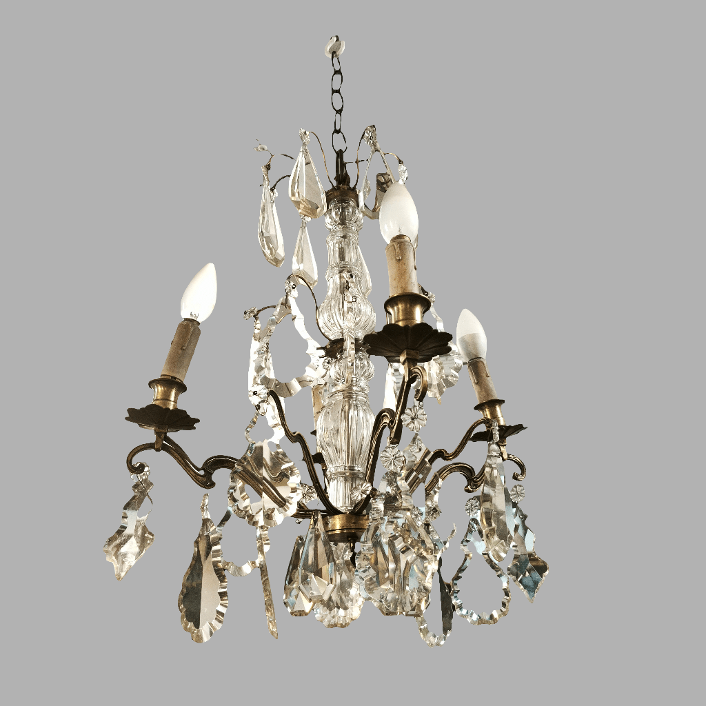 Elegante lámpara de lágrimas de cristal, de origen francés, con estructura hecha de bronce moldeado en un diseño curvo, cuatro luces con palmatorias de bronce en forma de flor y centro cubierto de cristal en relieves.