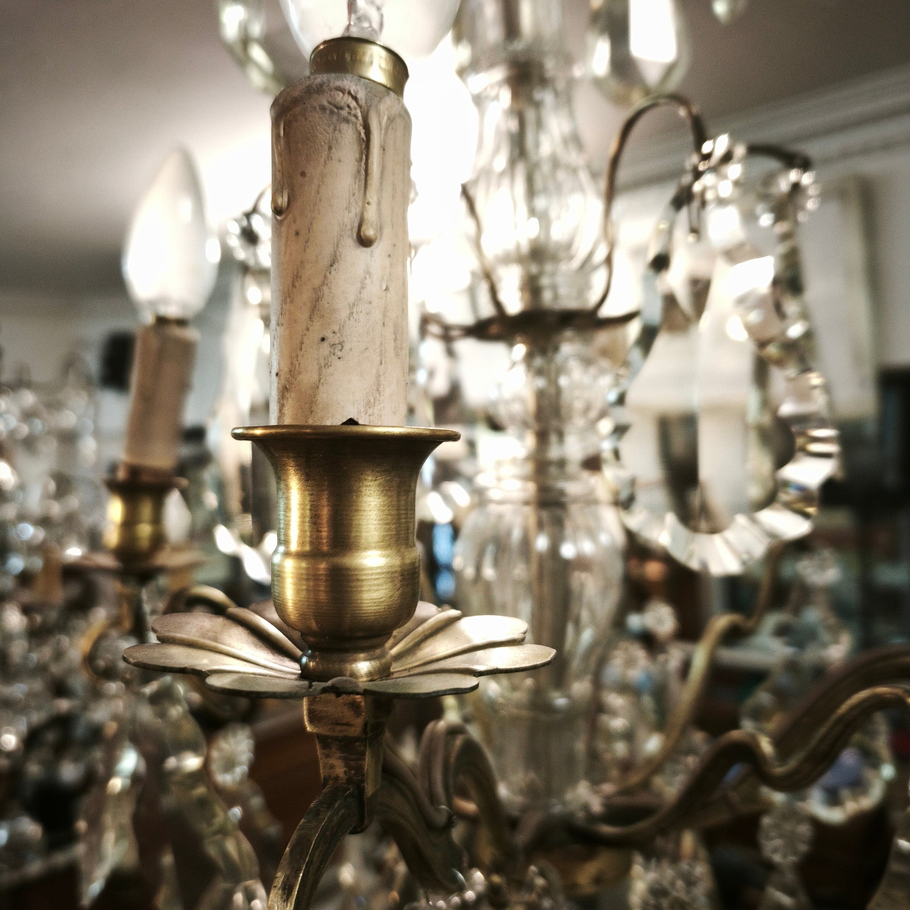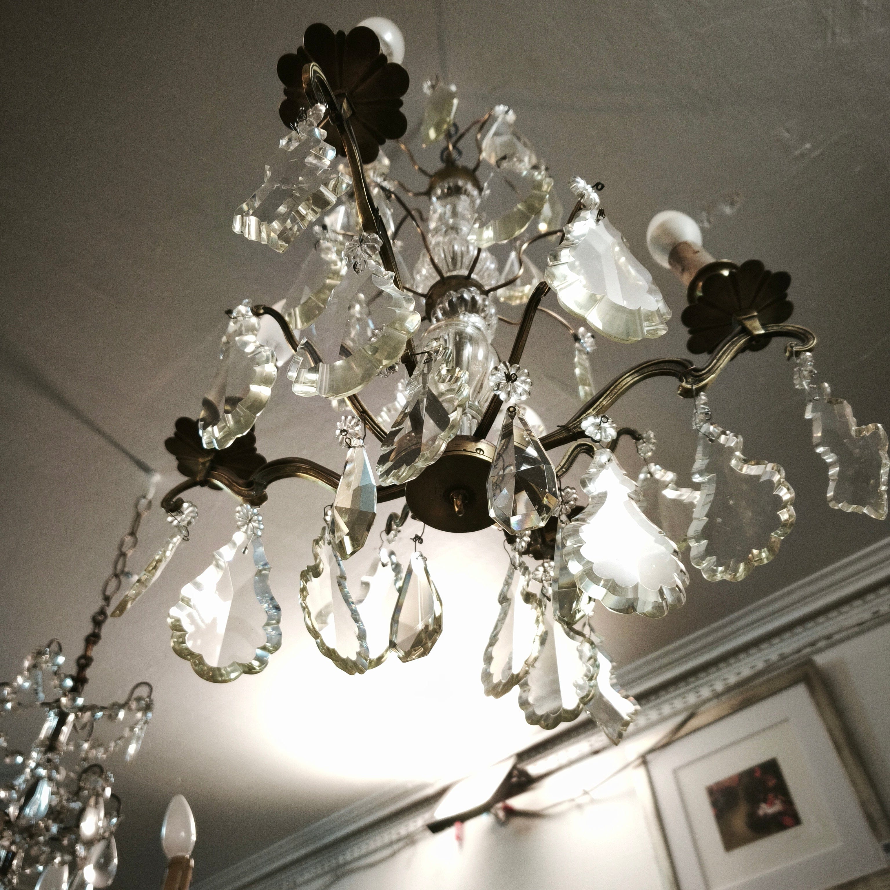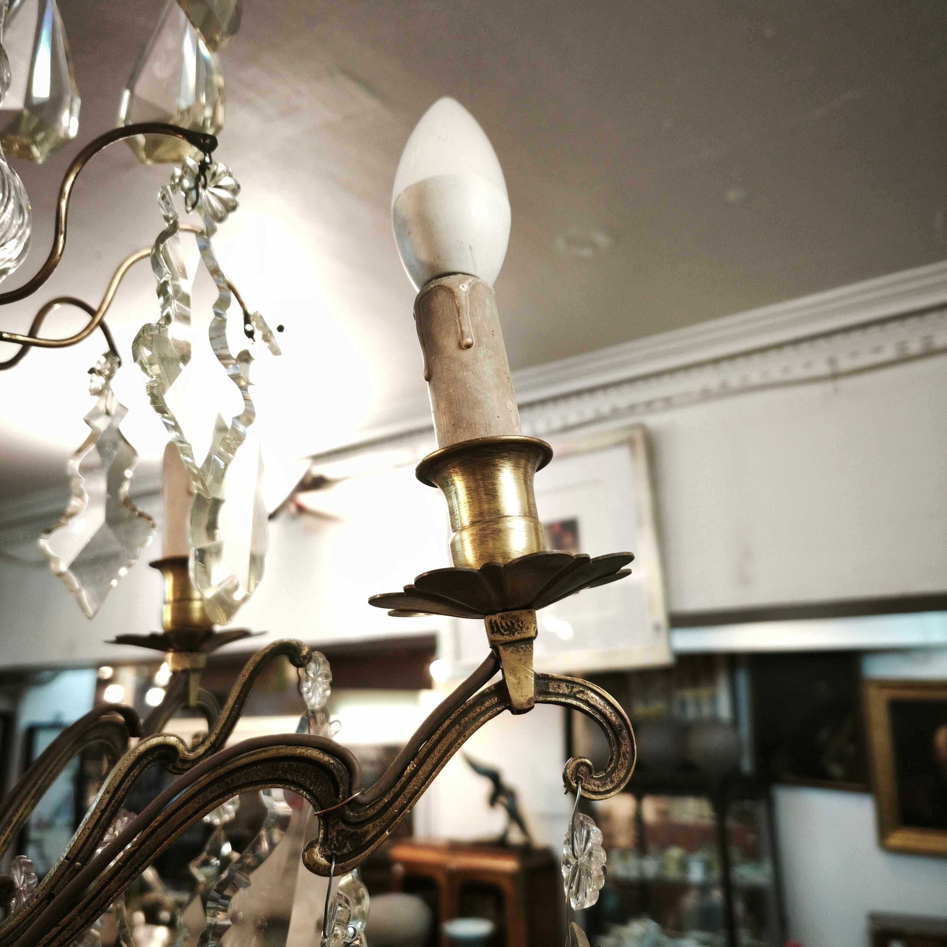 Elegante lámpara de lágrimas de cristal, de origen francés, con estructura hecha de bronce moldeado en un diseño curvo, cuatro luces con palmatorias de bronce en forma de flor y centro cubierto de cristal en relieves.