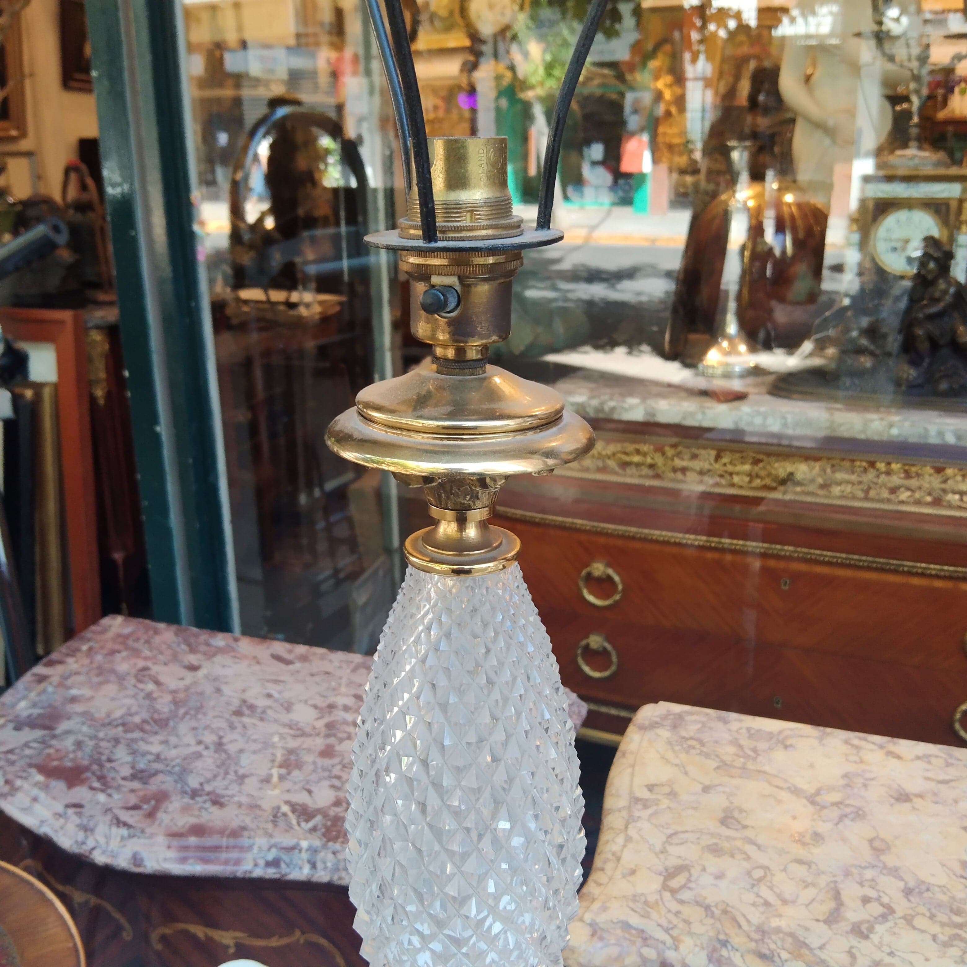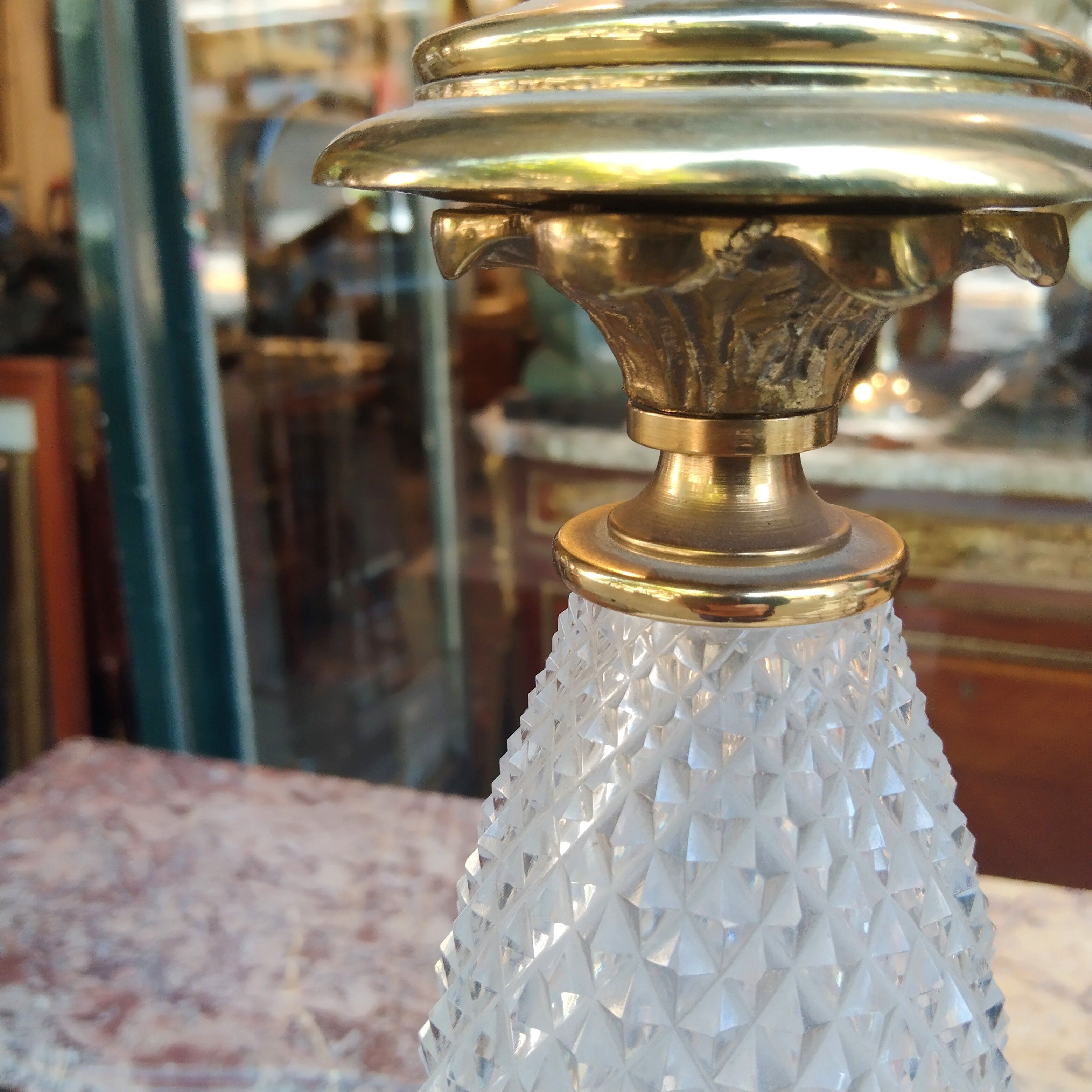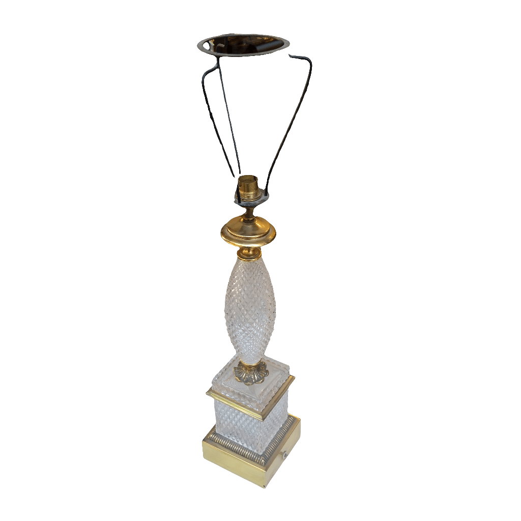 Bellísima lámpara de mesa de estilo neoclásico francés, de vidrio en molde, con diseños geométricos, y aplicaciones en bronce. La pieza se encuentra funcional, con su sistema eléctrico refaccionado.