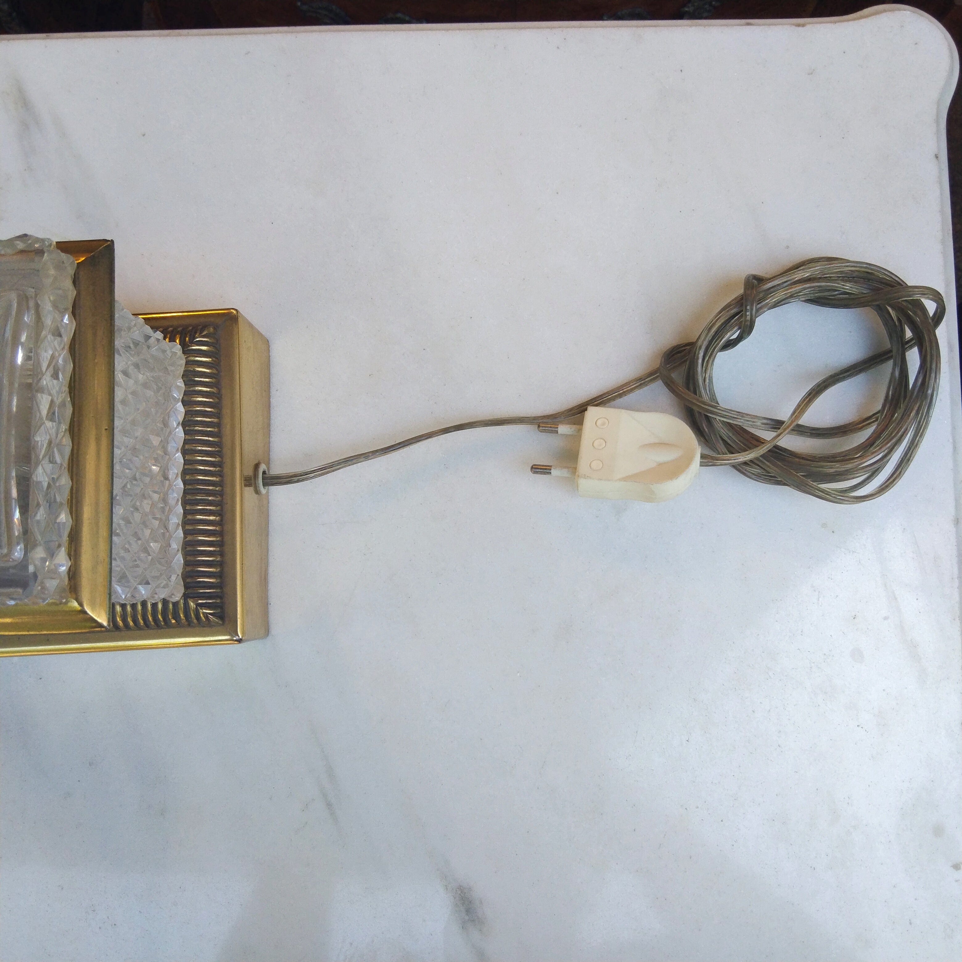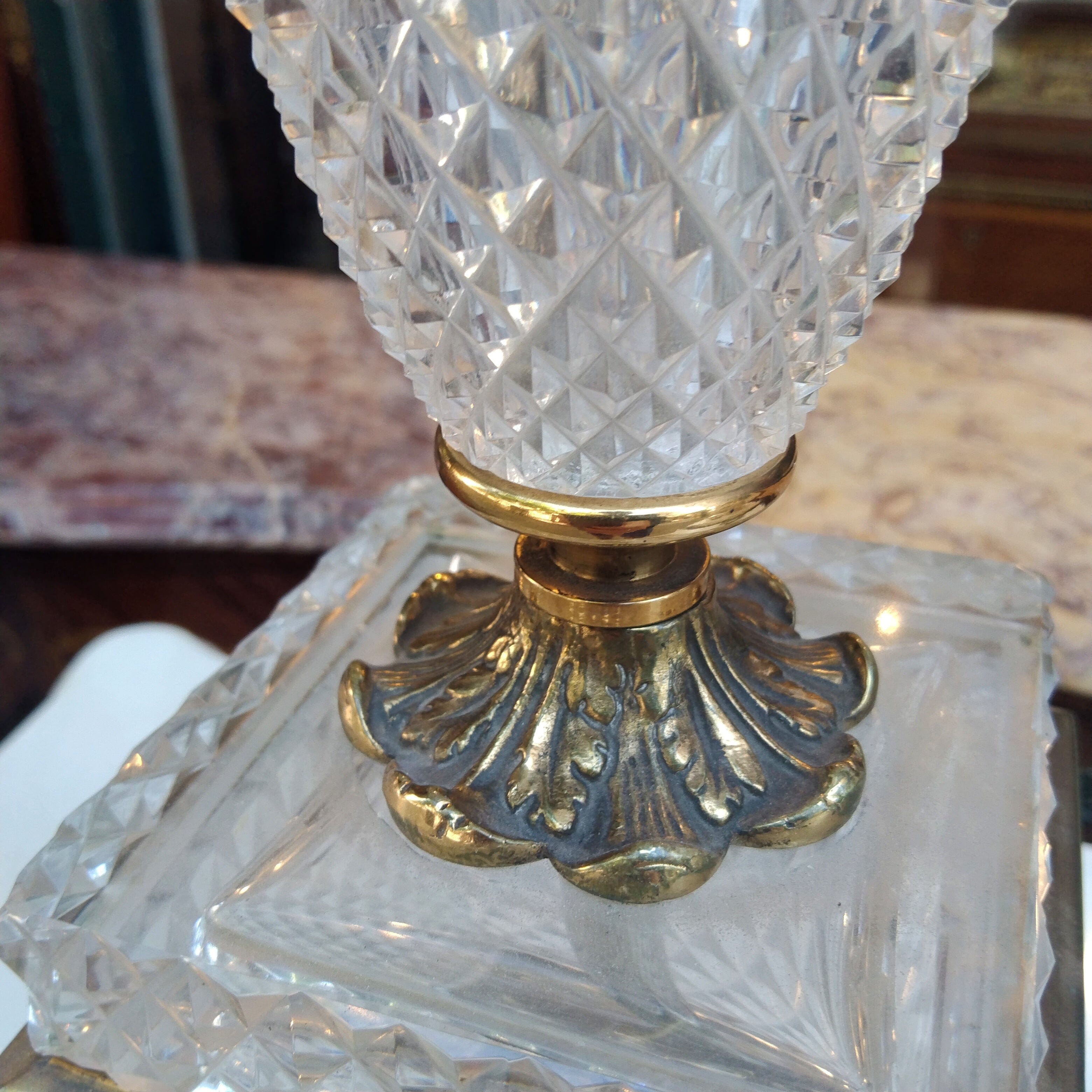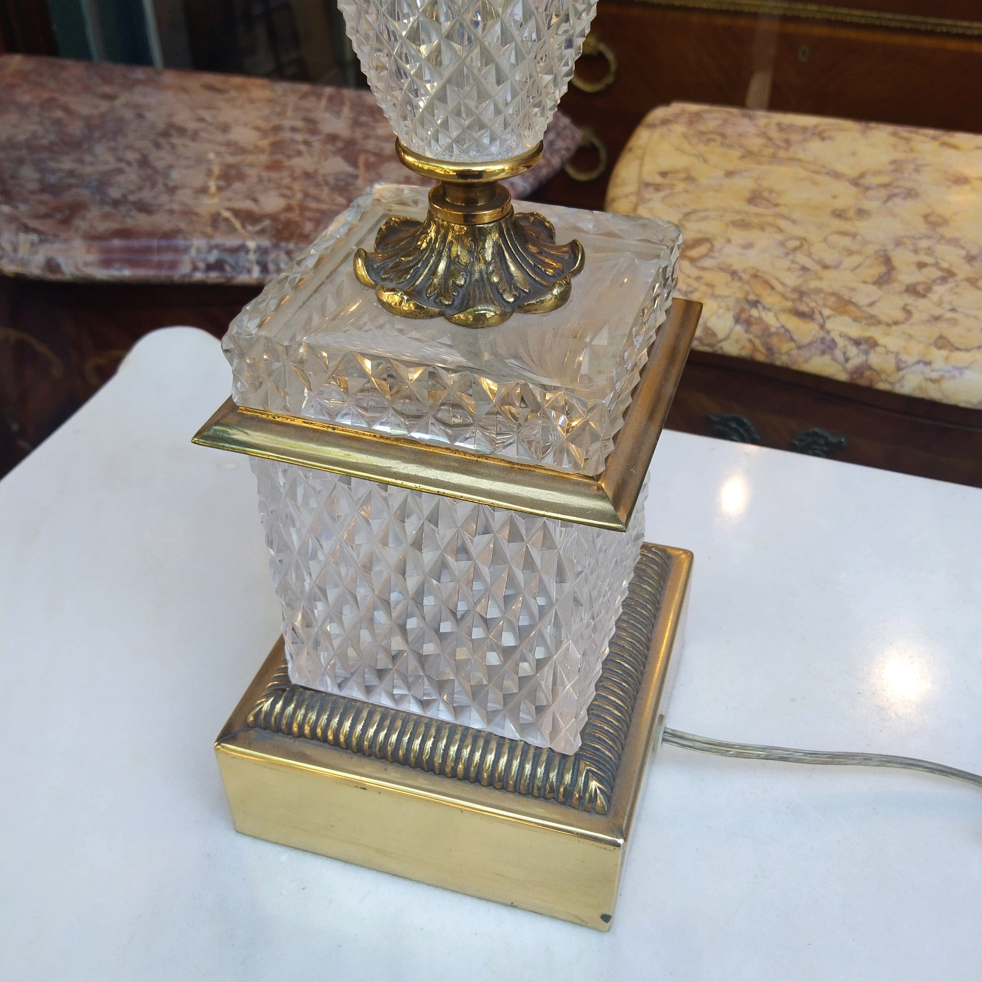 Bellísima lámpara de mesa de estilo neoclásico francés, de vidrio en molde, con diseños geométricos, y aplicaciones en bronce. La pieza se encuentra funcional, con su sistema eléctrico refaccionado.
