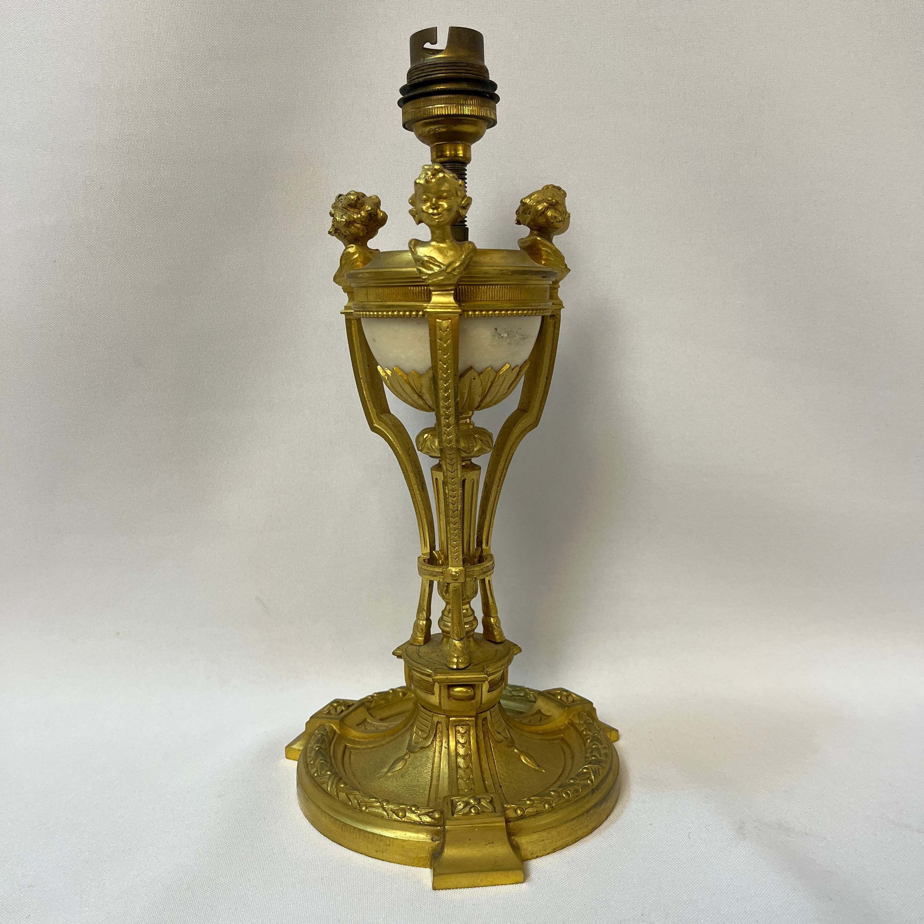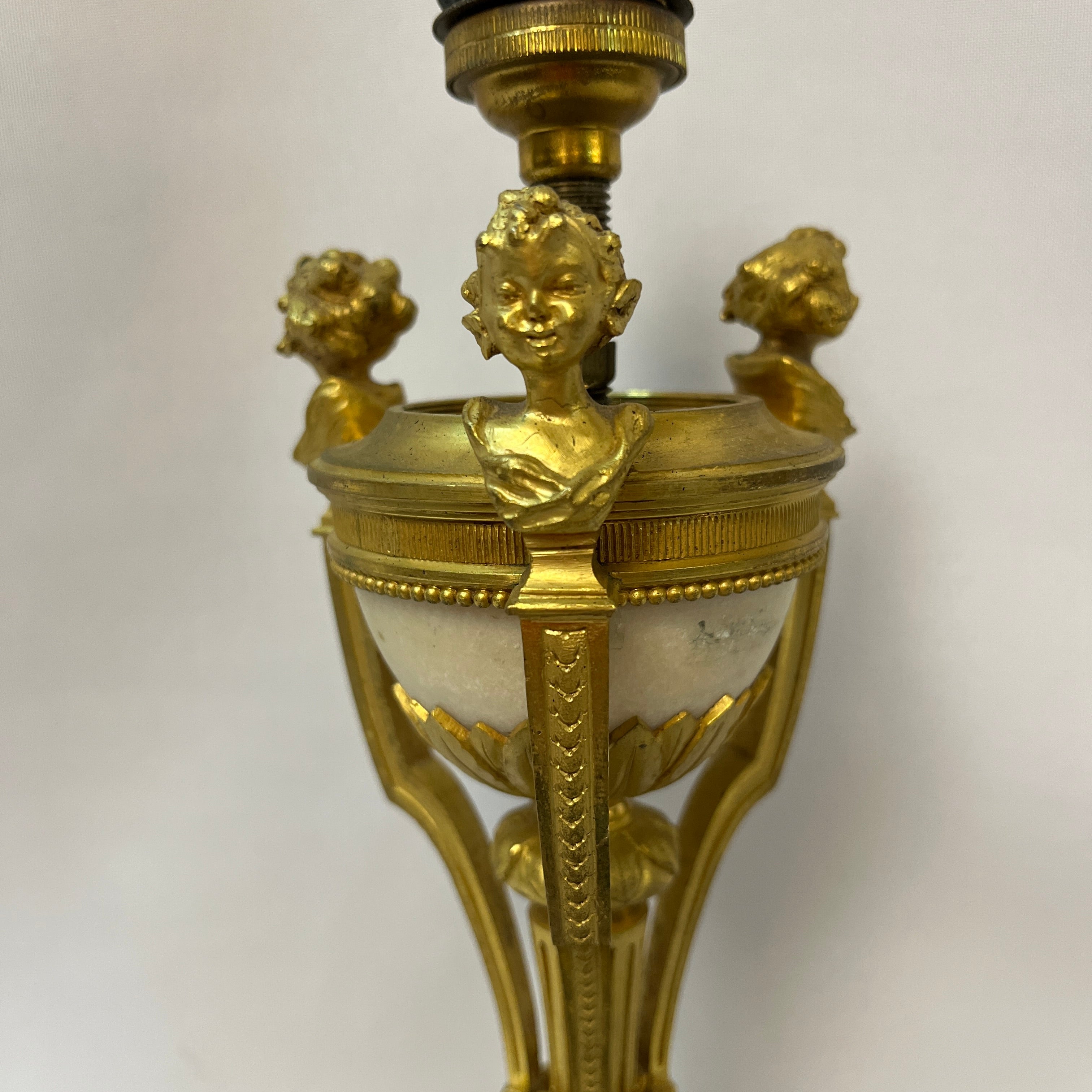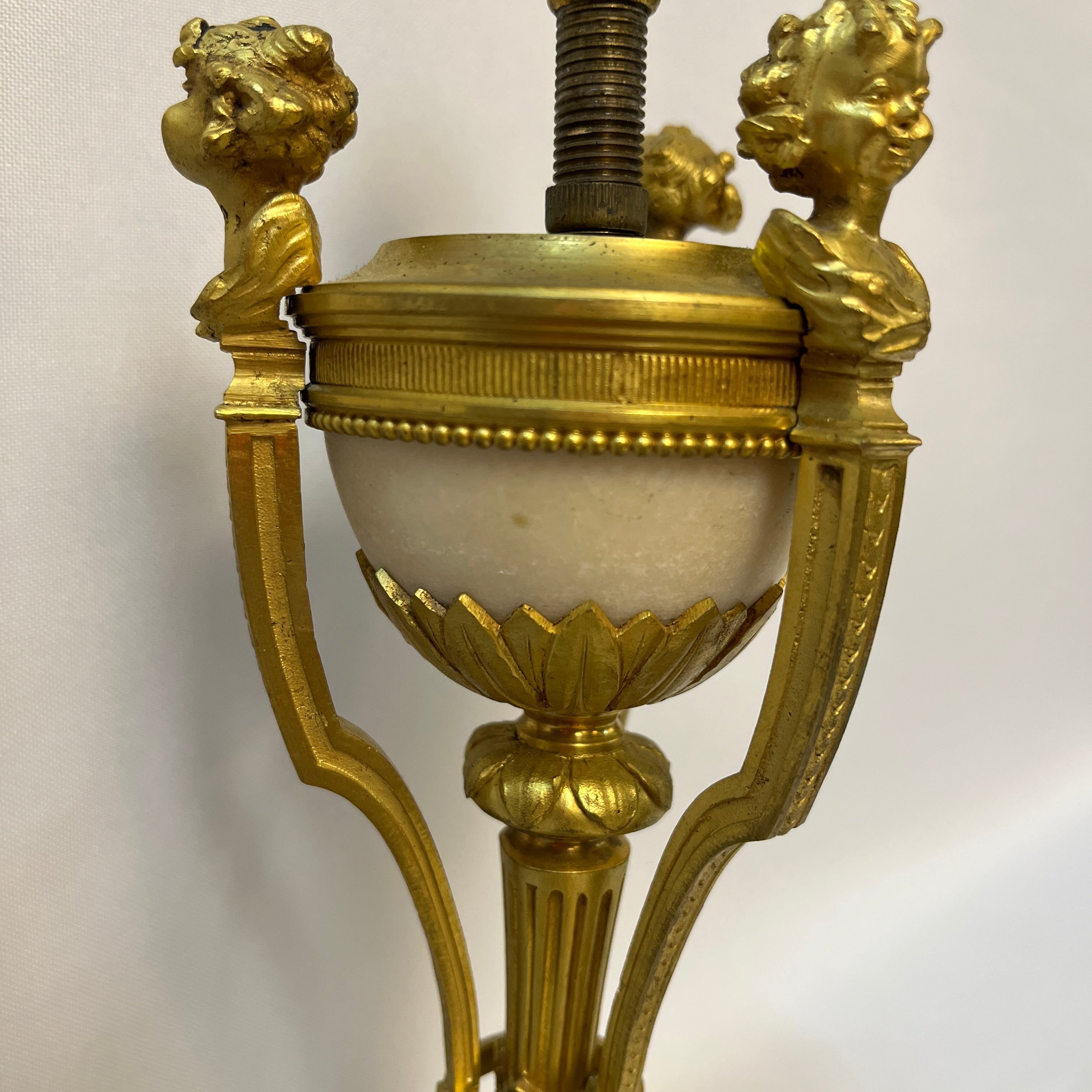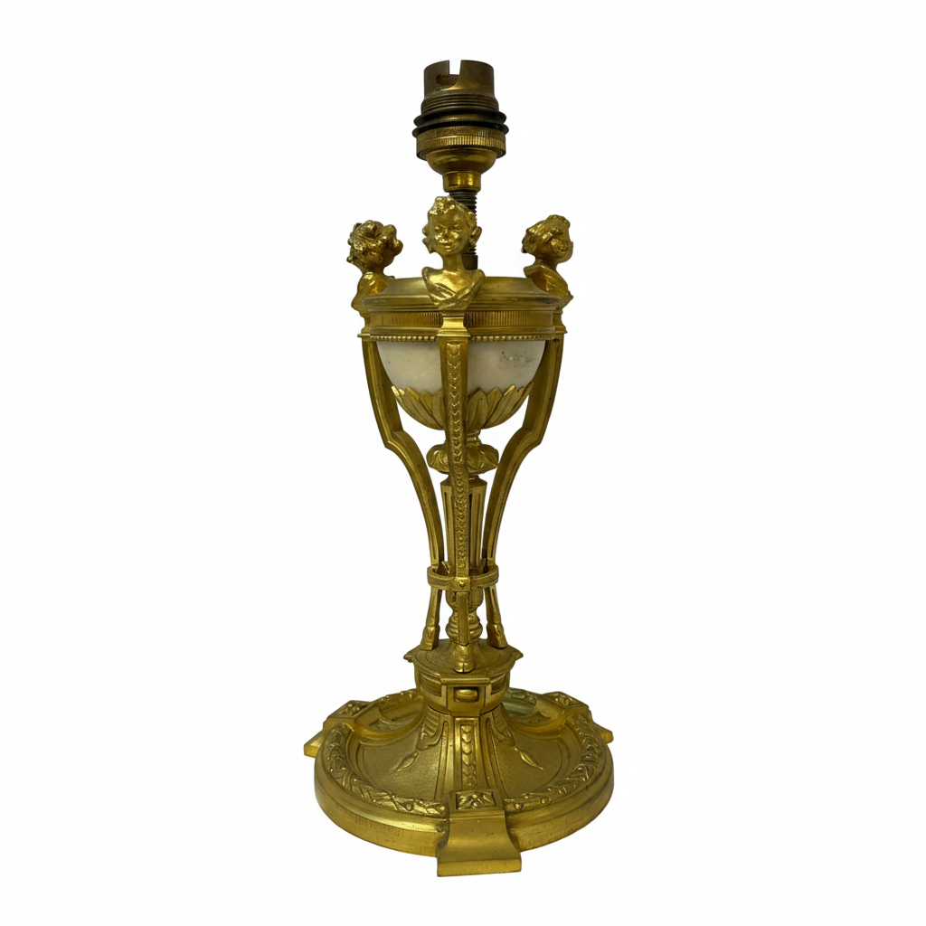 Radiante lámpara de bronce con una semi esfera de mármol blanco en su interior, coronada con pequeños bustos de querubines de bronce mirando al exterior. El trabajo detallista con el bronce, le otorga una belleza especial, ideal para tenerla como decoración o también utilizarla. Circa mediados s.XX
