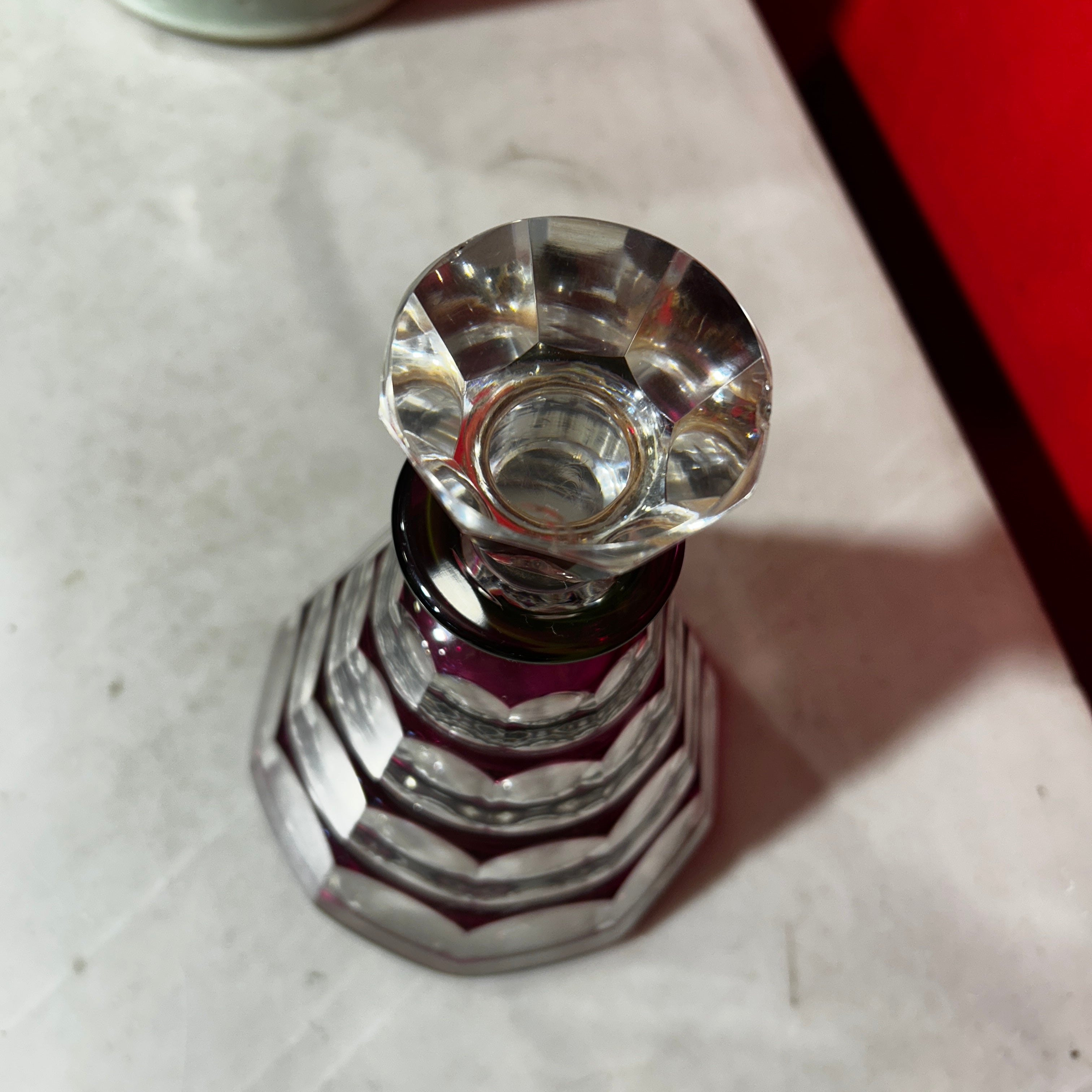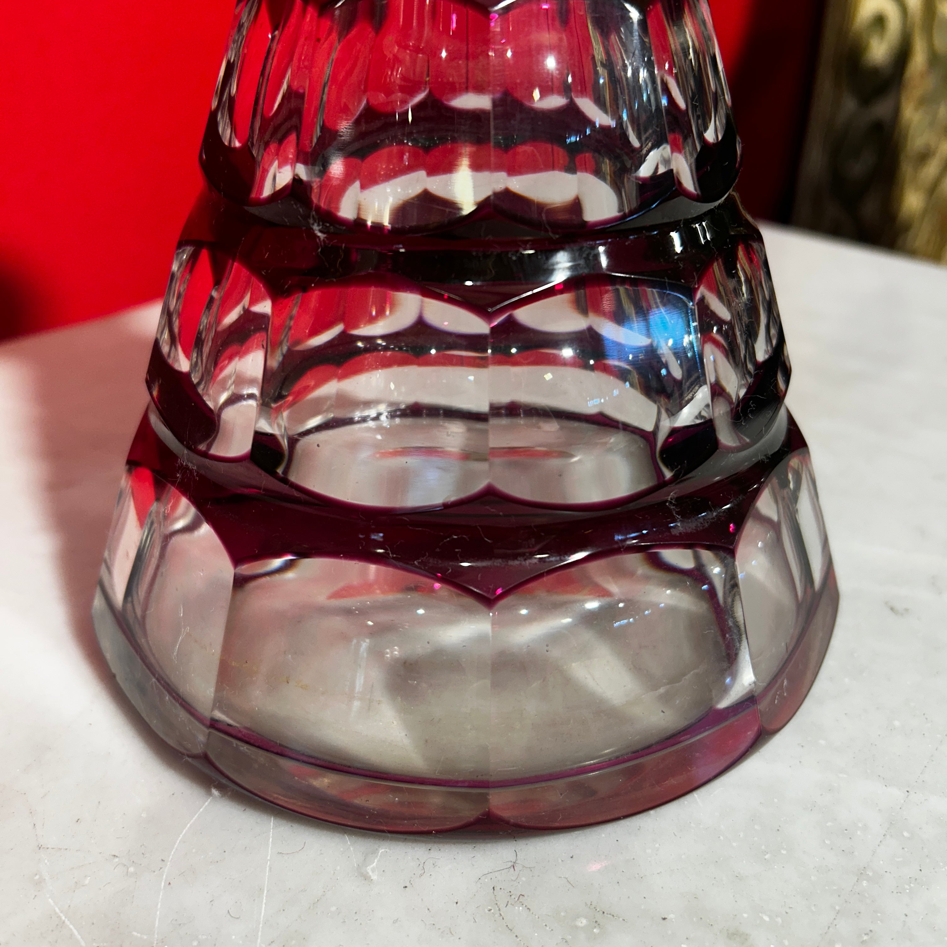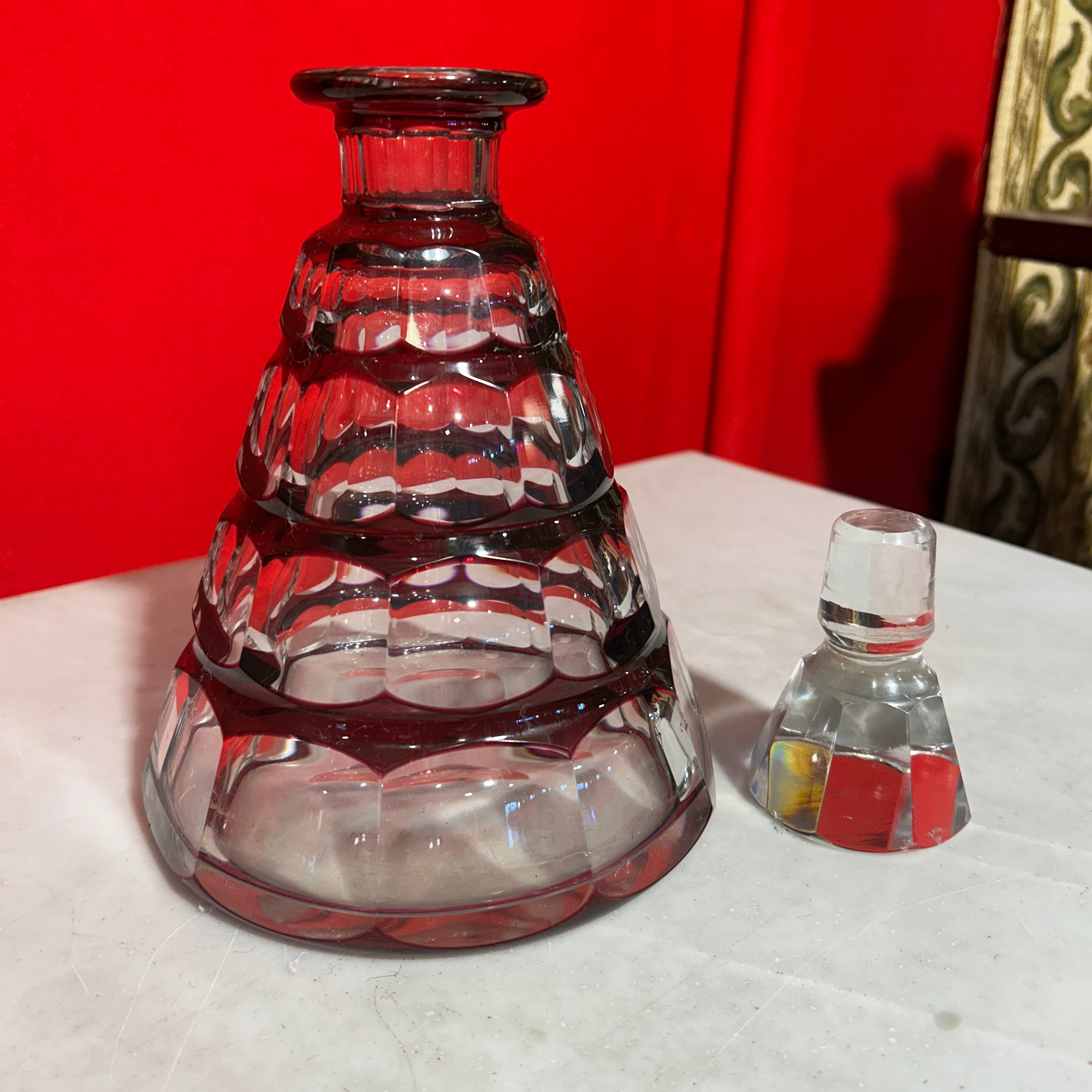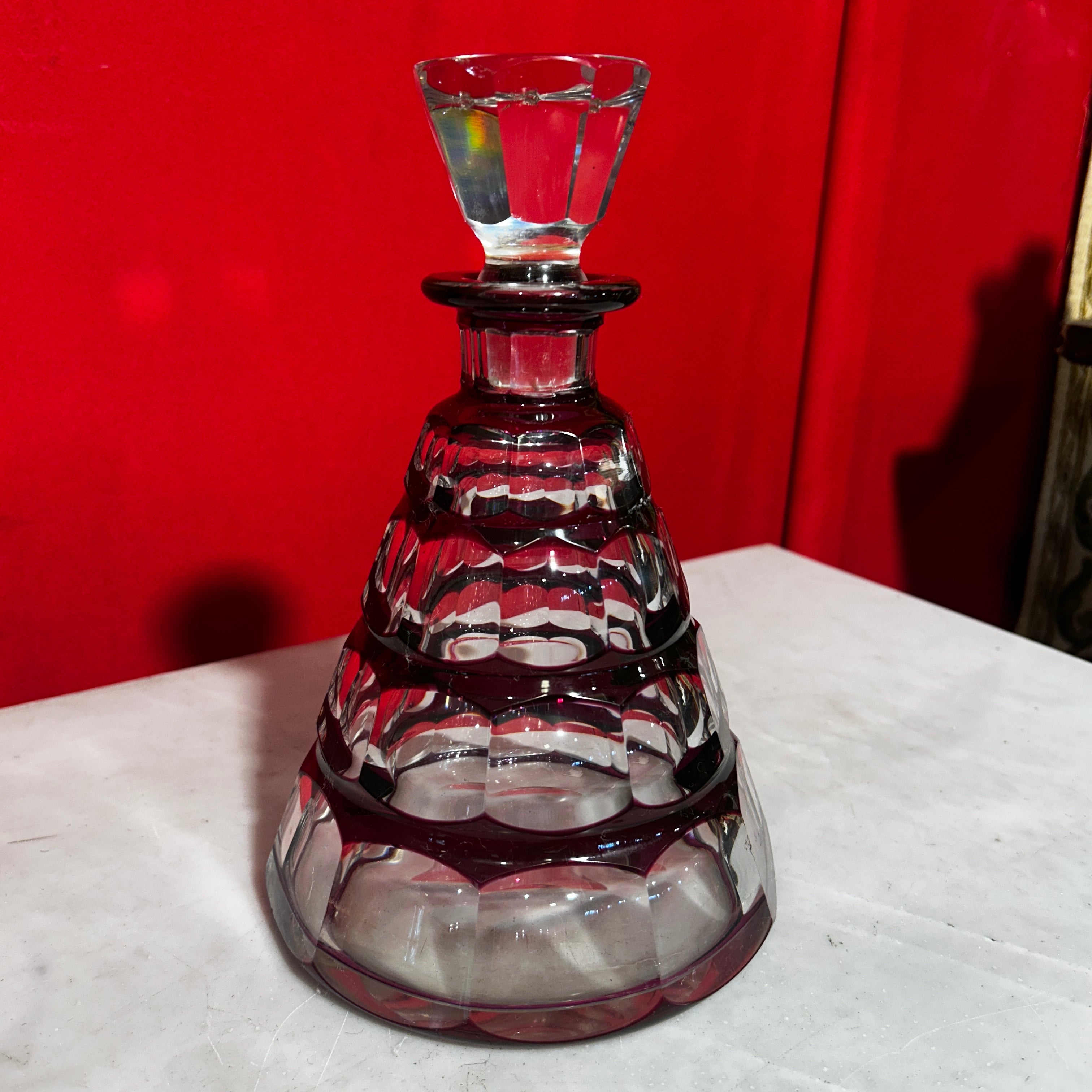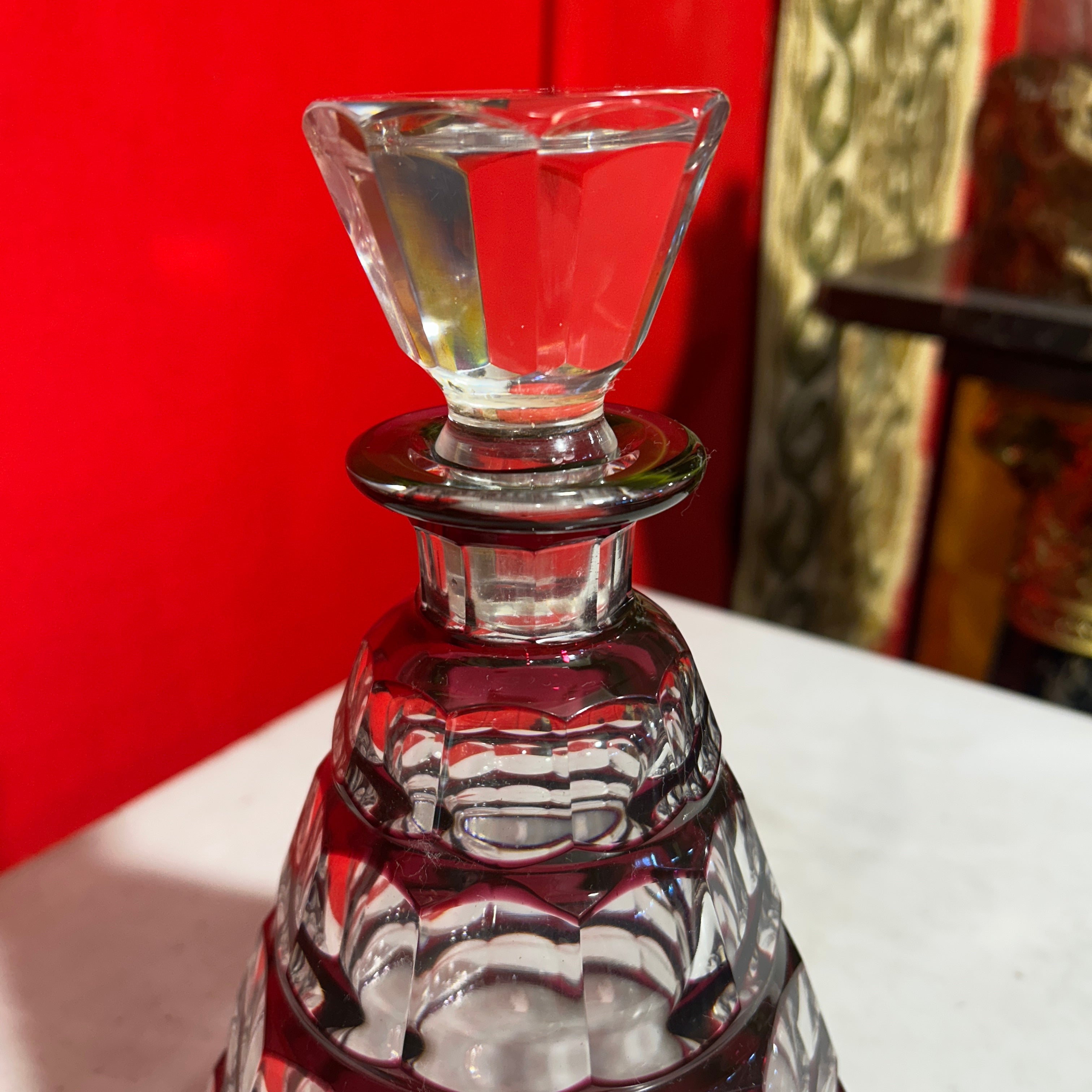 Bellisima licorera o decantador Belga de cristal Val Saint Lambert con un hermoso tono burdeo y forma piramidal, de mitad del siglo XX.