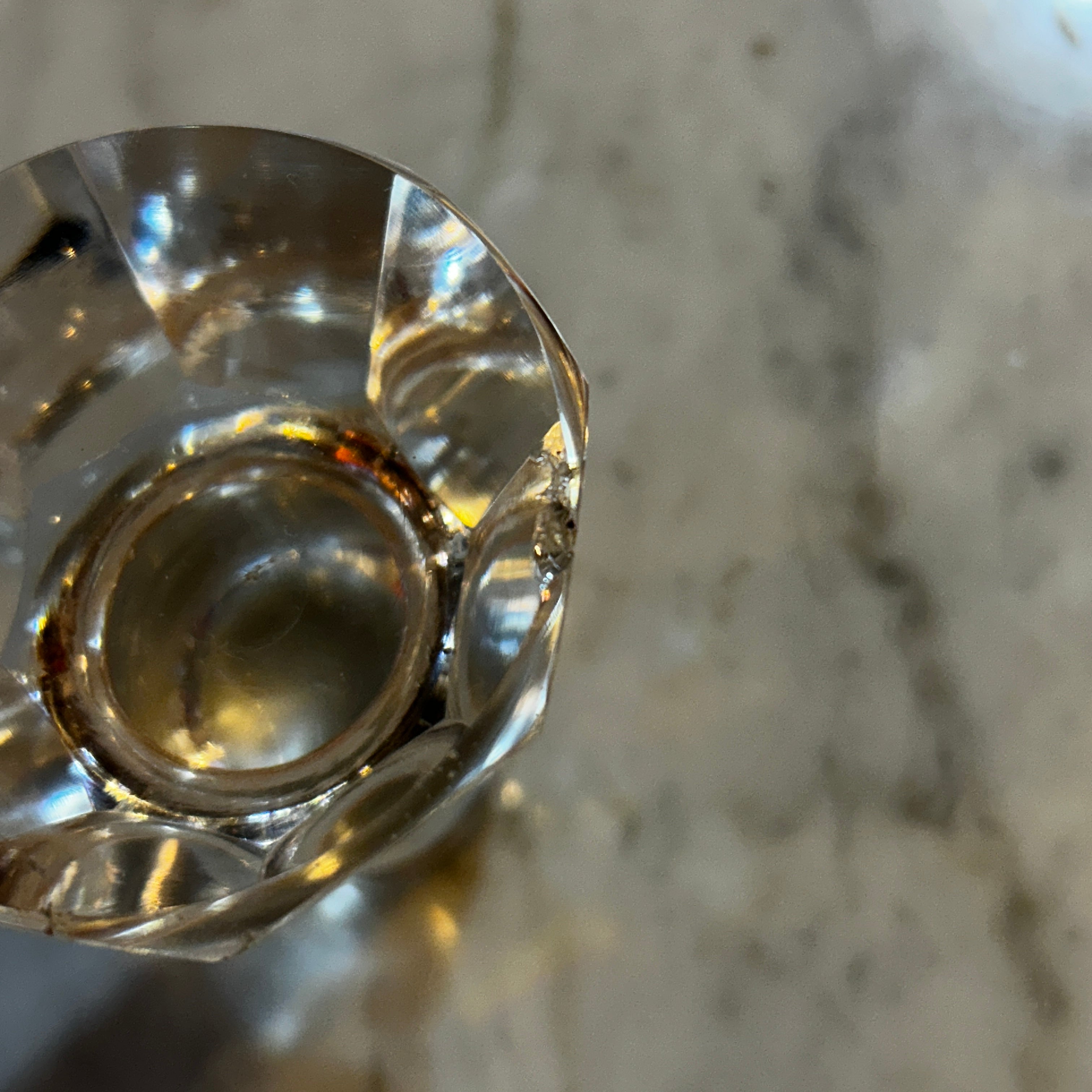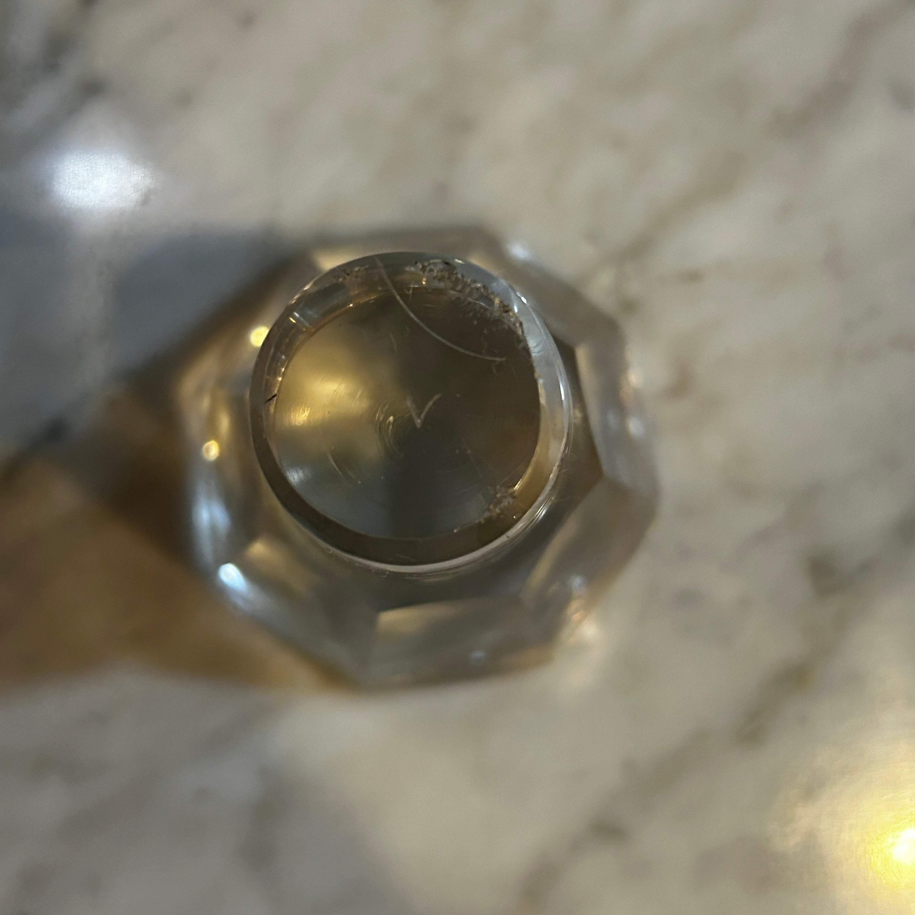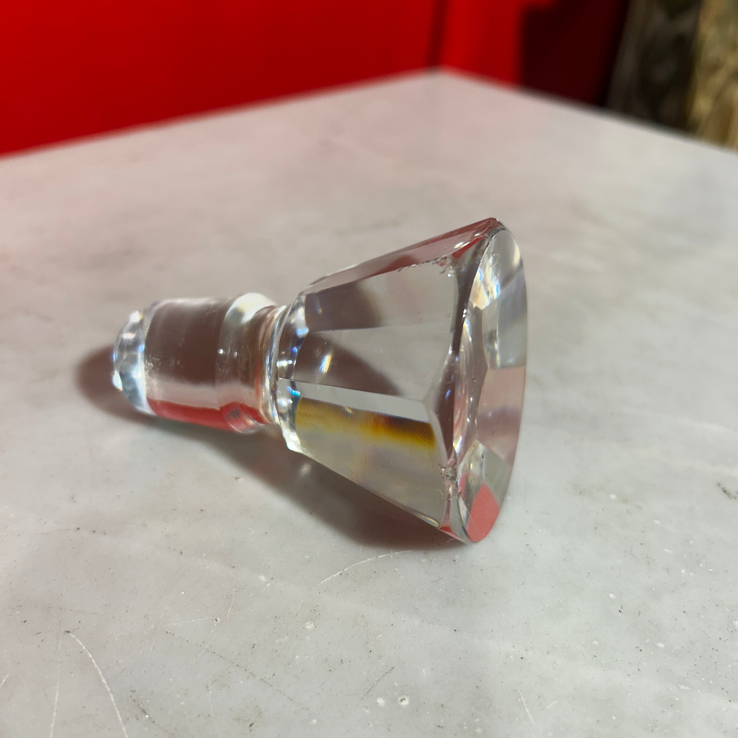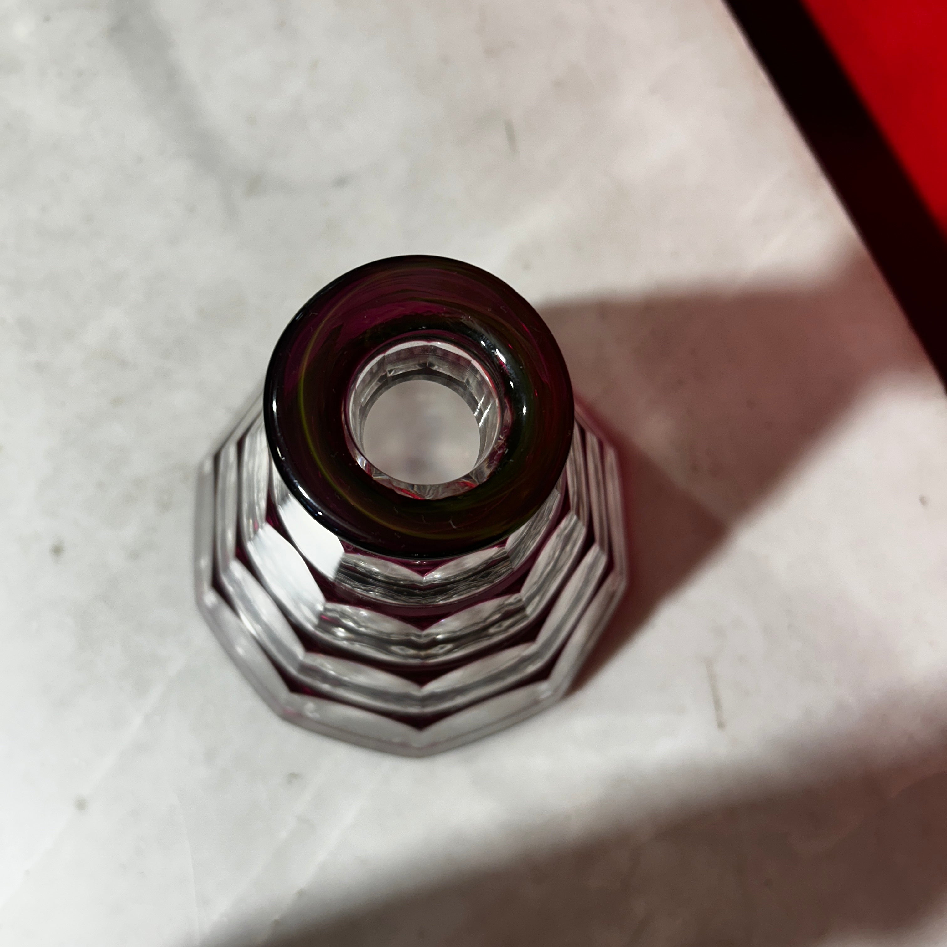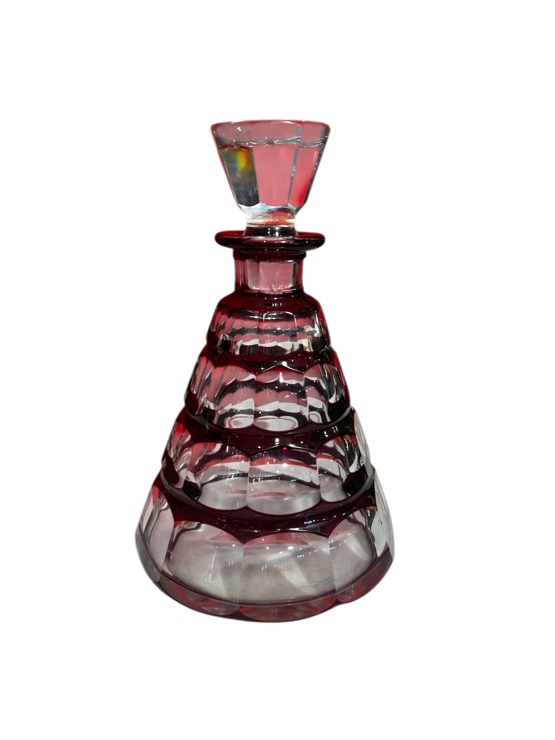 Bellisima licorera o decantador Belga de cristal Val Saint Lambert con un hermoso tono burdeo y forma piramidal, de mitad del siglo XX.