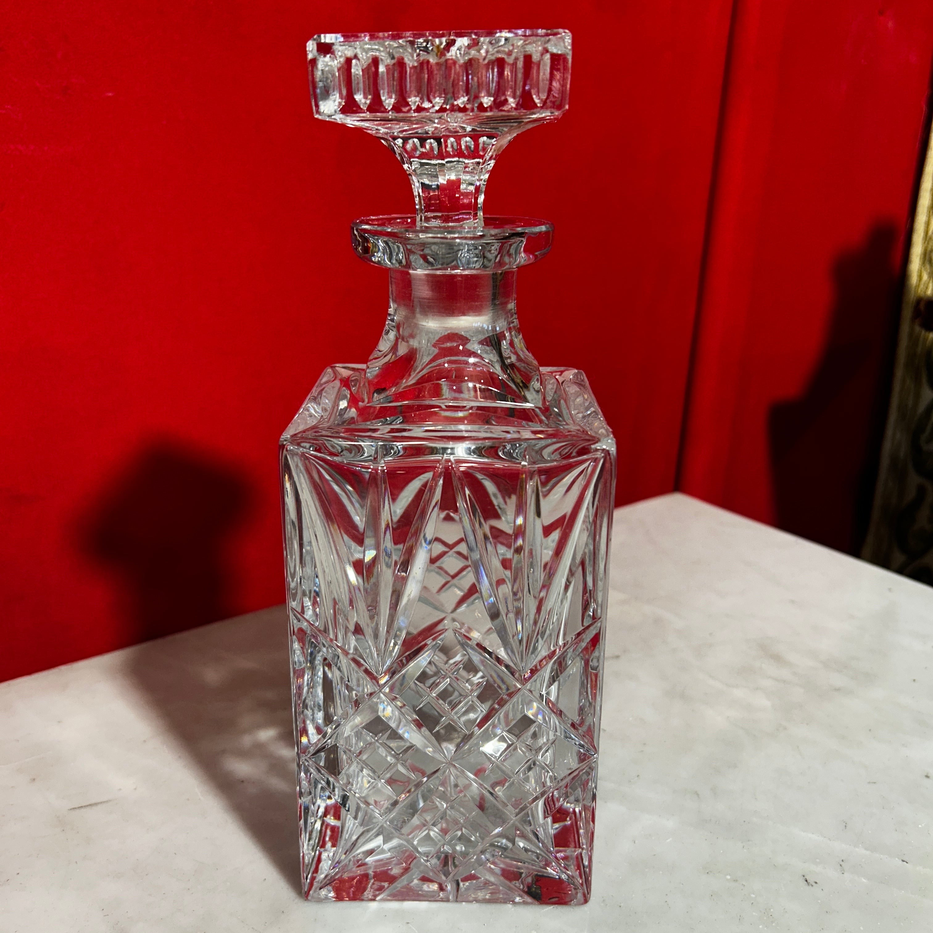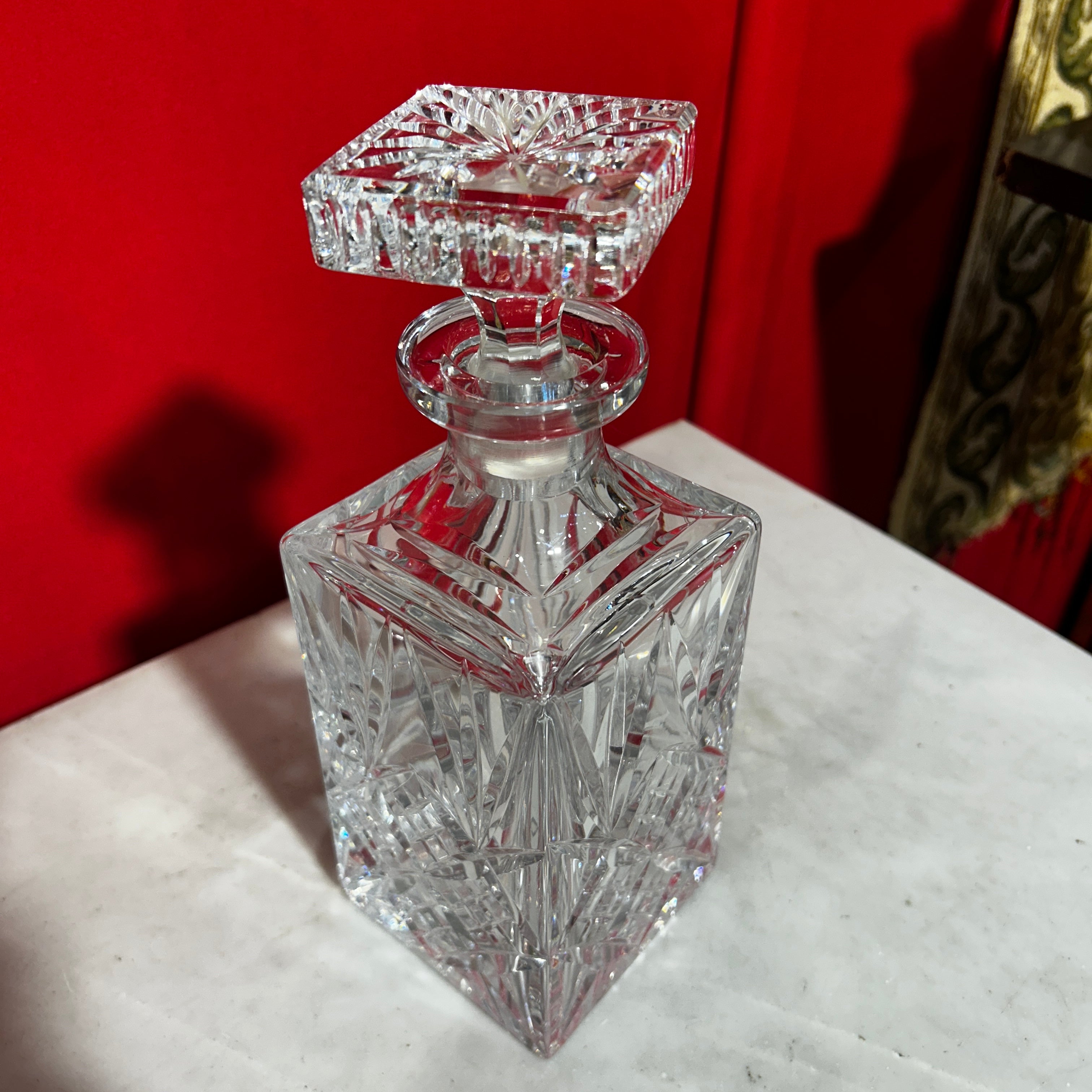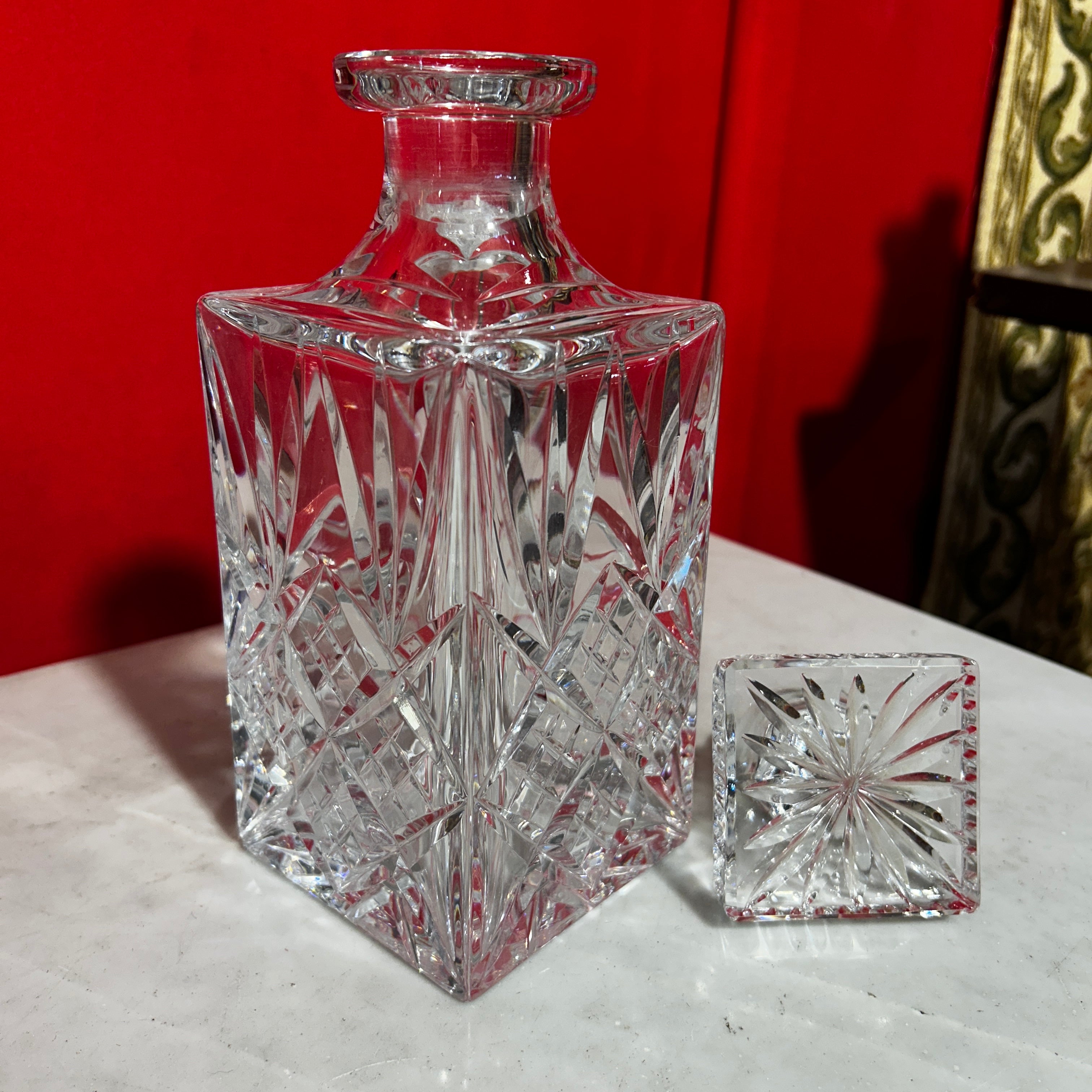 Preciosa licorera francesa de cristal rectangular, tapa cuadrada y bellisimos diseños.