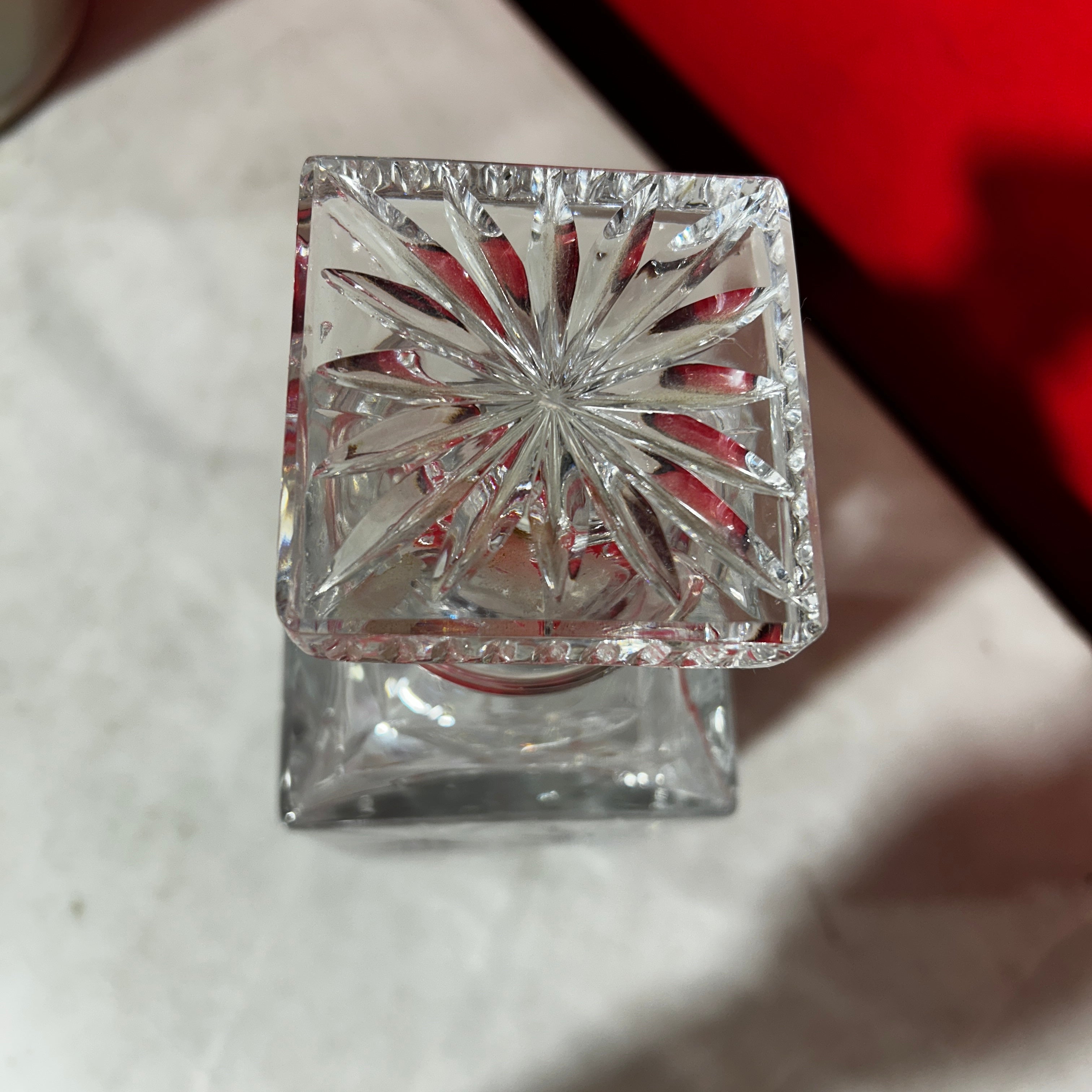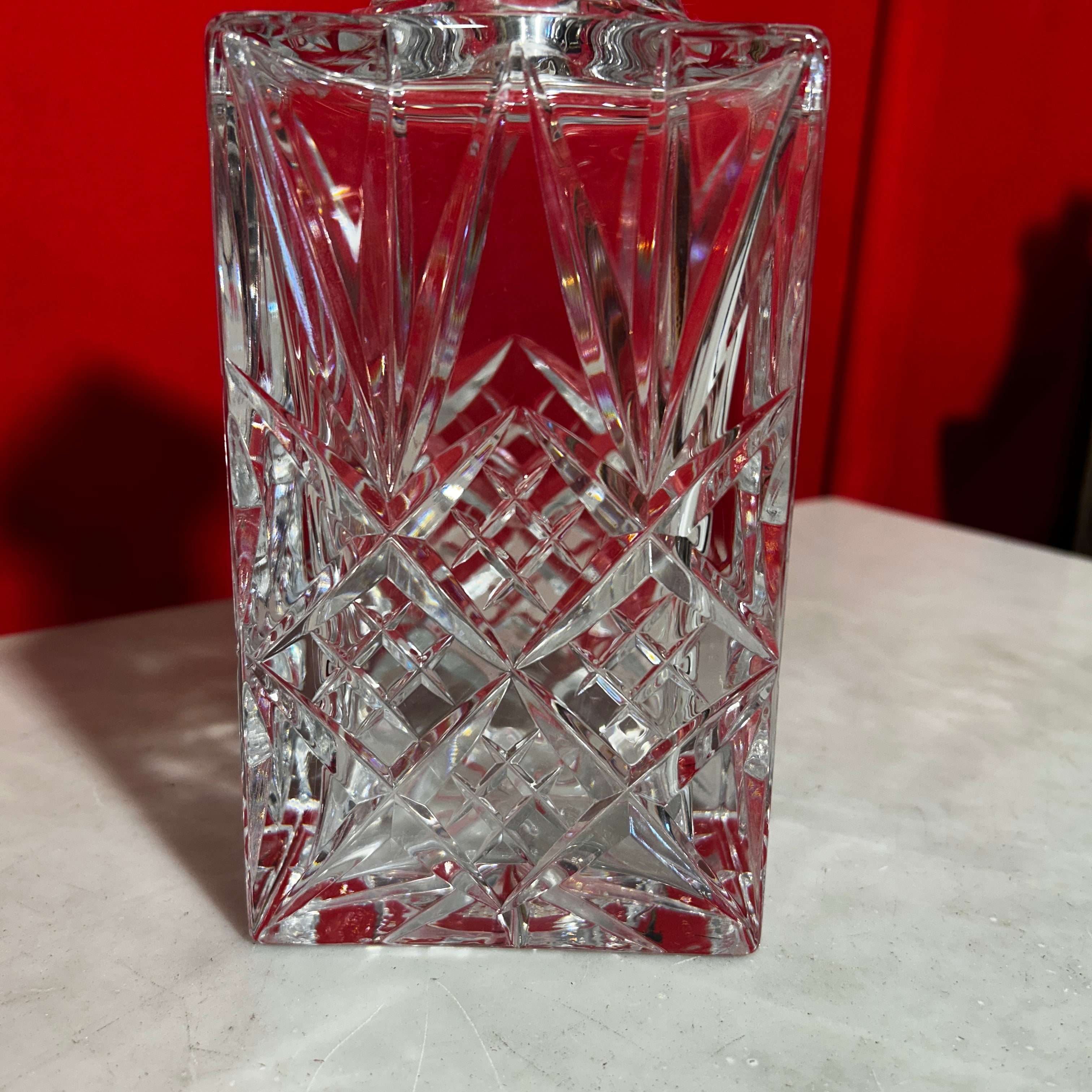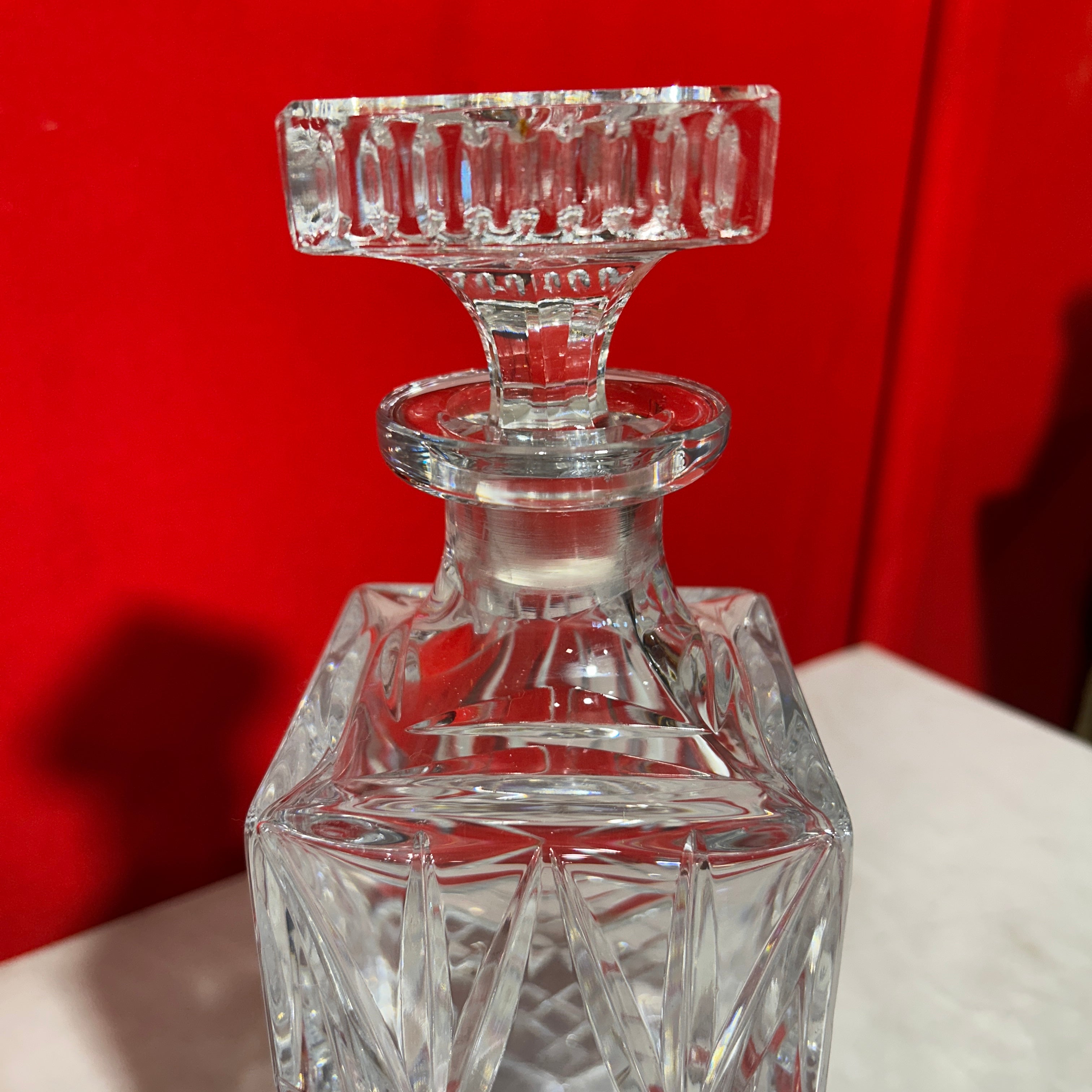 Preciosa licorera francesa de cristal rectangular, tapa cuadrada y bellisimos diseños.