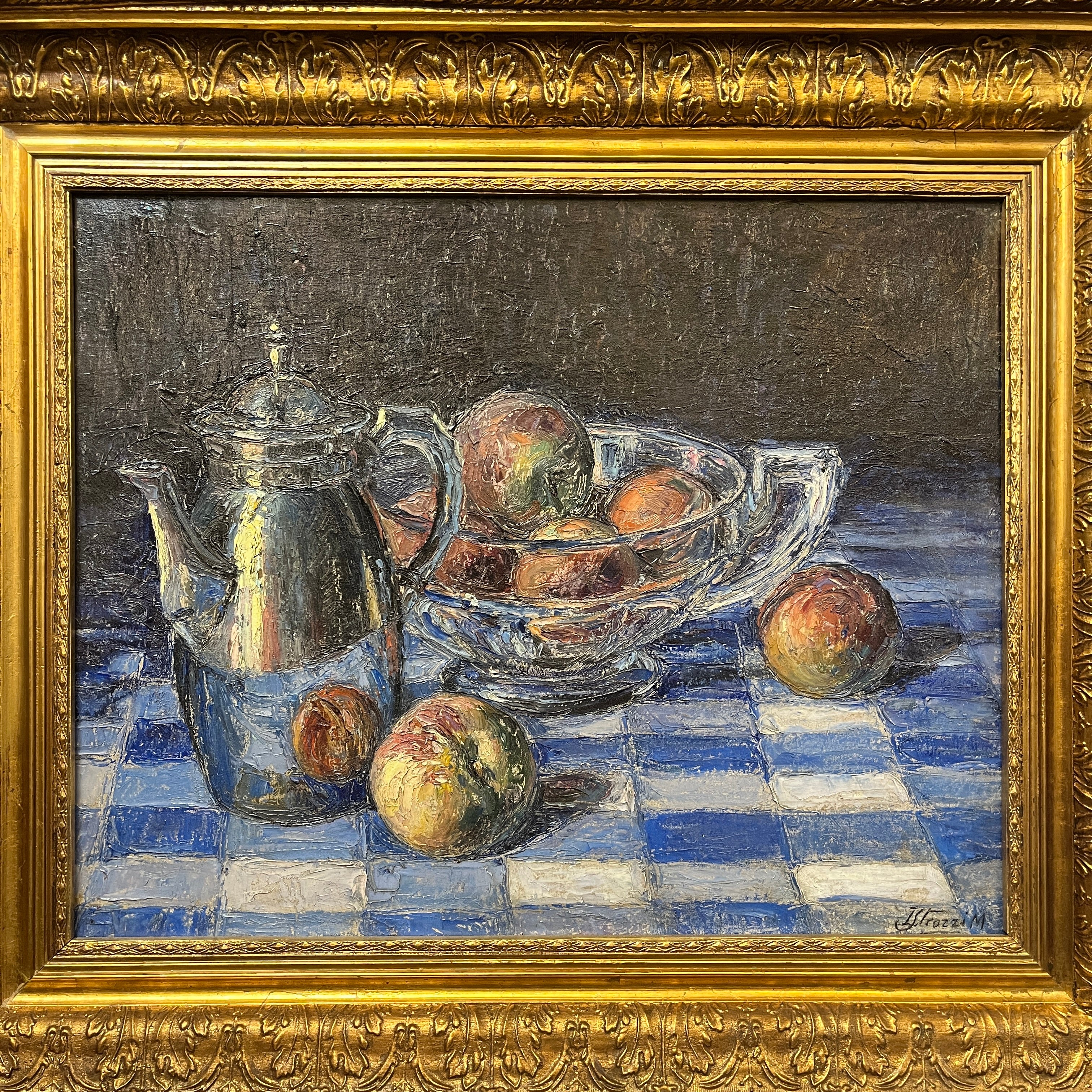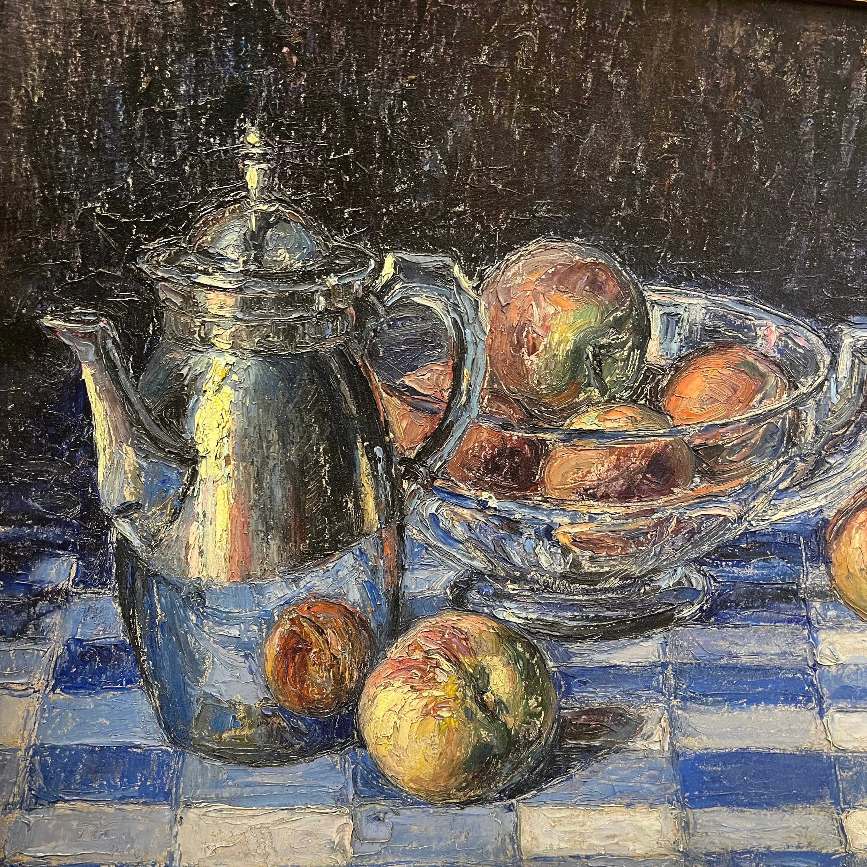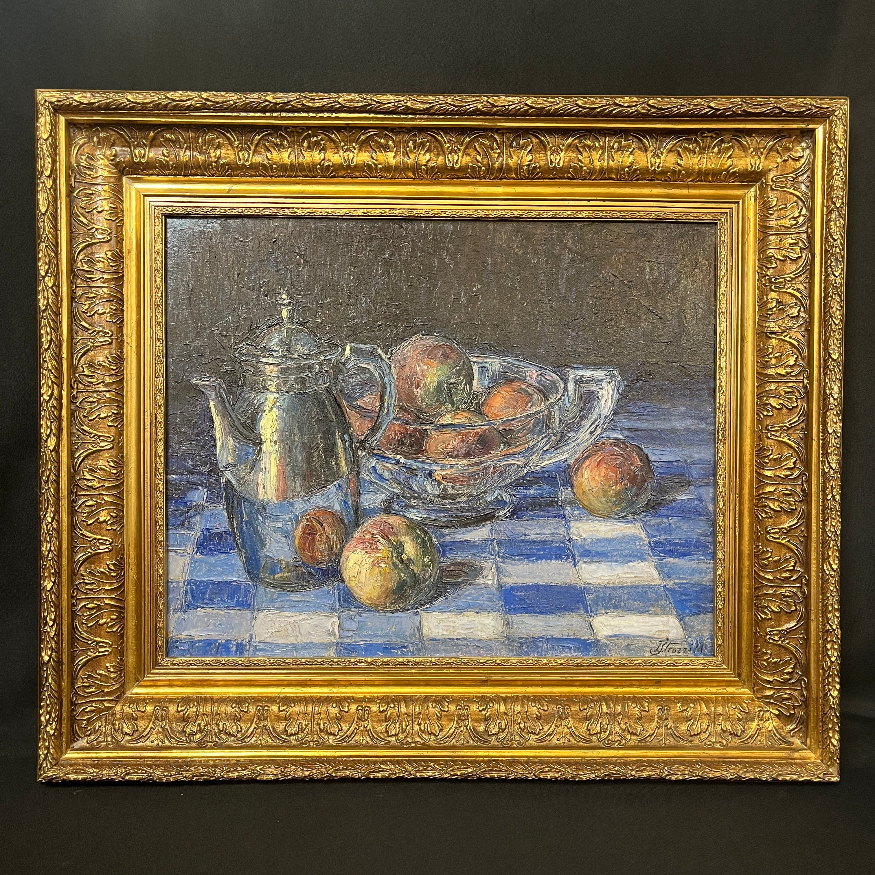 Esta obra del artista chileno Luis Strozzi (1891-1966), es un bodegón de frutas y objetos reflectantes como vidrio y metal, lo que genera un fascinante juego de dimensiones y texturas. El contraste de colores entre amarillos y azules arman una pieza equilibrada y agradable.