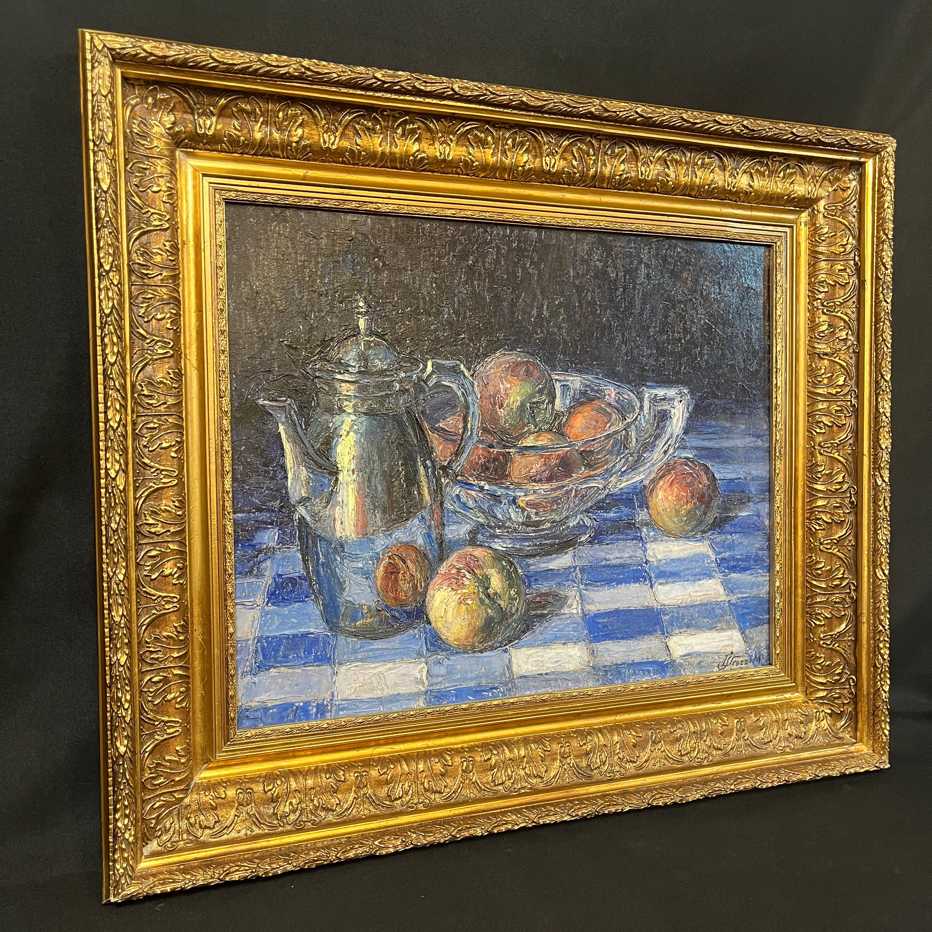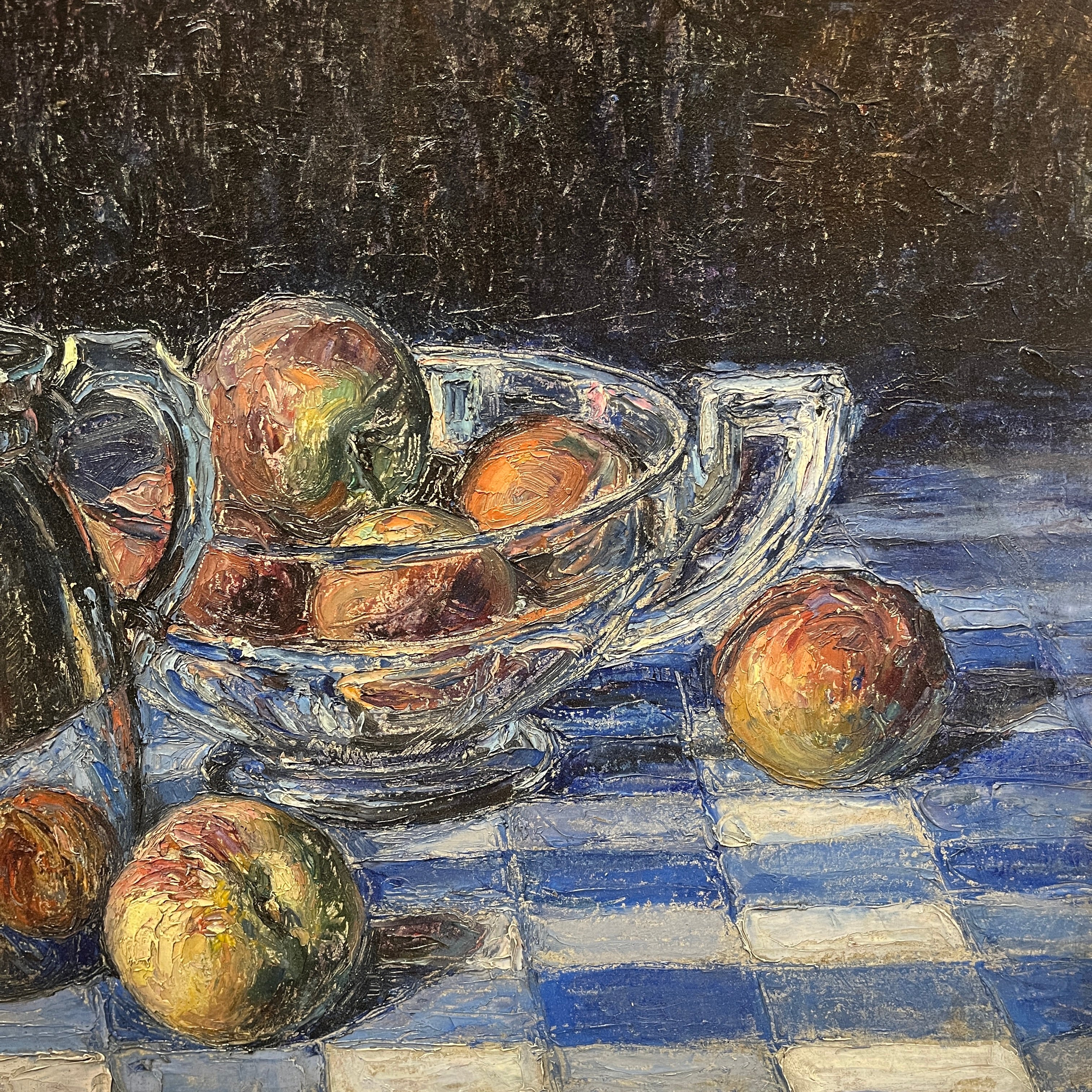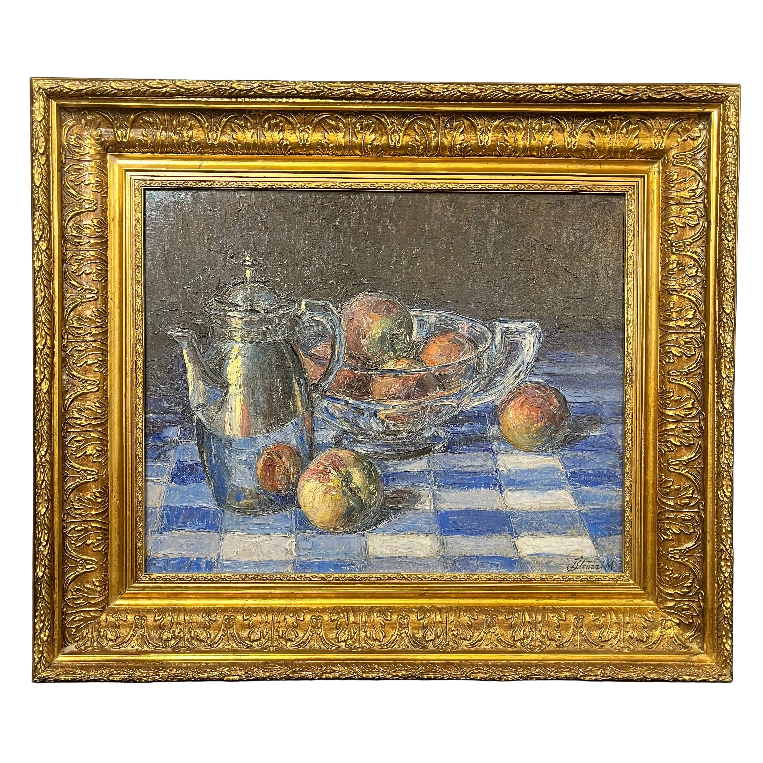 Esta obra del artista chileno Luis Strozzi (1891-1966), es un bodegón de frutas y objetos reflectantes como vidrio y metal, lo que genera un fascinante juego de dimensiones y texturas. El contraste de colores entre amarillos y azules arman una pieza equilibrada y agradable.