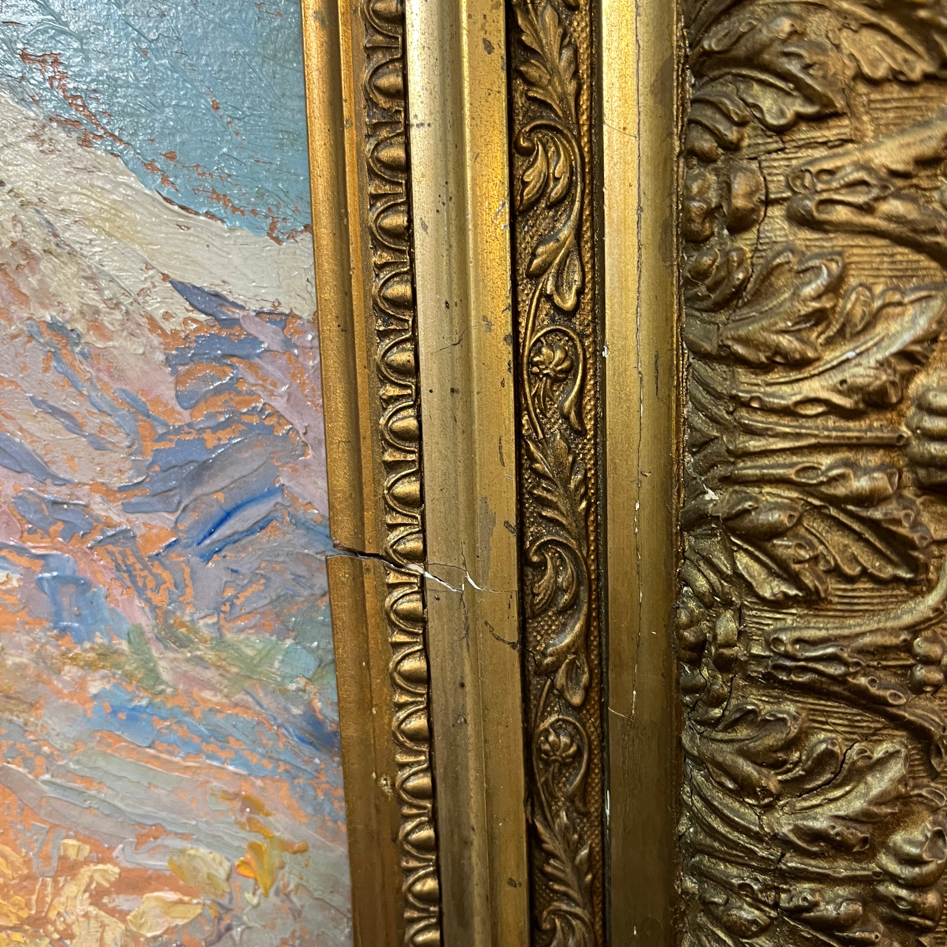 Óleo sobre madera del pintor chileno Luis Strozzi, representando un precioso paisaje con árboles de ciruelo florecidos y la cordillera nevada de fondo. La obra está enmarcada en madera tallada y terminada en elegante pintura dorada.