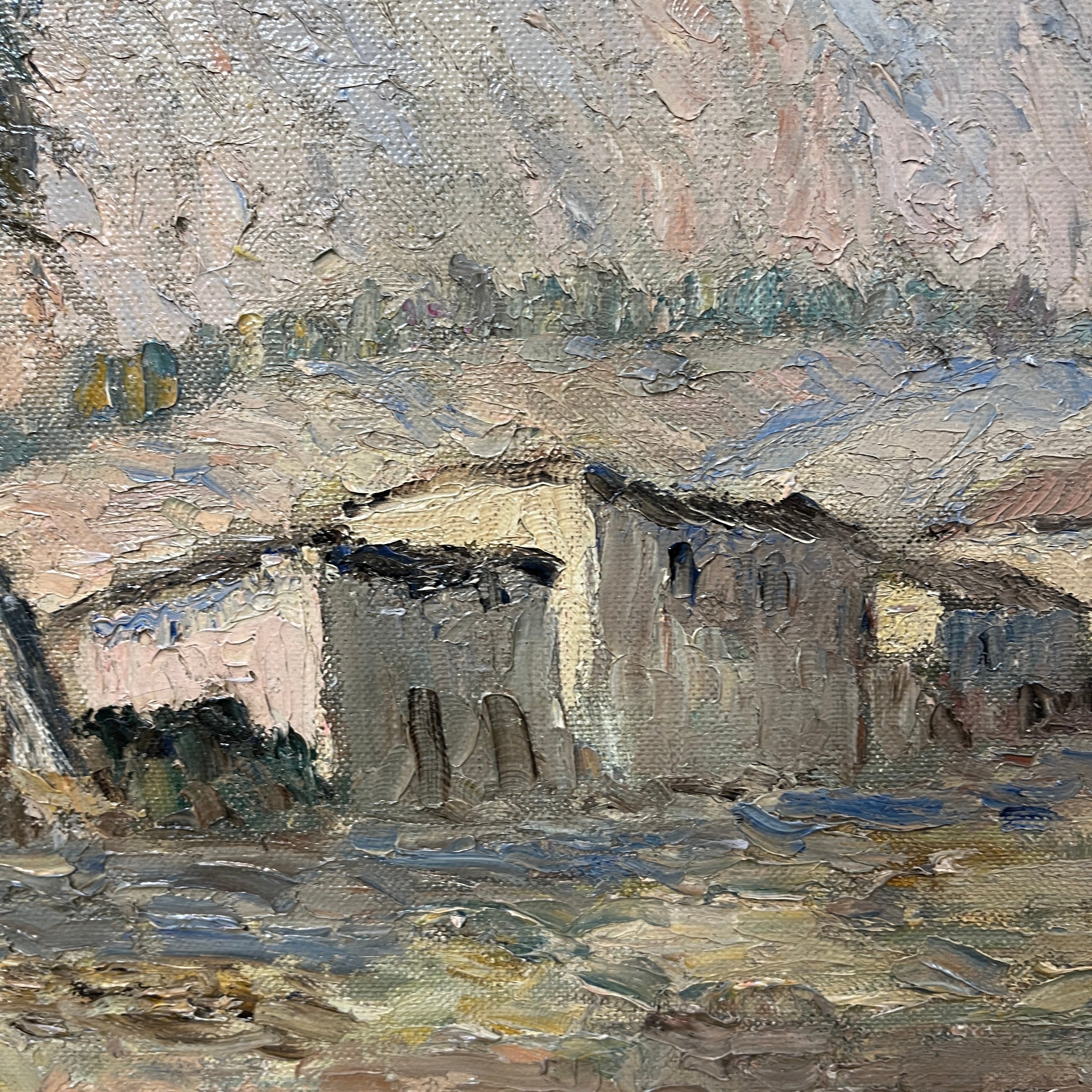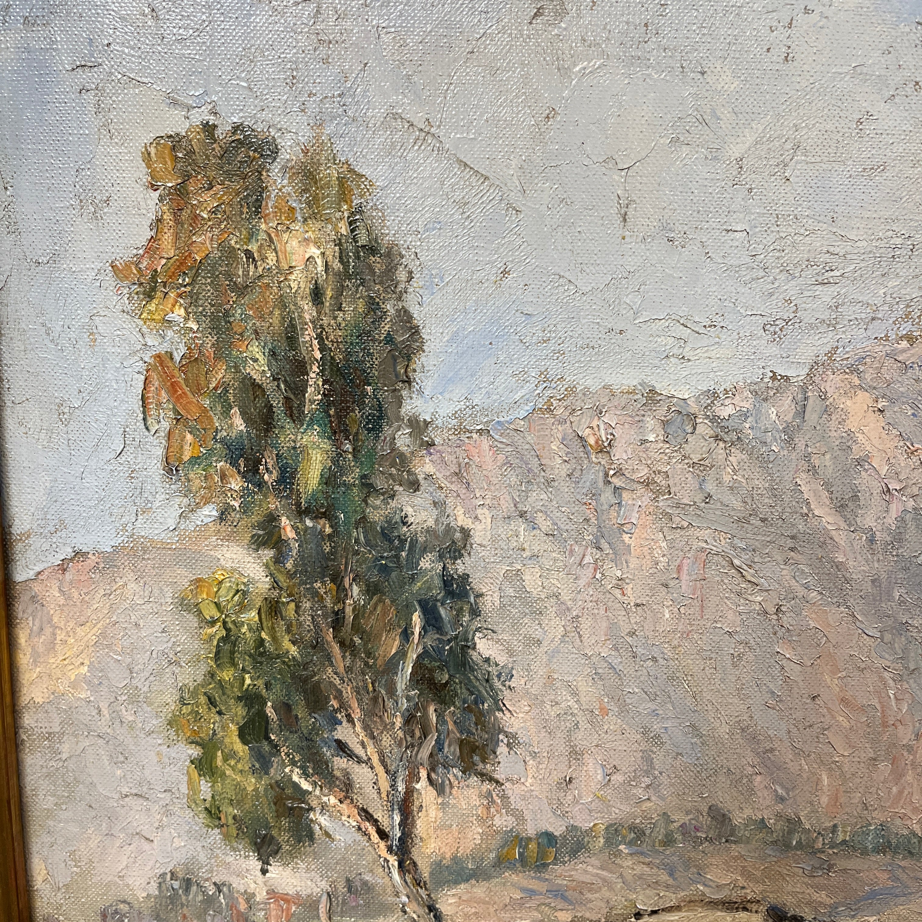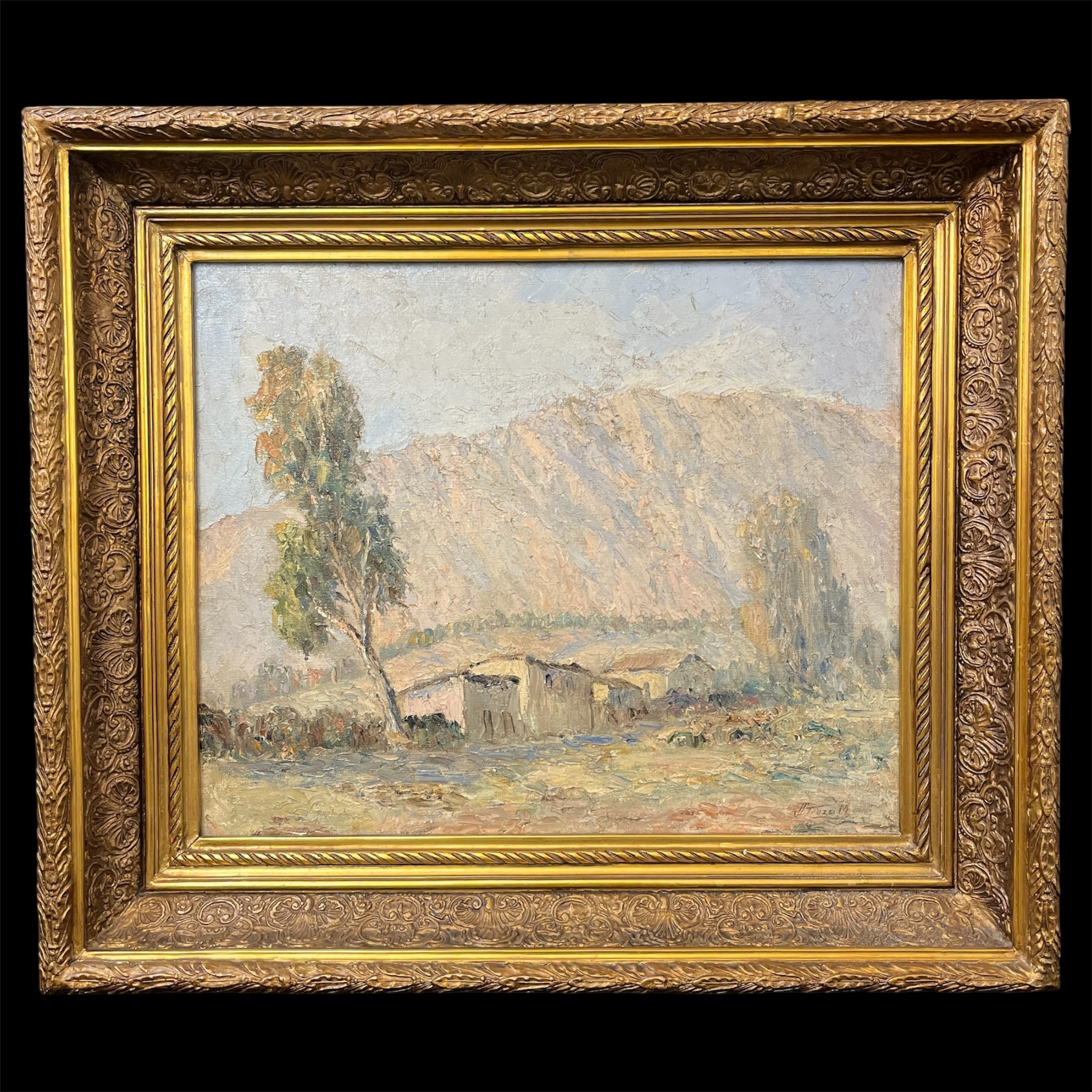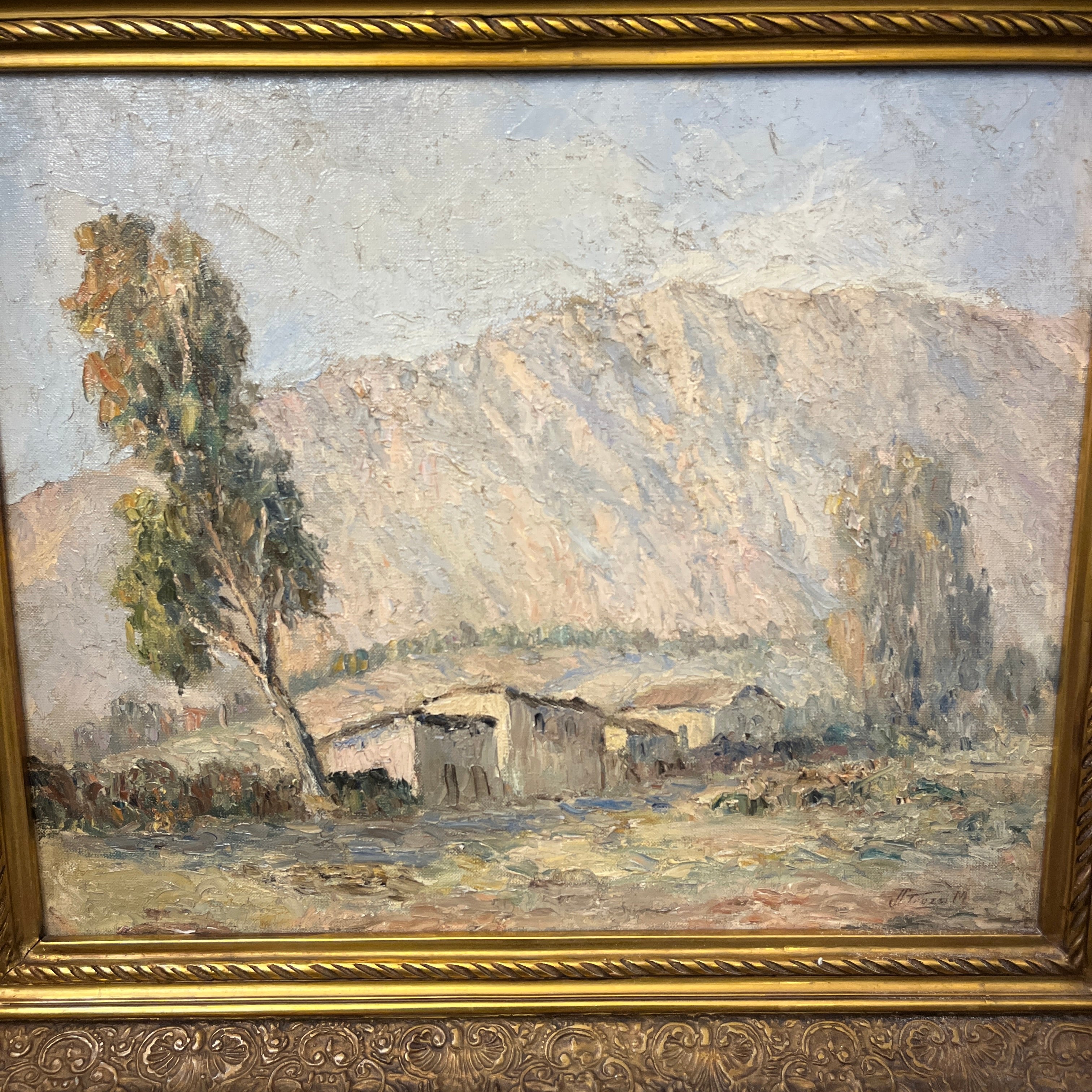 Óleo sobre tela del reconocido pintor chileno Luis Strozzi, representando un paisaje cordillerano en tonos de grises, verdes y azules, tocados por una luz anaranjada. Este trabajo de luz, que sugiere un atardecer, hace una composición muy sutil y llena de la textura de cada elemento representado. A los pies de la cordillera, una casita sencilla acompañada de un gran árbol. La obra está enmarcada en madera tallada en relieves y terminada de dorado.