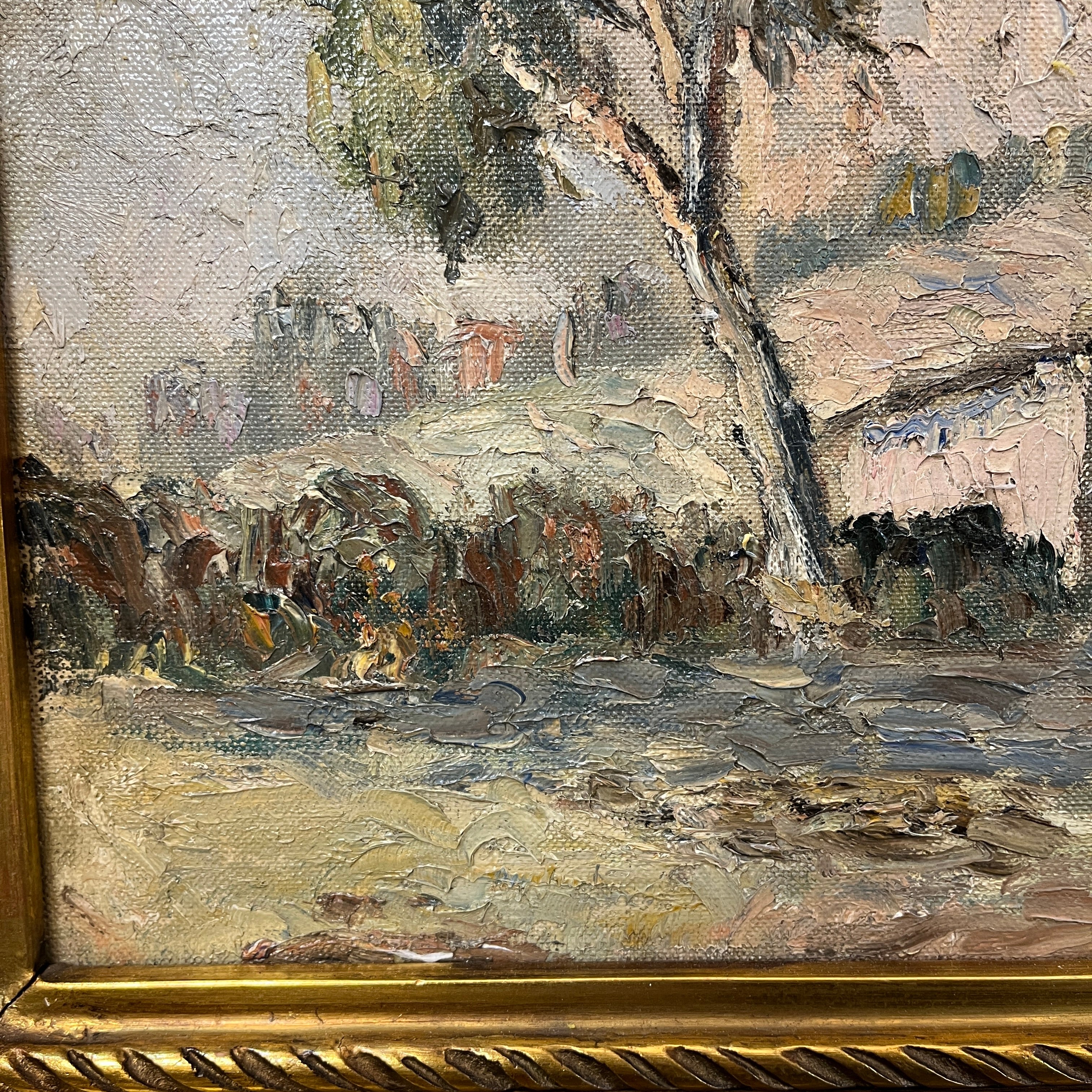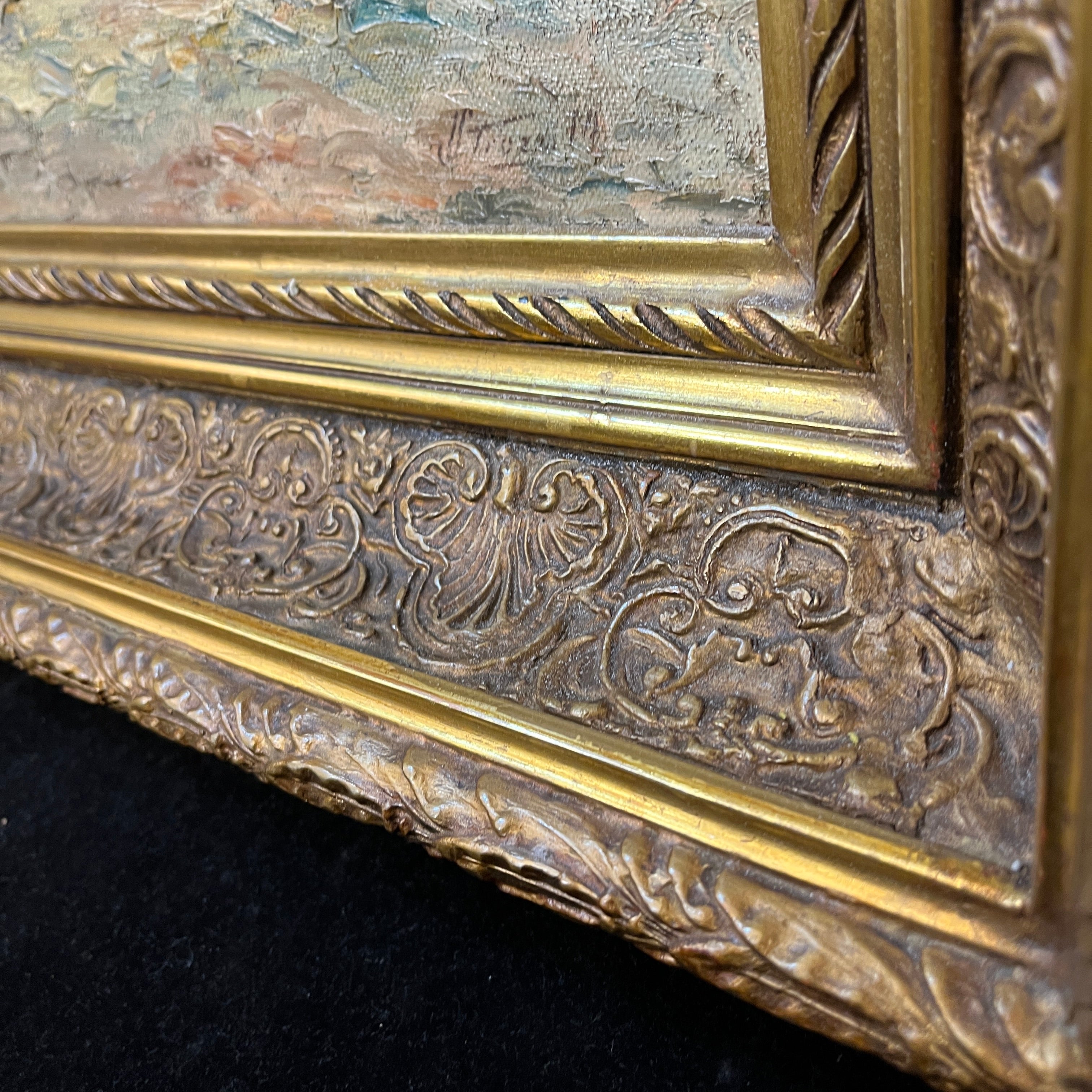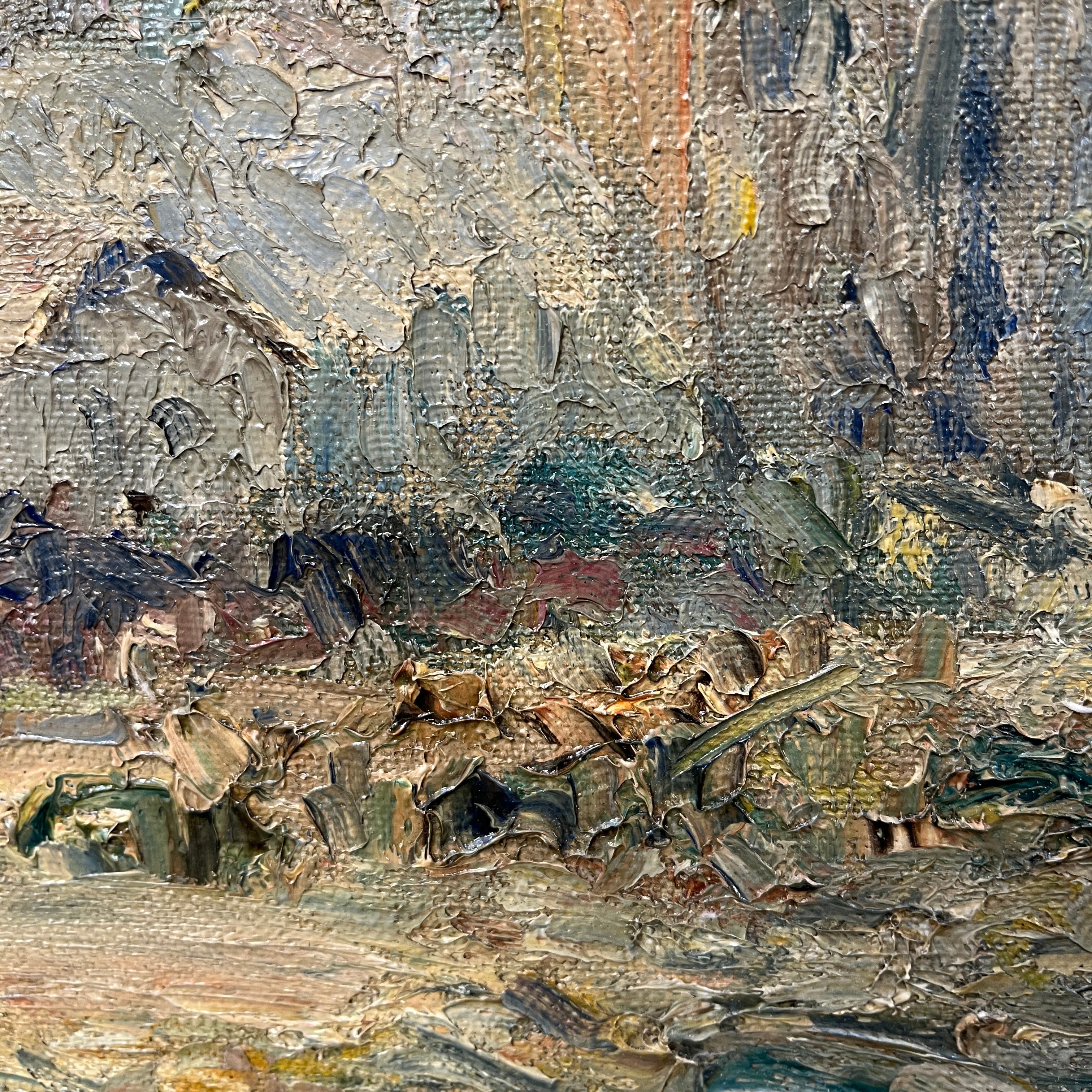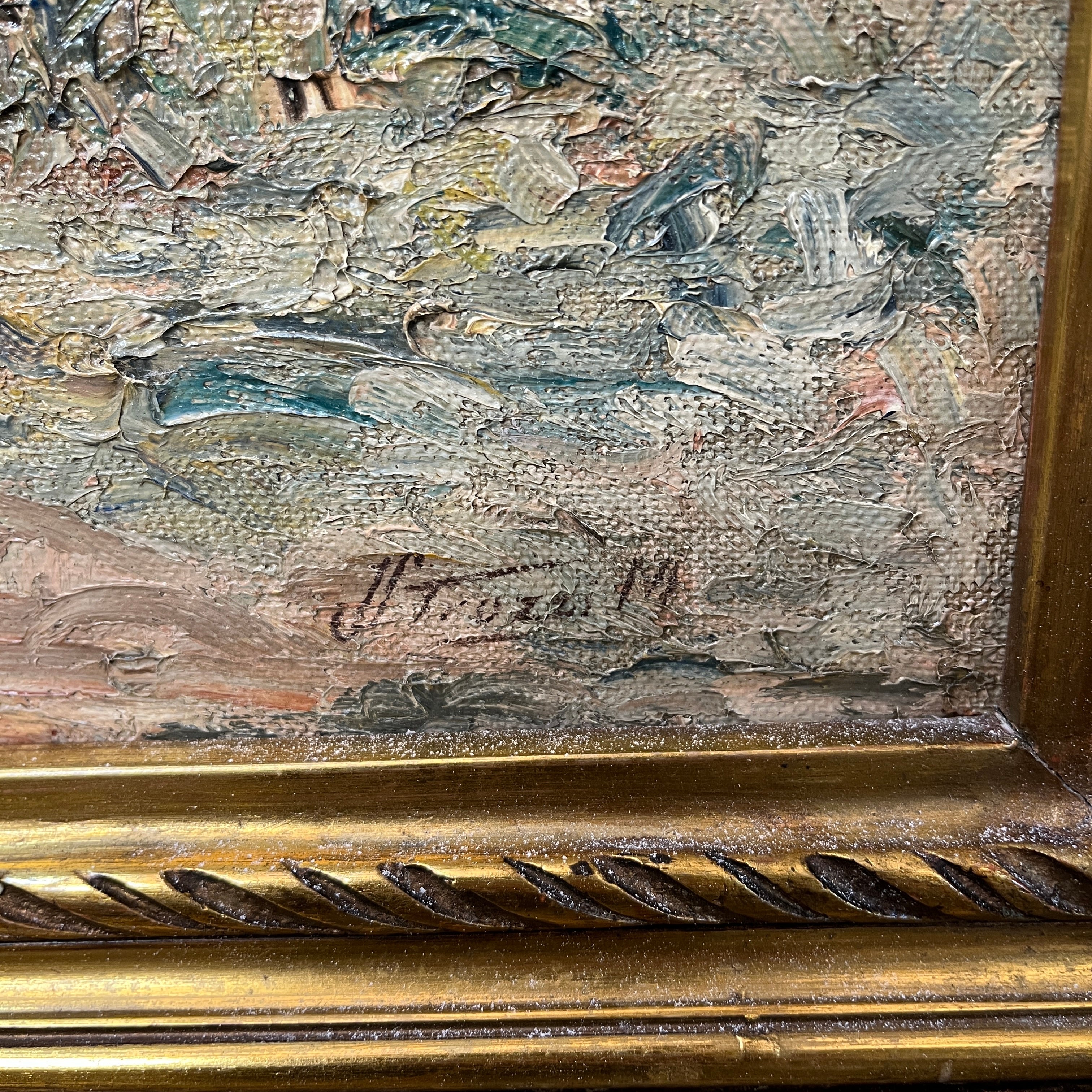 Óleo sobre tela del reconocido pintor chileno Luis Strozzi, representando un paisaje cordillerano en tonos de grises, verdes y azules, tocados por una luz anaranjada. Este trabajo de luz, que sugiere un atardecer, hace una composición muy sutil y llena de la textura de cada elemento representado. A los pies de la cordillera, una casita sencilla acompañada de un gran árbol. La obra está enmarcada en madera tallada en relieves y terminada de dorado.
