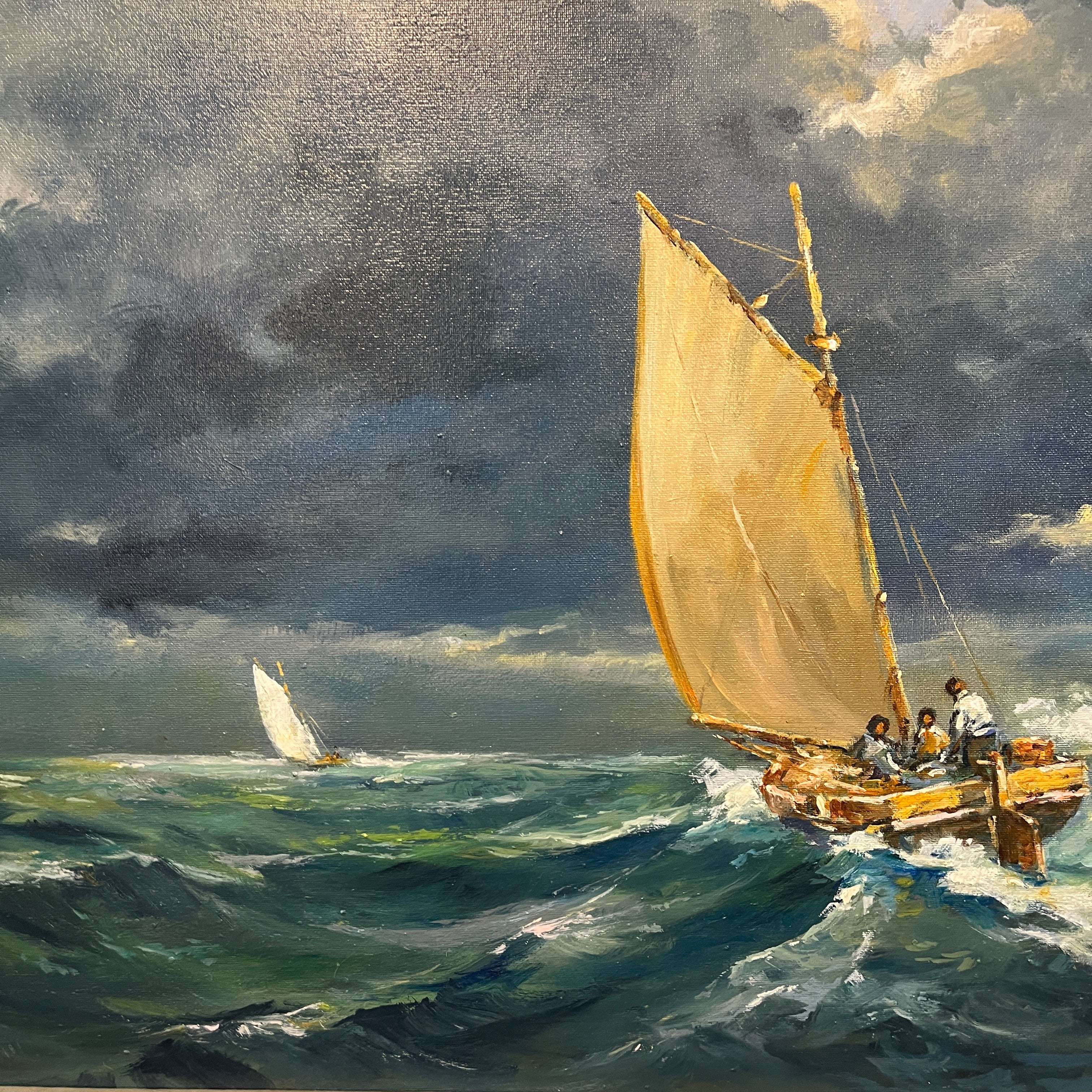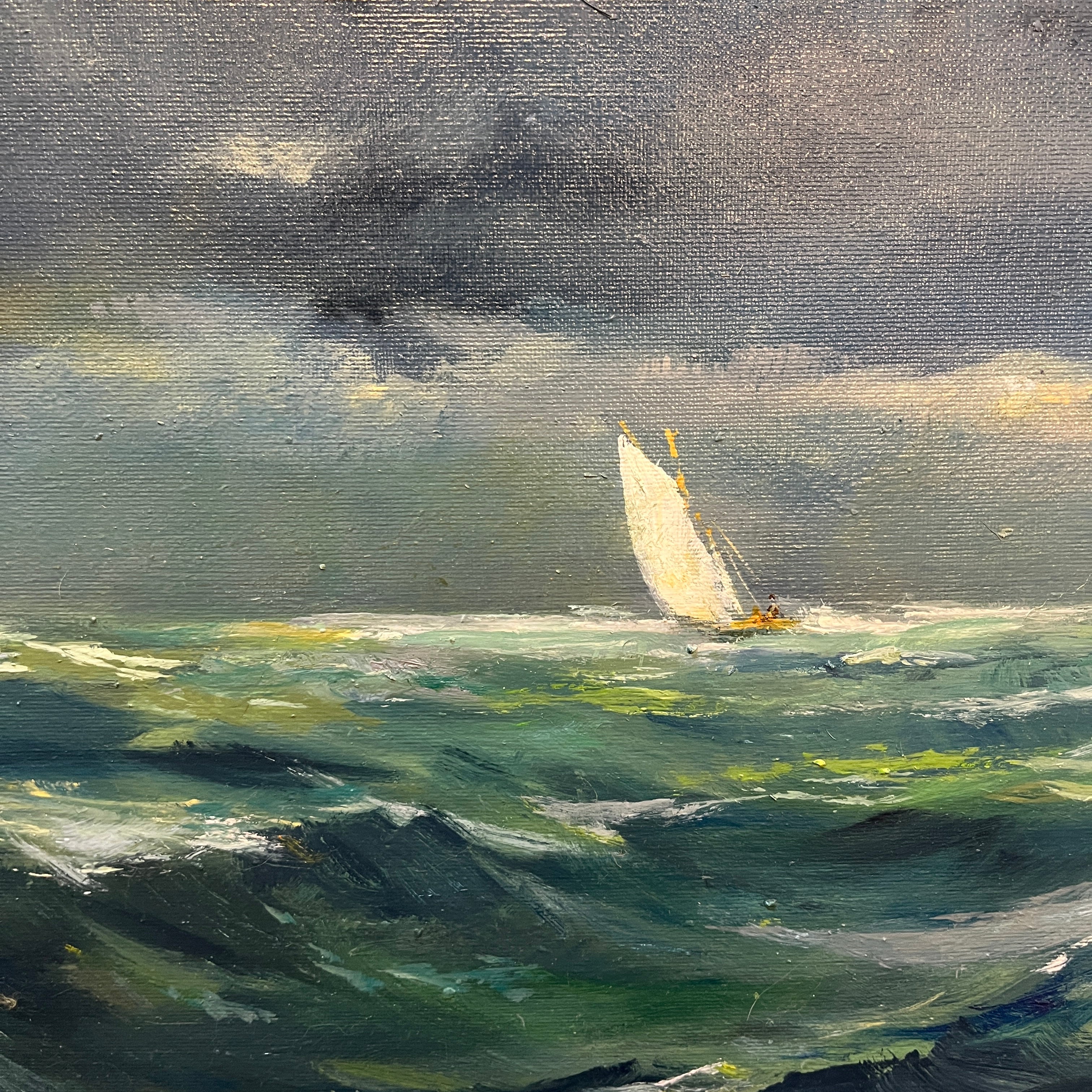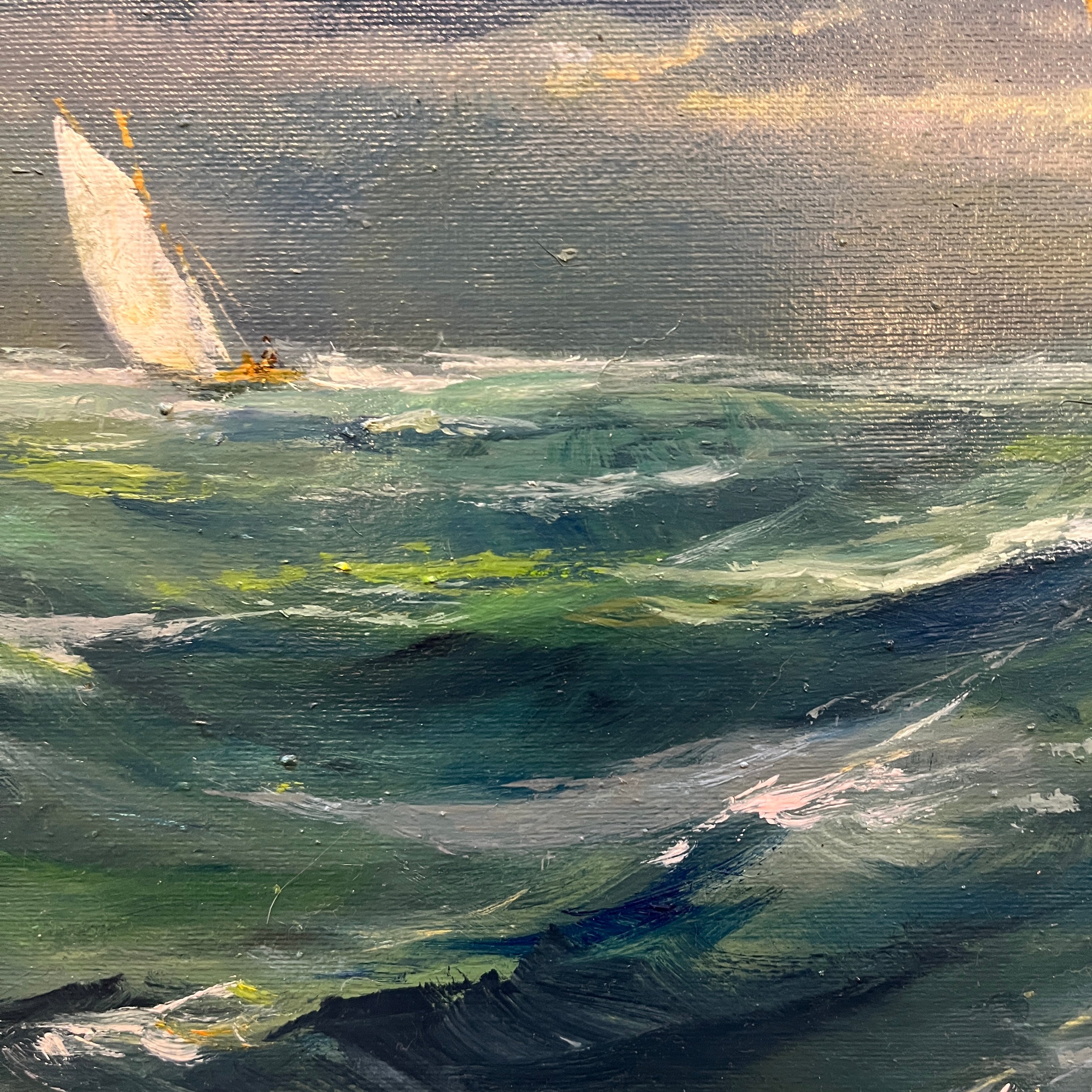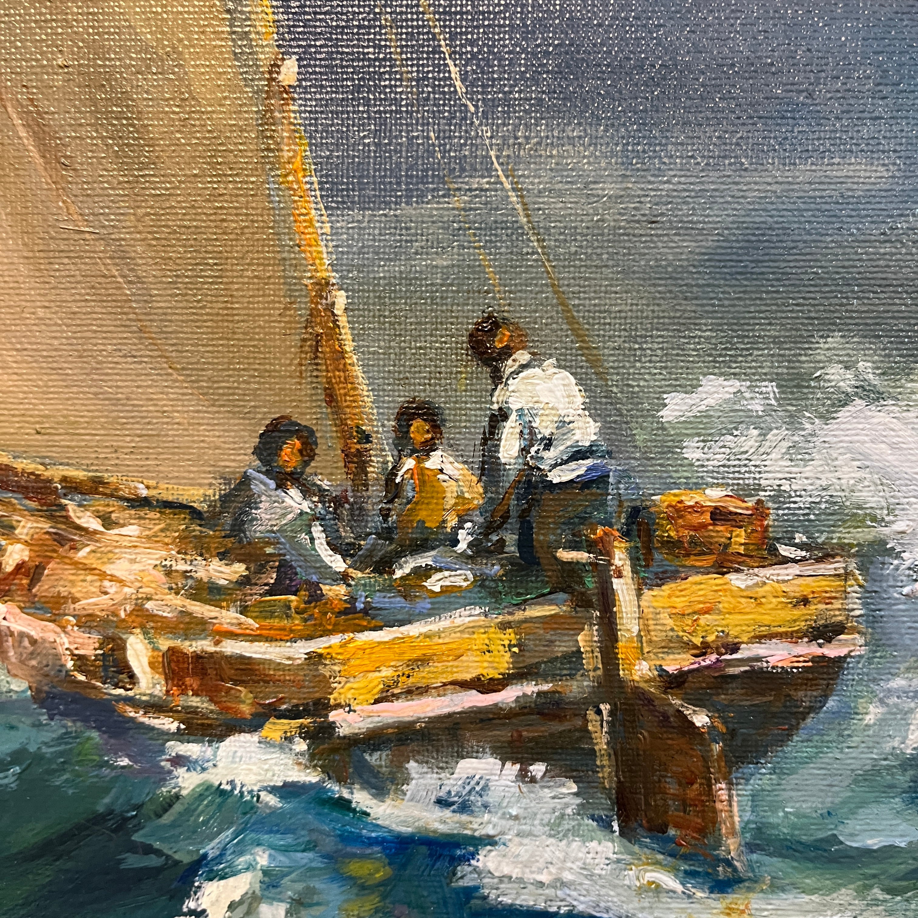Vibrante marina del reconocido artista chileno 'Manoly', que representa en este óleo la braveza de tres tripulantes de un velero esquivando la turbulencia con una sencilla embarcación. La obra logra transmitir cierta incertidumbre y a la vez reflejar el coraje de quienes se encuentran enfrentado la marejada. En un segundo plano podemos ver en el horizonte otro velero también navegando.