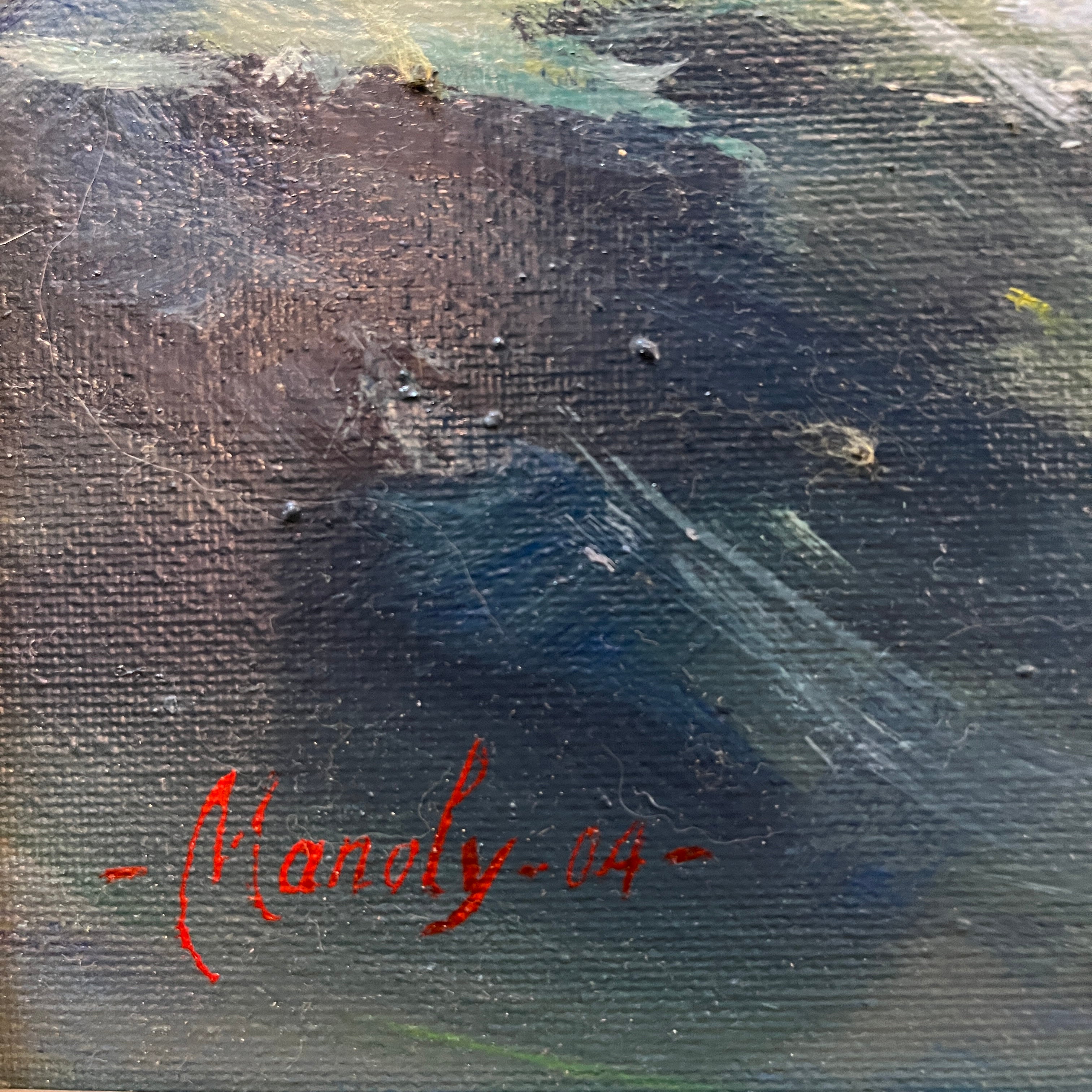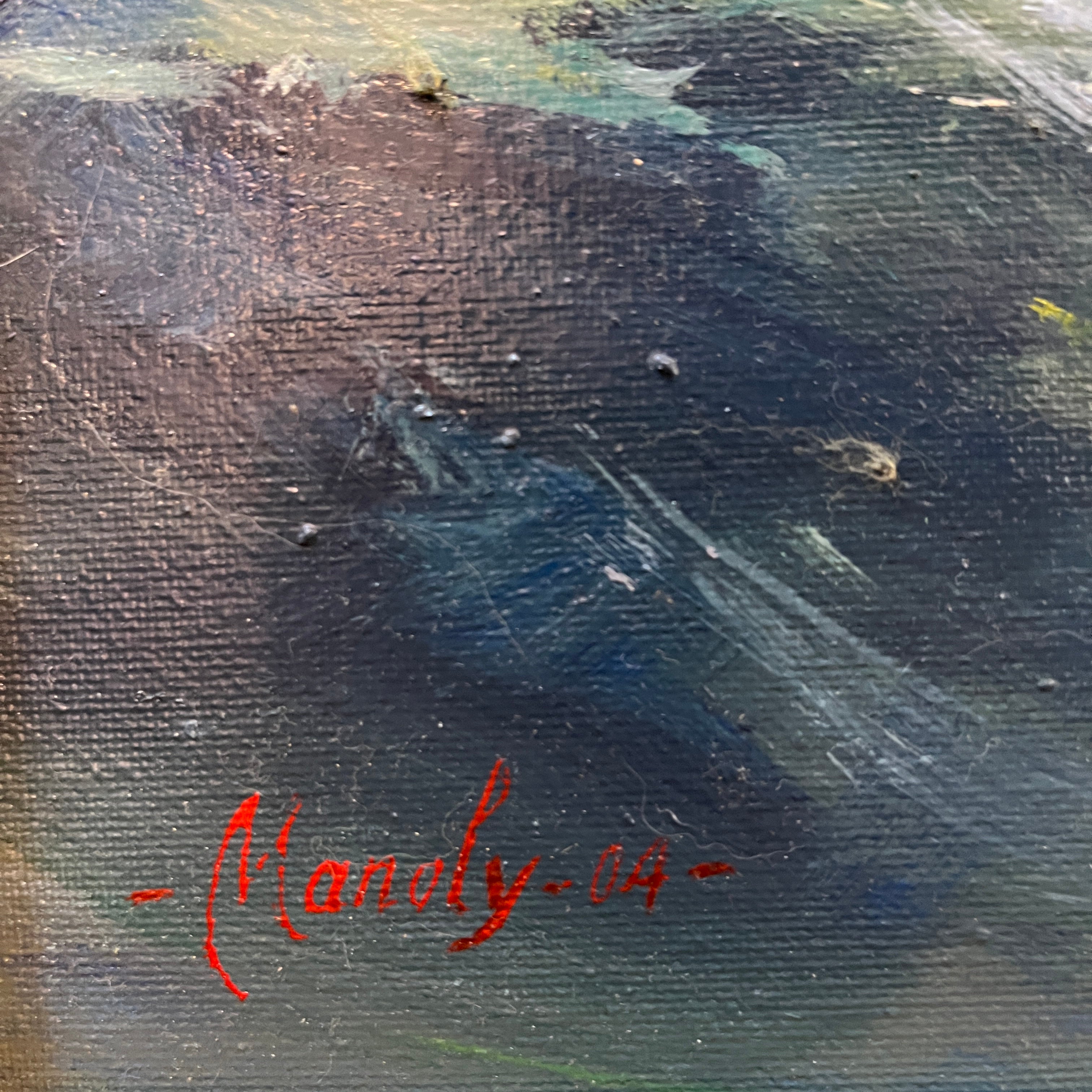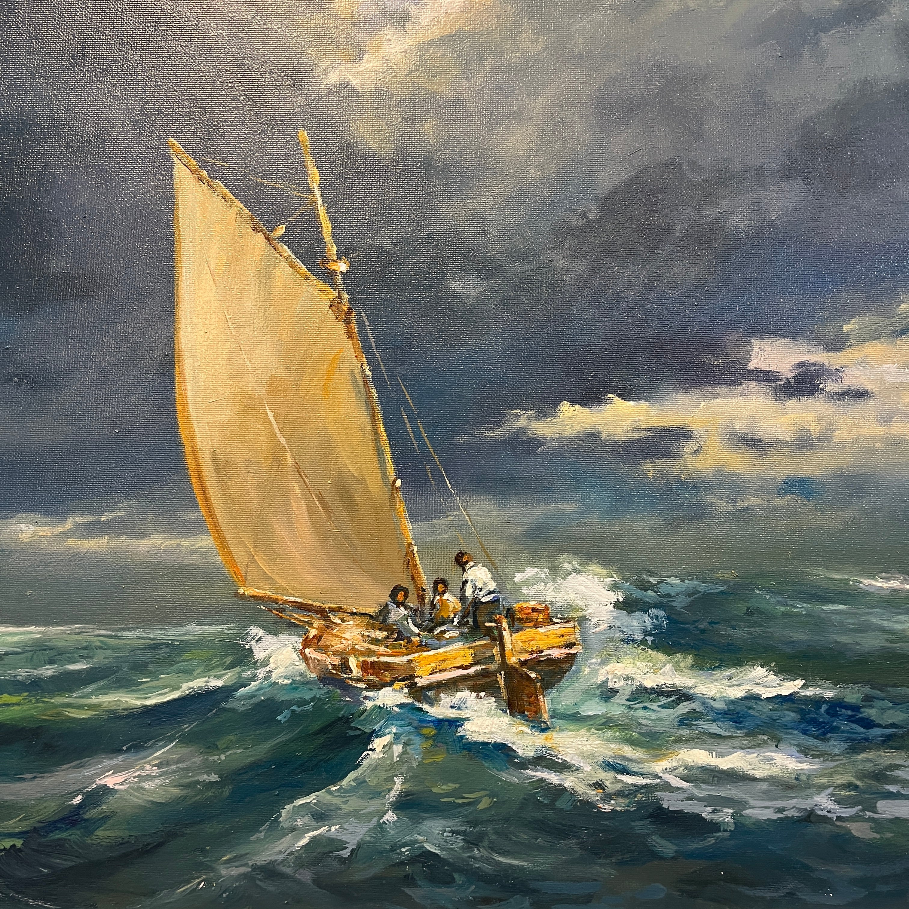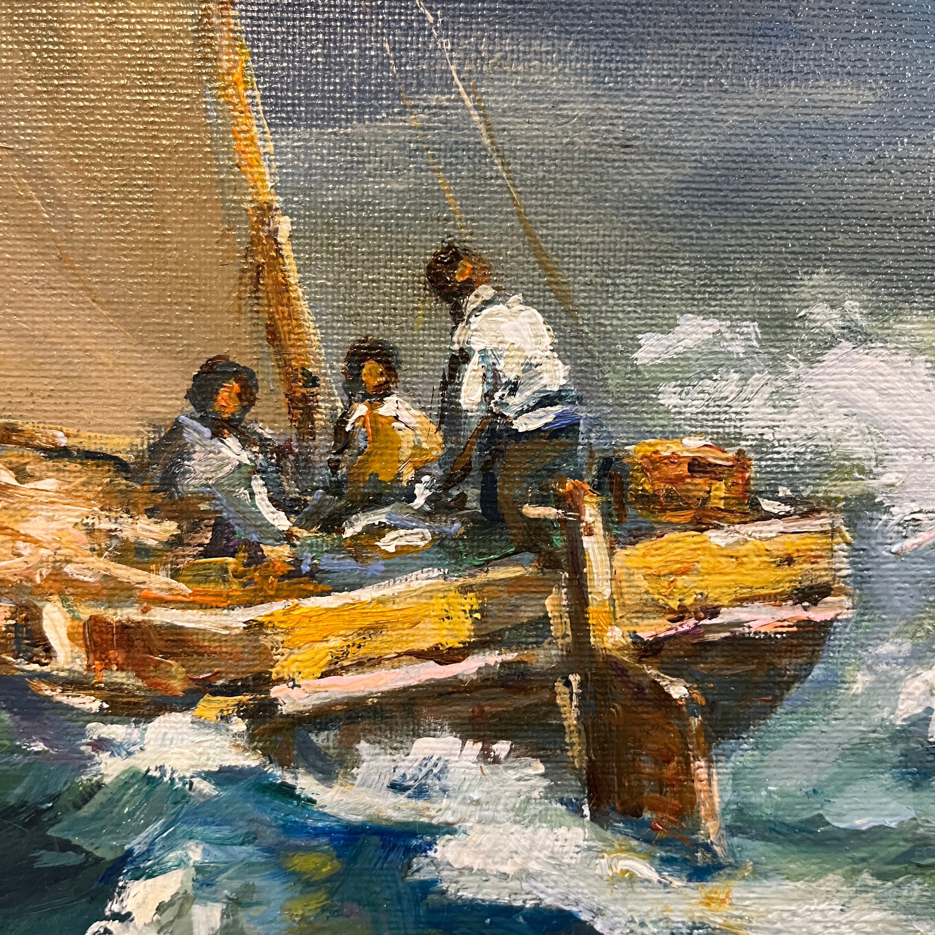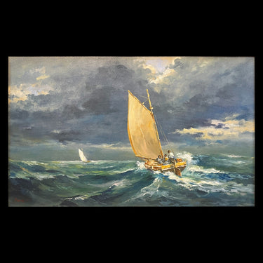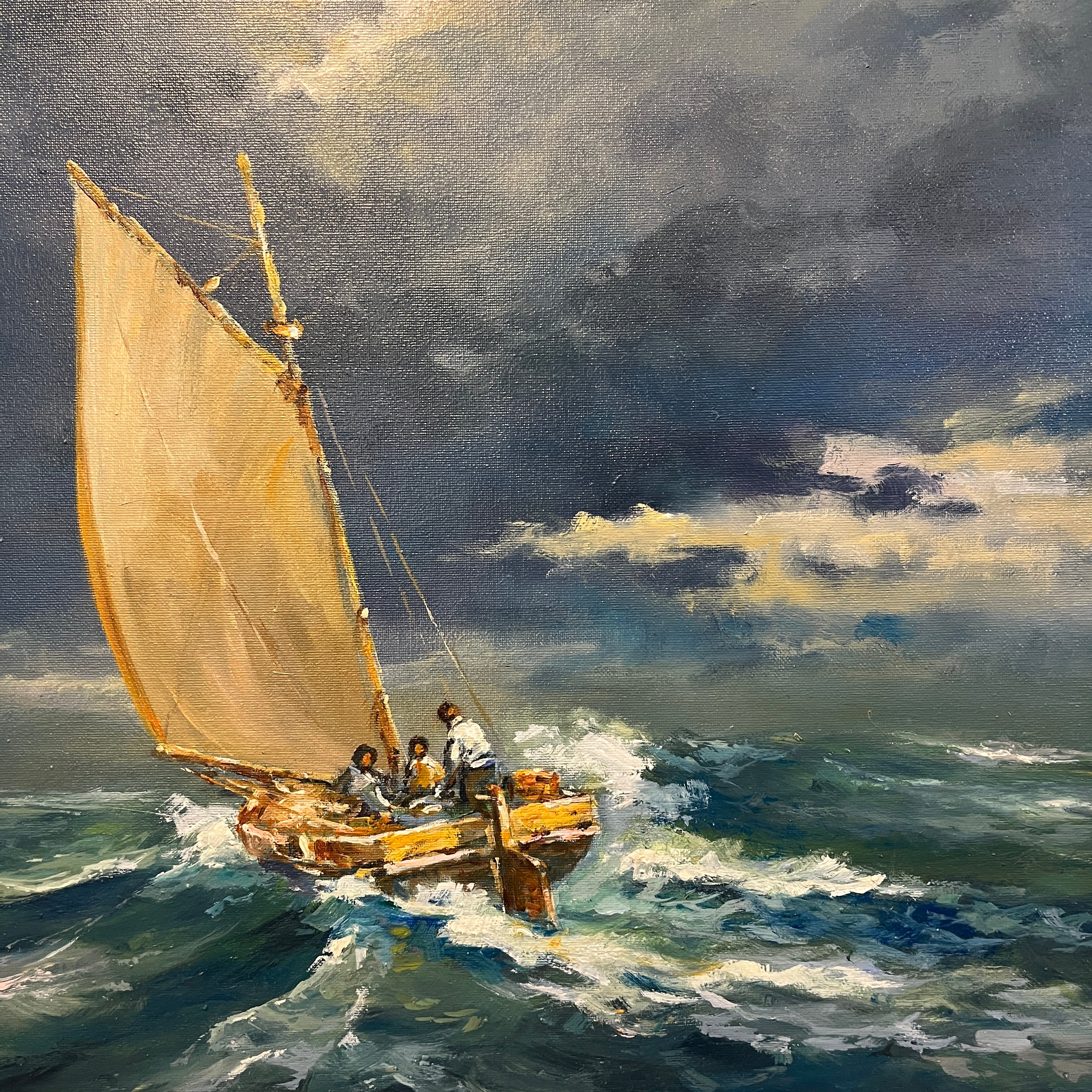 Vibrante marina del reconocido artista chileno 'Manoly', que representa en este óleo la braveza de tres tripulantes de un velero esquivando la turbulencia con una sencilla embarcación. La obra logra transmitir cierta incertidumbre y a la vez reflejar el coraje de quienes se encuentran enfrentado la marejada. En un segundo plano podemos ver en el horizonte otro velero también navegando.
