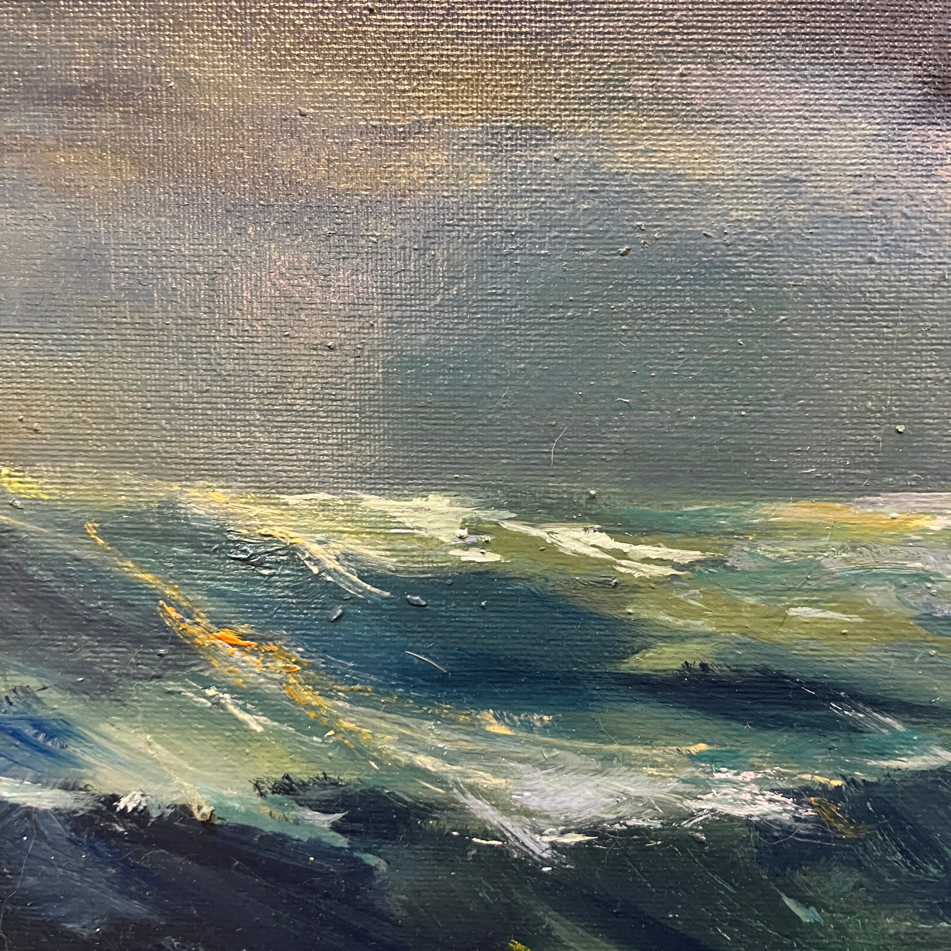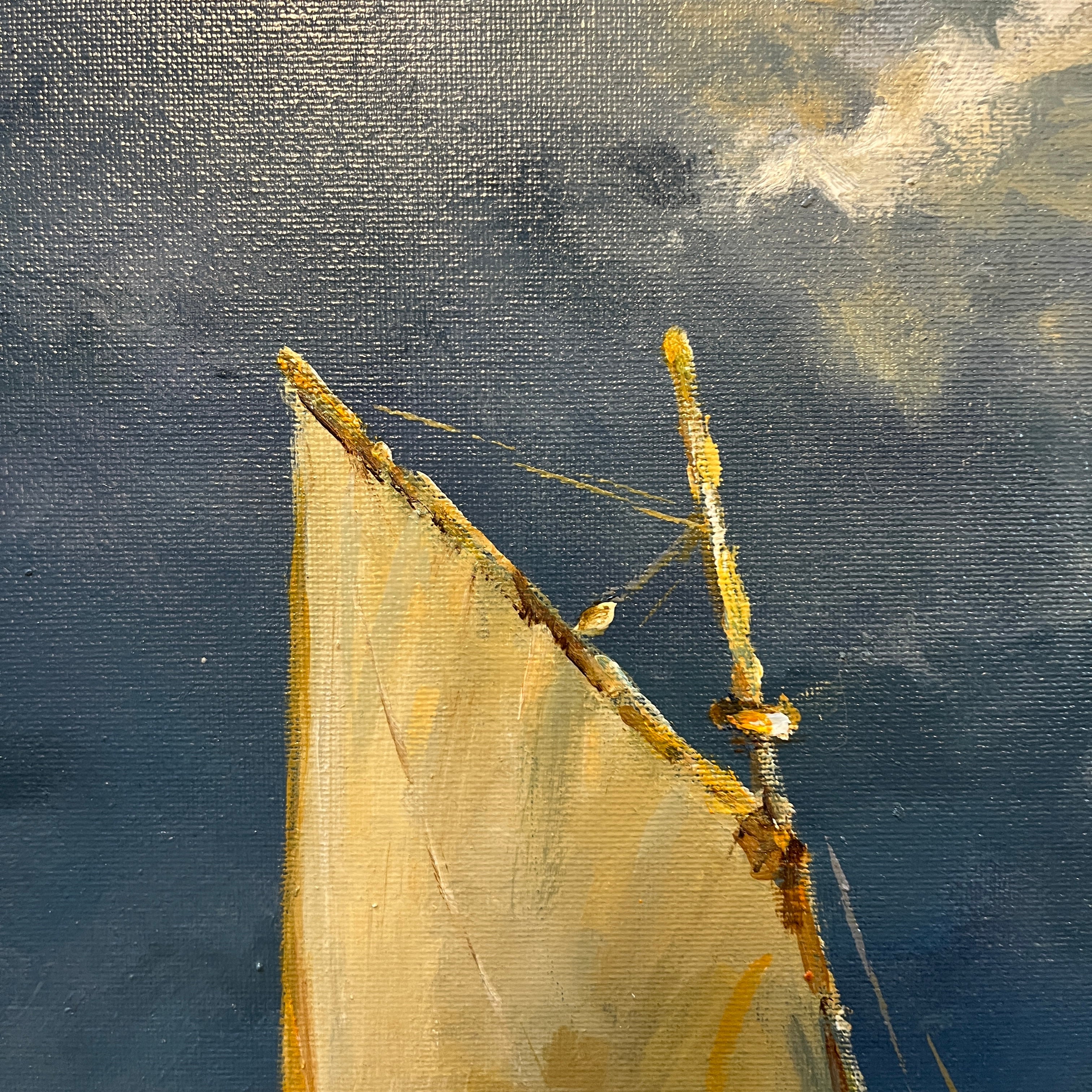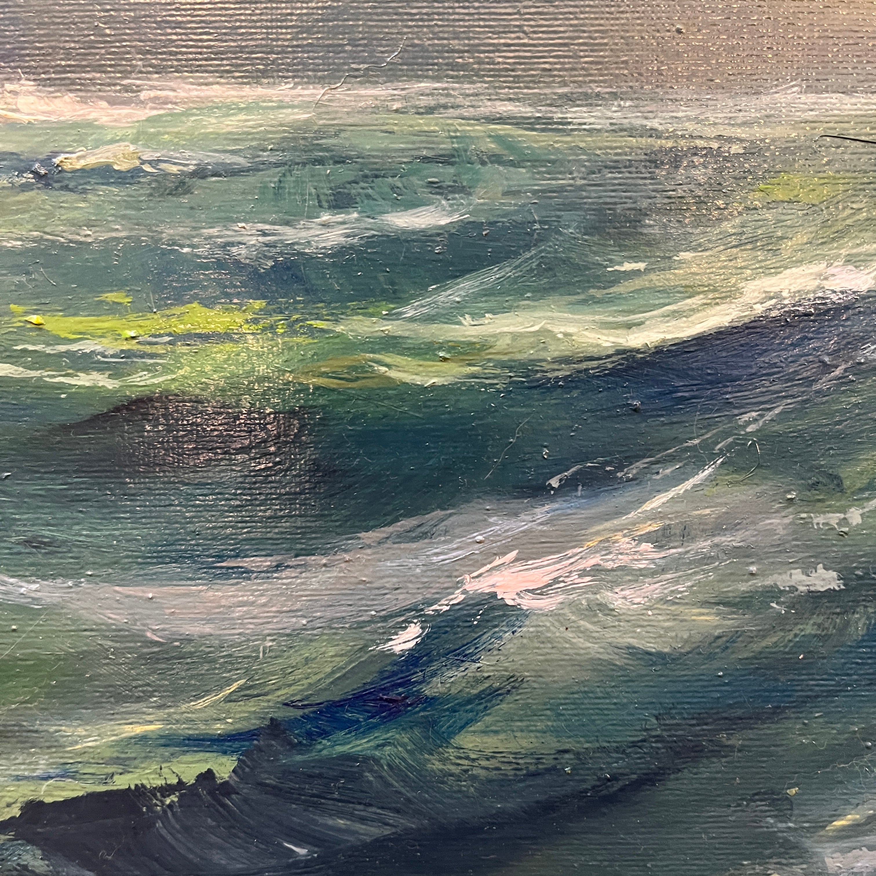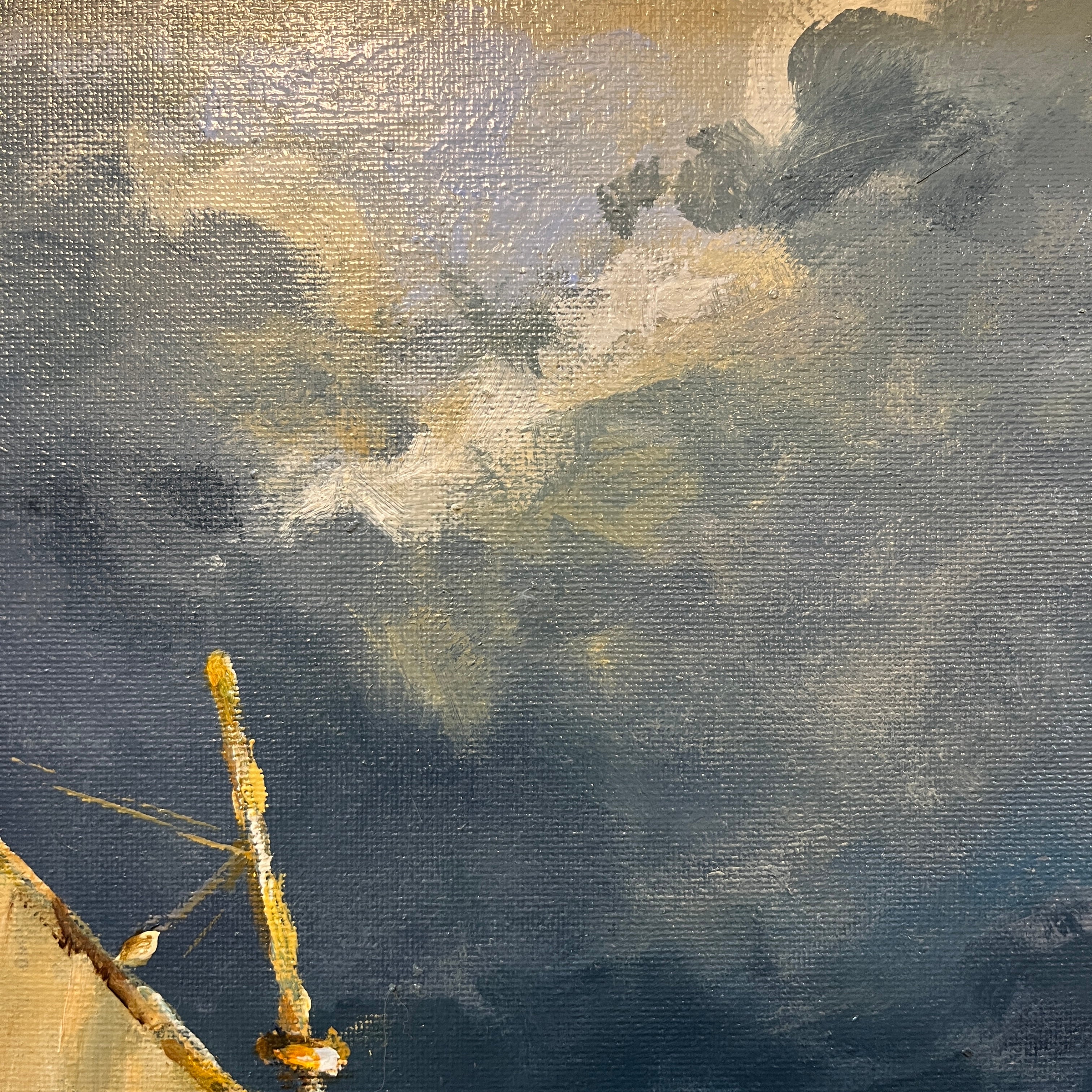 Vibrante marina del reconocido artista chileno 'Manoly', que representa en este óleo la braveza de tres tripulantes de un velero esquivando la turbulencia con una sencilla embarcación. La obra logra transmitir cierta incertidumbre y a la vez reflejar el coraje de quienes se encuentran enfrentado la marejada. En un segundo plano podemos ver en el horizonte otro velero también navegando.