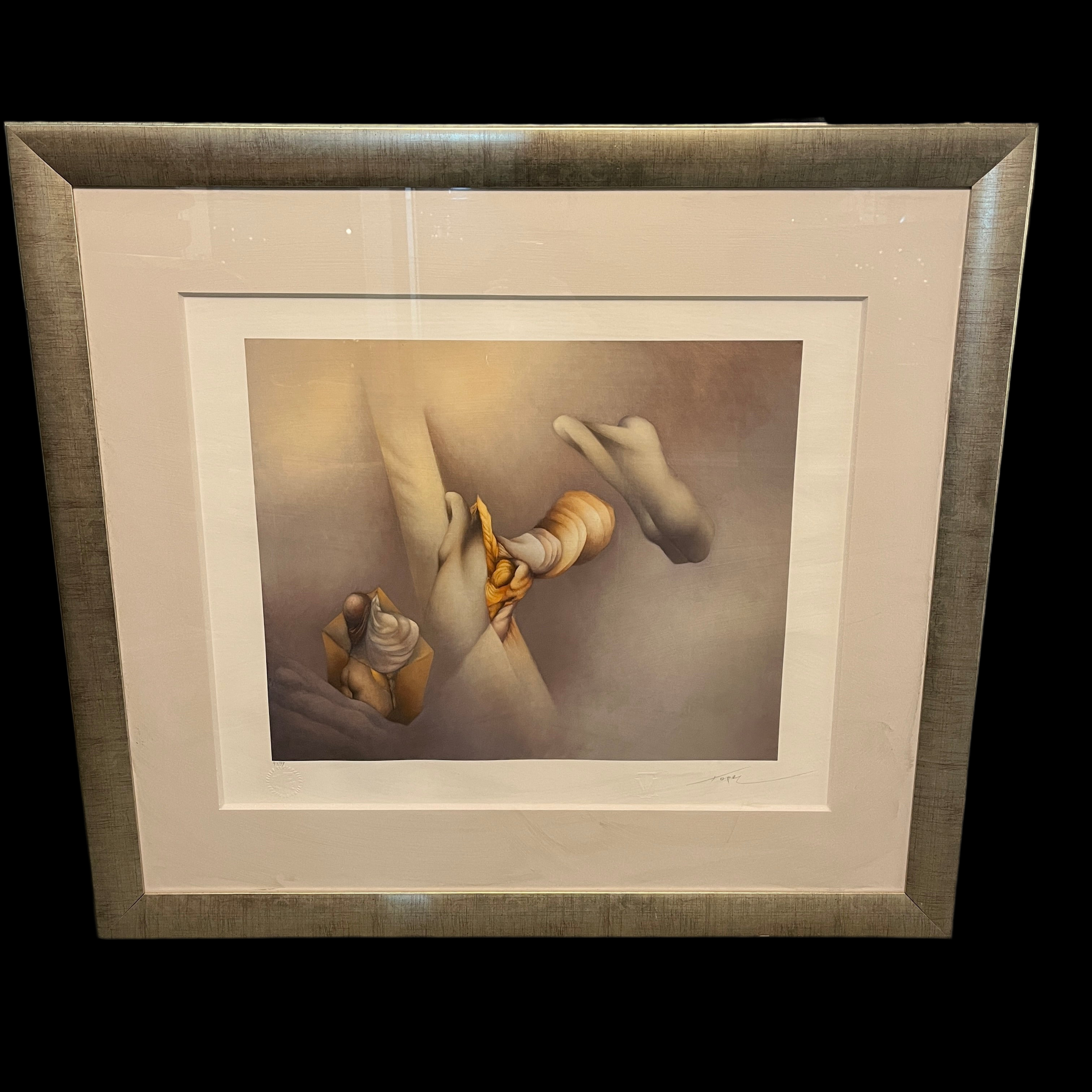 Grabado digital en técnica Giclée sobre papel de algodón, del reconocido artista nacional Mario Toral titulada ‘En el Espacio’. Firmada a mano y numerado. Ejemplar 94/99. La obra, con las reconocibles temáticas y formas del artista, muestra abstracciones de la figura humana entremezcladas con elementos geométricos, de color amarillo y dorado, suspendidos en un espacio gris. La obra tiene un marco de madera de color plateado.