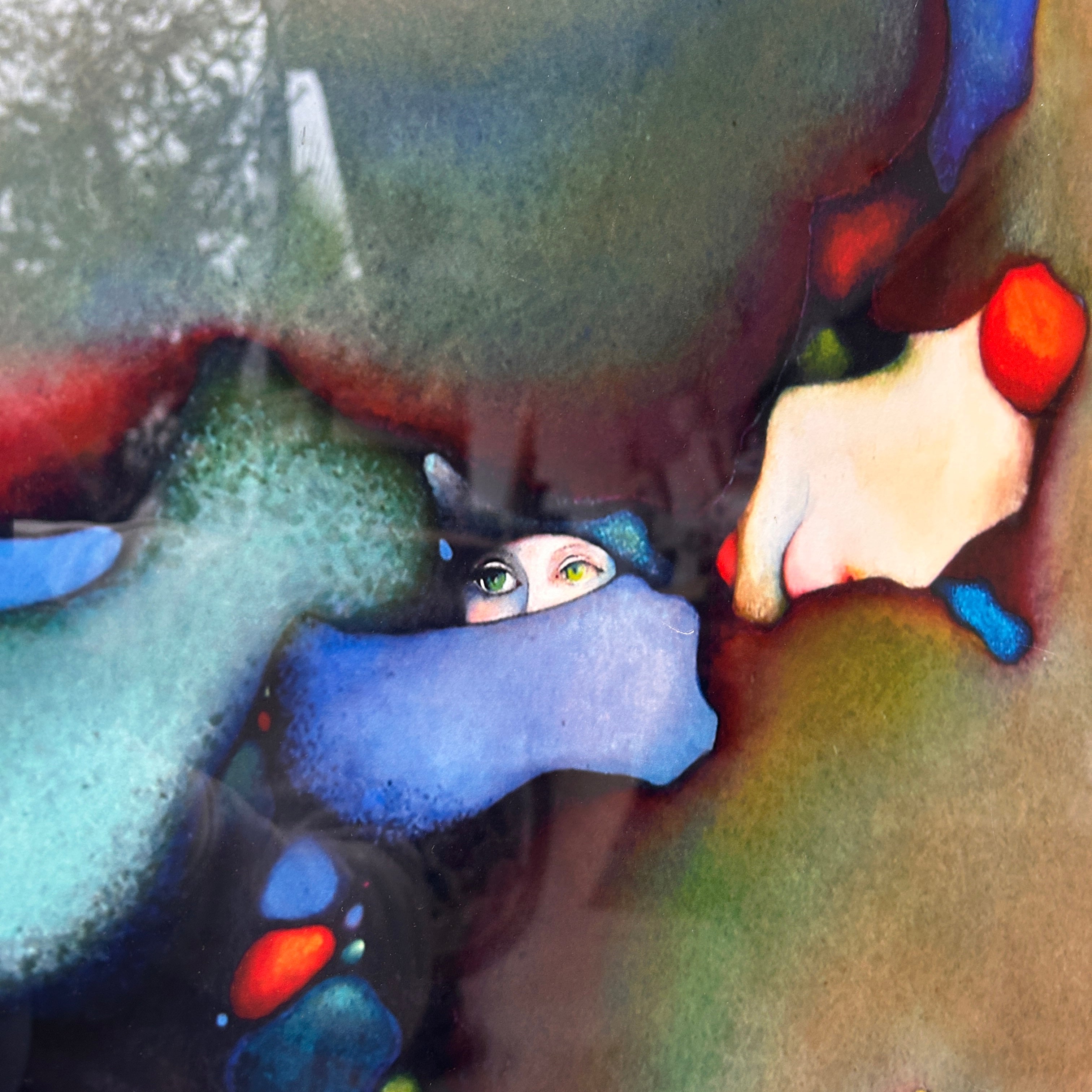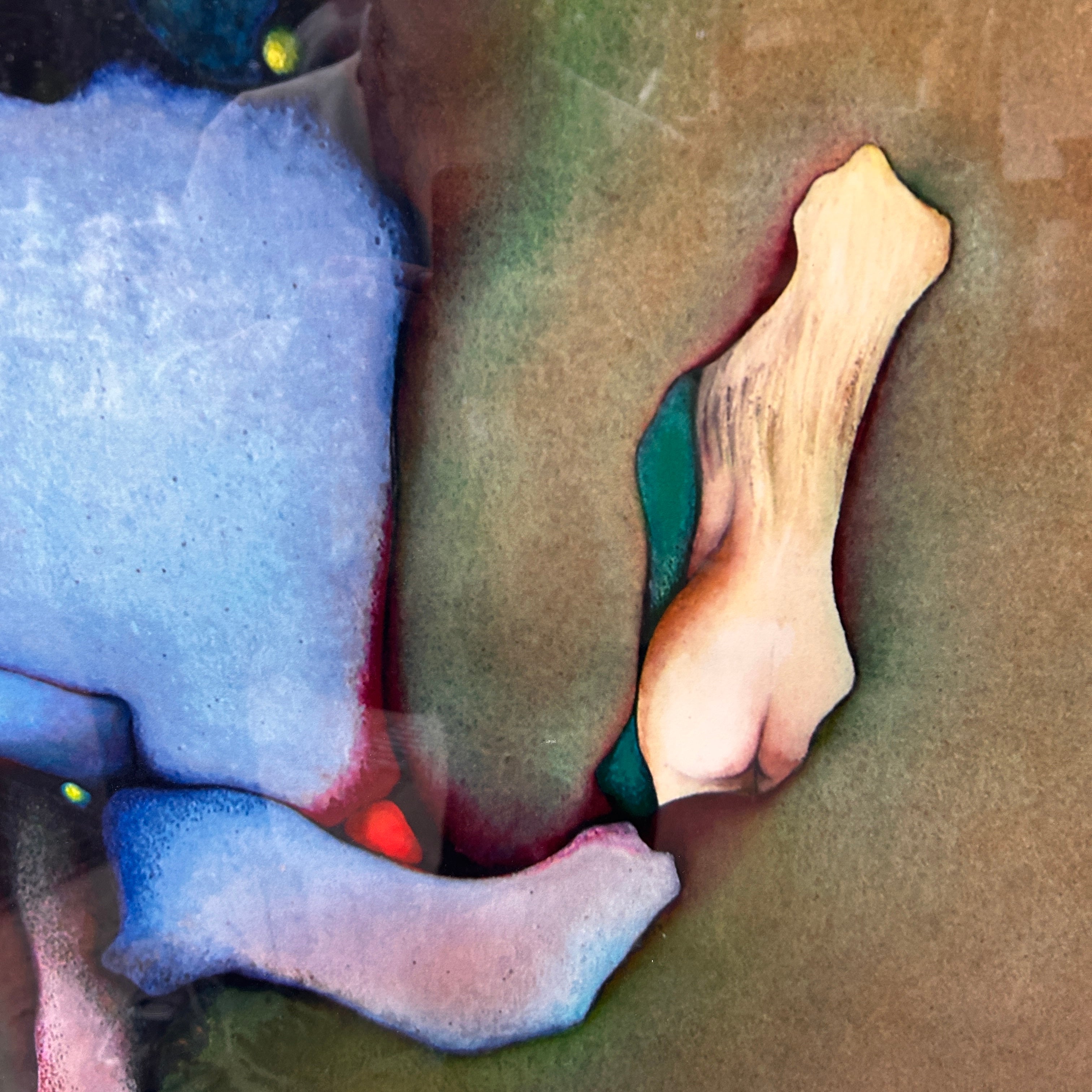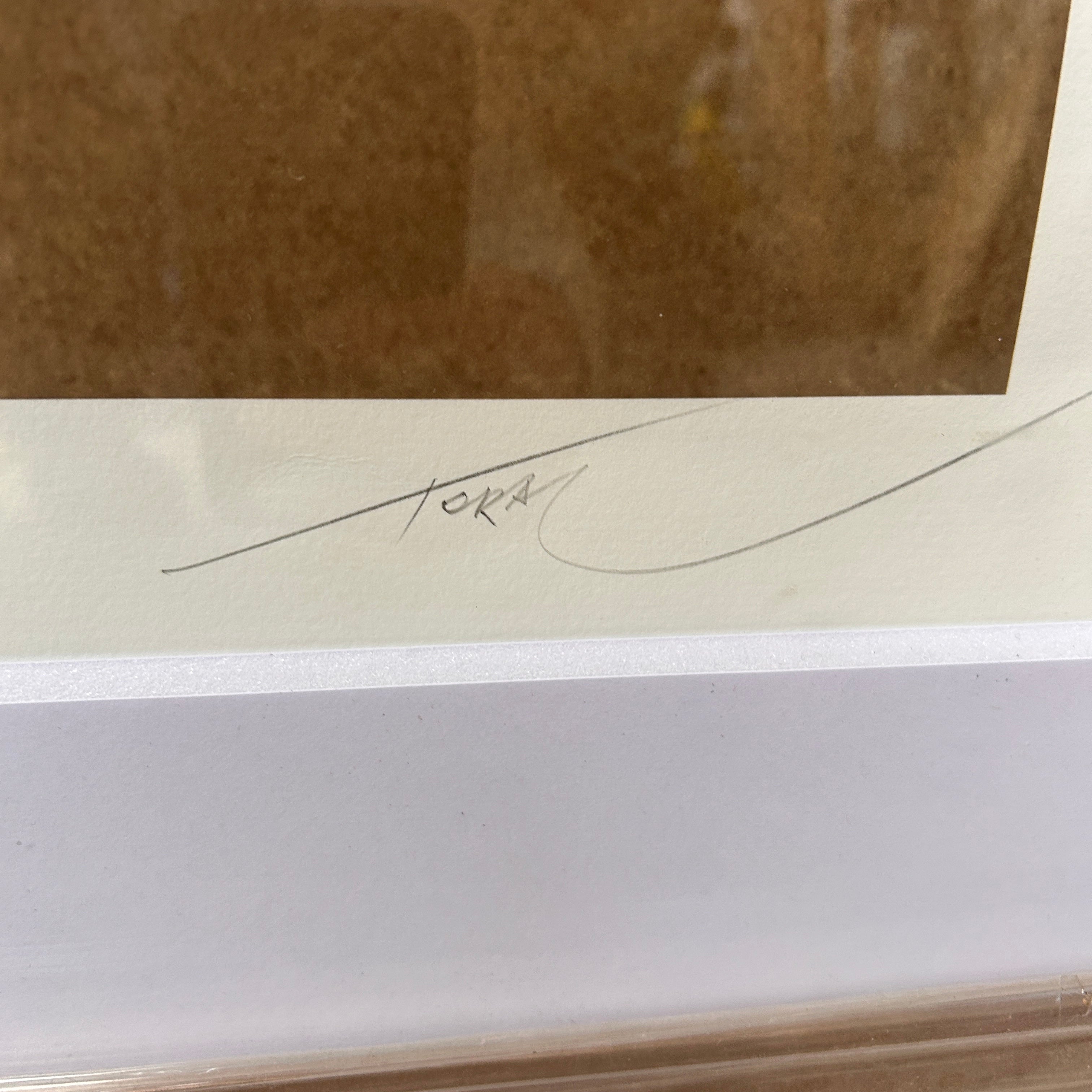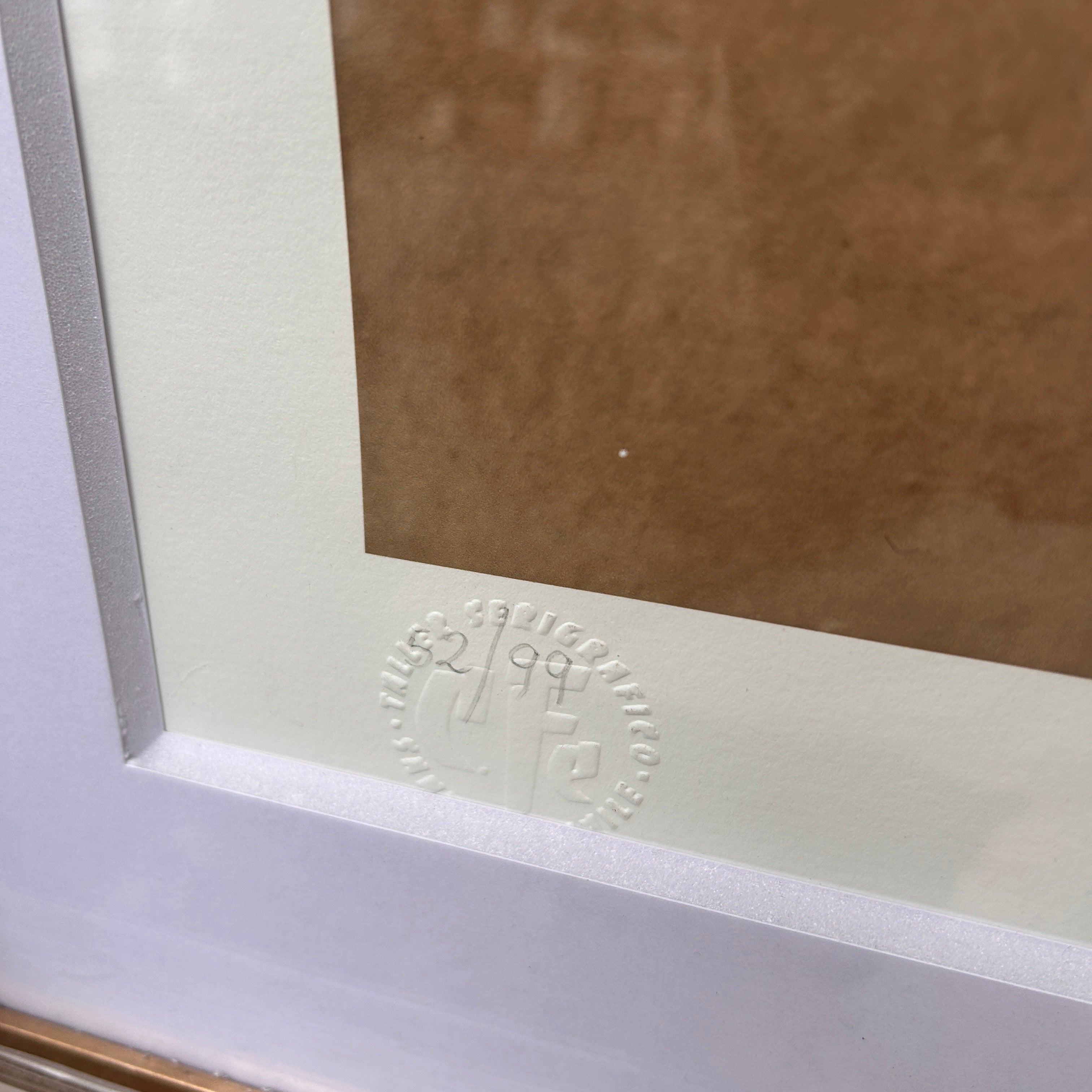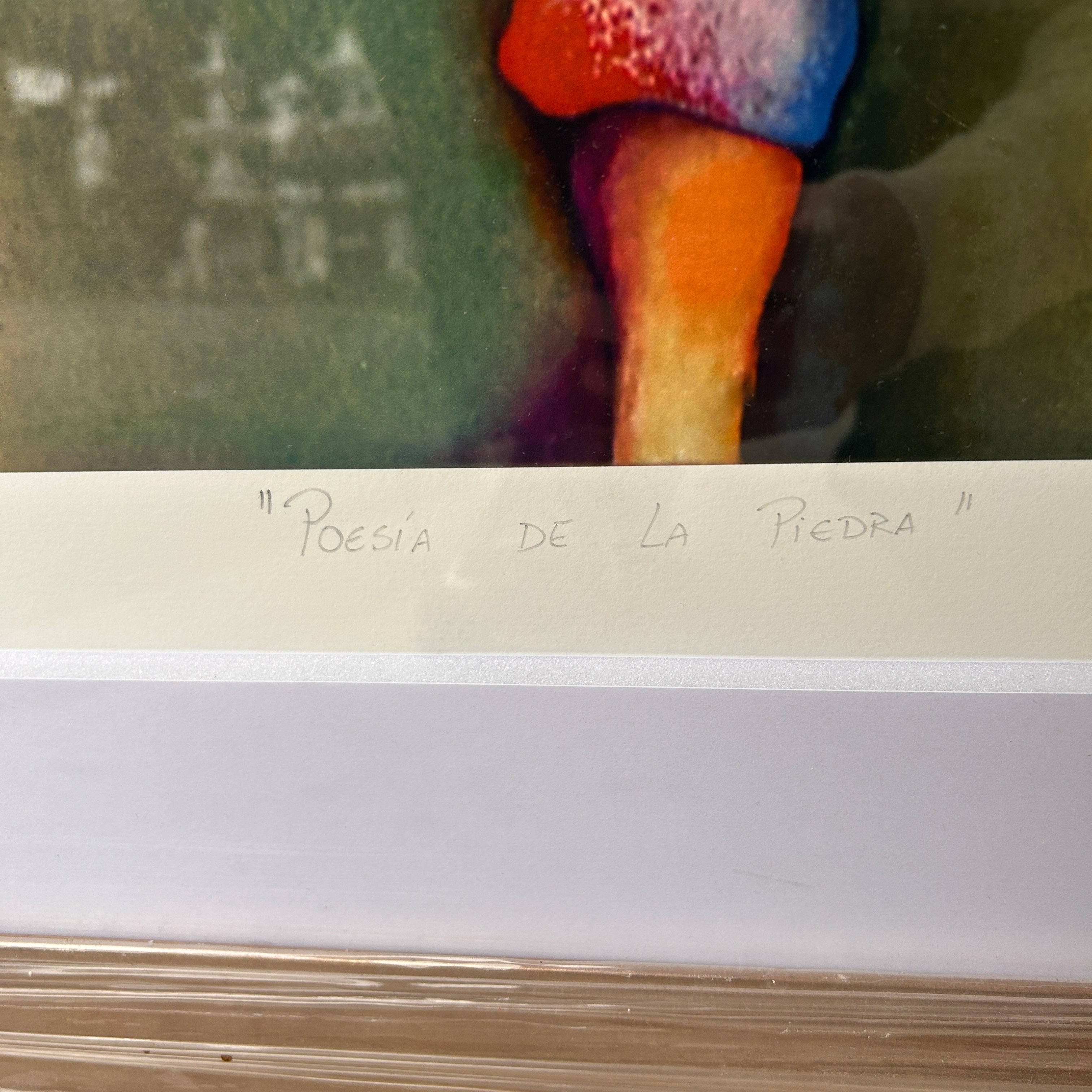 Impresión de alta calidad técnica Gicleé del reconocido artista chileno Mario Toral, titulada ‘Poesía sobre la Piedra’. La obra está firmada y numerada como el ejemplar 52/99, con el sello de autentificación del taller del artista y editada por A. Bascuñán. La obra mezcla abstracción y figura, mostrando un desnudo femenino fragmentado que emerge entre formas abstractas en tonos azules, verdes y rojos, sobre un fondo café. La obra tiene un marco contemporáneo de un sutil dorado. En buen estado.