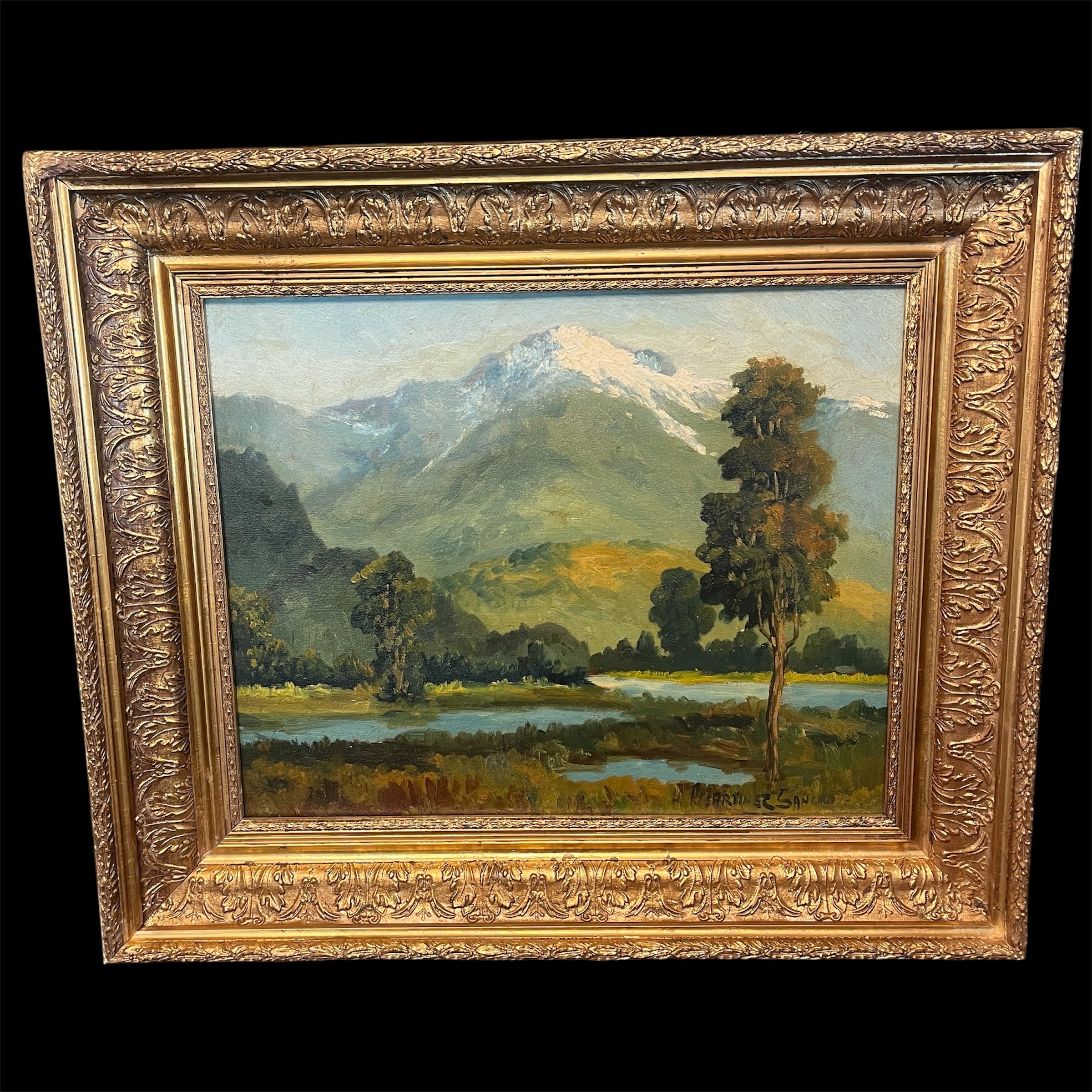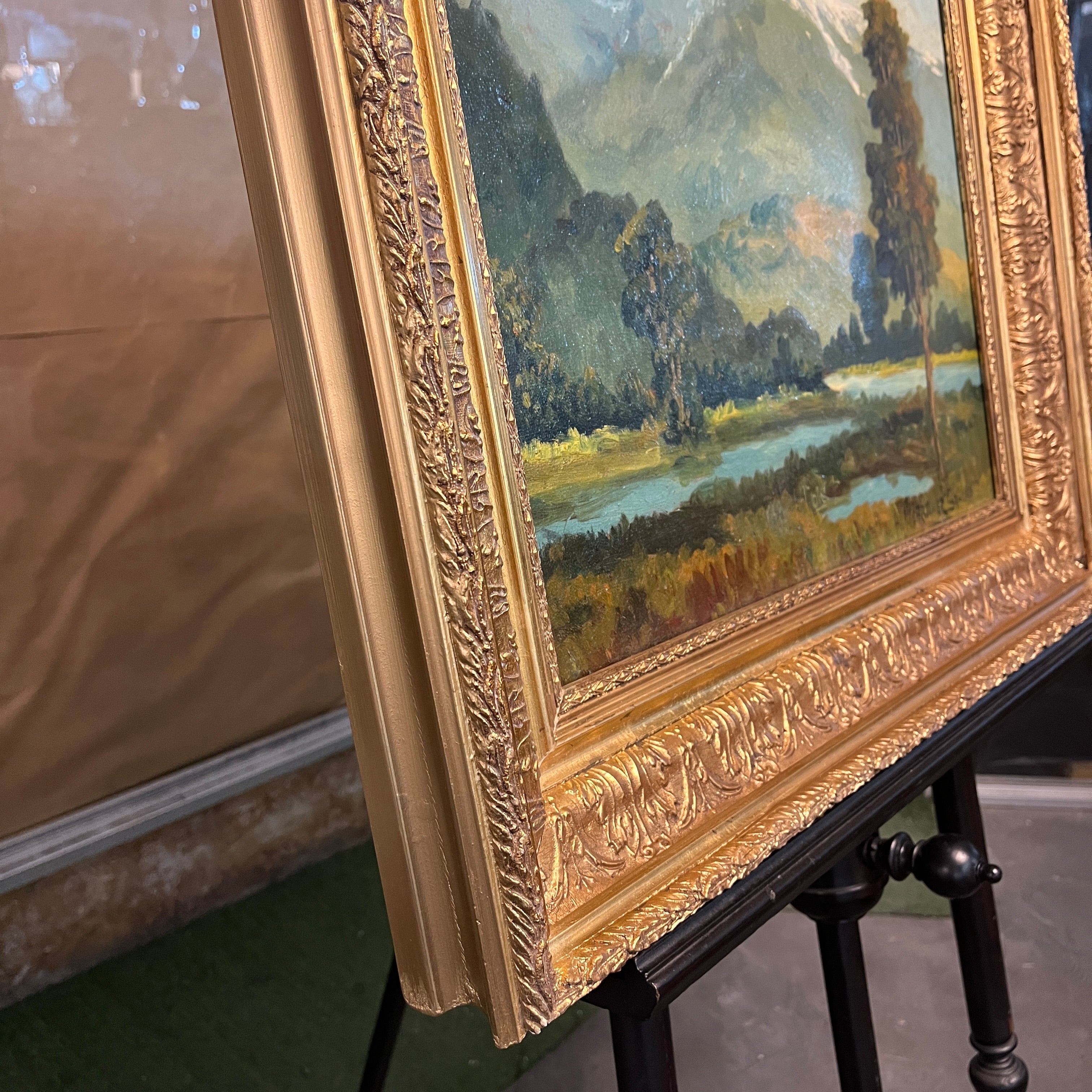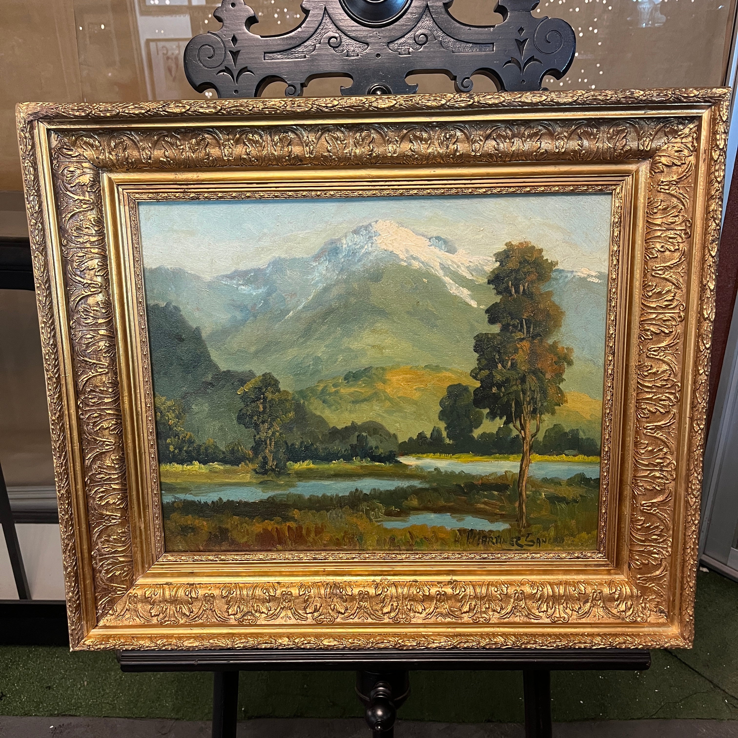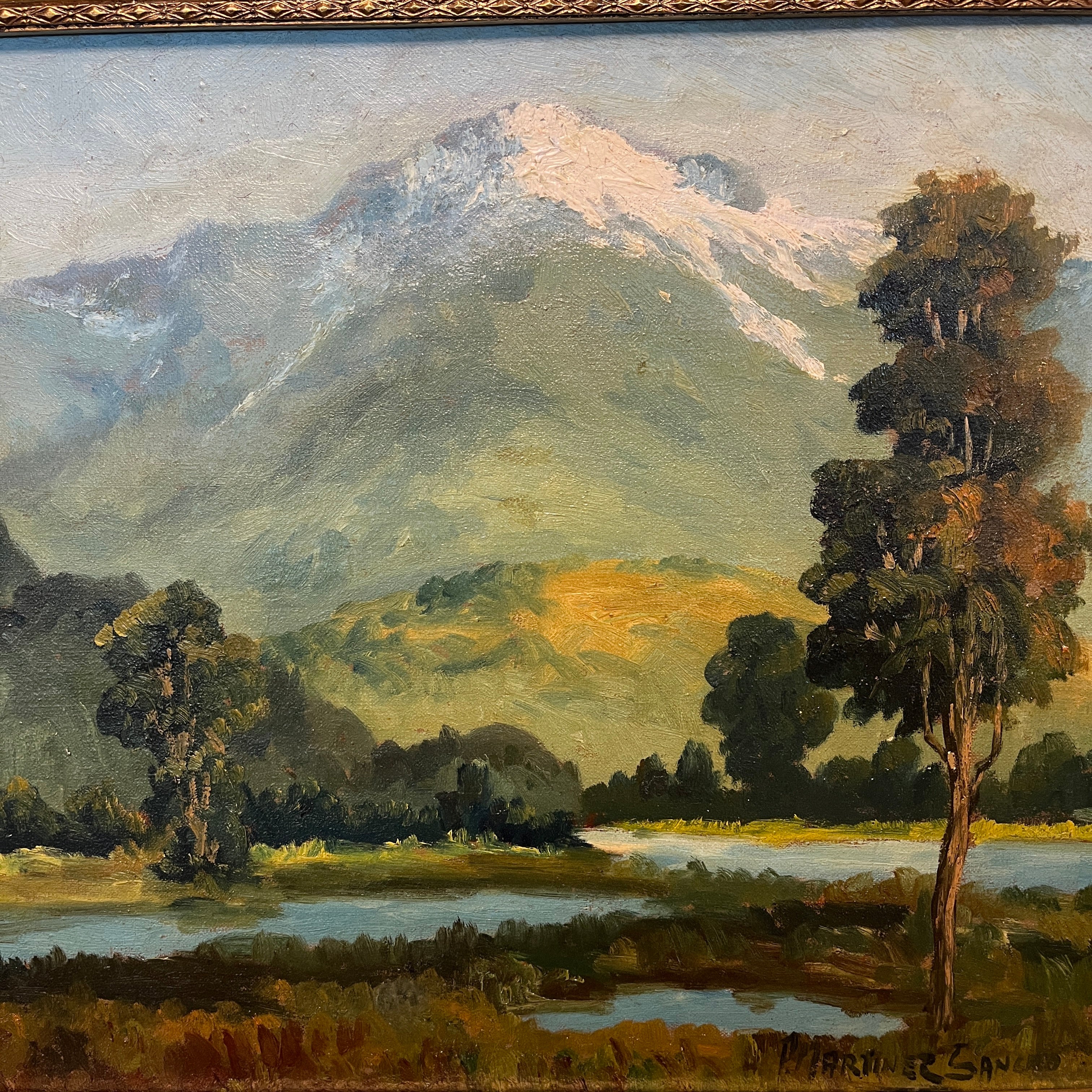 Óleo sobre tela del pintor catalán Martínez Sancho, representando un paisaje cordillerano, con un bello trabajo, de luces y profundidad en los tonos verdes y azules, que hacen apreciar la vegetación y el agua, con la majestuosa montaña en el horizonte. La obra está enmarcada en madera tallada en relieves y terminada en elegante dorado.