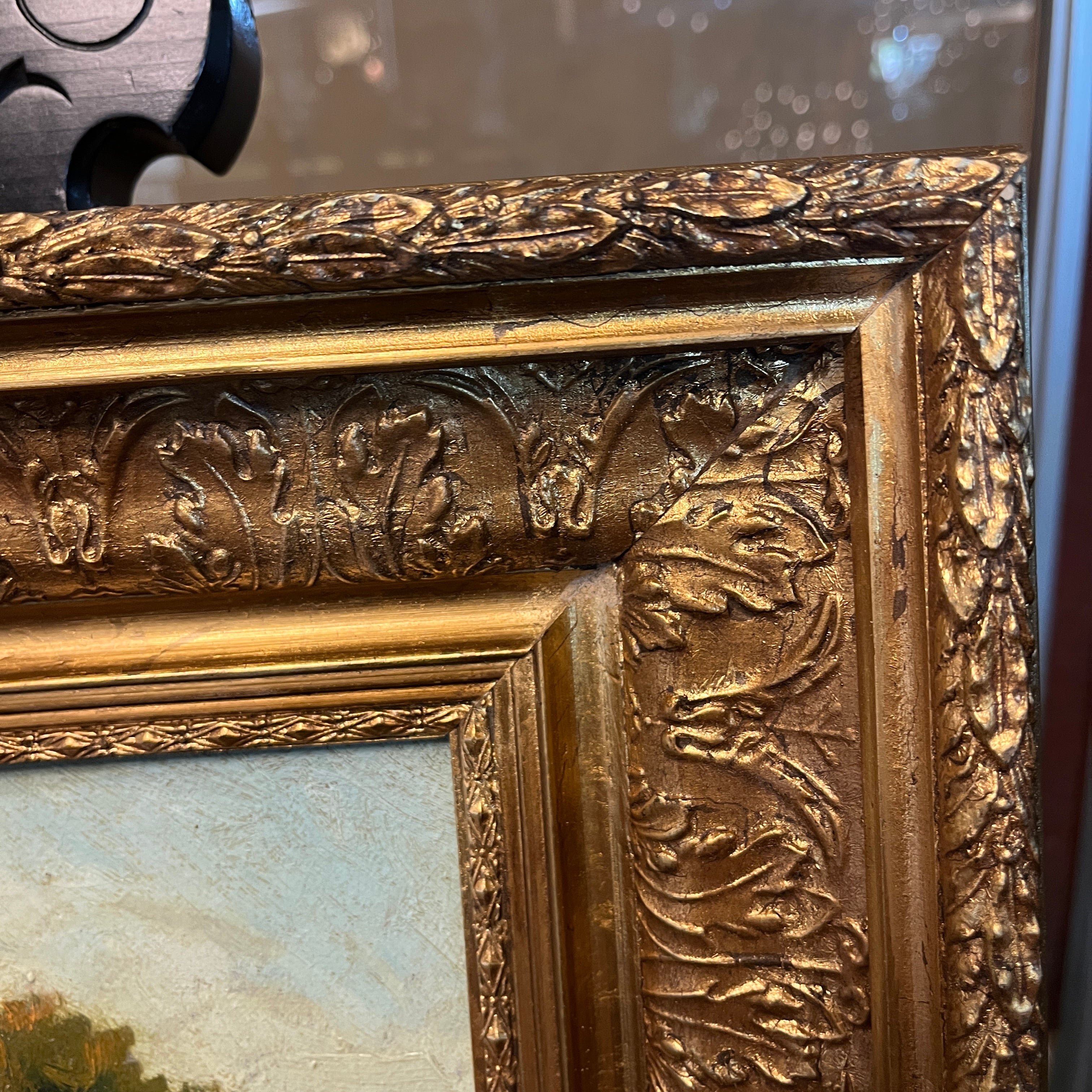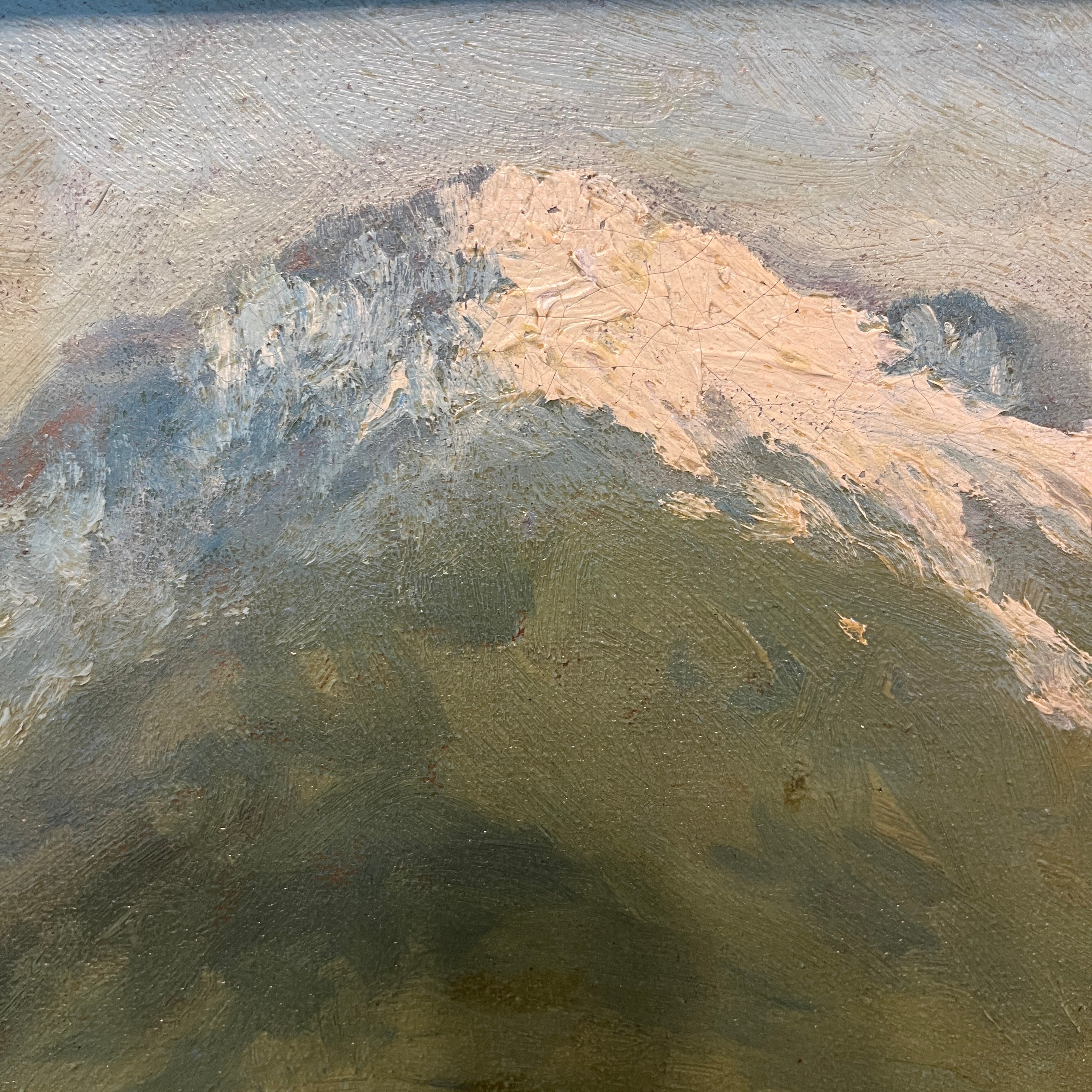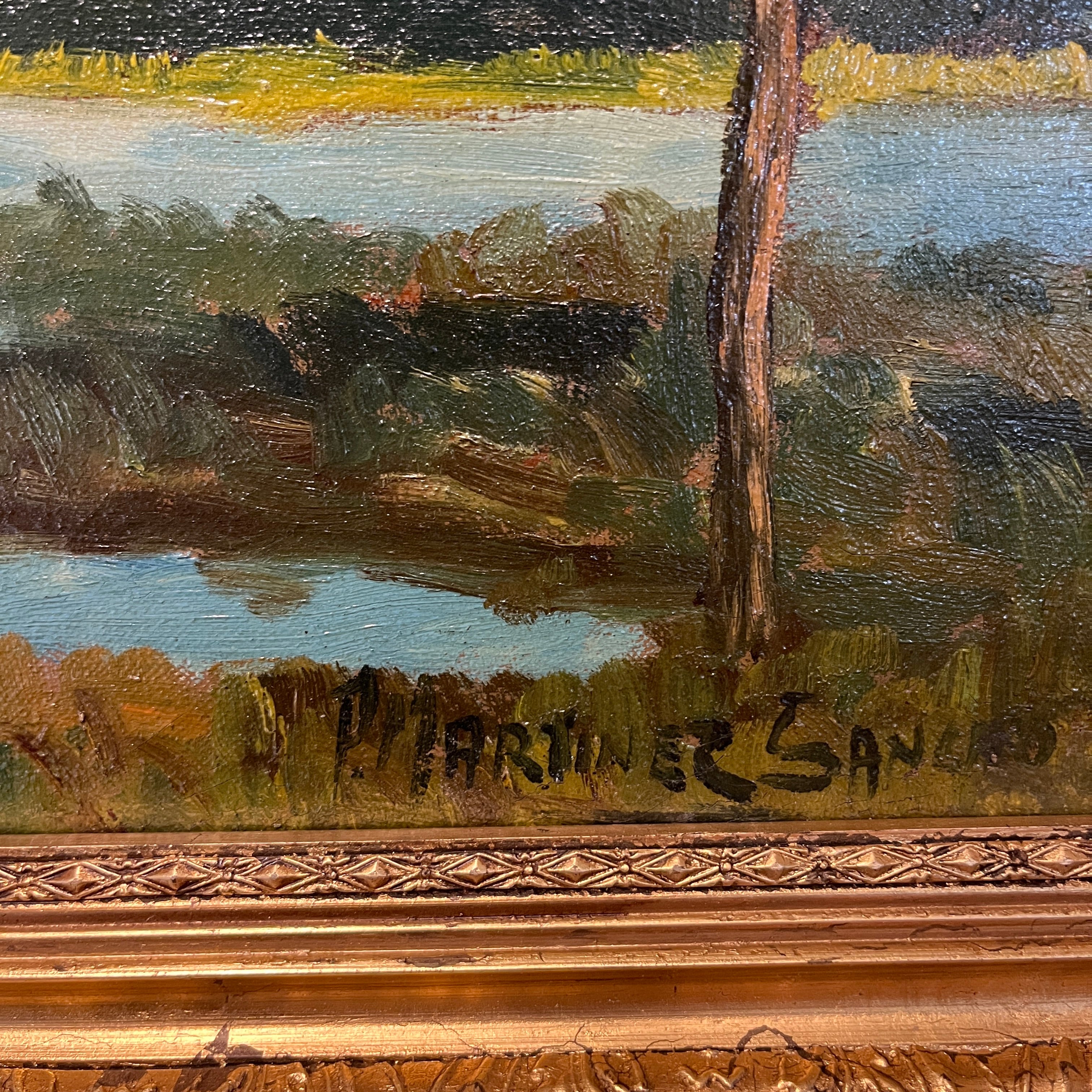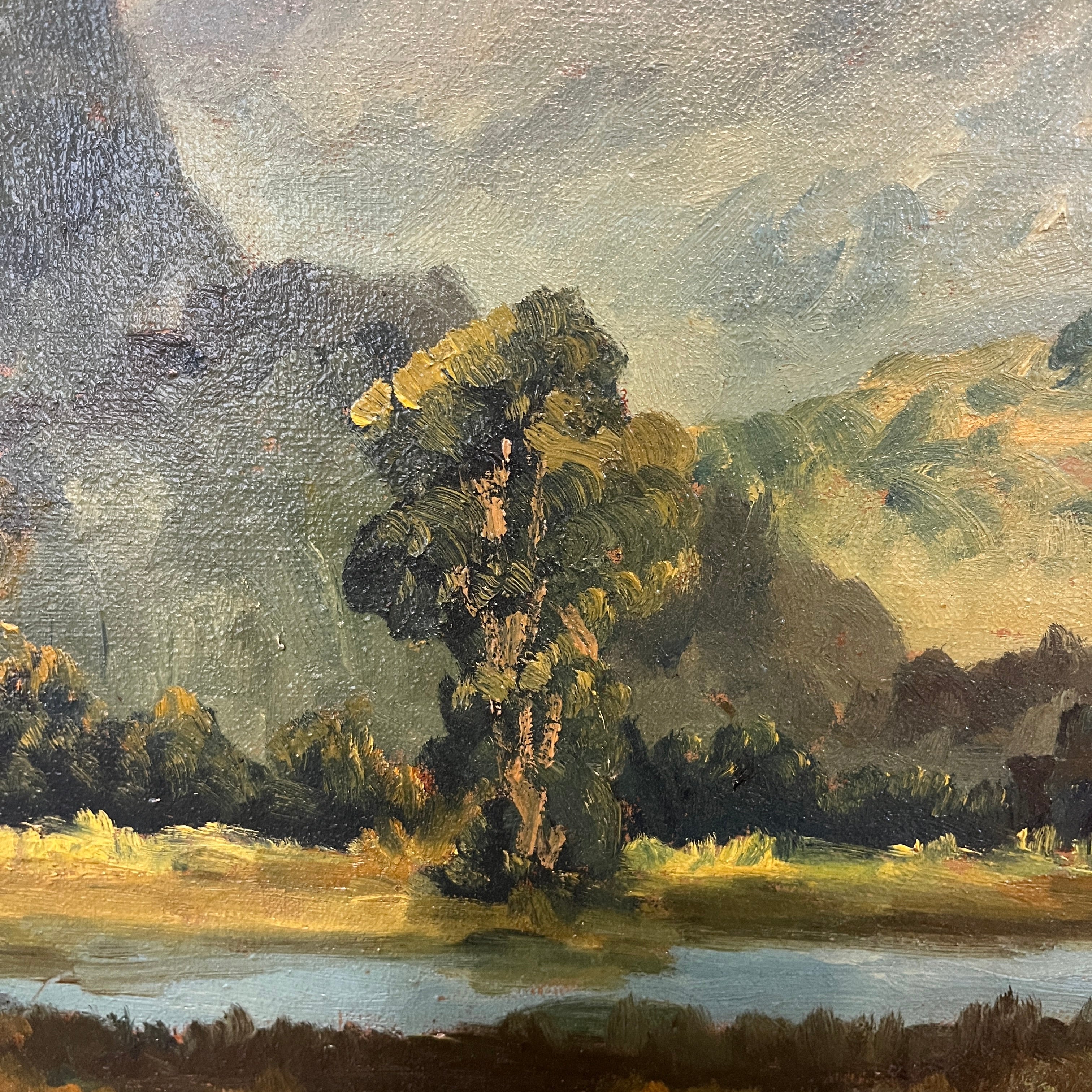Óleo sobre tela del pintor catalán Martínez Sancho, representando un paisaje cordillerano, con un bello trabajo, de luces y profundidad en los tonos verdes y azules, que hacen apreciar la vegetación y el agua, con la majestuosa montaña en el horizonte. La obra está enmarcada en madera tallada en relieves y terminada en elegante dorado.