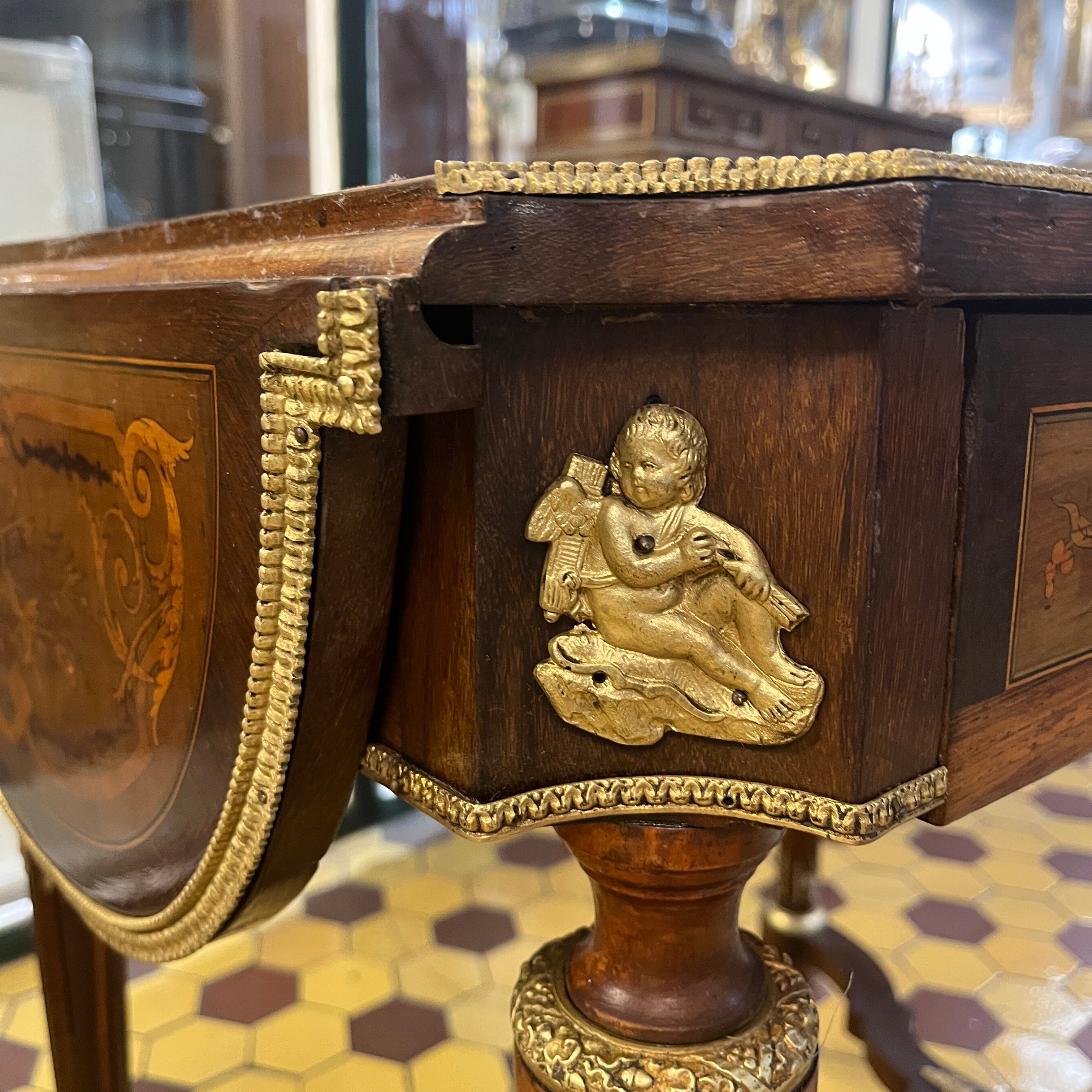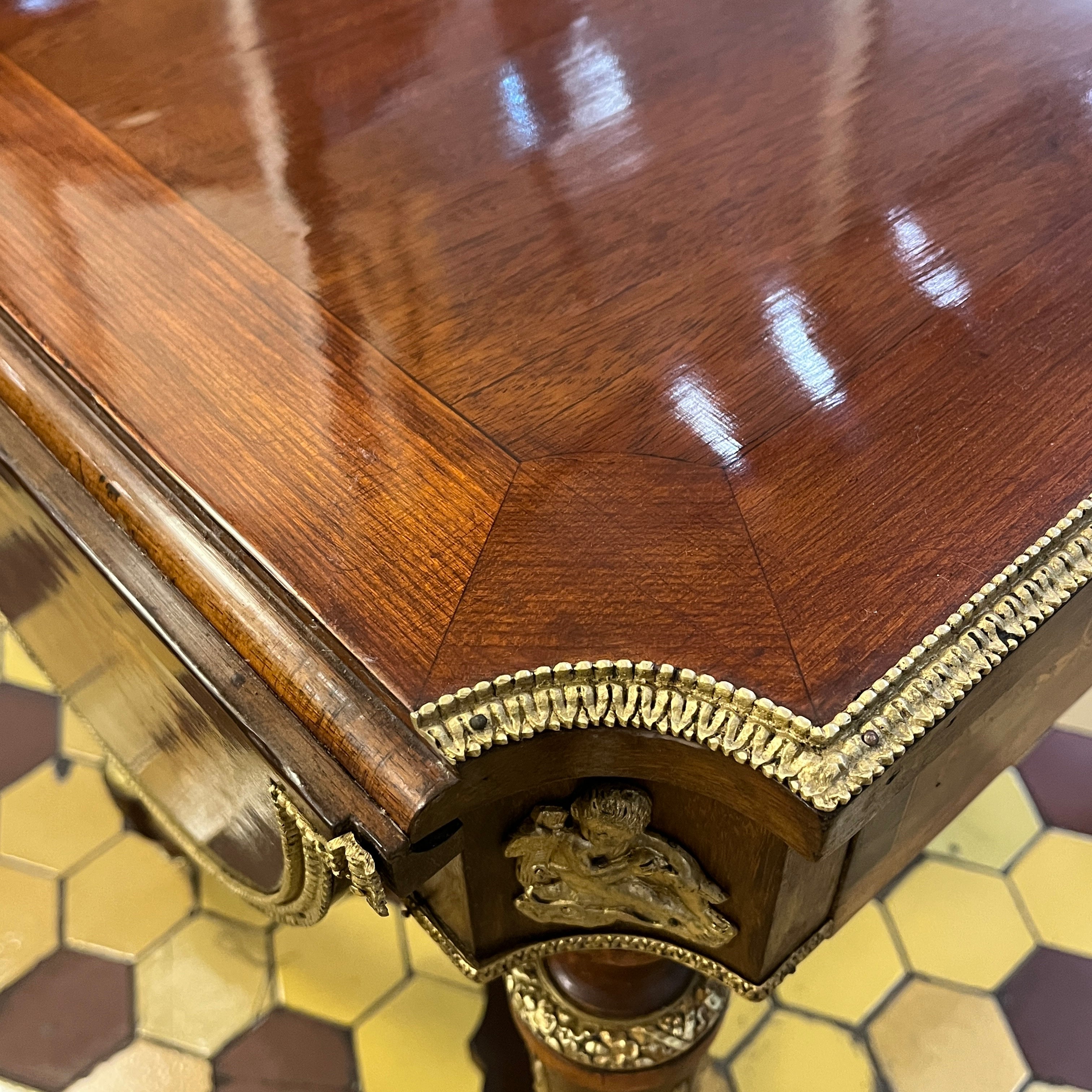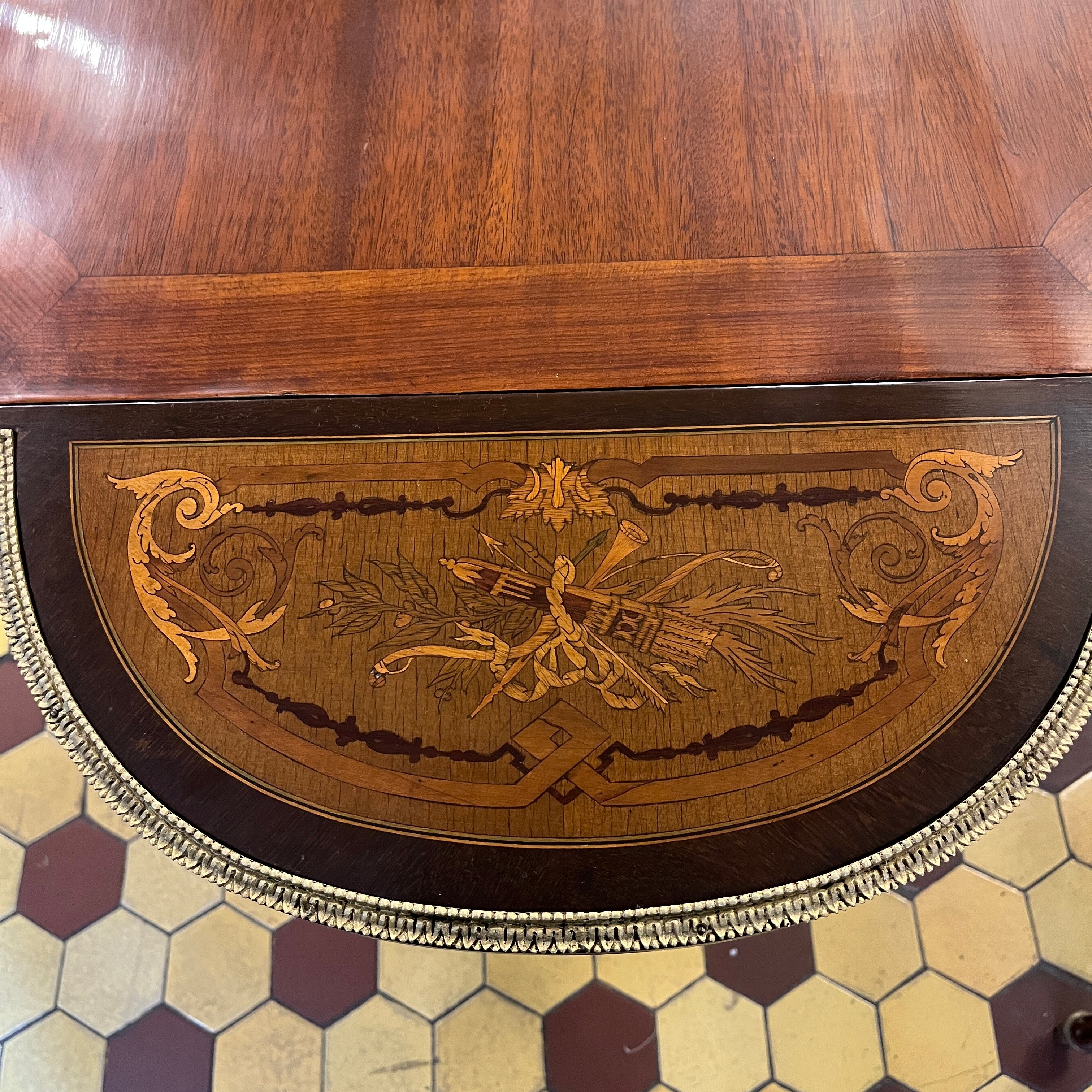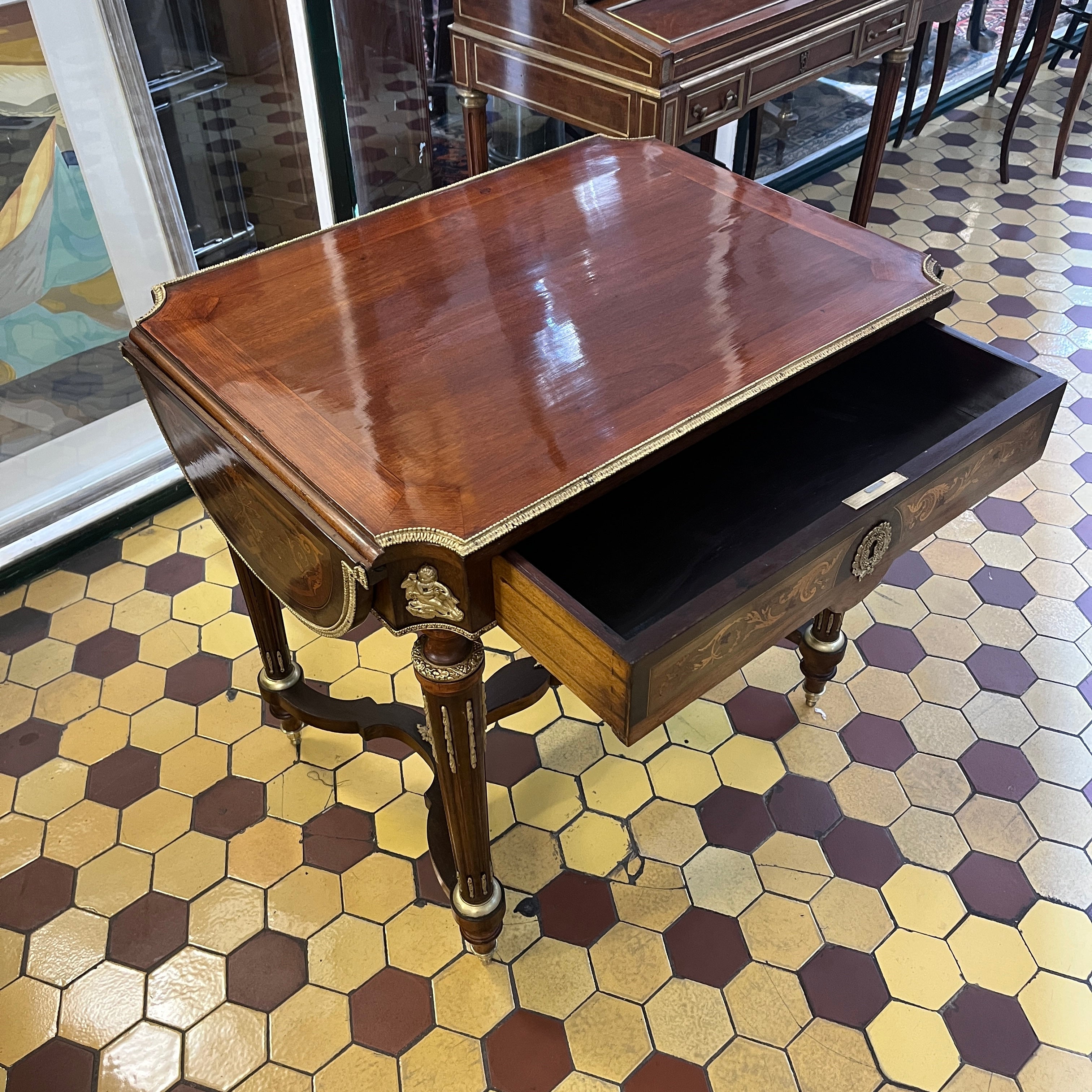 Elegante mesa de apoyo o velador con cruceta, de origen francés estilo Napoleón III hecho de madera de caoba con aplicaciones y tacos en bronce, fina marquetería y sistema de alas extensibles on diseño circular con marquetería y un bello borde en bronce dorado. La pieza tiene un cajón amplio con chapa y destacan las aplicaciones en bronce representando a cupidos en sus esquinas.