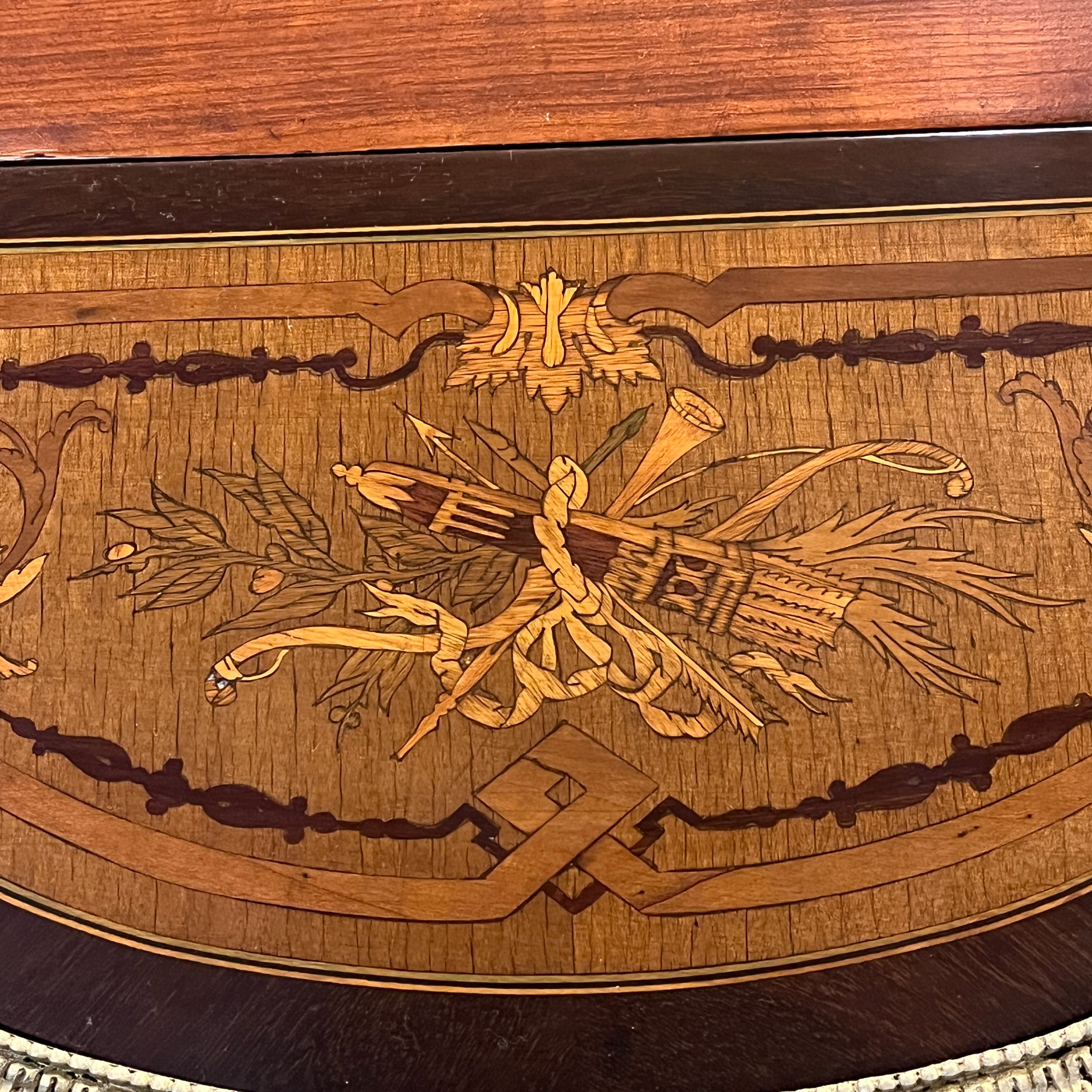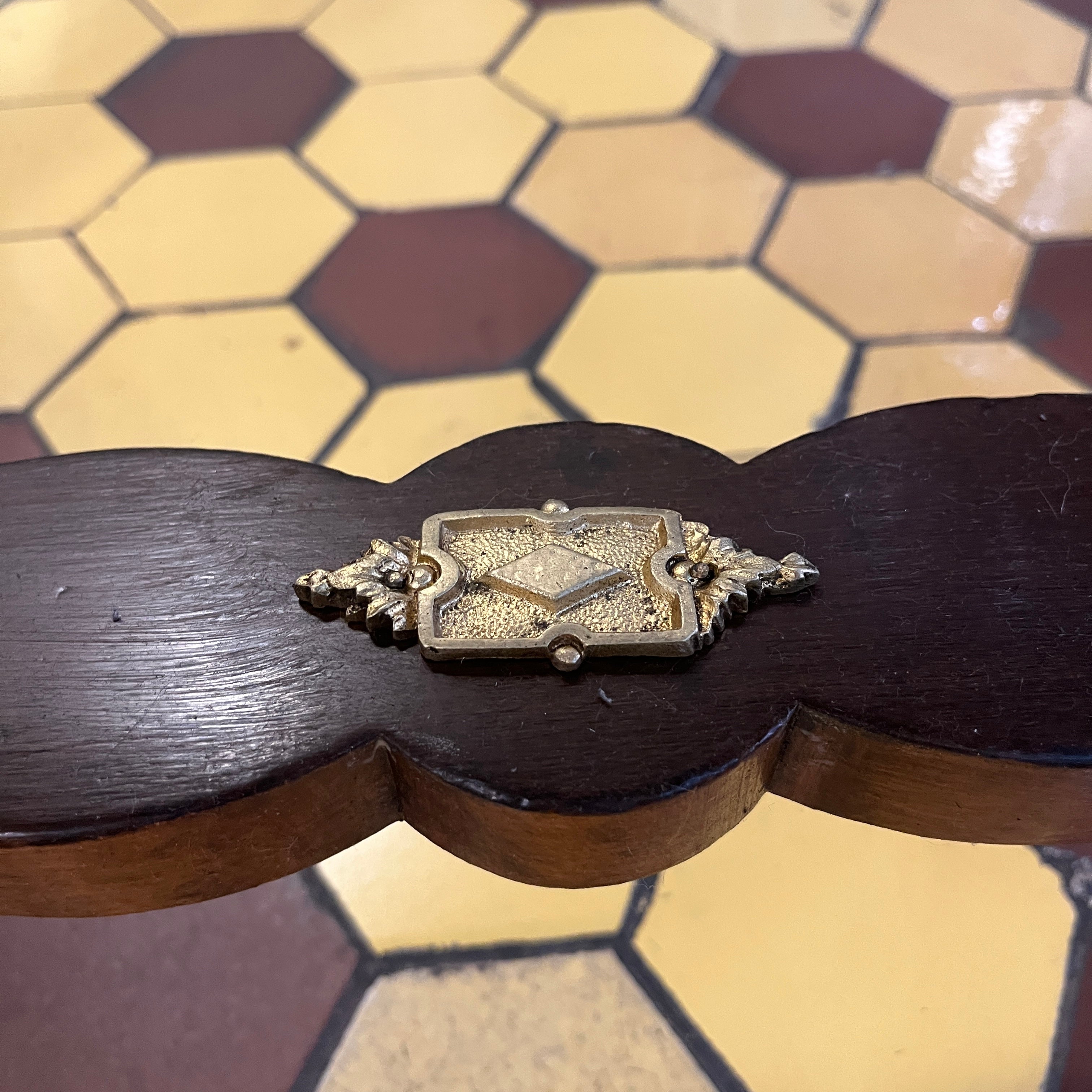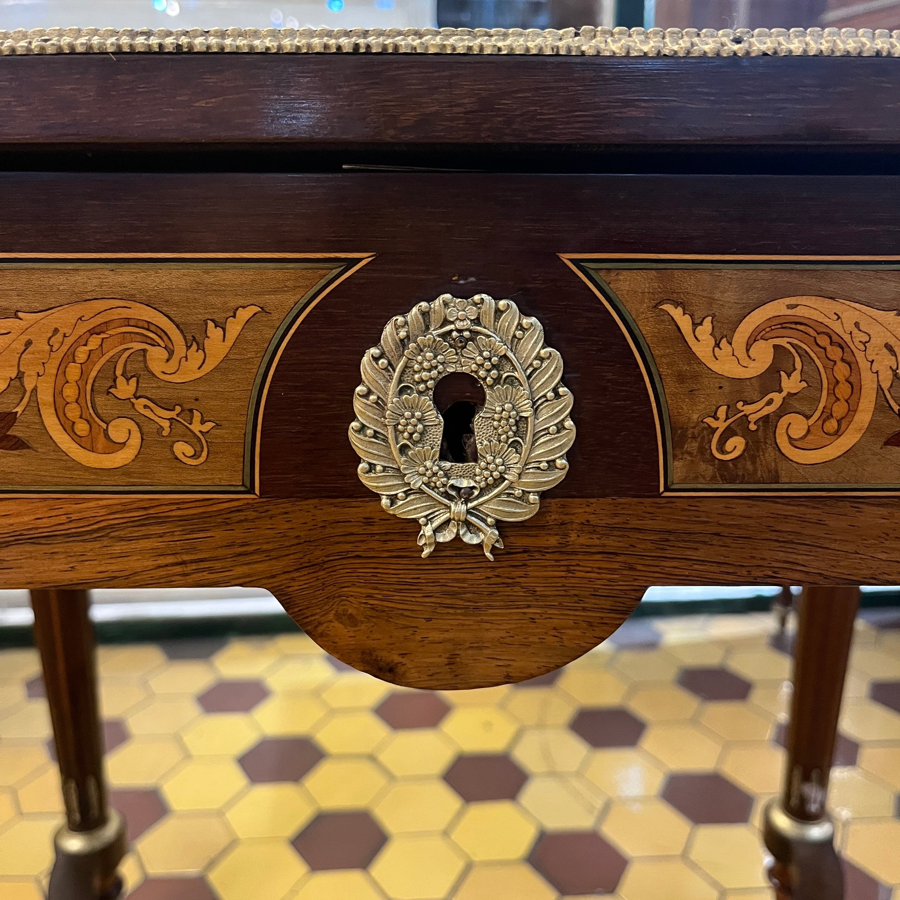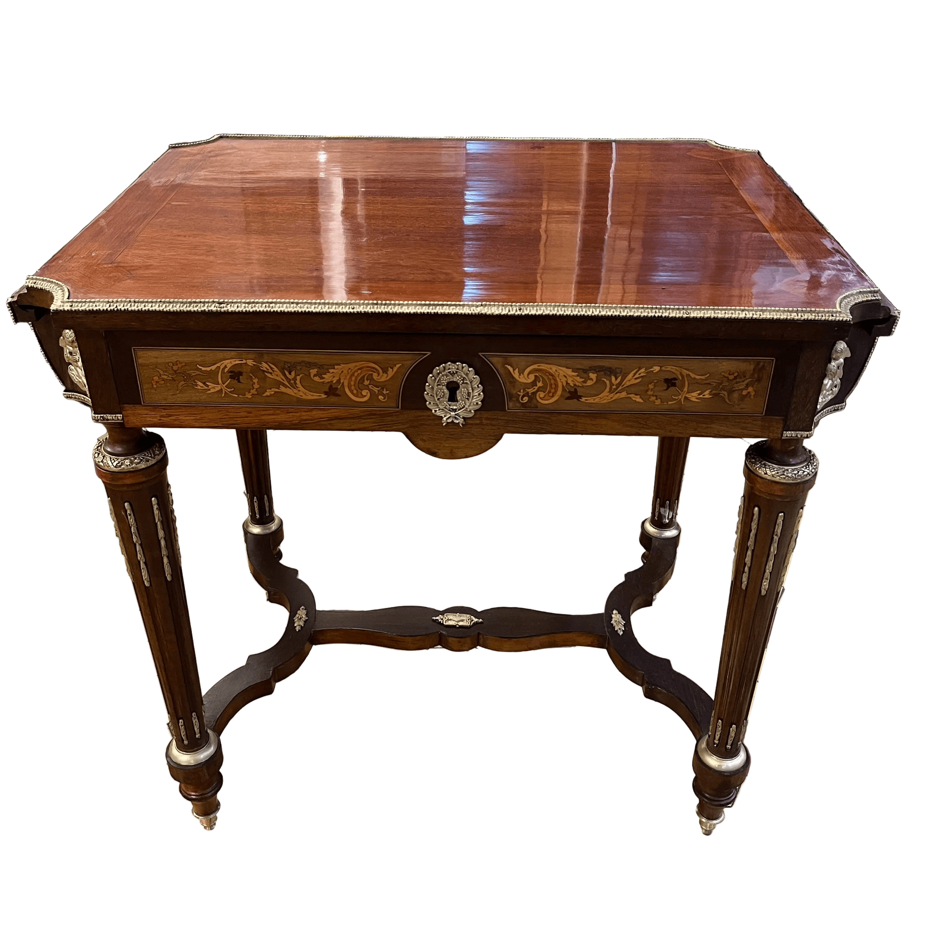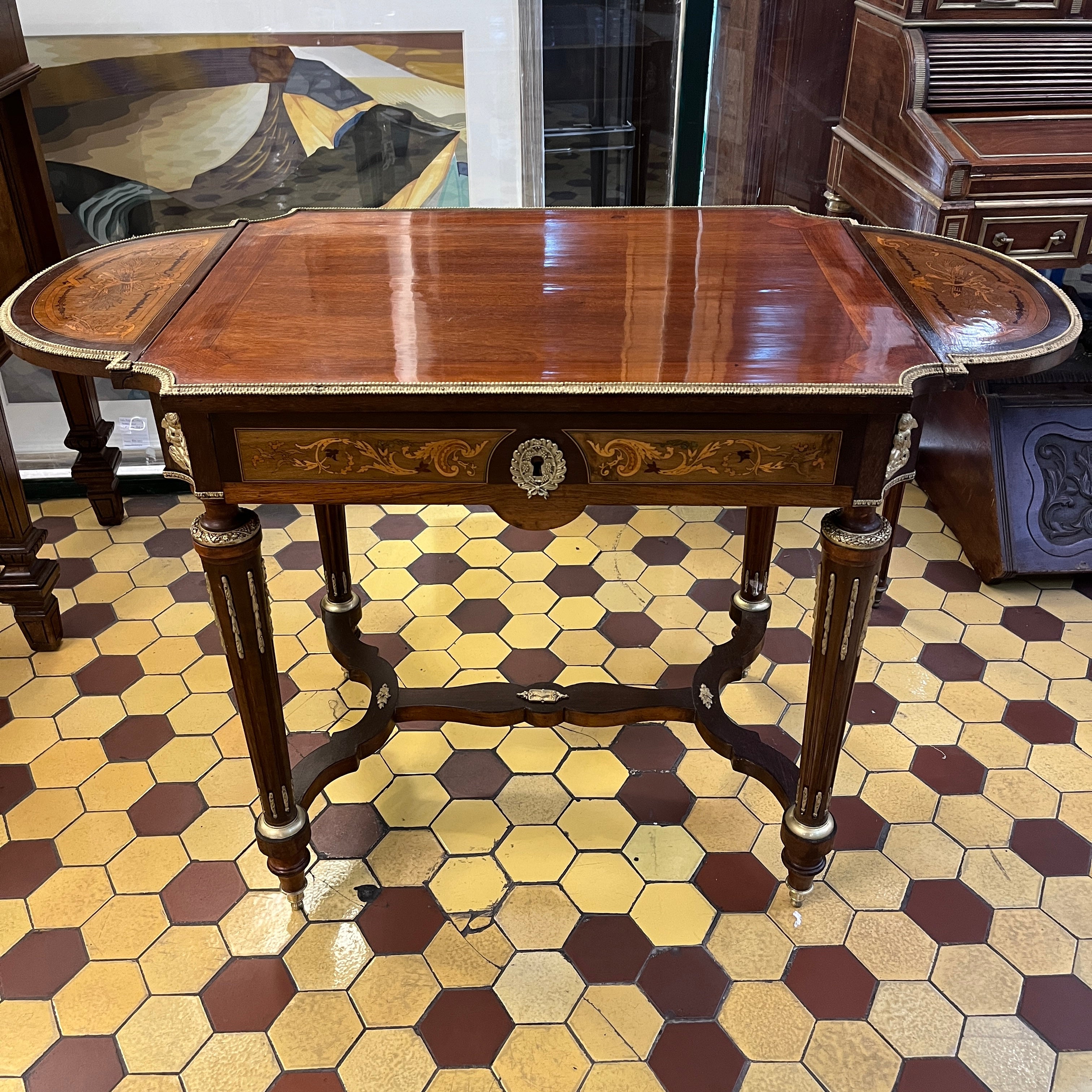 Elegante mesa de apoyo o velador con cruceta, de origen francés estilo Napoleón III hecho de madera de caoba con aplicaciones y tacos en bronce, fina marquetería y sistema de alas extensibles on diseño circular con marquetería y un bello borde en bronce dorado. La pieza tiene un cajón amplio con chapa y destacan las aplicaciones en bronce representando a cupidos en sus esquinas.