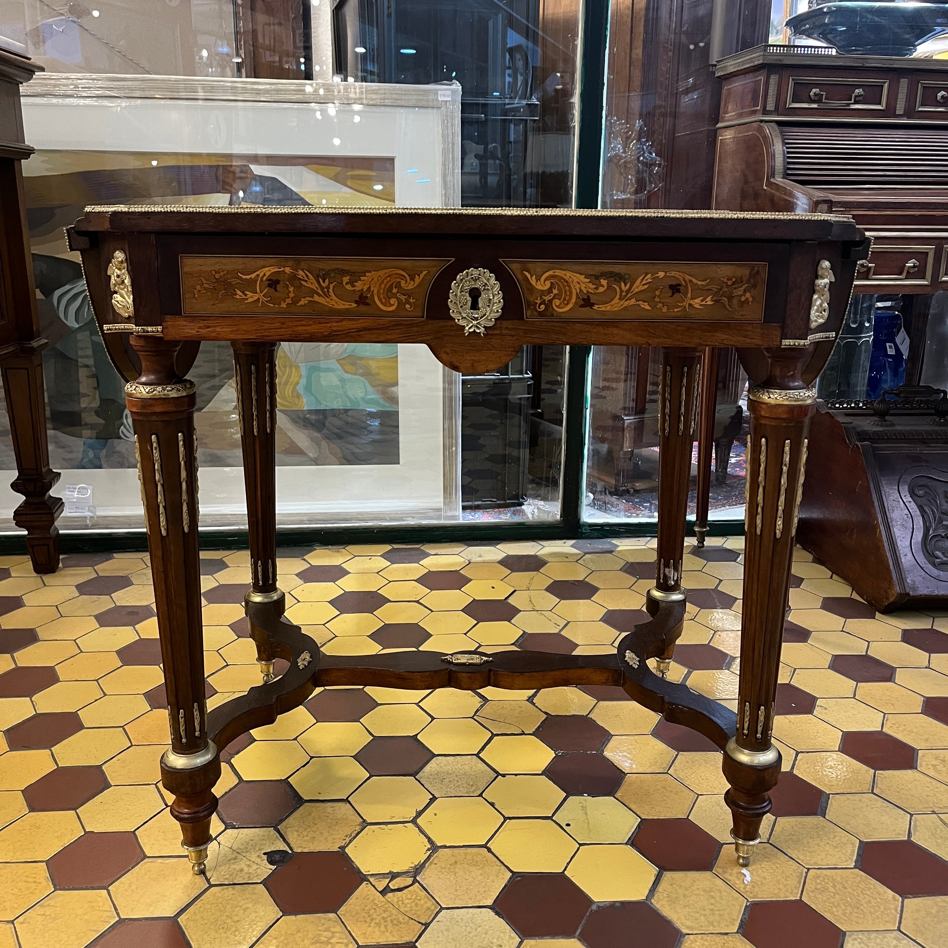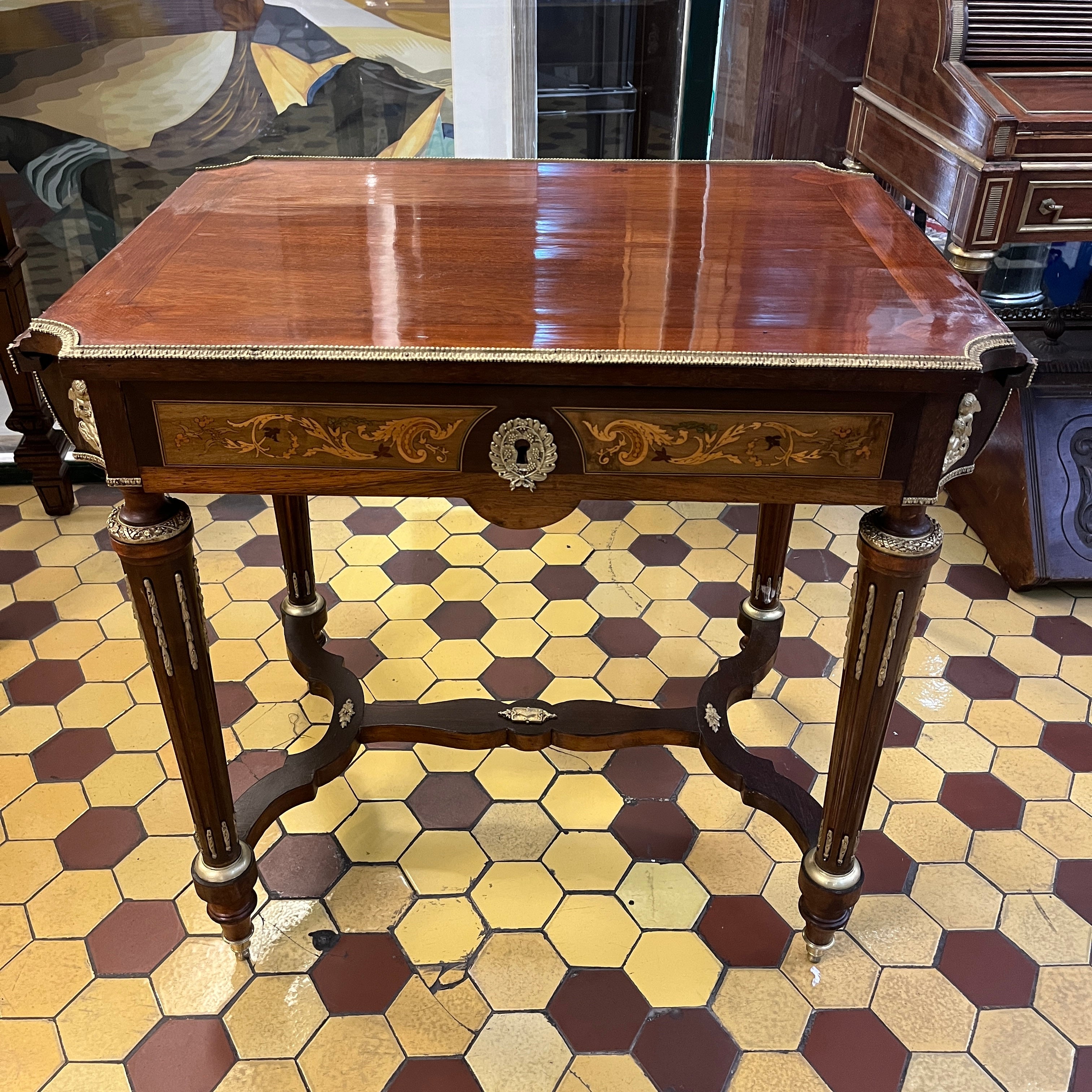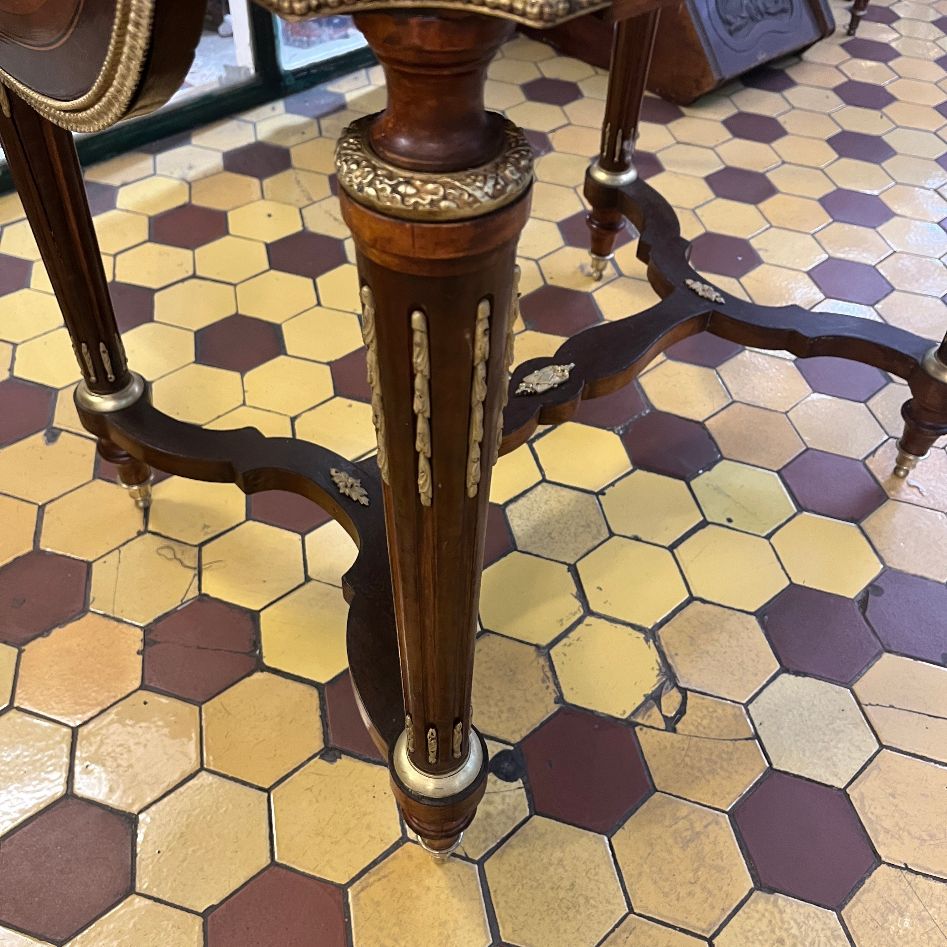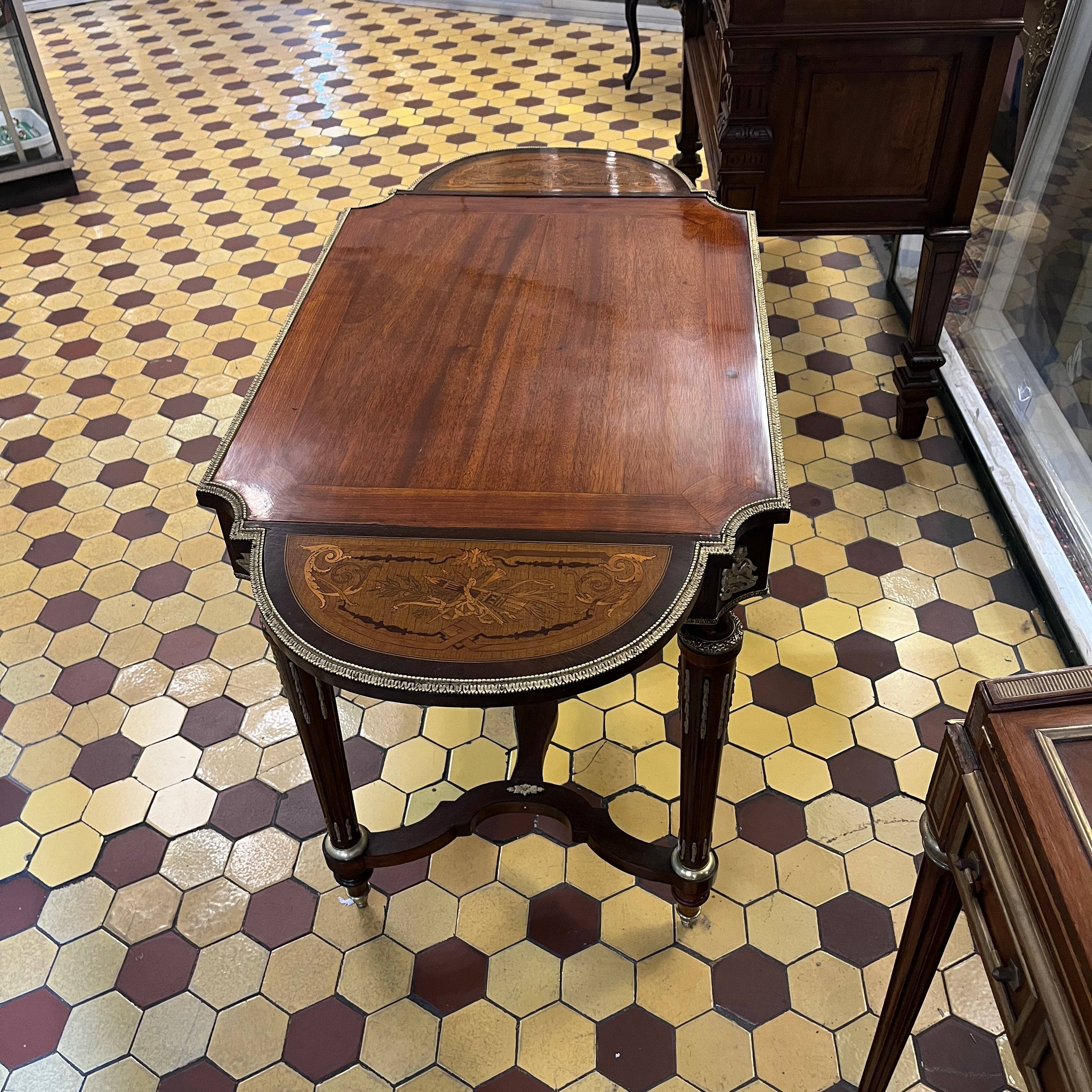 Mesa de apoyo francesa Napoleón III extensible marqueteria cruceta y bronce