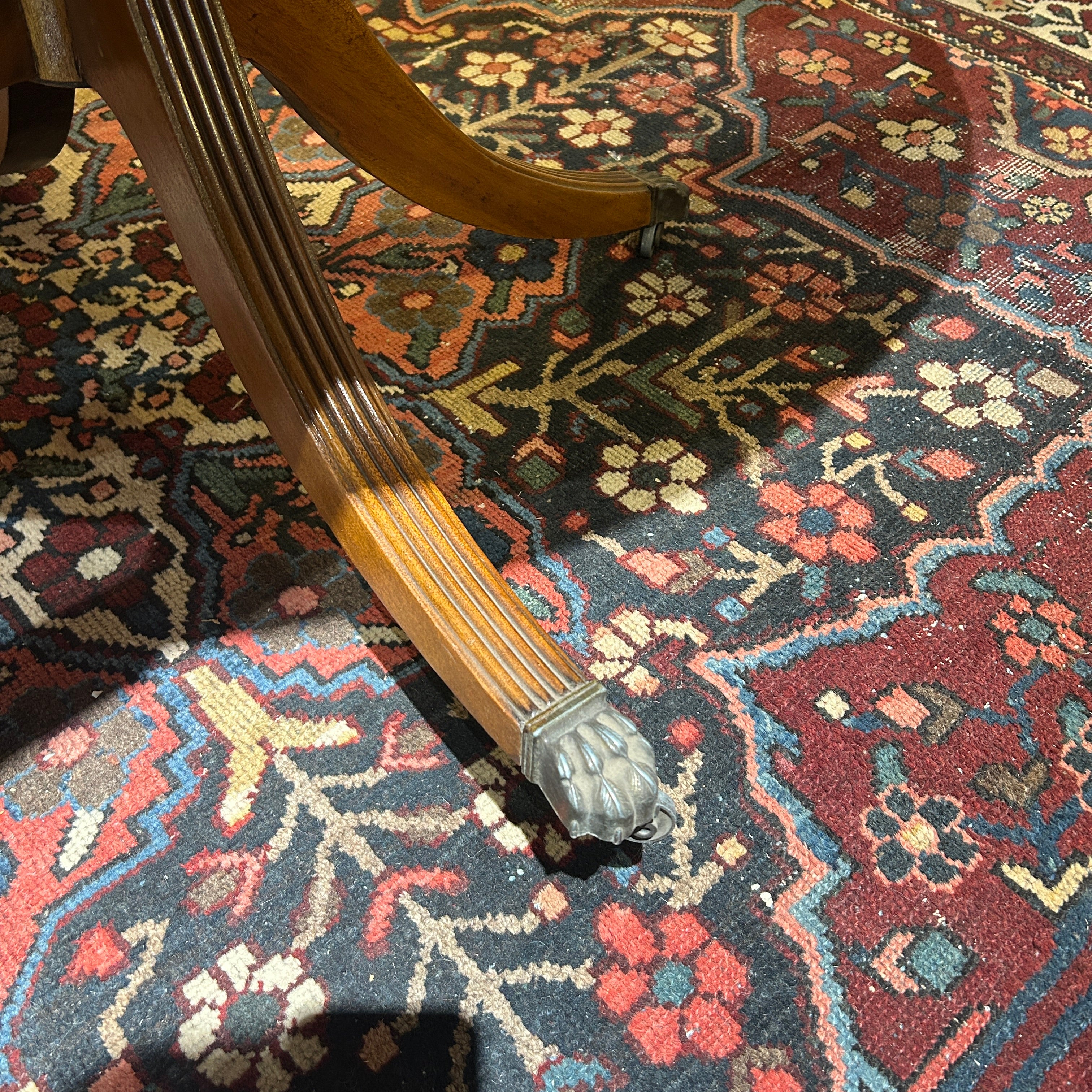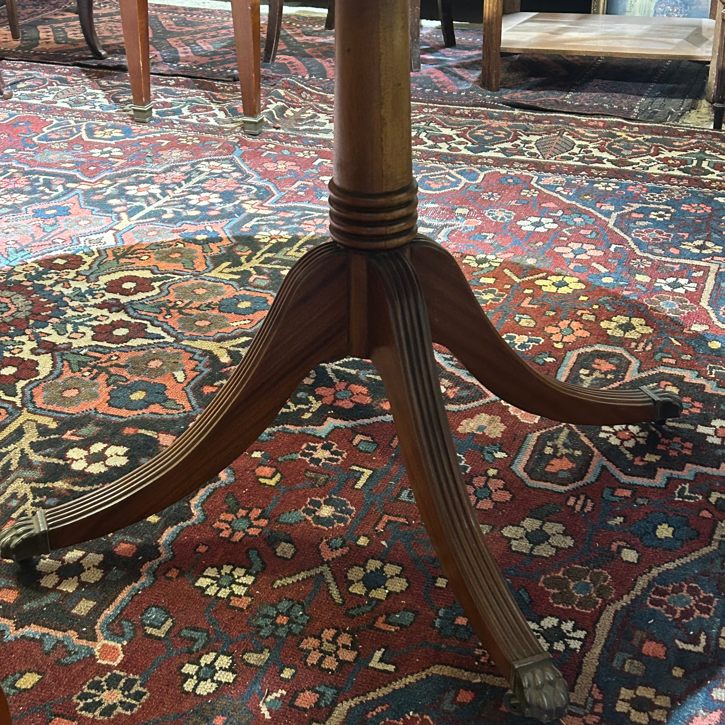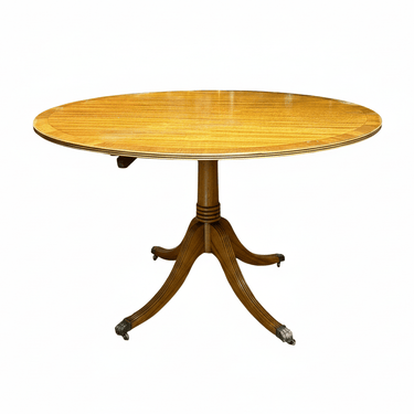 Elegante mesa redonda de origen inglés estilo Edwardian hecha en madera enchapada de caoba y diseño de pata central torneada y 4 patas talladas con tacos de bronce. Los tacos, que tienen rueditas, tienen un diseño de pata de León, muy característico de los muebles ingleses de este estilo.