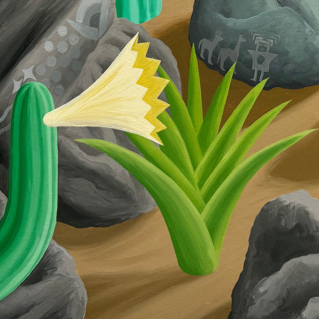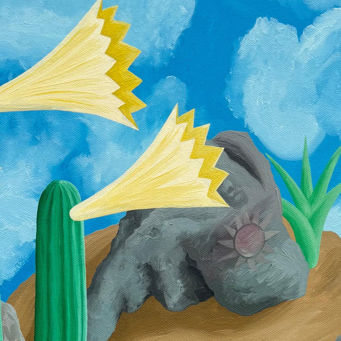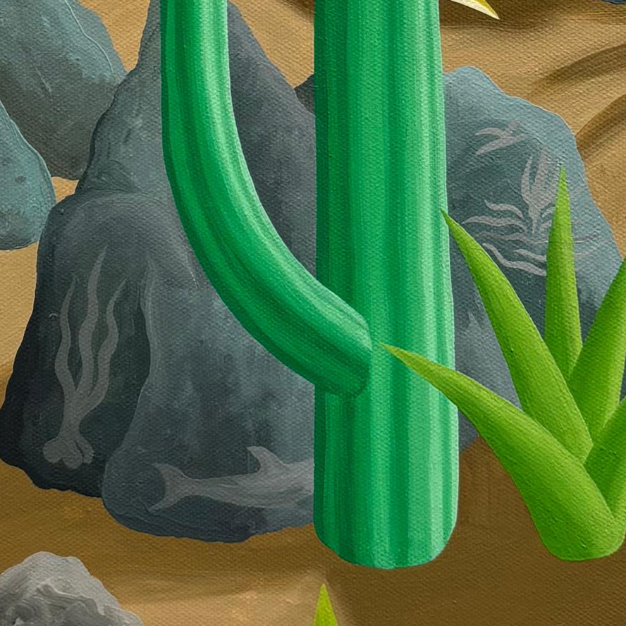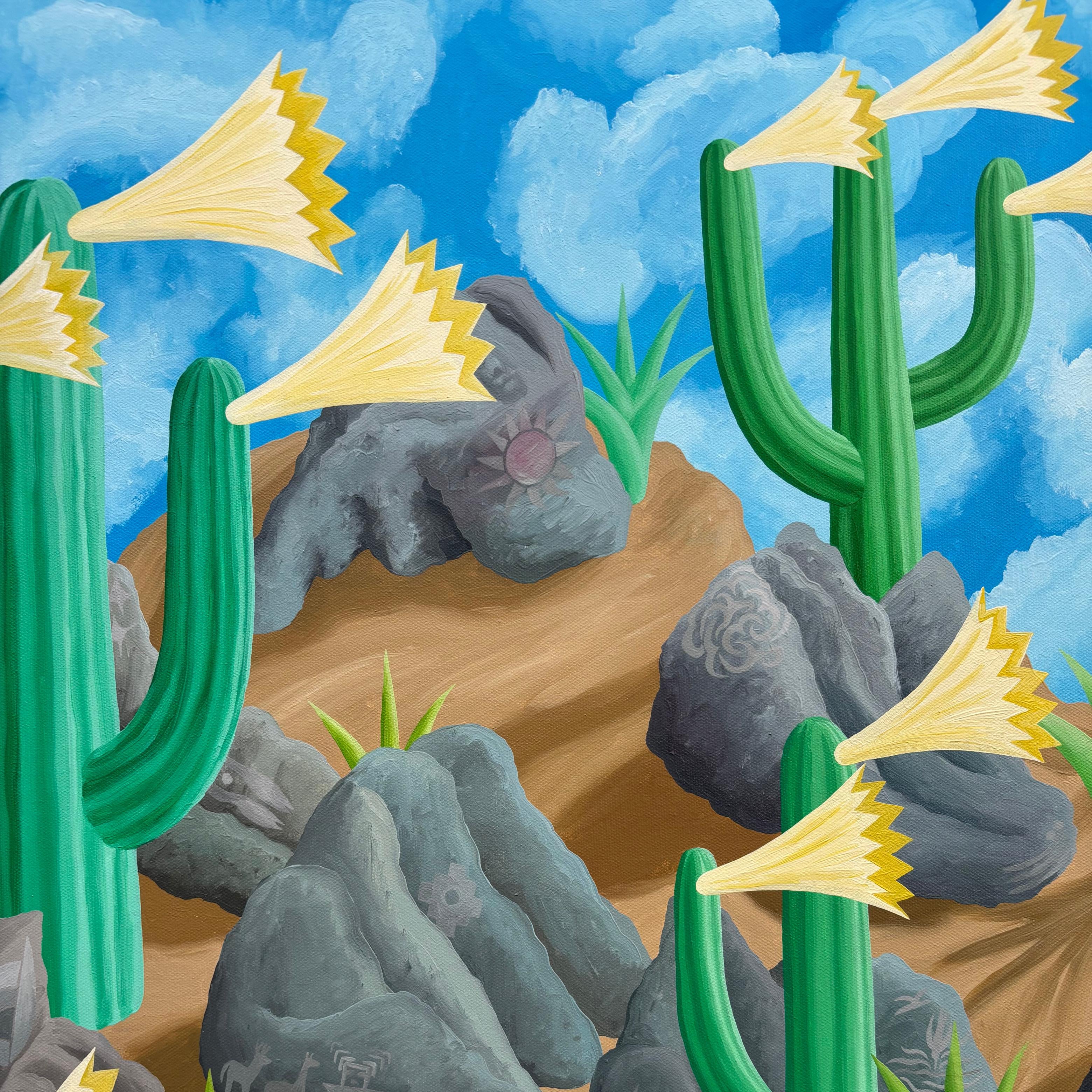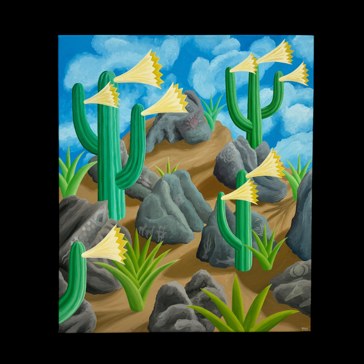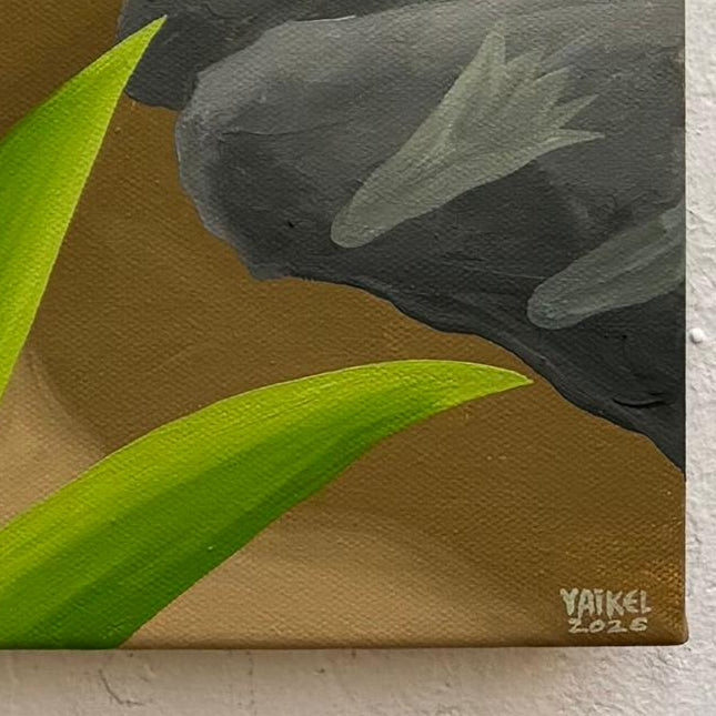 Hermosa óleo del talentoso artista chileno Michael Yaikel representando el Cerro Chusmiza en la Región de Tarapacá. Un lugar de memoria ancestral y, que Yaikel logra transmitirlo a partir de esta inspiradora pintura de intensos colores y grandes contrastes.