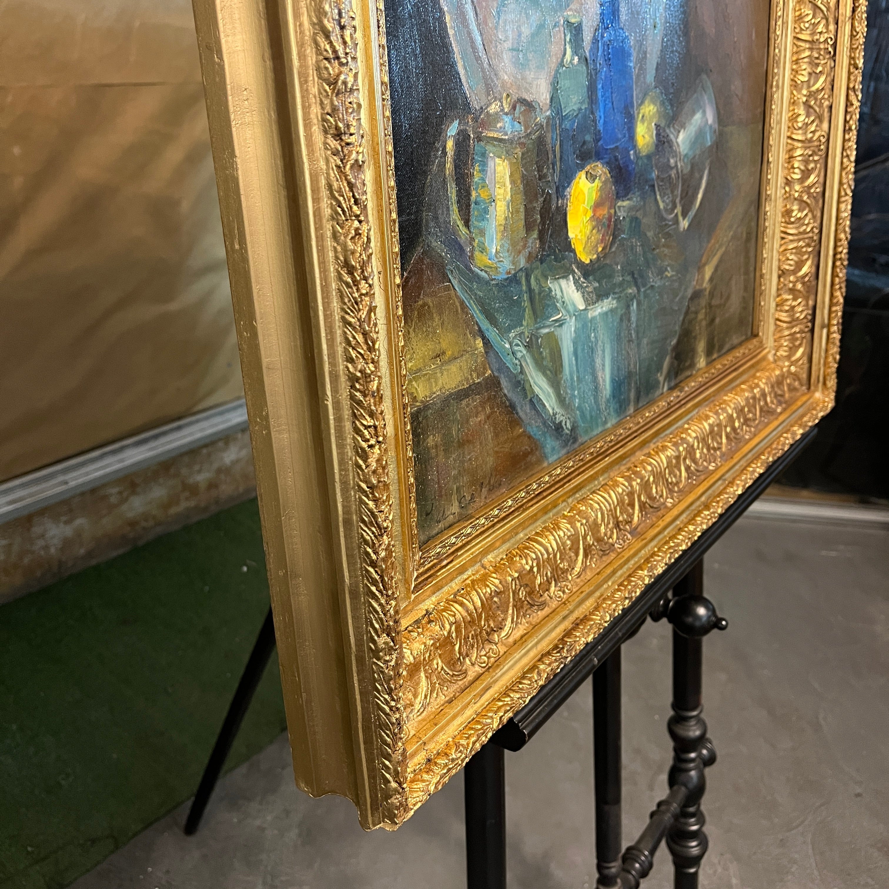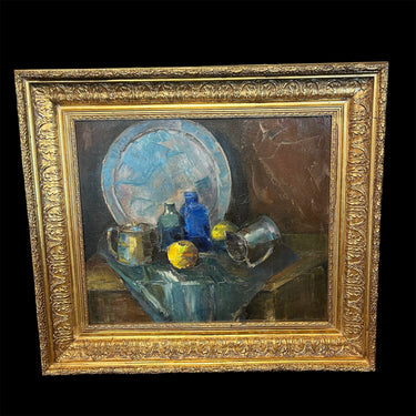 Óleo sobre tela, de forma ilegible, representando un bodegón de limones junto a objetos de mesa de platería y vidrio, como unas botellas, una bandeja, un jarrito y un azucarero. La obra tiene un bello juego de colores, haciendo contrastar los reflejos de la platería y los tonos saturados de amarillo y azul, sobre el fondo opaco. La obra está enmarcada en madera tallada de finos relieves y terminada en dorado.