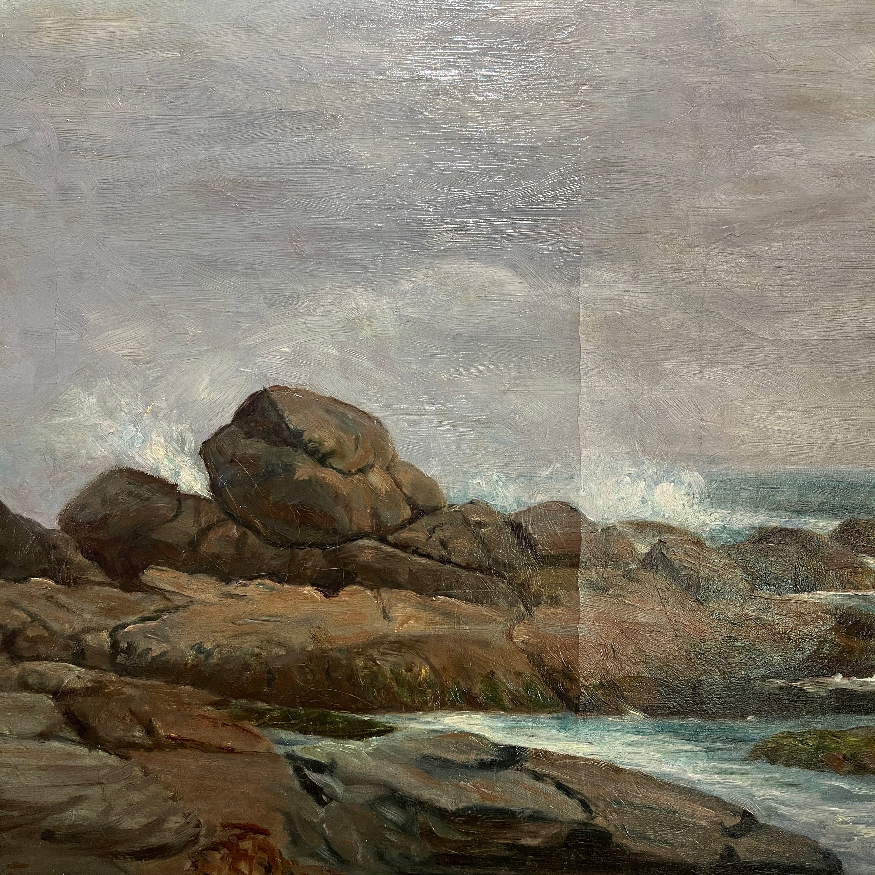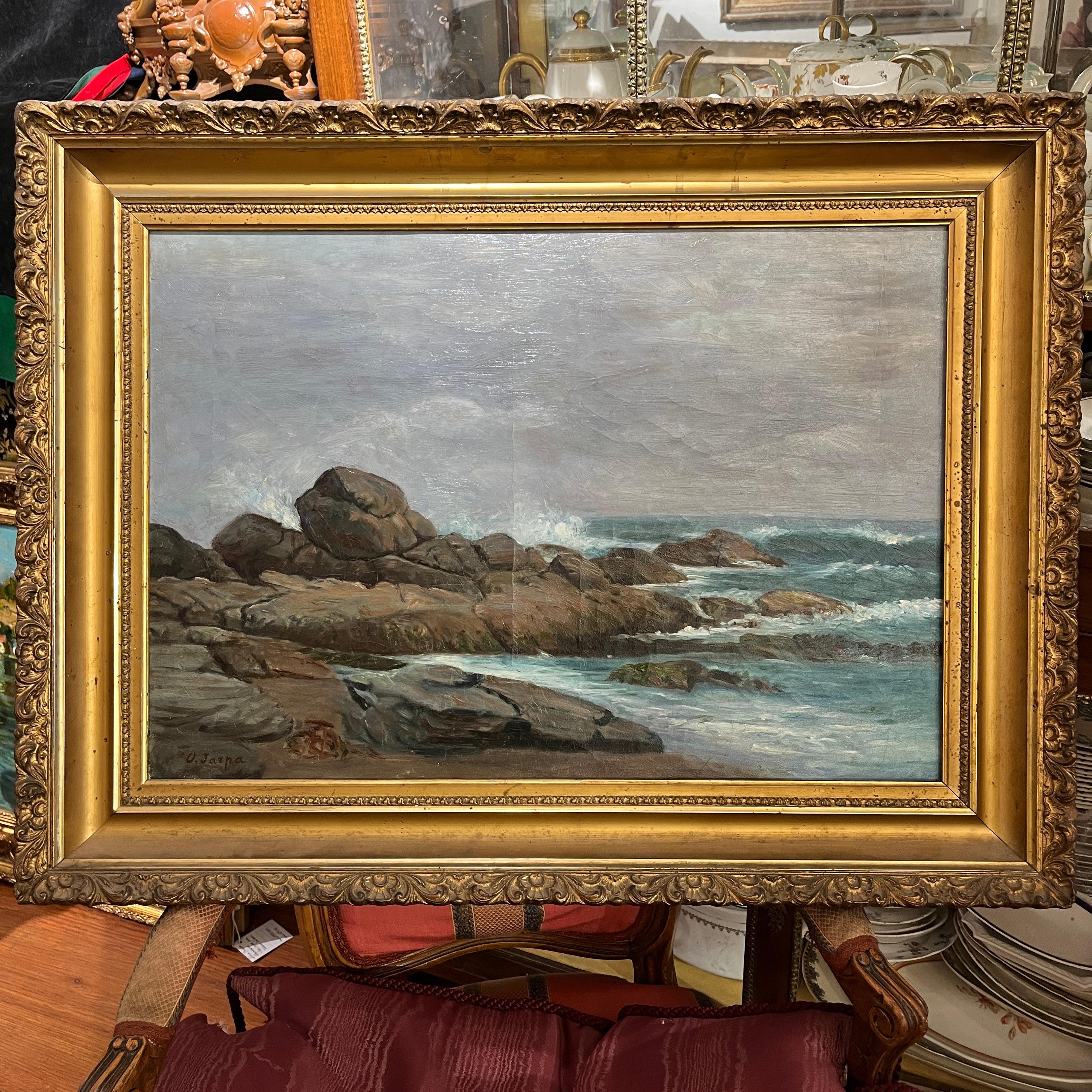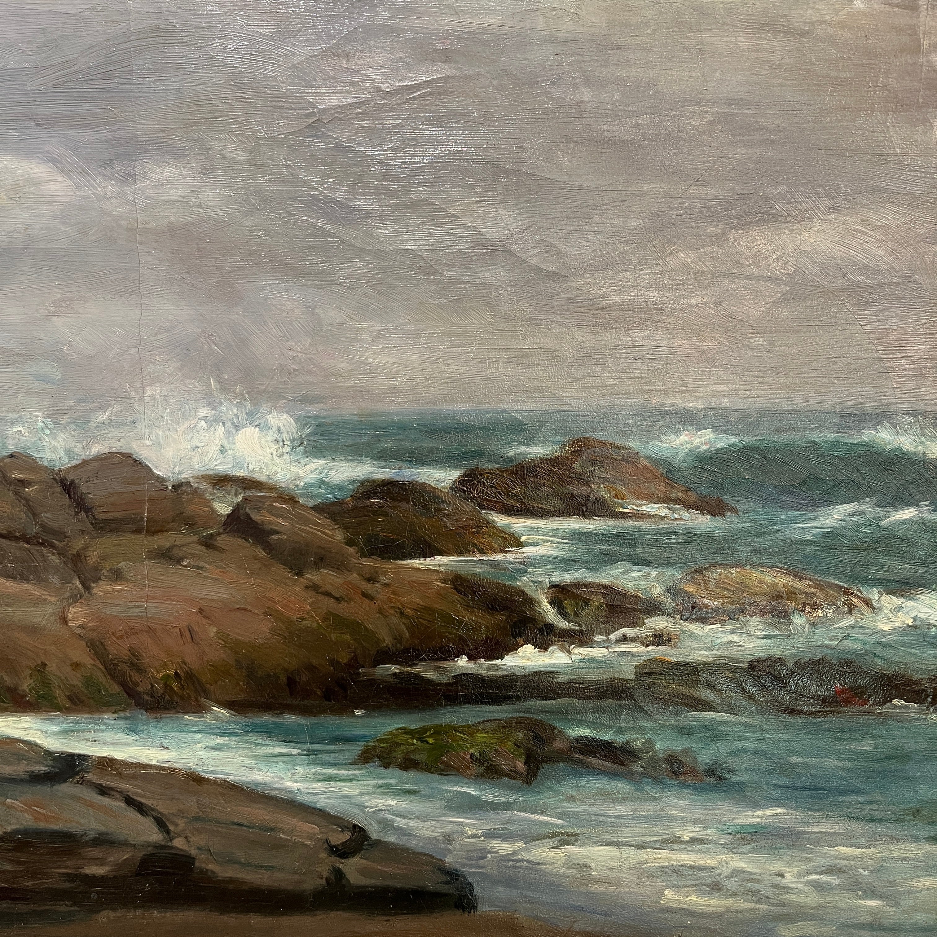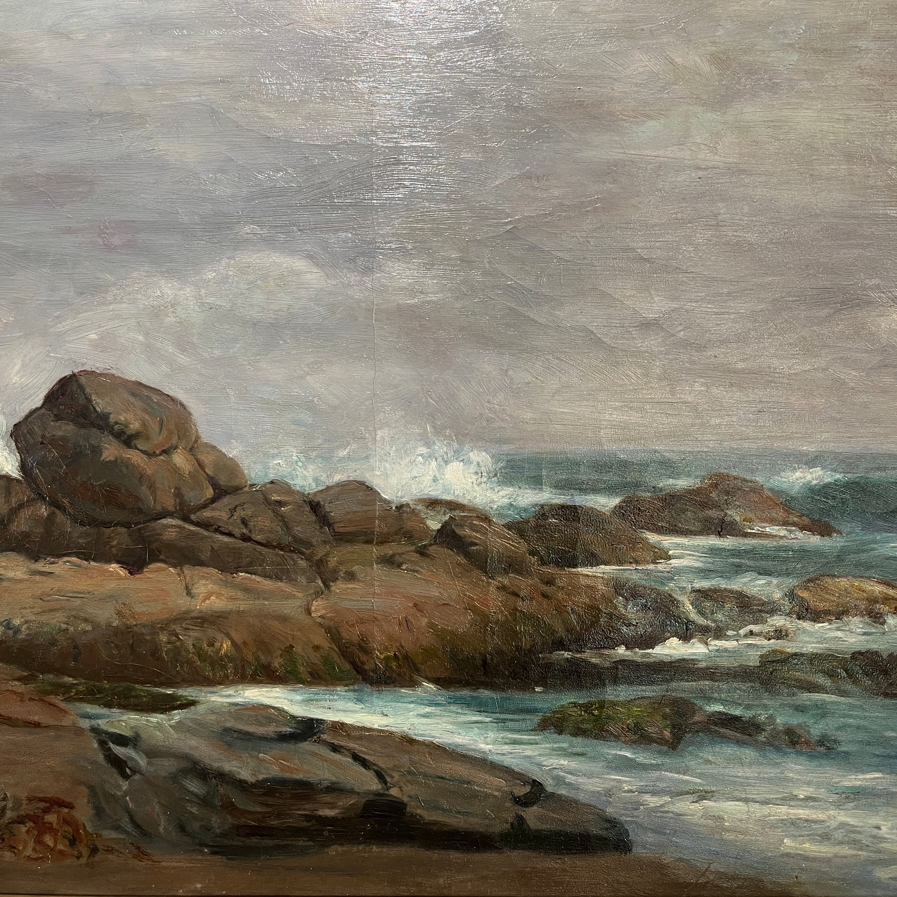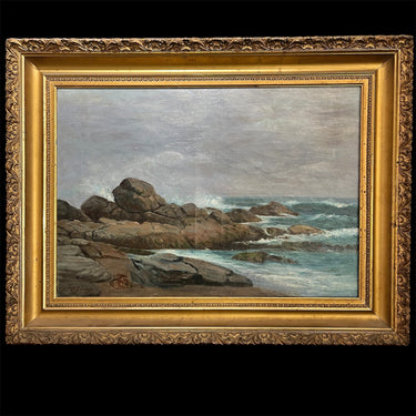 Óleo del talentoso pintor chileno Onofre Jarpa, donde vemos un paisaje con marcado roquerío y un mar agitado chocando contra ellas, todo acompañado por un día nublado y gris. Es una pintura que logra capturar el movimiento y fuerza de la naturaleza.